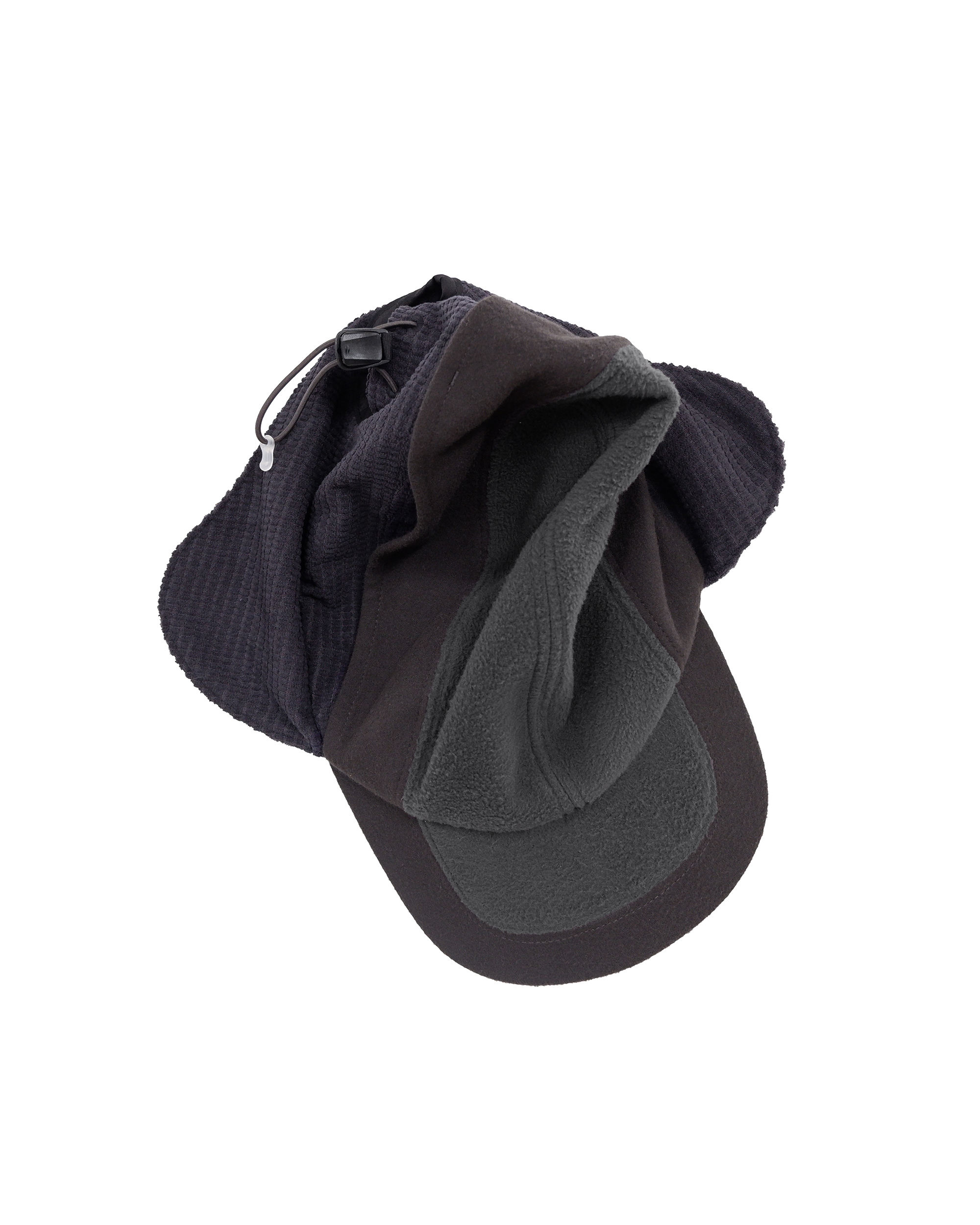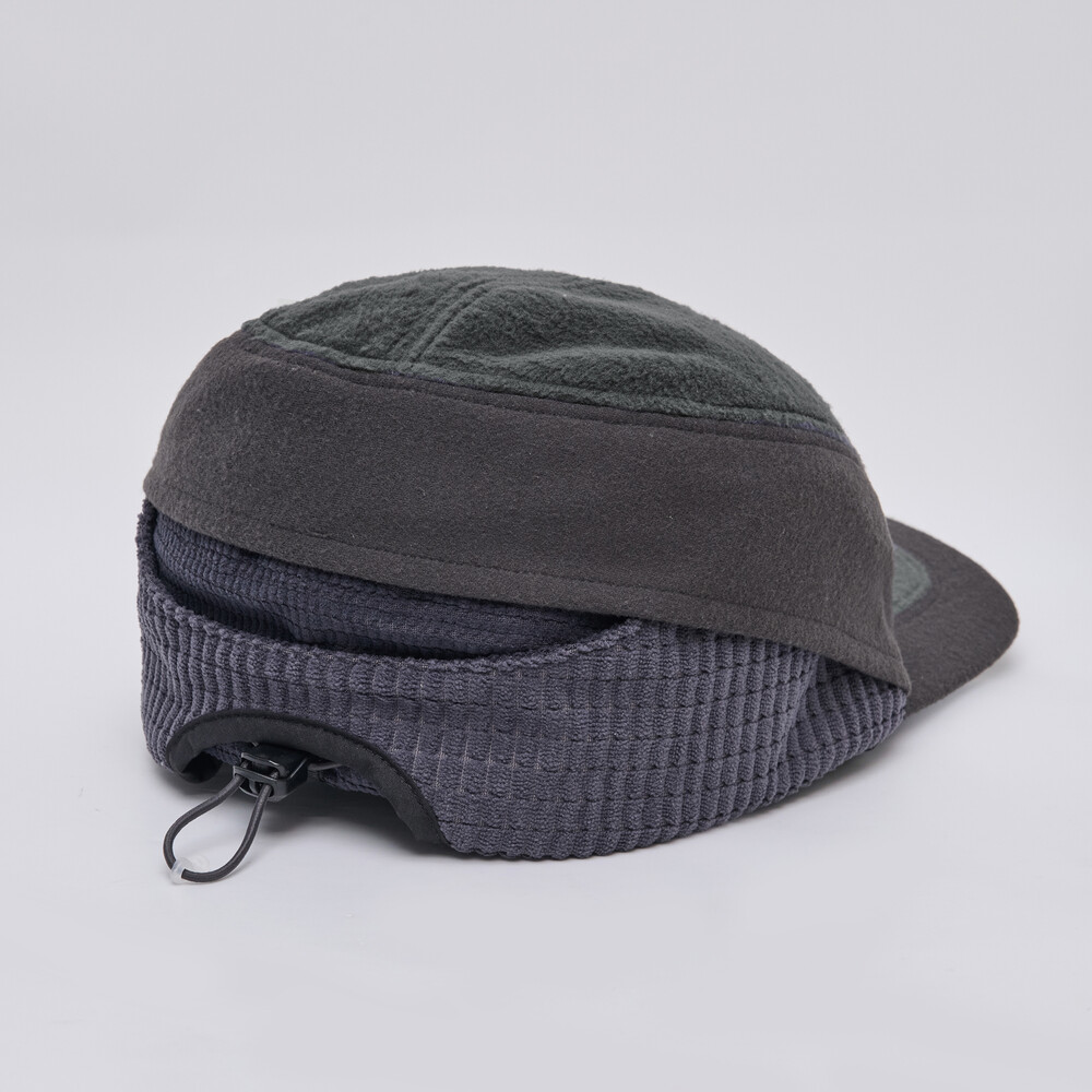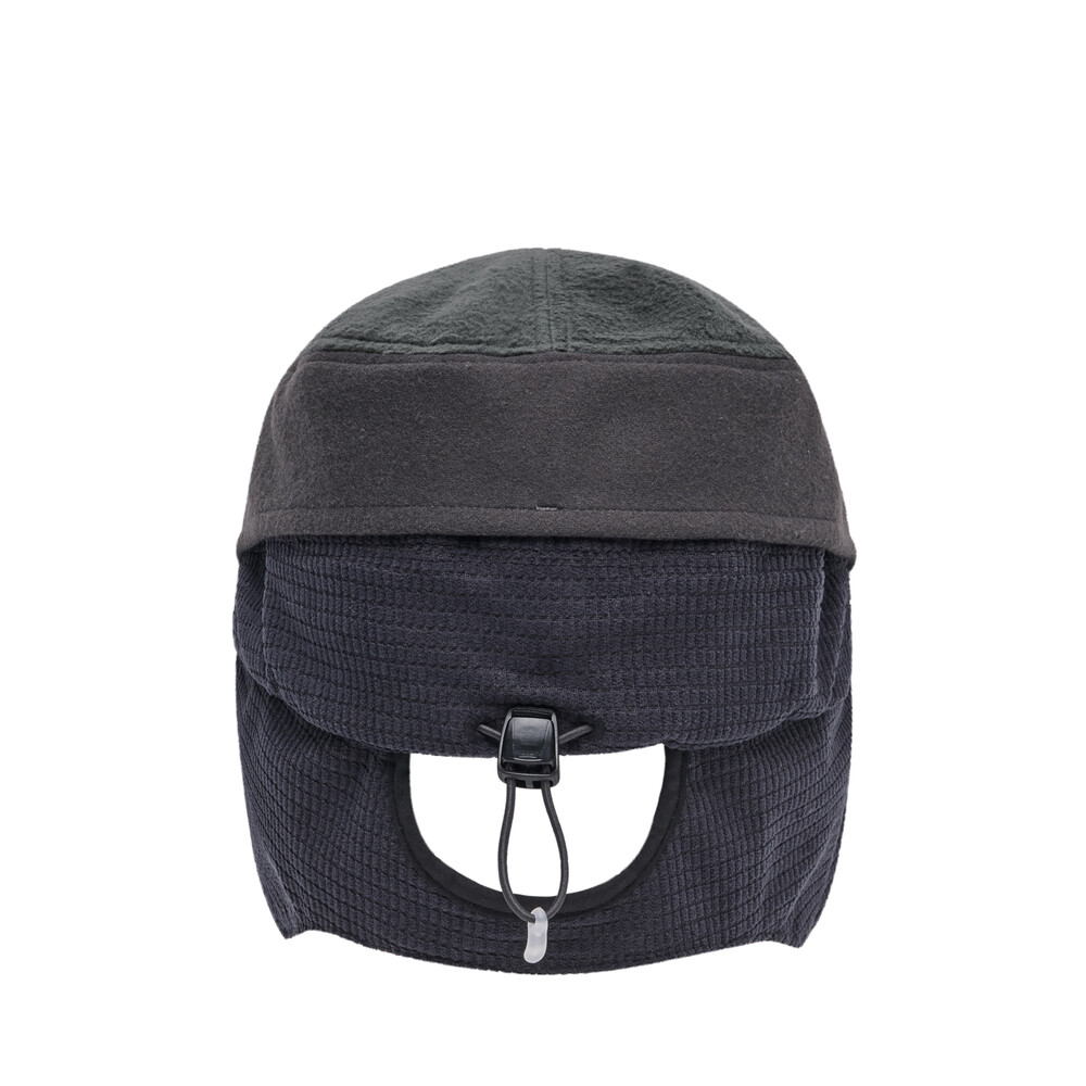 • The earflaps are constructed with small waffle-textured fabric on the exterior and large waffle-textured fabric on the interior, providing dimensional texture, structural stability, and thermal insulation.