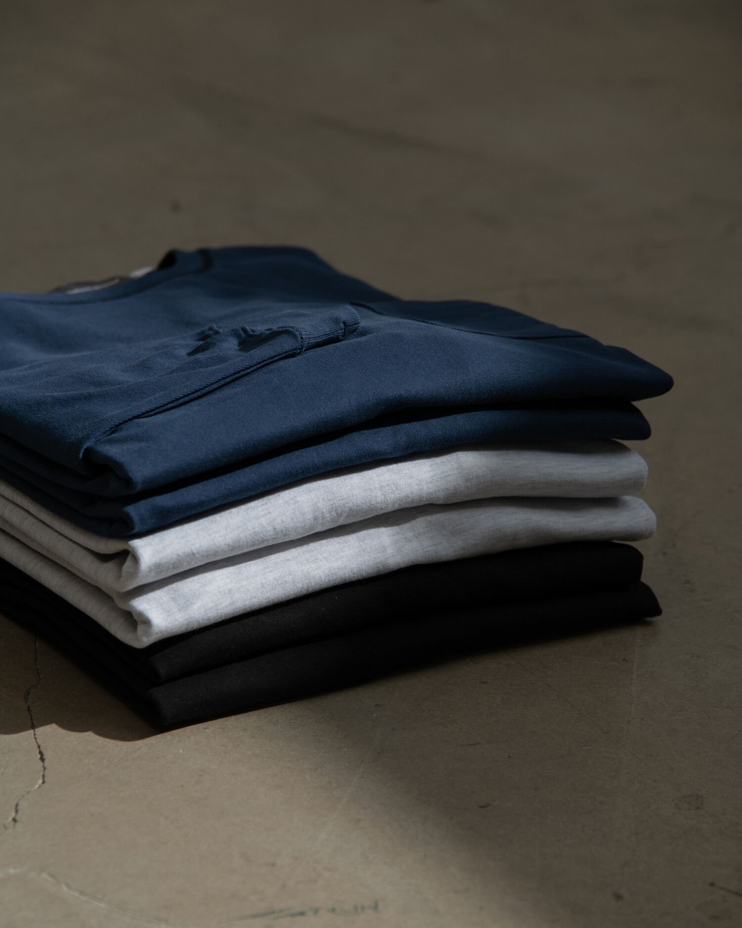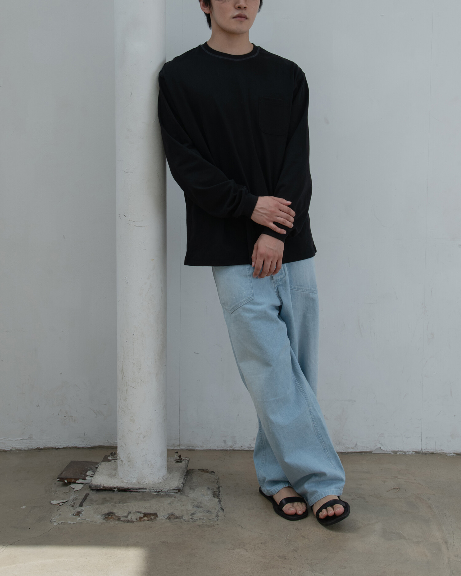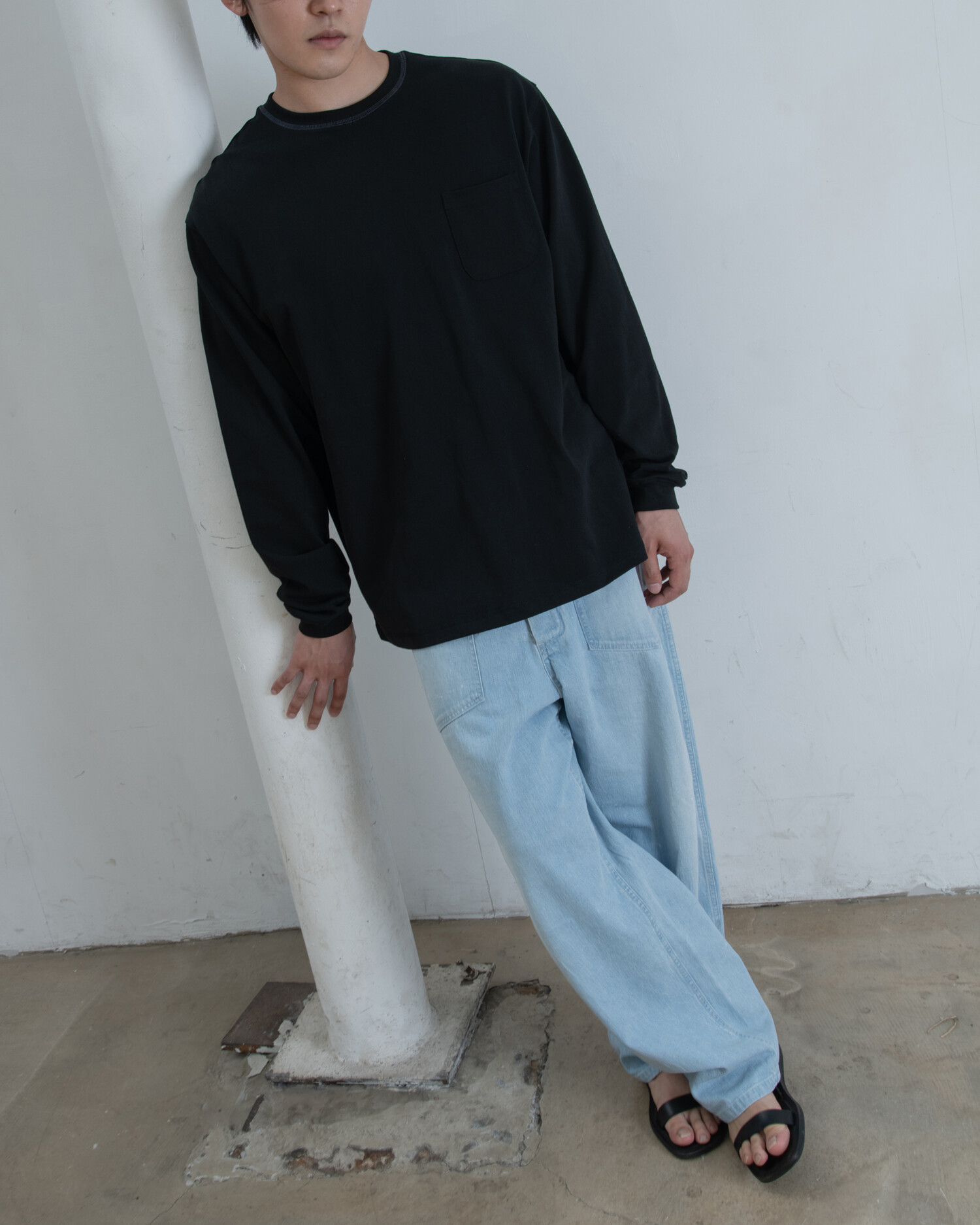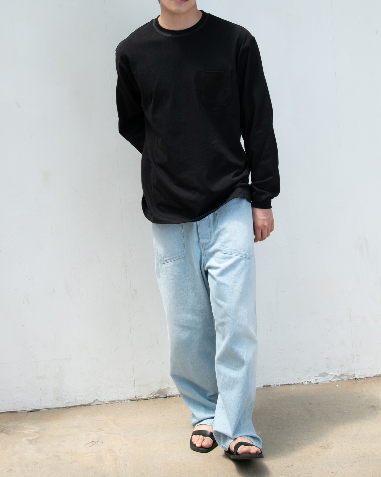 : 캐주얼한 분위기의 롱 슬리브 티셔츠 입니다. 실켓 가공으로 코튼 표면의 잔털을 제거하여 고른 외관과 부드러운 터치를 갖고 있습니다. 30수 2합의 원단으로 비침은 없이 적당히 얇은 원단이어서 사계절 내내 즐겨 입으실 수 있습니다. 넥라인에 있는 배색 3 Needle 5 Thread 커버스티치와 라운드 처리된 포켓이 특징이며, 여유있는 실루엣으로 여름에는 반바지에 연출하거나 봄, 가을에는 가벼운 아우터 이너용으로도 좋습니다. 짧고 탄탄한 소매 리브를 갖고 있으며 라인과 소매 리브 모두 바텍으로 마감하여 완성도 있고 변형이 적도록 제작했습니다.