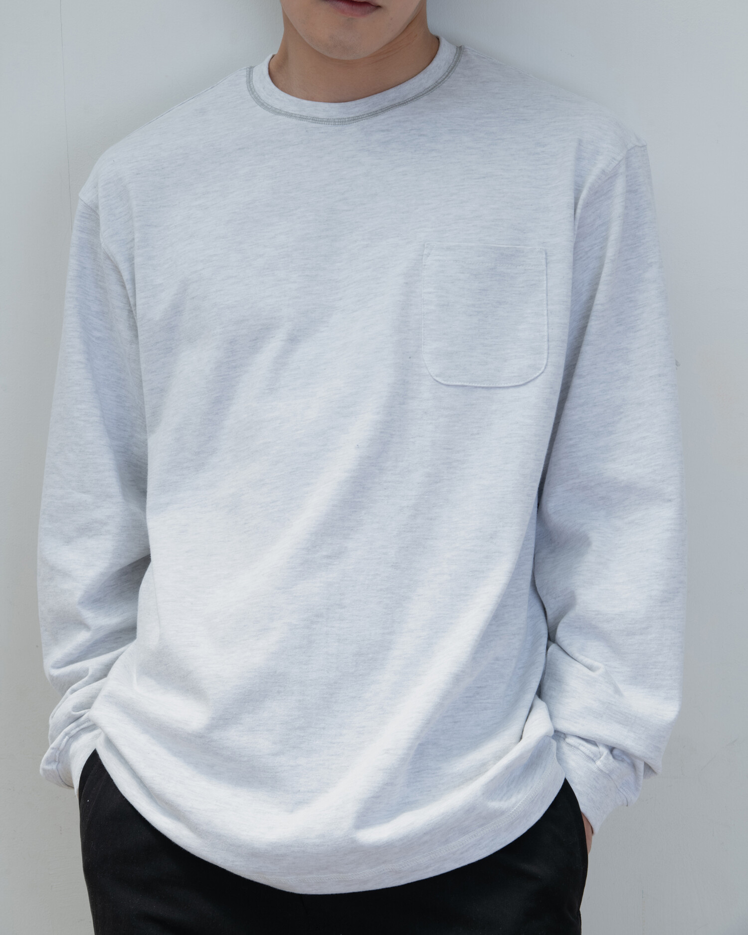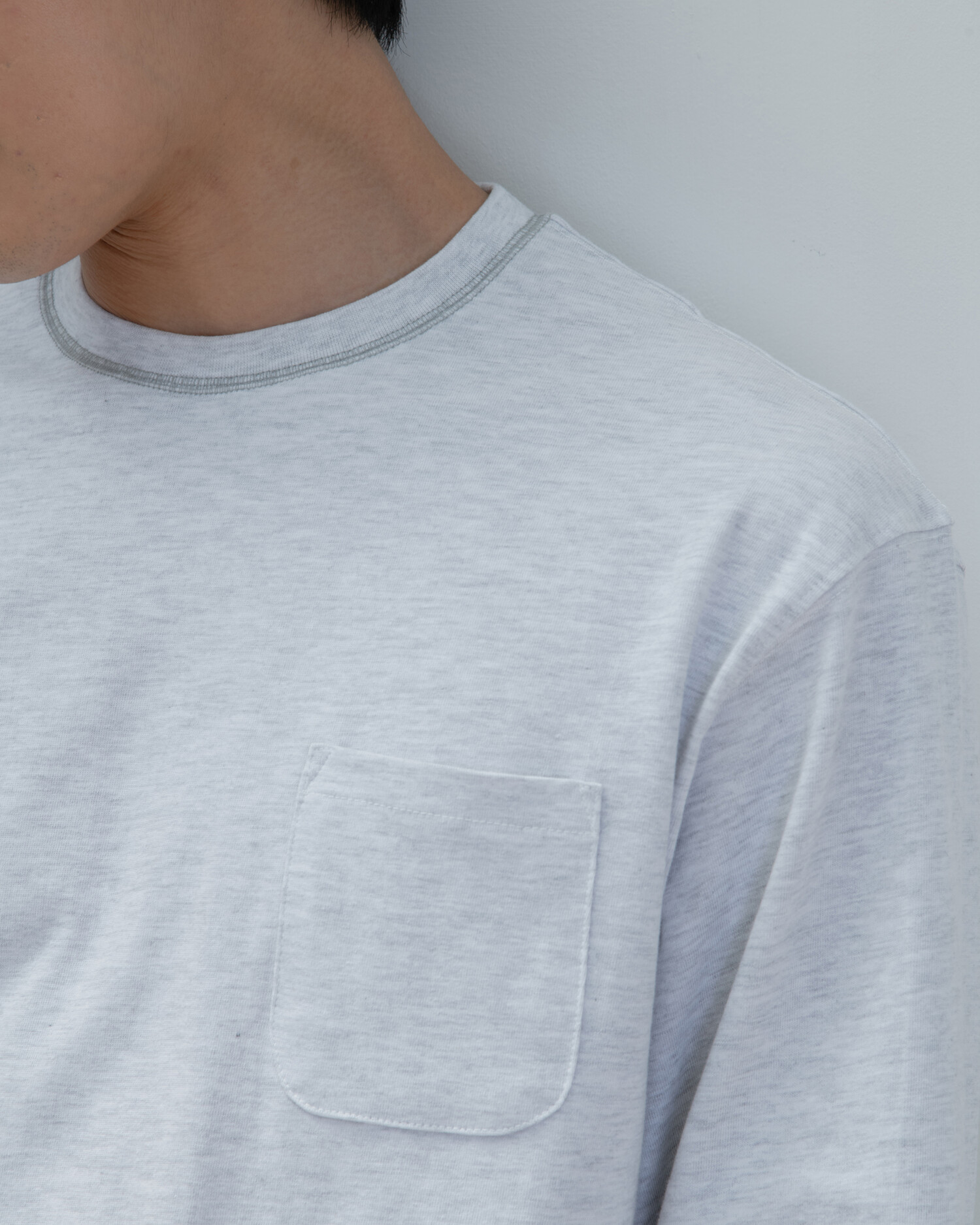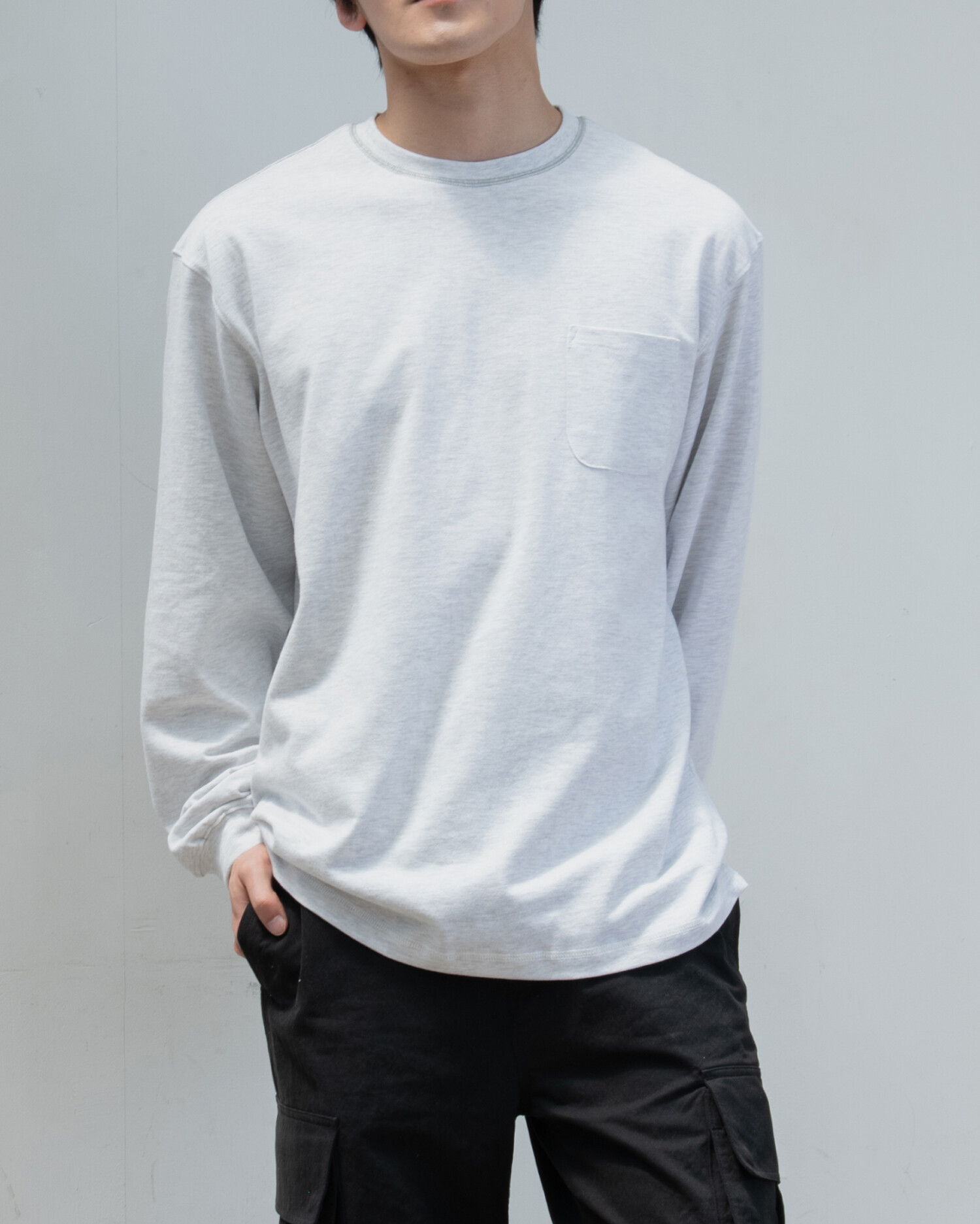 : 캐주얼한 분위기의 롱 슬리브 티셔츠 입니다. 실켓 가공으로 코튼 표면의 잔털을 제거하여 고른 외관과 부드러운 터치를 갖고 있습니다. 30수 2합의 원단으로 비침은 없이 적당히 얇은 원단이어서 사계절 내내 즐겨 입으실 수 있습니다. 넥라인에 있는 배색 3 Needle 5 Thread 커버스티치와 라운드 처리된 포켓이 특징이며, 여유있는 실루엣으로 여름에는 반바지에 연출하거나 봄, 가을에는 가벼운 아우터 이너용으로도 좋습니다. 짧고 탄탄한 소매 리브를 갖고 있으며 라인과 소매 리브 모두 바텍으로 마감하여 완성도 있고 변형이 적도록 제작했습니다.