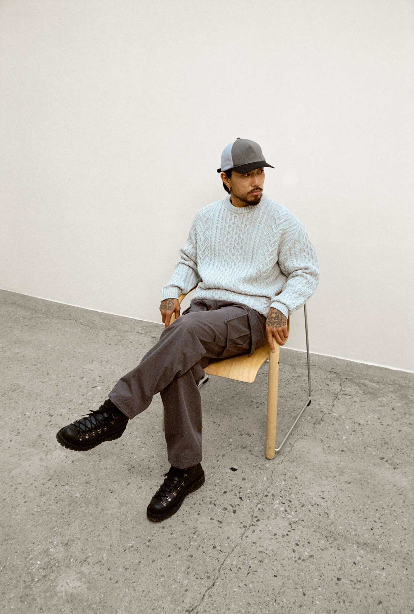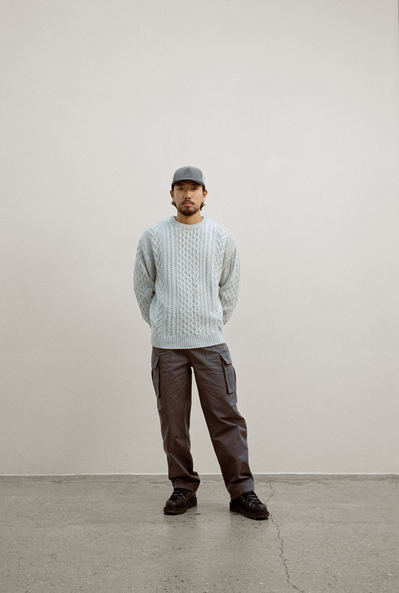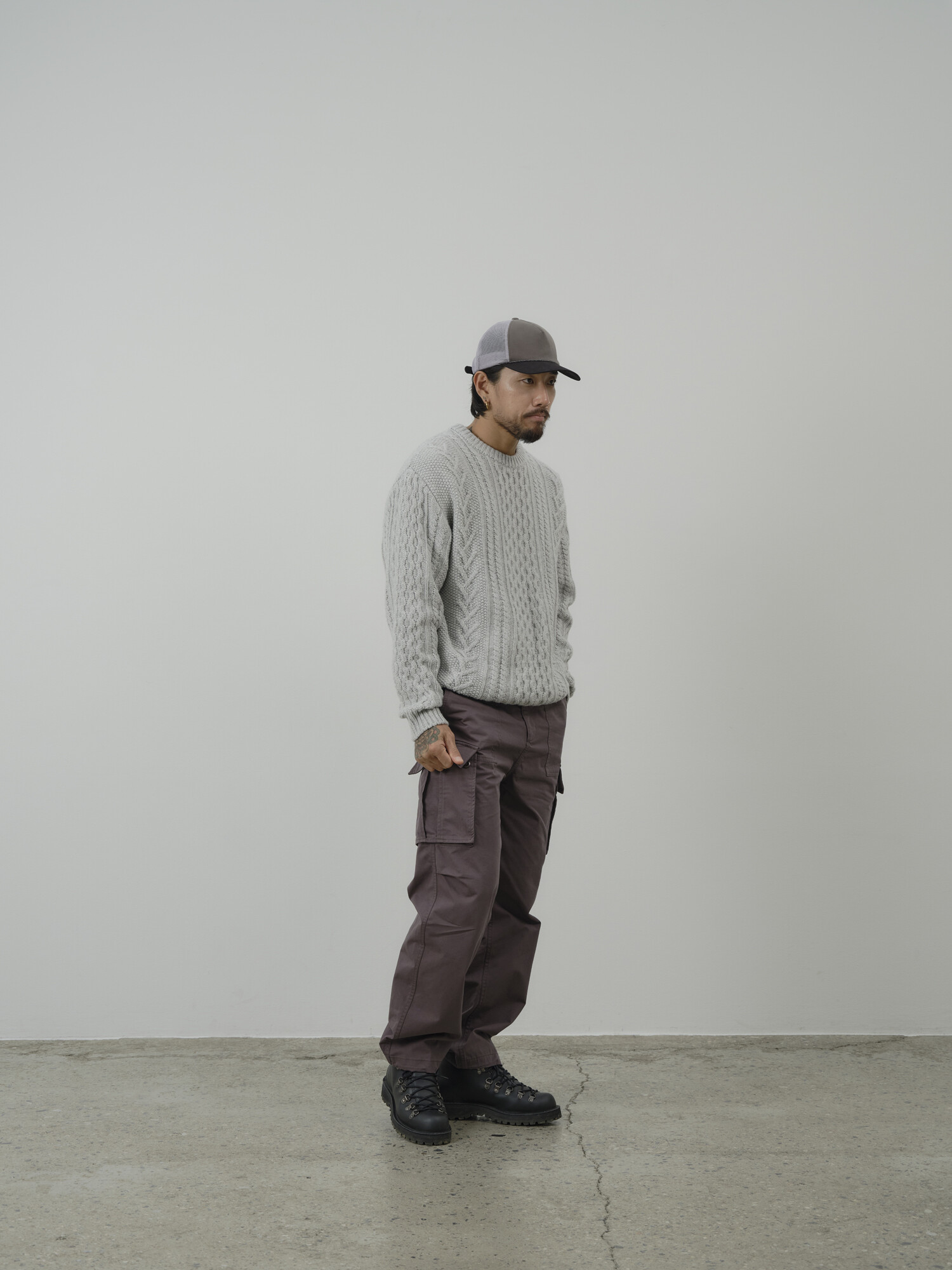 : '퍼티그 카고 팬츠'는 퍼티그 팬츠(Fatigue Pants) 와 카고 팬츠(Cargo Pants)의 유래에서 영감을 받아 두 스타일의 장점을 결합하여 제작되었습니다. 퍼티그 팬츠(Fatigue Pants)는 미군에서 작업복으로 쓰이던 군용 바지로, 허벅지와 무릎 부분의 큼직한 아웃포켓이 특징이며 실용성을 강조한 디자인이었습니다. 카고 팬츠(Cargo Pants)는 영국 군대에서 시작되어 다용도 포켓을 갖춘 바지로, 2차 세계대전 당시 병사들이 다양한 장비를 수납할 수 있도록 설계되었습니다. 이 바지에는 퍼티그 팬츠의 아웃포켓과 카고 팬츠의 카고 포켓을 혼합하여 실용성을 더욱 높였는데요. 허리 양 옆에는 웨빙과 비죠 디테일로 허리 조절이 가능하며, 카고 포켓 아래에는 무릎 쪽 플리츠가 있습니다. 또한 밑단에는 스트링을 추가해 폭을 조절할 수 있도록 설계해 다양한 스타일링이 가능합니다. 전반적으로 적당히 여유있는 스트레이트 핏이며 캐주얼한 분위기에 잘 녹아드는 제품입니다. 사용된 원단은 나일론과 코튼이 혼방된 트윌 소재로, 바이오 워싱을 거쳐 한층 부드러운 터치감을 주었으며, 완성 후 빈티지한 느낌을 살리기 위해 추가 노멀 워싱 처리하였습니다. 이를 통해 시접 부분과 돌출된 포켓 부분 등 입체적인 부위에 자연스러운 워싱감이 도드라져 적당히 사용감 있어보이는 빈티지 분위기를 완성했습니다. 허리 어드저스터와 다양한 포켓들을 통해 실용적이며 워싱된 트윌 원단을 사용한 외관 디자인이 특징인 제품입니다.
