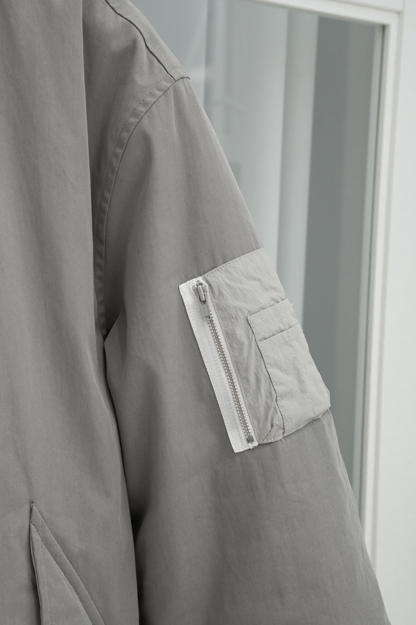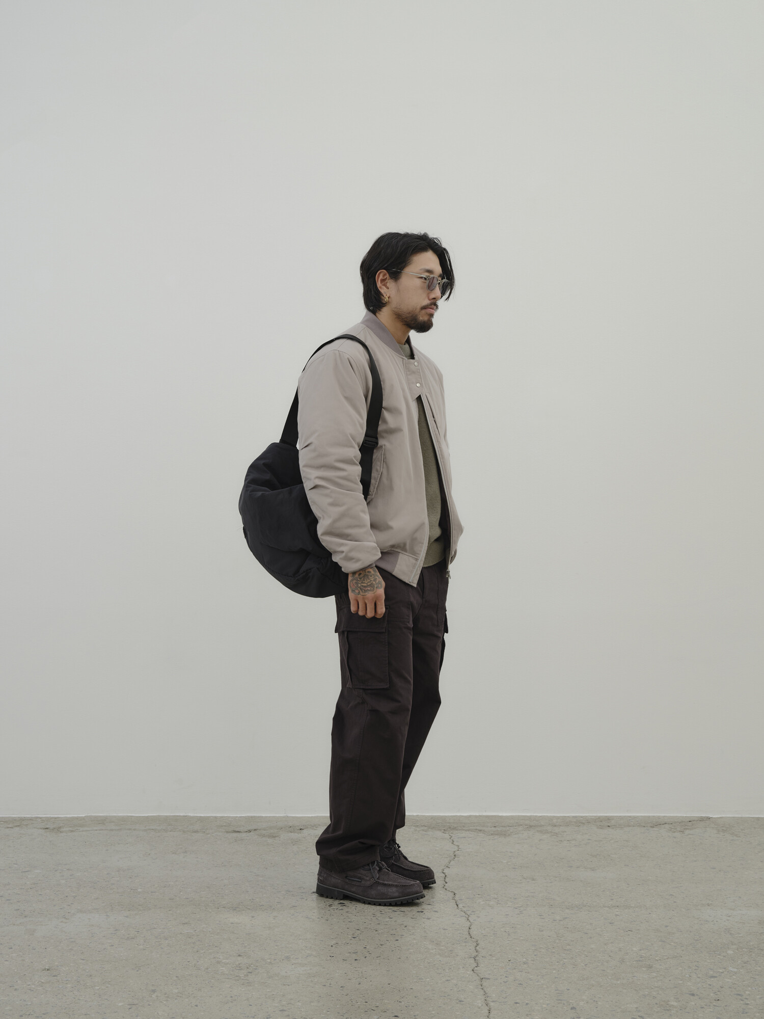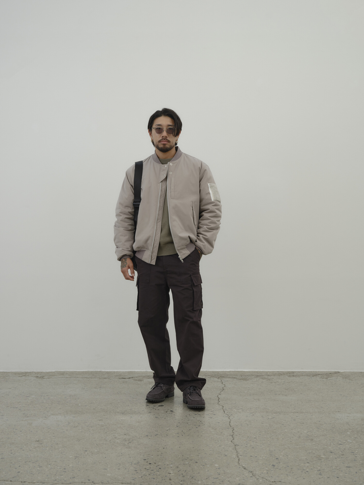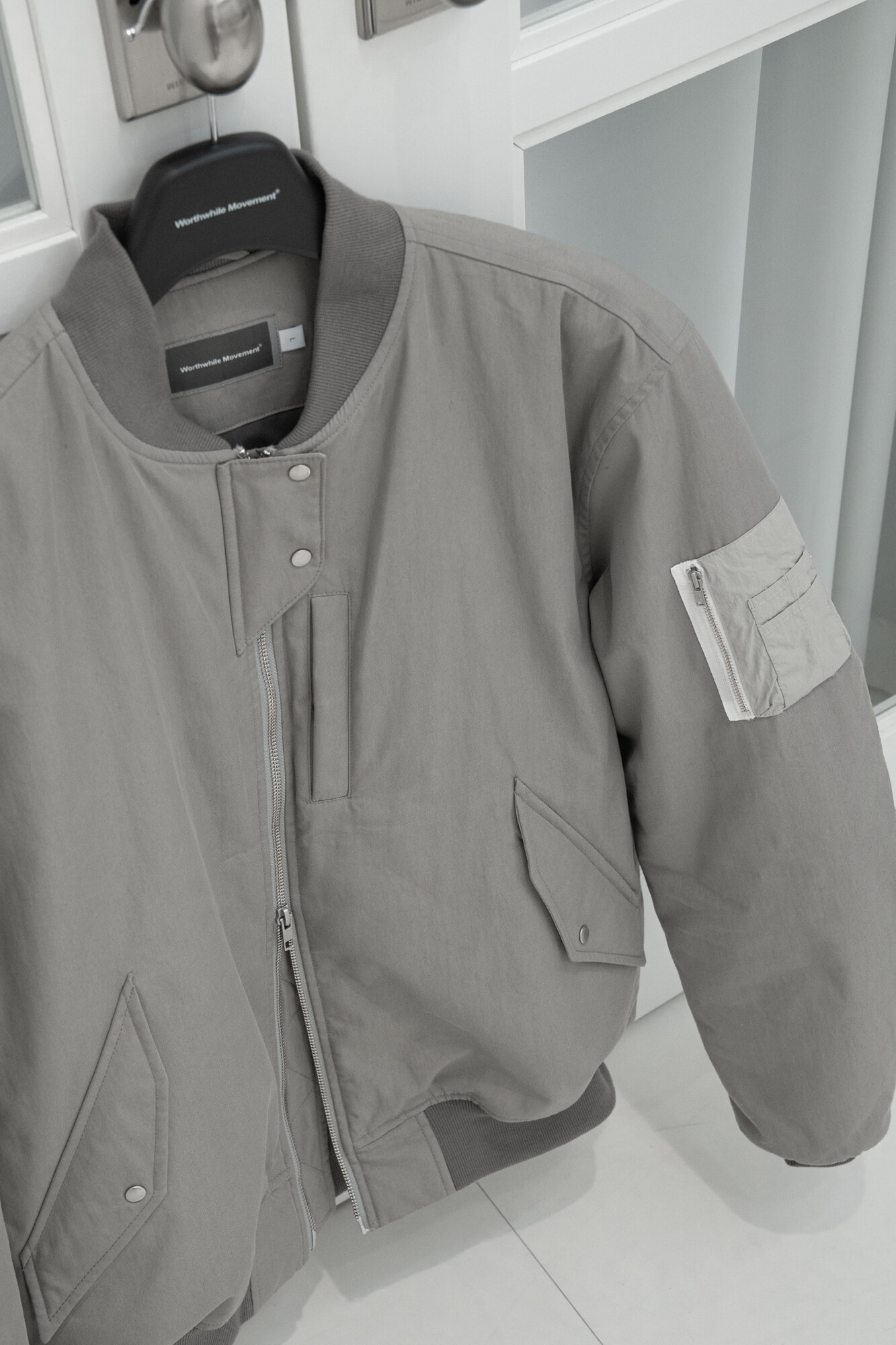 : 공군의 80년대 MA-1 자켓 오리지널을 베이스로 월스와일 무브먼트만의 구조적인 디테일 변형과 원단 조합을 통해 현대적인 플라이트 자켓을 구현했습니다. 많이 볼 수 있는 광택감이 있는 나일론 패브릭 대신 바이오 워싱된 나일론, 코튼 혼방 원단을 사용하여 원단의 부드러운 질감과 빈티지한 루킹이 매력적입니다. 좌측 소매의 포켓과 몸 판 포켓의 플랩 안단 등에는 나일론 소재의 원단을 배치하여 보이지 않는 곳 까지 세심하게 마감하여 통일된 분위기를 전달합니다. 3M 신슐레이트 충전재를 사용하여 가볍고 보온성이 우수하며 관리가 용이합니다. 착용시 인체의 구조를 고려한 소매의 굴곡진 패턴과 플리츠, 그리고 등판쪽 다트를 통해 편안한 피팅감을 부여하며 넉넉한 품과 적당한 기장감의 제품으로 가을부터 겨울까지 활용하시기 좋습니다.
