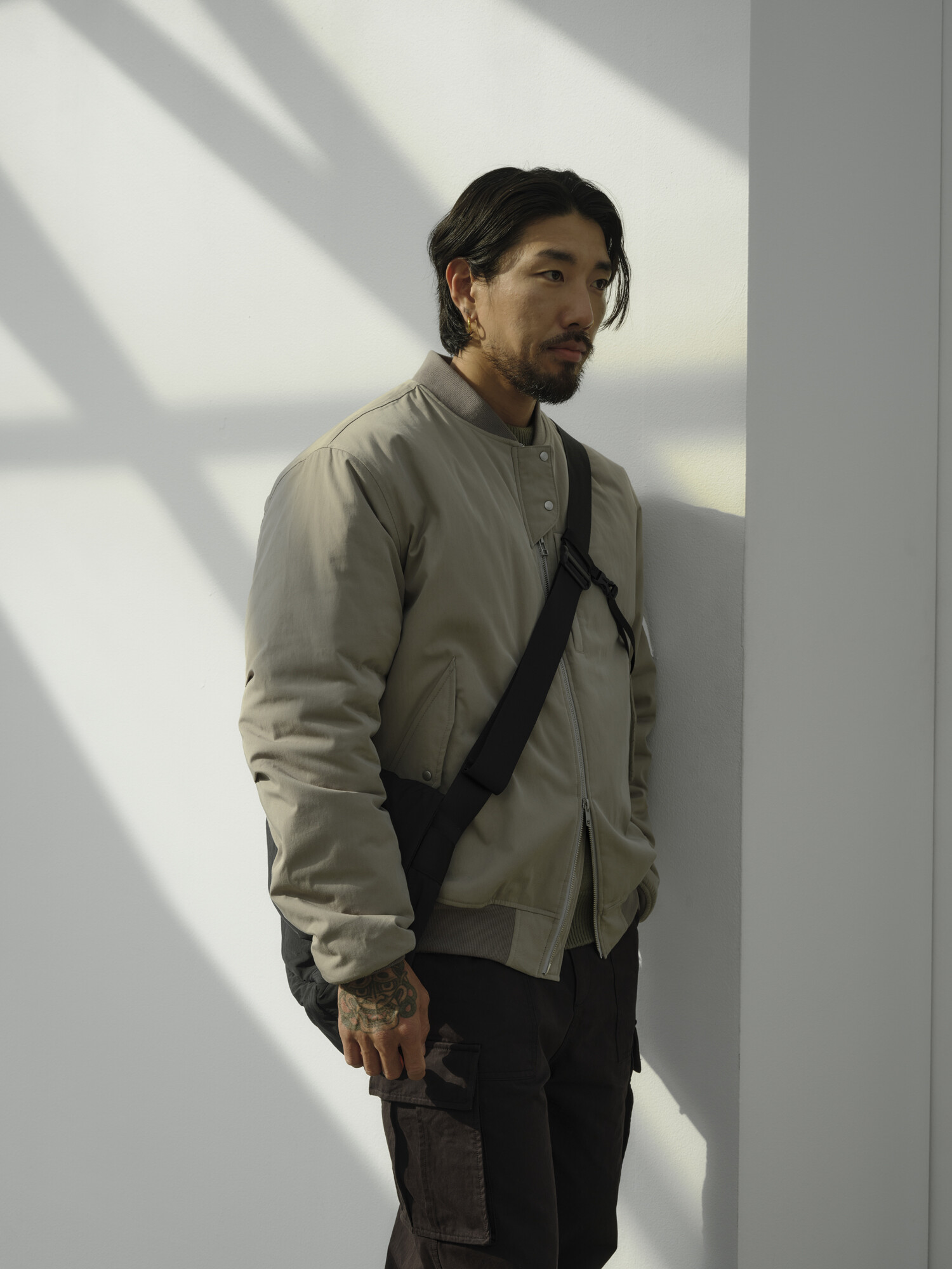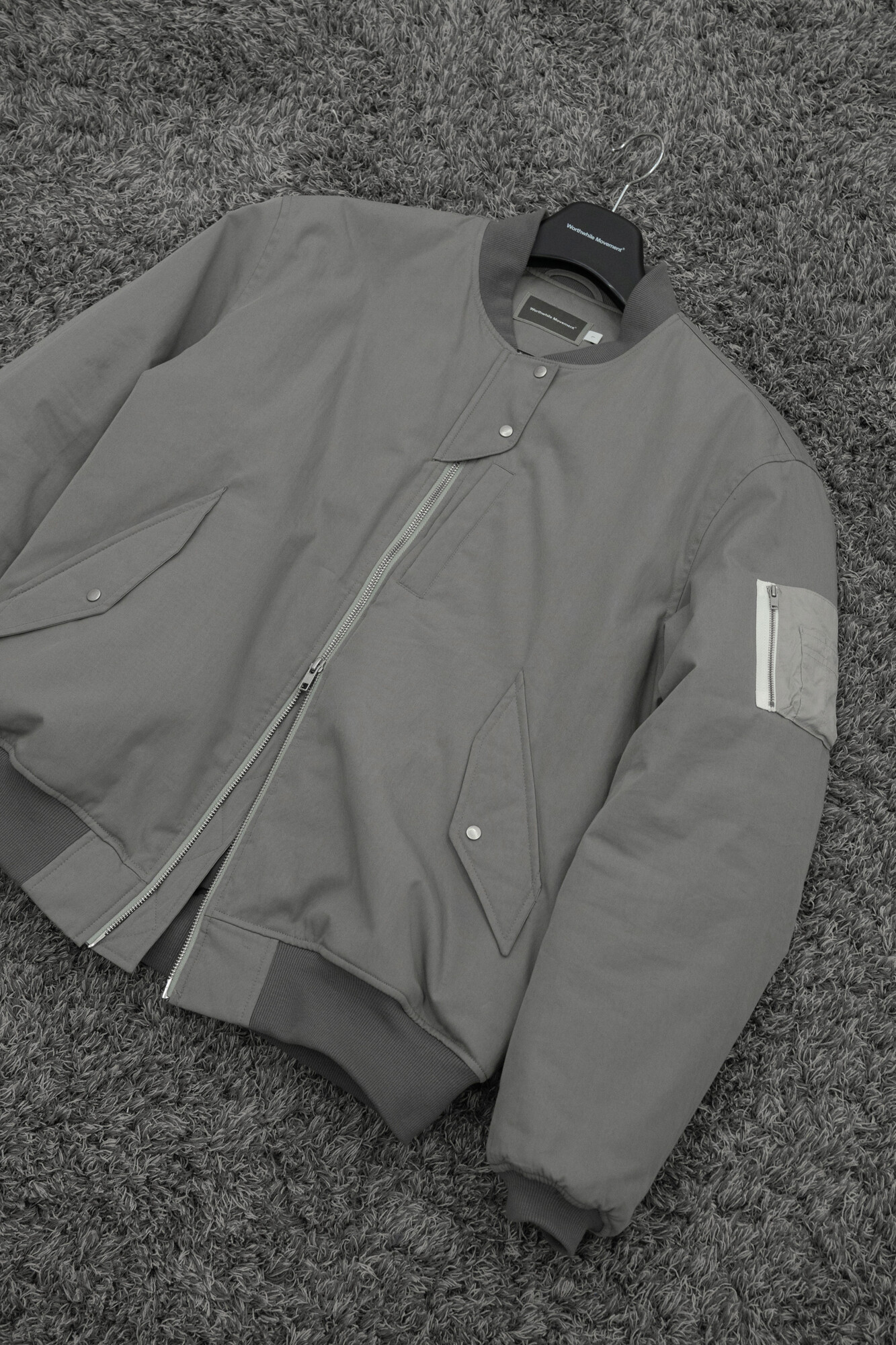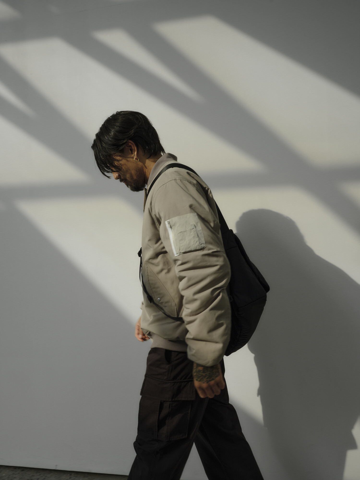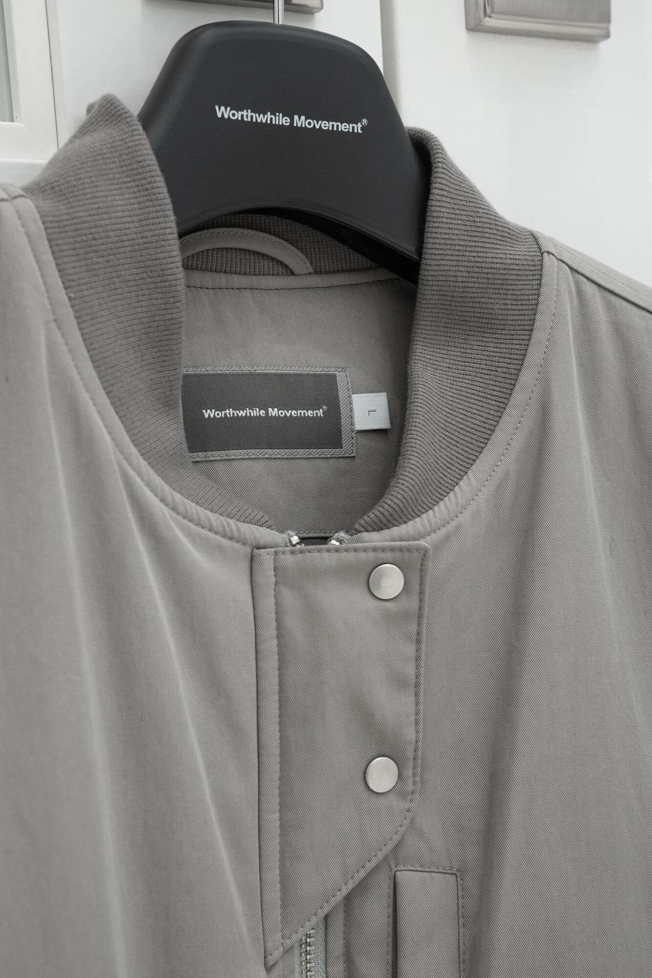 : 공군의 80년대 MA-1 자켓 오리지널을 베이스로 월스와일 무브먼트만의 구조적인 디테일 변형과 원단 조합을 통해 현대적인 플라이트 자켓을 구현했습니다. 많이 볼 수 있는 광택감이 있는 나일론 패브릭 대신 바이오 워싱된 나일론, 코튼 혼방 원단을 사용하여 원단의 부드러운 질감과 빈티지한 루킹이 매력적입니다. 좌측 소매의 포켓과 몸 판 포켓의 플랩 안단 등에는 나일론 소재의 원단을 배치하여 보이지 않는 곳 까지 세심하게 마감하여 통일된 분위기를 전달합니다. 3M 신슐레이트 충전재를 사용하여 가볍고 보온성이 우수하며 관리가 용이합니다. 착용시 인체의 구조를 고려한 소매의 굴곡진 패턴과 플리츠, 그리고 등판쪽 다트를 통해 편안한 피팅감을 부여하며 넉넉한 품과 적당한 기장감의 제품으로 가을부터 겨울까지 활용하시기 좋습니다.