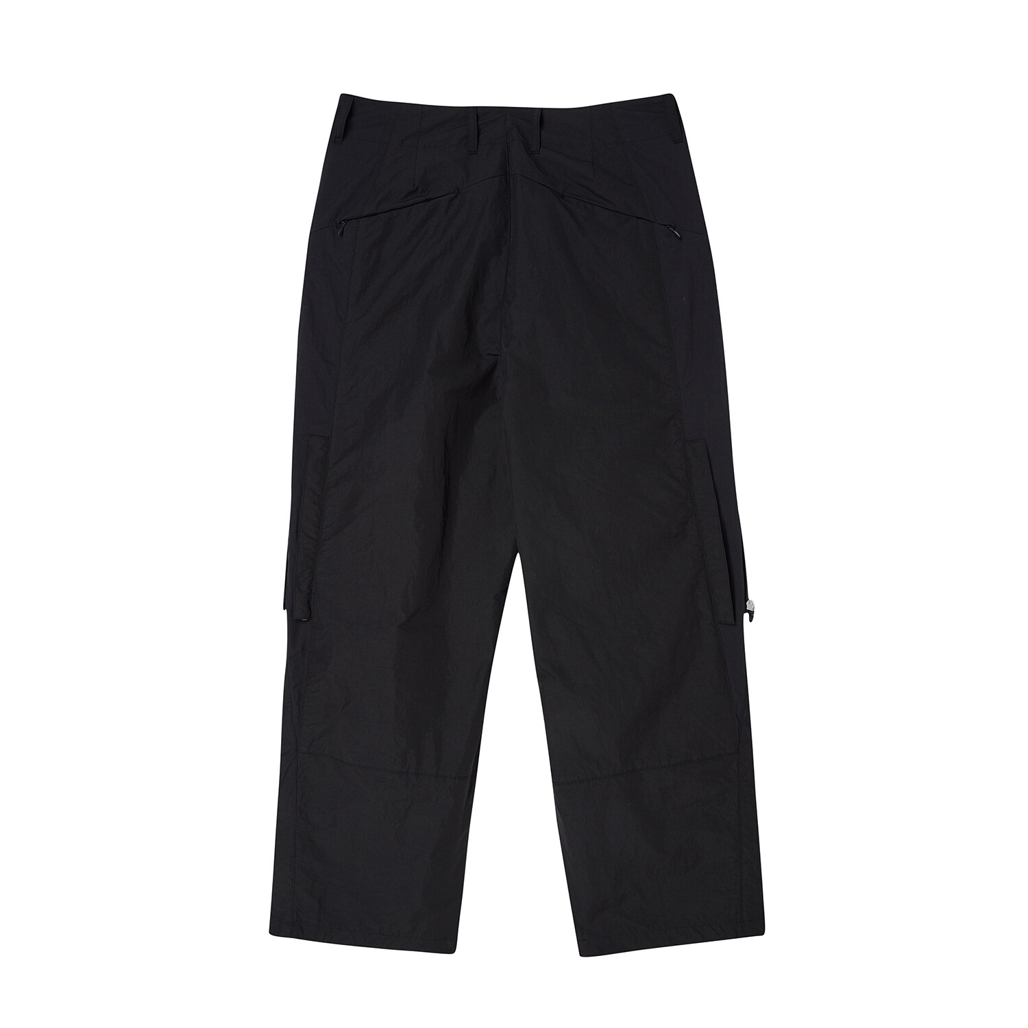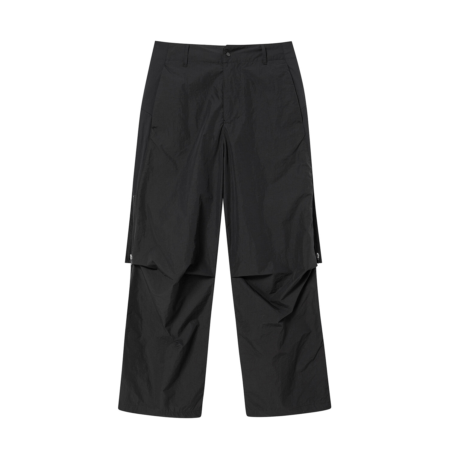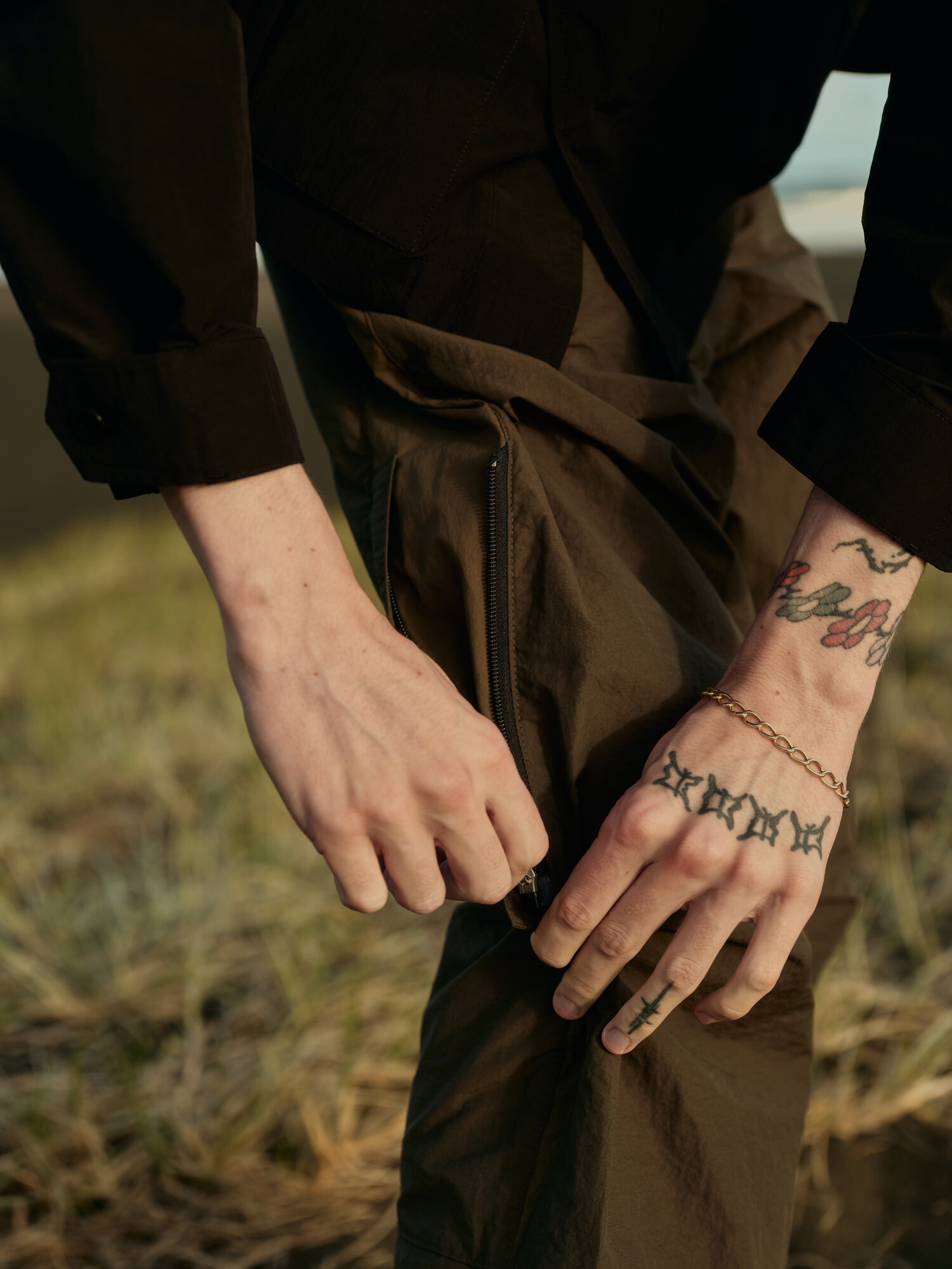 : 플레어드저스터 팬츠는 테크니컬한 디자인과기능성을 갖춘 현대적인 디자인의 제품으로 다양한 환경에서 활동성을 극대화하면서도 유니크한 실루엣을 연출할 수 있습니다. 메인 원단으로 사용된 나일론/코튼 혼방 소재는 각각의 장점을 극대화하여 내구성, 착용감, 경량성을 모두 갖추고 있는데 뛰어난 내구성 뿐 아니라 면과 같은 부드러운 촉감이 장점입니다. 이 제품의 가장 주요한 특징 중 하나는 플레어핏으로 변형되는 패턴과 디테일이 적용된 무릎 부분입니다. 무릎 아래 부분에 주름 디테일을 넣어 기본적으로는 비교적 풍성항 실루엣을 보여주지만 입체적인 절개라인에 YKK 지퍼를 배치하여 무릎 부분의 실루엣을 조절 및 플레어핏으로 변형시킬 수 있 는 위트있는 팬츠입니다. 또한, 플레어핏 지퍼는 외부에서 보이지 않도록 제원단 패널로 가려져 깔끔한 마무리와 동시에 부담스럽지 않은 디테일을 제공합니다. 슬라이더는 일반적인 제품과는 달리 YKK의 DSYG 모델을 사용하여 플랫하게 고정되며, 세미오토락 기능이 있어서 착용 중에 슬라이더가 쉽게 움직이지 않고 안정적으로 착용할 수 있습니다. 또한 컬러와 질감 면에서도 메인 원단과 배색 원단을 조화롭게 사용하여 미묘한 색감 차이와 질감의 대비를 주었는데요. 이러한 컬러 배색은 뒷면에서도 확인하실 수 있습니다. 뒷 주머니는 사선으로 배치하여 손을 넣는 상황에서 사용자의 편리함을 고려했습니다. 또한 콘솔지퍼와 바텍 마감으로 미니멀하고 견고한 마감 컨디션을 자랑합니다.