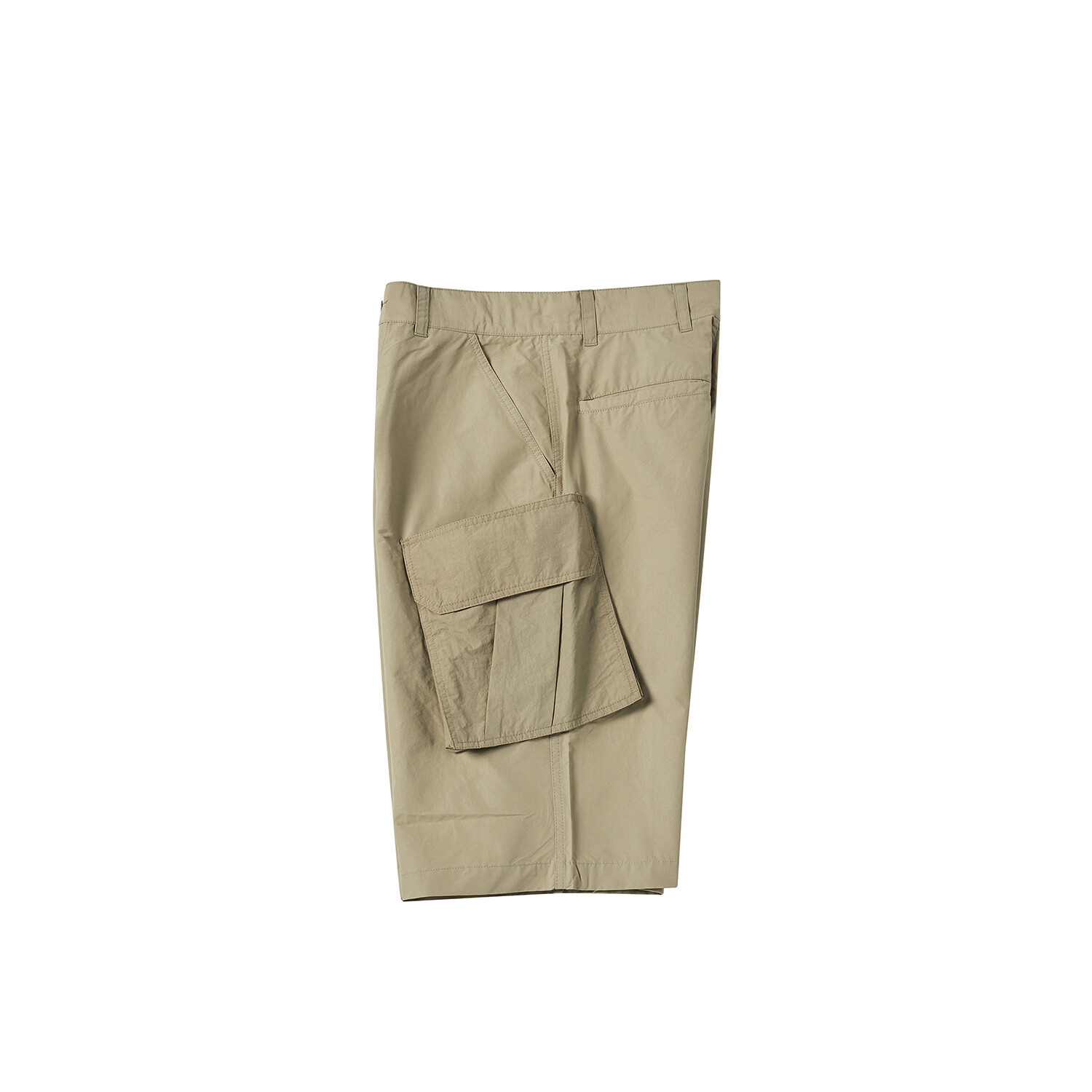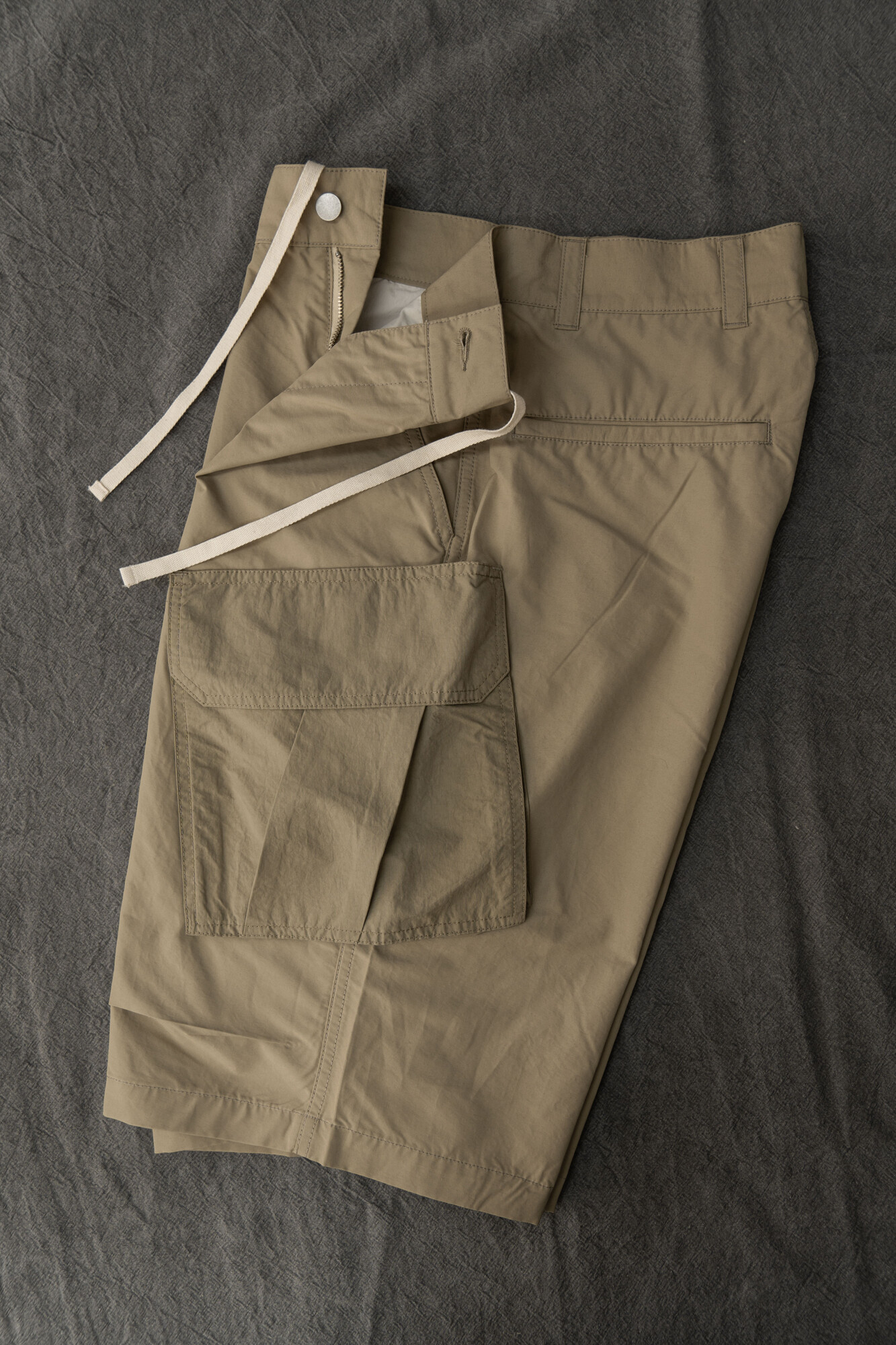 무엇보다 버뮤다 카고 팬츠의 가장 큰 특징은 입체적인 포켓입니다. 포켓 구성은 정제된 디테일 속에서도 기능적인 완성도를 보여줍니다. 큰 플리츠를 통해 여유공간을 확보한 양 옆의 카고 포켓은 이 옷의 주요한 포인트로 의도적으로 은은한 배색 원단을 채택했습니다. 또한 2중 레이어 구조를 갖고 있어서 포켓 덮개 위아래로 2중 수납이 가능합니다. 특히 포켓을 비스듬하게 배치하여 디자인적 특징을 강조하였지만 포켓의 플리츠는 팬츠의 시접과 같이 일자로 똑바로 떨어지는 라인을 구성하여 이색적이면서도 확실한 디자인 아이덴티티를 보여줍니다. 프론트 팬츠와 캔톤 버튼은 YKK社의 파츠를 사용하여 원,부자재와 마감까지 특별하게 제작했습니다. 하프 팬츠보다 여유로운 총장의 버뮤다 팬츠로 가을까지 폭넓게 활용해 보시기 바랍니다.