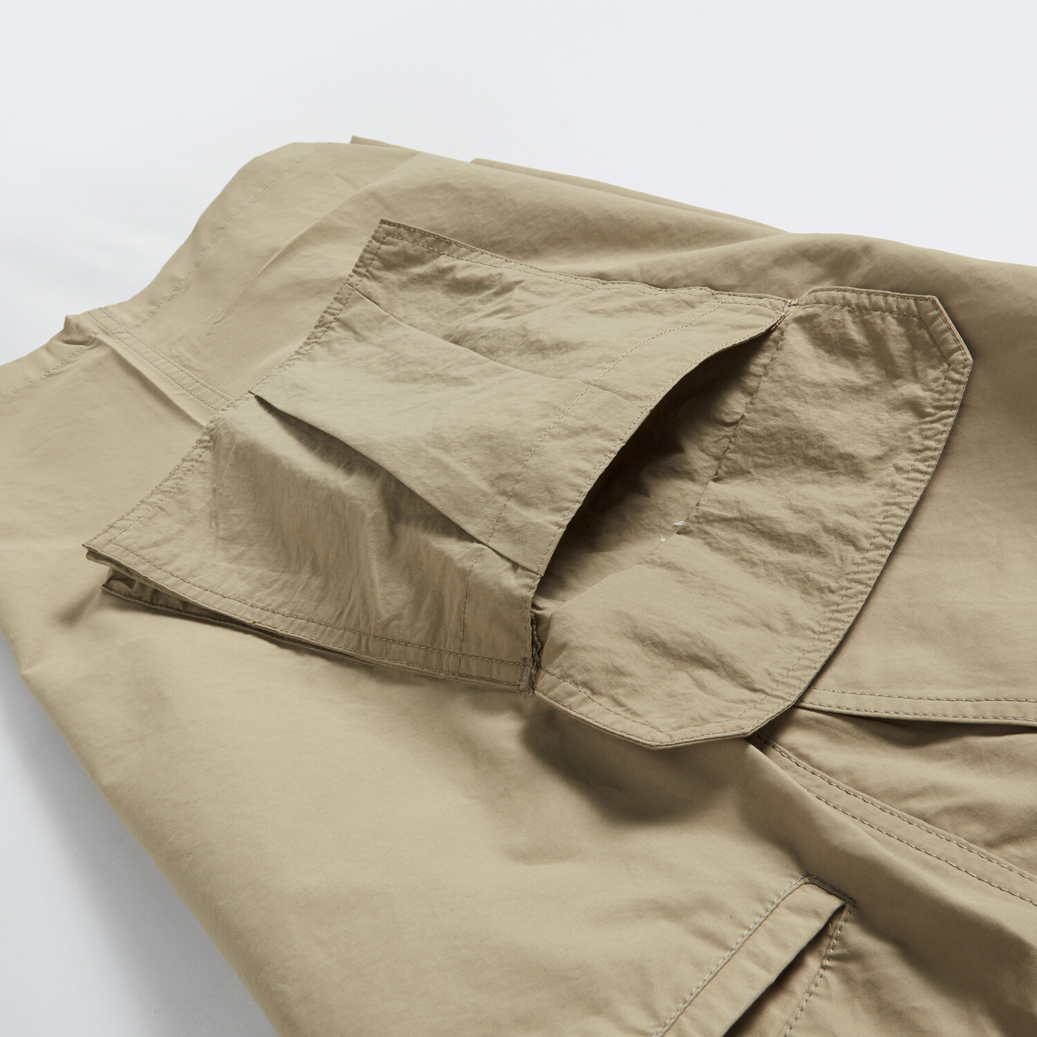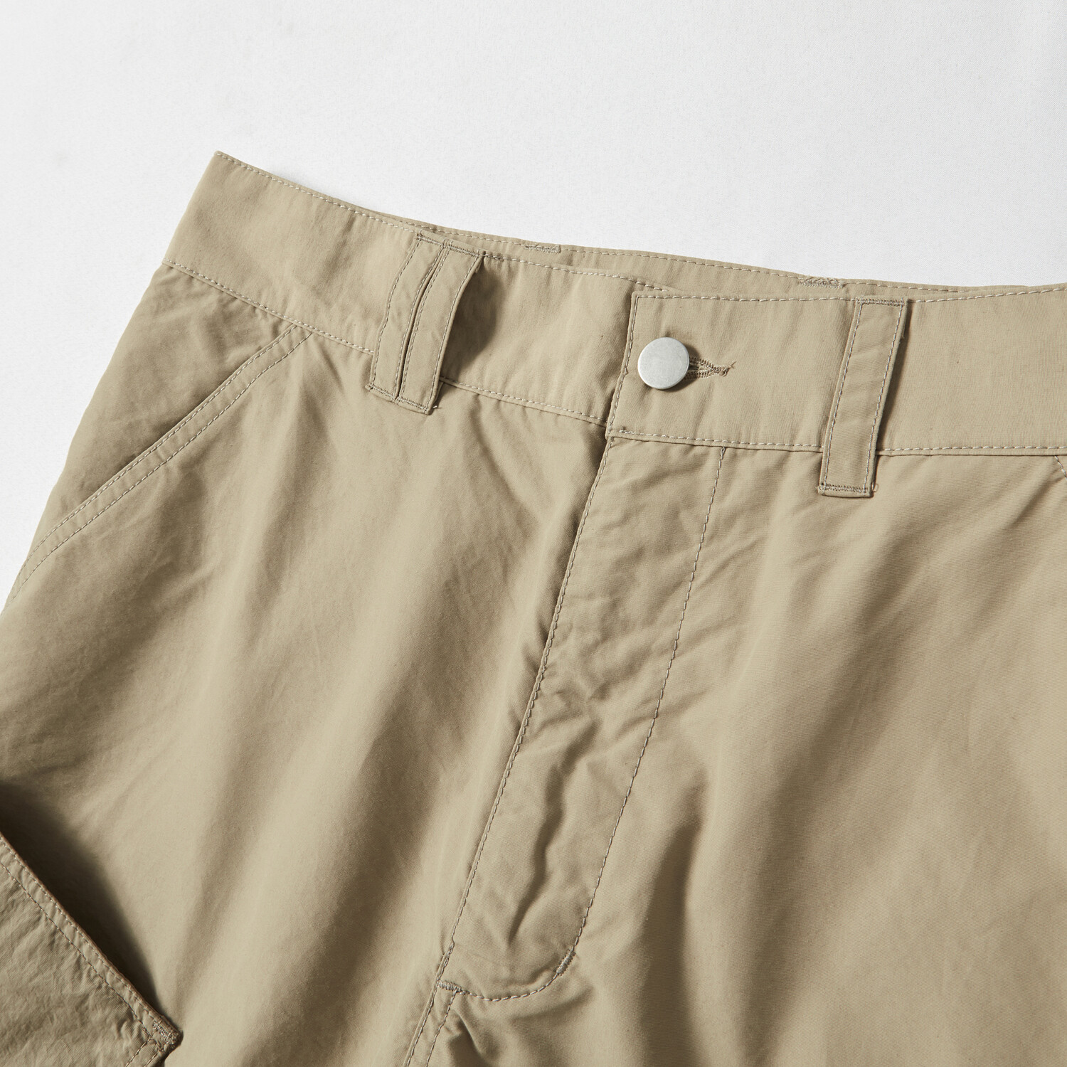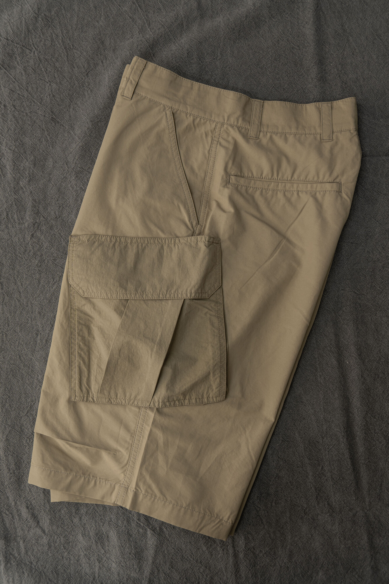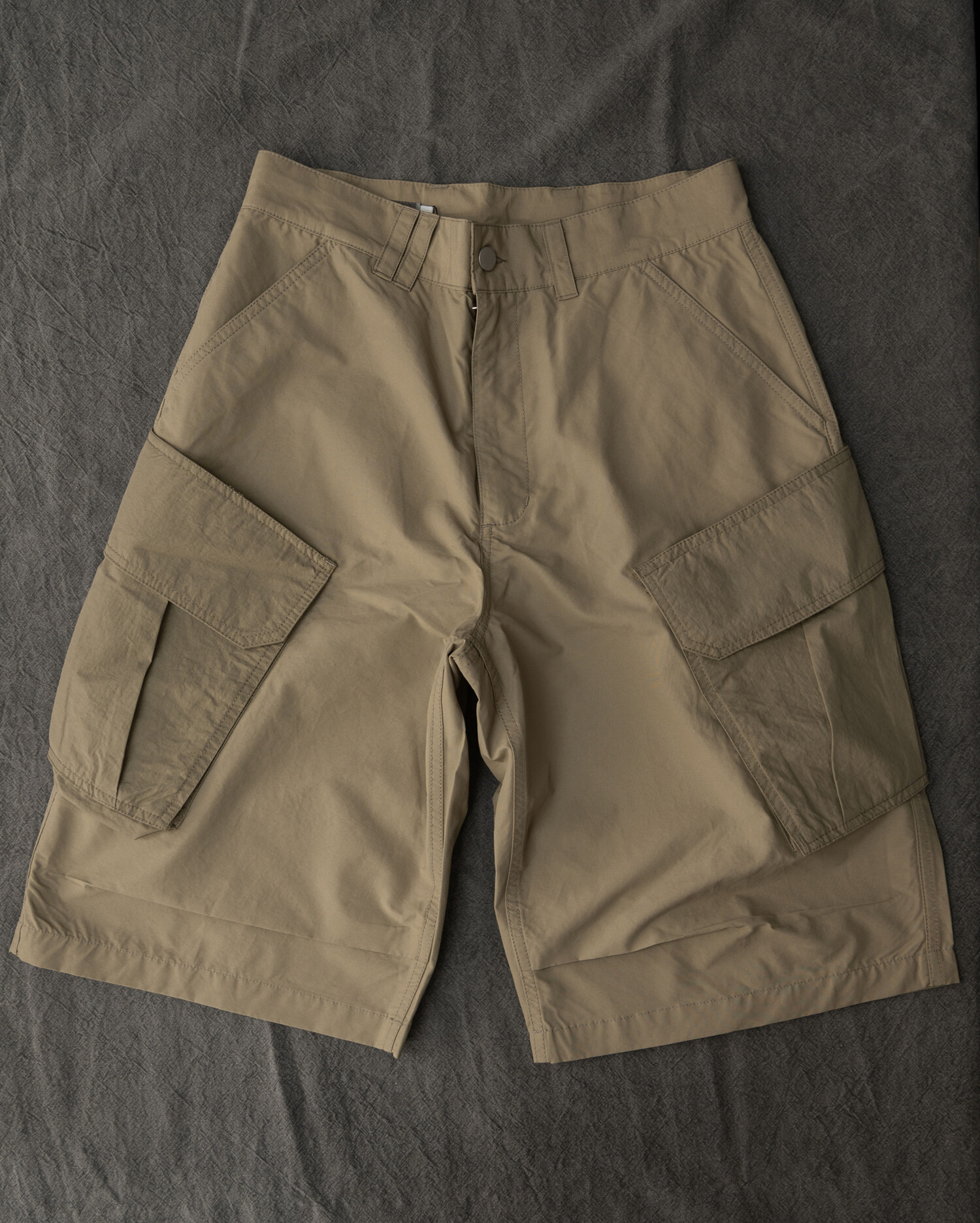 버뮤다 카고 팬츠는 여유로운 실루엣과 실용적인 디테일을 갖춘 유틸리티 무드의 캐주얼 아이템입니다. 패턴 설계 단계에서 테크니컬한 요소들을 밀도있게 기획한 디자인으로, 다양한 활동에 유연하게 대응할 수 있도록 설계되었습니다. 무릎의 플리츠 디테일, 넉넉한 실루엣과 총장 그리고 허벅지 너비와 힙둘레 등 전반적인 사이즈를 부담스럽지 않지만 여유롭게 제작하여 착용자에게 보다 자유로운 움직임을 제공합니다. 메인 원단으로 사용된 나일론/코튼 혼방소재는 가볍고 쾌적한 착용감을 제공하면서도, 마찰에 강한 나일론 특유의 내구성과 면의 부드러운 감촉이 공존합니다. 여기에 가먼트 워싱을 더해 자연스럽고 입체적인 표면감을 살렸습니다.