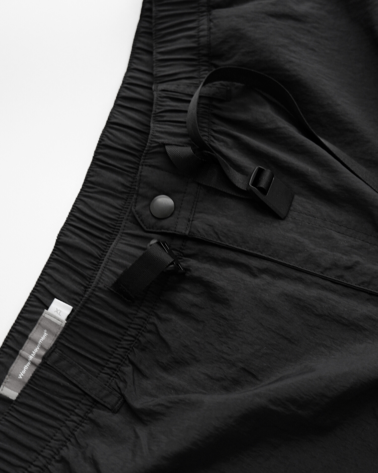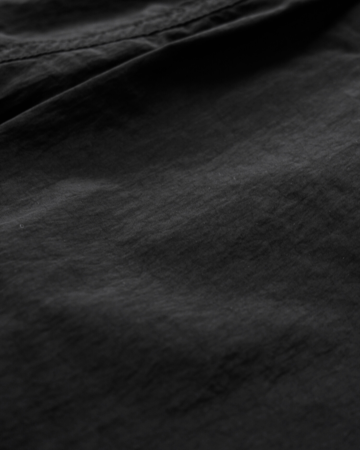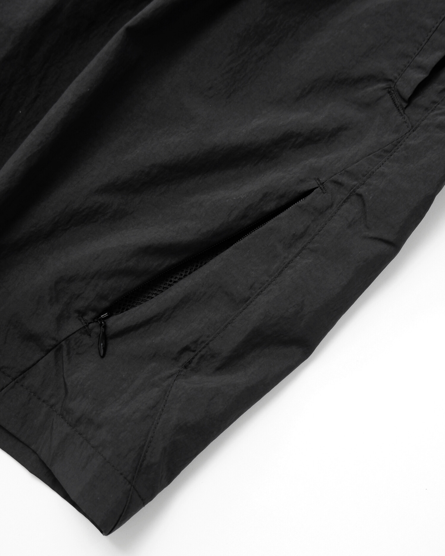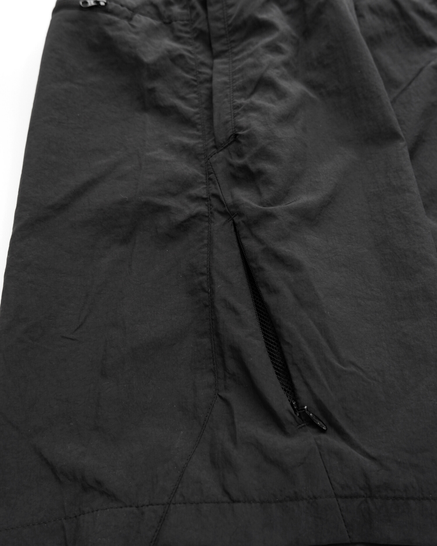 : 경쾌한 기장감에 시원한 감촉이 곧바로 피부에 느껴지는 짧은 반바지는 여름철 가장 필요한 아이템이 아닐까 합니다. ‘유틸리티 쇼츠’는 발수 가공된 얇고 가벼운 나일론 패브릭에 쿨 메쉬를 레이어링해서 2중 구조로 제작한 반바지입니다. 좋은 발수력과 쿨한 터치감으로 여름 뿐 아니라 늦봄부터 초가을까지 쭉 입기 좋은 제품인데요. 와샤 가공까지 진행된 원단이어서 가까이 보았을 때 불규칙적이고 미세한 주름과 바스락거리는 터치감이 매력적입니다. 유틸리티 쇼츠의 허리에는 E밴드와 V직 웨빙 그리고 마그네틱 버클을 적용하여 간편하고 빠르게 사이즈 조절이 가능하도록 하였고, 밴딩 구조 특성상 편안한 피팅감을 제공합니다. 바지의 포켓과 벤틸레이션 그리고 절개 구조들은 여러 직선들로 이루어져 있는데 정면과 옆면에서 봤을 때 그 독특한 구조와 매력이 잘 느껴집니다. 메쉬가 레이어드된 반바지의 특성상 벤틸레이션은 일부 역할은 수행할 수 있지만 정확히는 기능적 역할보다 디자인적 배치를 염두해둔 디테일이며 포켓의 입구 사선 절개와 통일성을 이루기 위함입니다. 따라서 벤틸레이션 지퍼는 기호에 맞게 자유롭게 연출해주시기를 바랍니다. 꼼꼼한 봉재와 더불어 보강이 필요한 부분들에는 바텍으로 단단히 고정하였습니다. 잘 만들어진 가볍고 시원한 나일론 쇼츠를 찾는 분들께 추천드립니다.