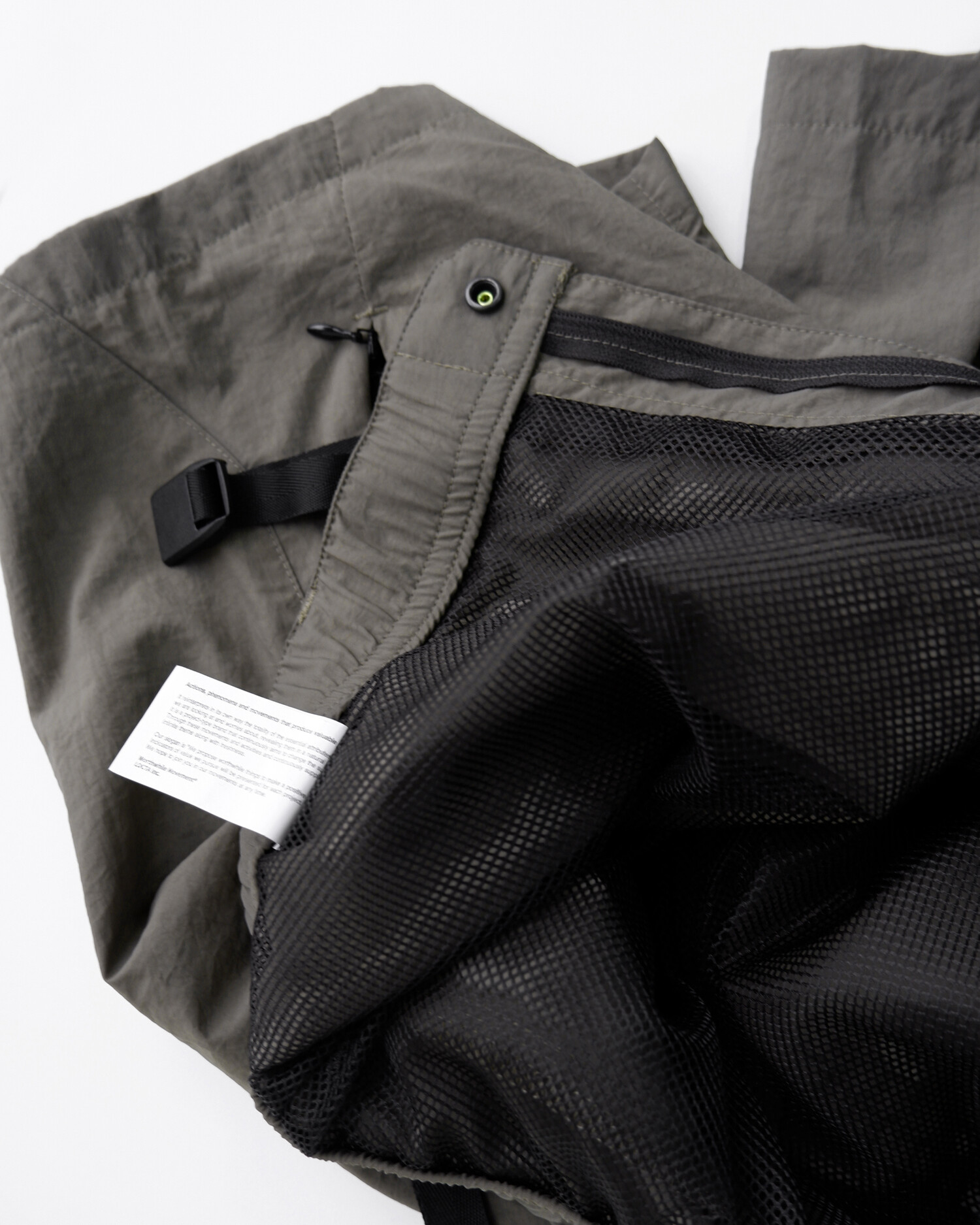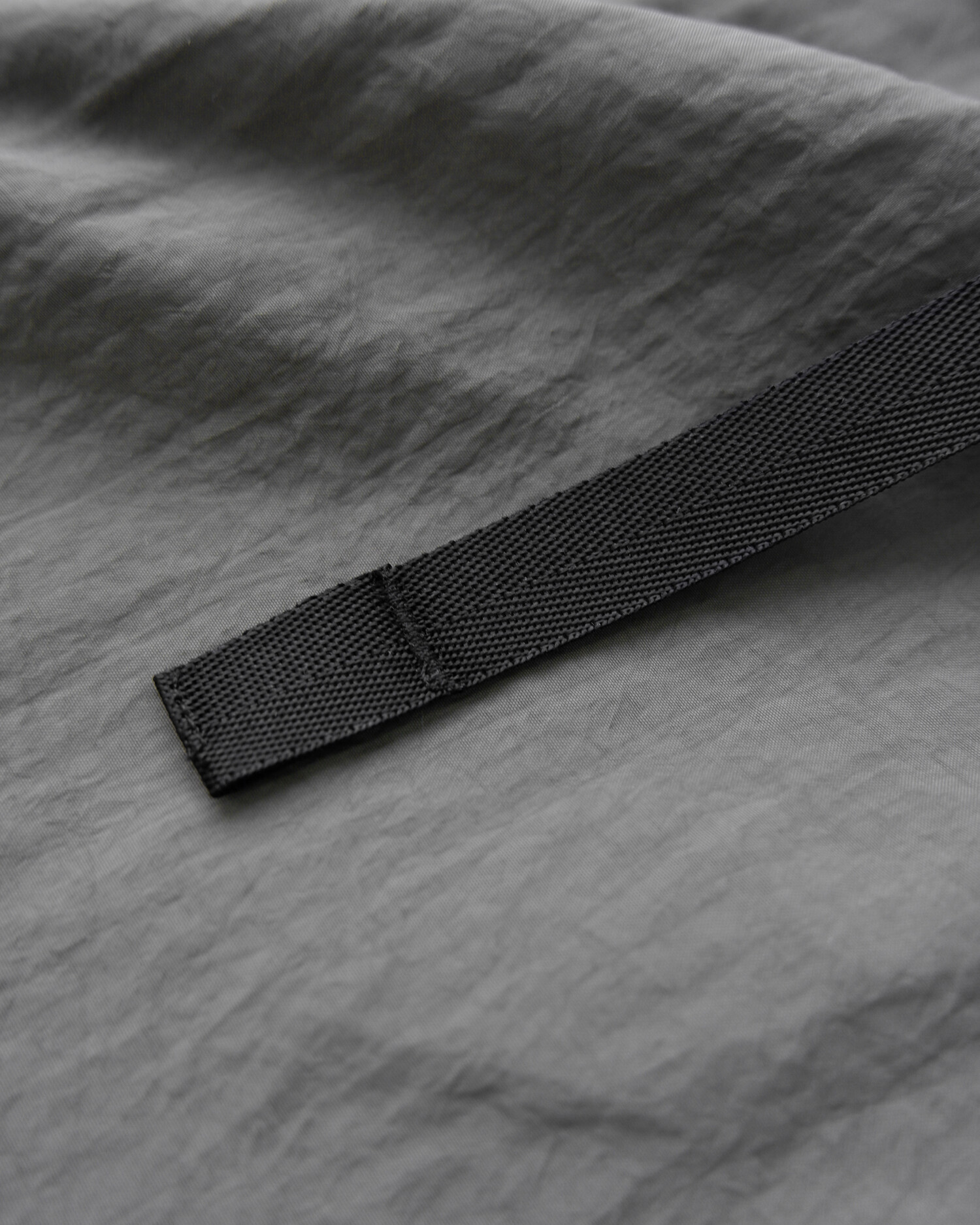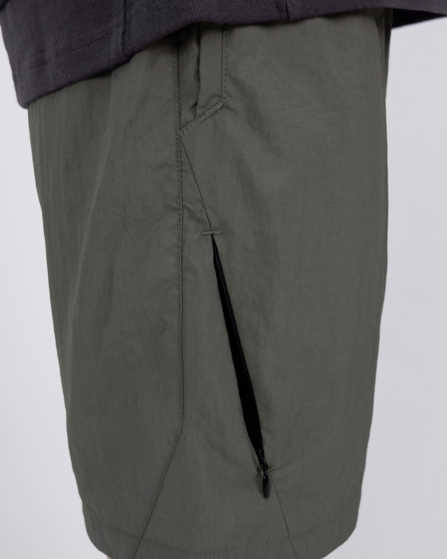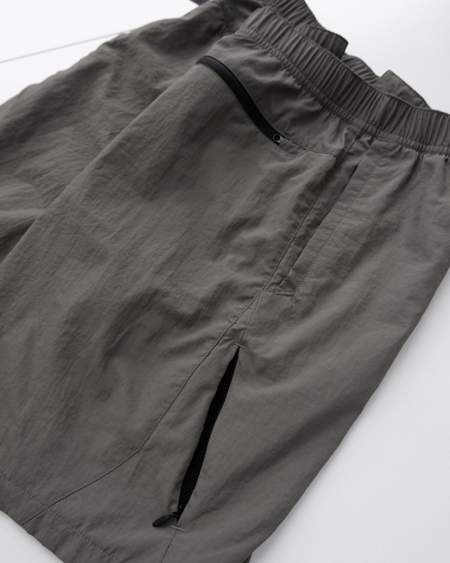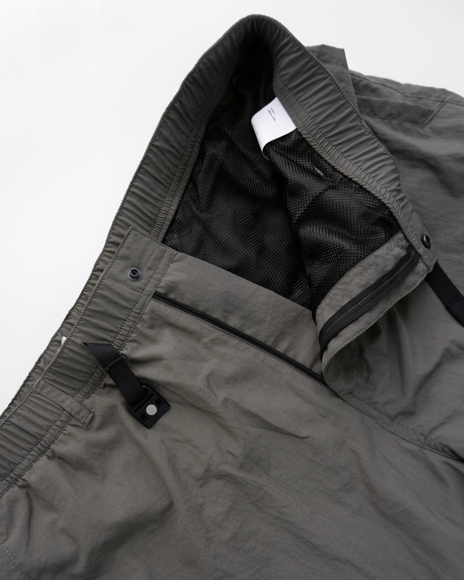 : 경쾌한 기장감에 시원한 감촉이 곧바로 피부에 느껴지는 짧은 반바지는 여름철 가장 필요한 아이템이 아닐까 합니다. ‘유틸리티 쇼츠’는 발수 가공된 얇고 가벼운 나일론 패브릭에 쿨 메쉬를 레이어링해서 2중 구조로 제작한 반바지입니다. 좋은 발수력과 쿨한 터치감으로 여름 뿐 아니라 늦봄부터 초가을까지 쭉 입기 좋은 제품인데요. 와샤 가공까지 진행된 원단이어서 가까이 보았을 때 불규칙적이고 미세한 주름과 바스락거리는 터치감이 매력적입니다. 유틸리티 쇼츠의 허리에는 E밴드와 V직 웨빙 그리고 마그네틱 버클을 적용하여 간편하고 빠르게 사이즈 조절이 가능하도록 하였고, 밴딩 구조 특성상 편안한 피팅감을 제공합니다. 바지의 포켓과 벤틸레이션 그리고 절개 구조들은 여러 직선들로 이루어져 있는데 정면과 옆면에서 봤을 때 그 독특한 구조와 매력이 잘 느껴집니다. 메쉬가 레이어드된 반바지의 특성상 벤틸레이션은 일부 역할은 수행할 수 있지만 정확히는 기능적 역할보다 디자인적 배치를 염두해둔 디테일이며 포켓의 입구 사선 절개와 통일성을 이루기 위함입니다. 따라서 벤틸레이션 지퍼는 기호에 맞게 자유롭게 연출해주시기를 바랍니다. 꼼꼼한 봉재와 더불어 보강이 필요한 부분들에는 바텍으로 단단히 고정하였습니다. 잘 만들어진 가볍고 시원한 나일론 쇼츠를 찾는 분들께 추천드립니다.