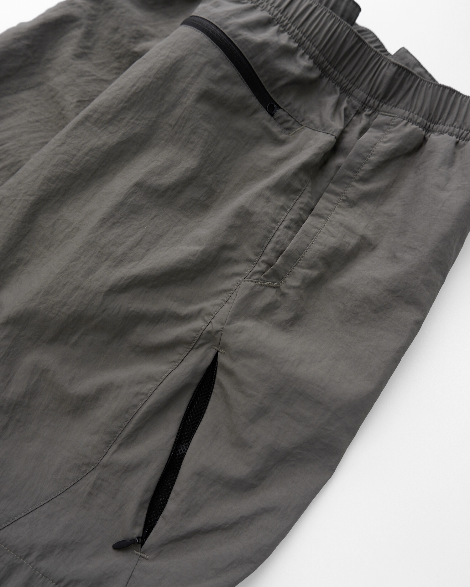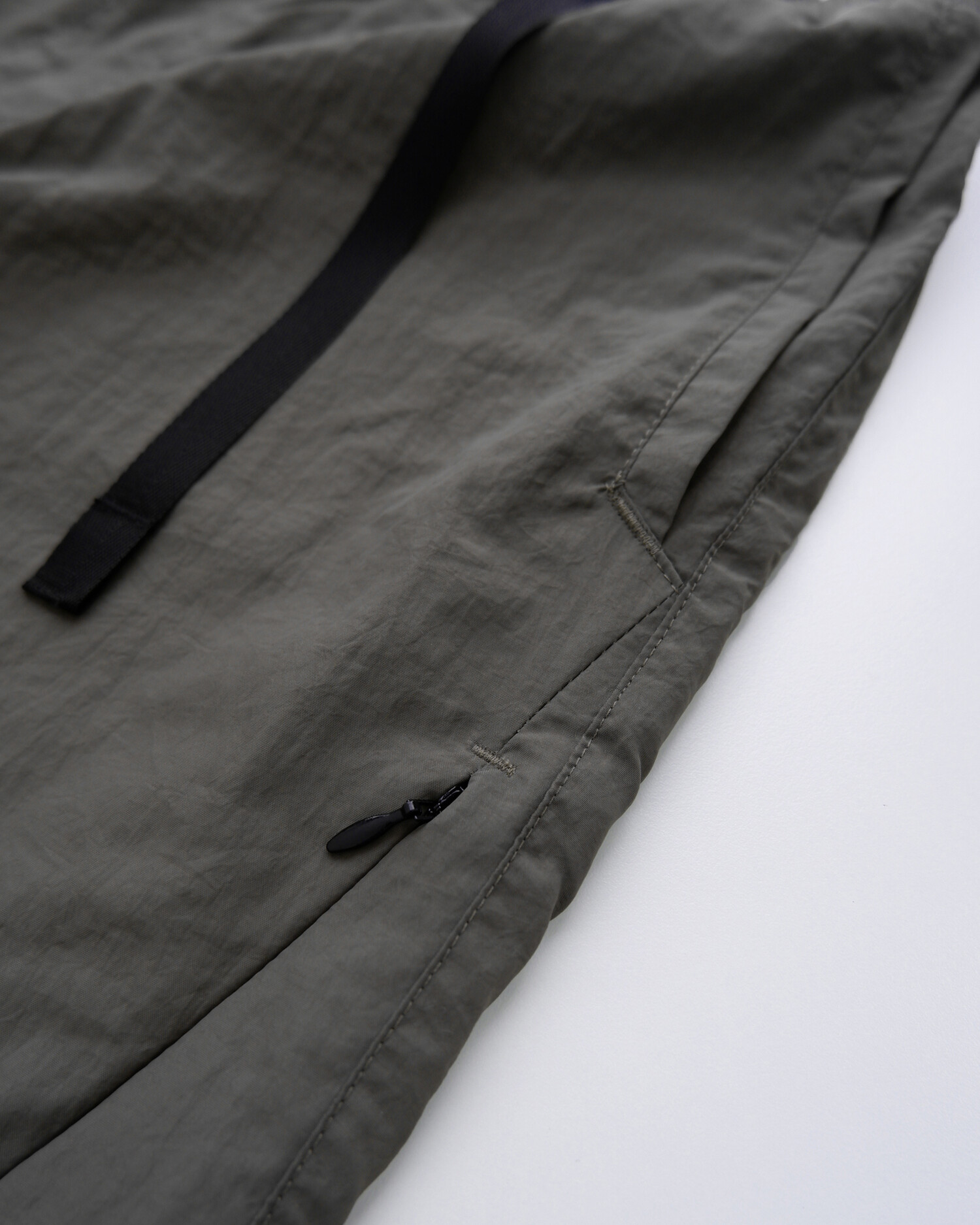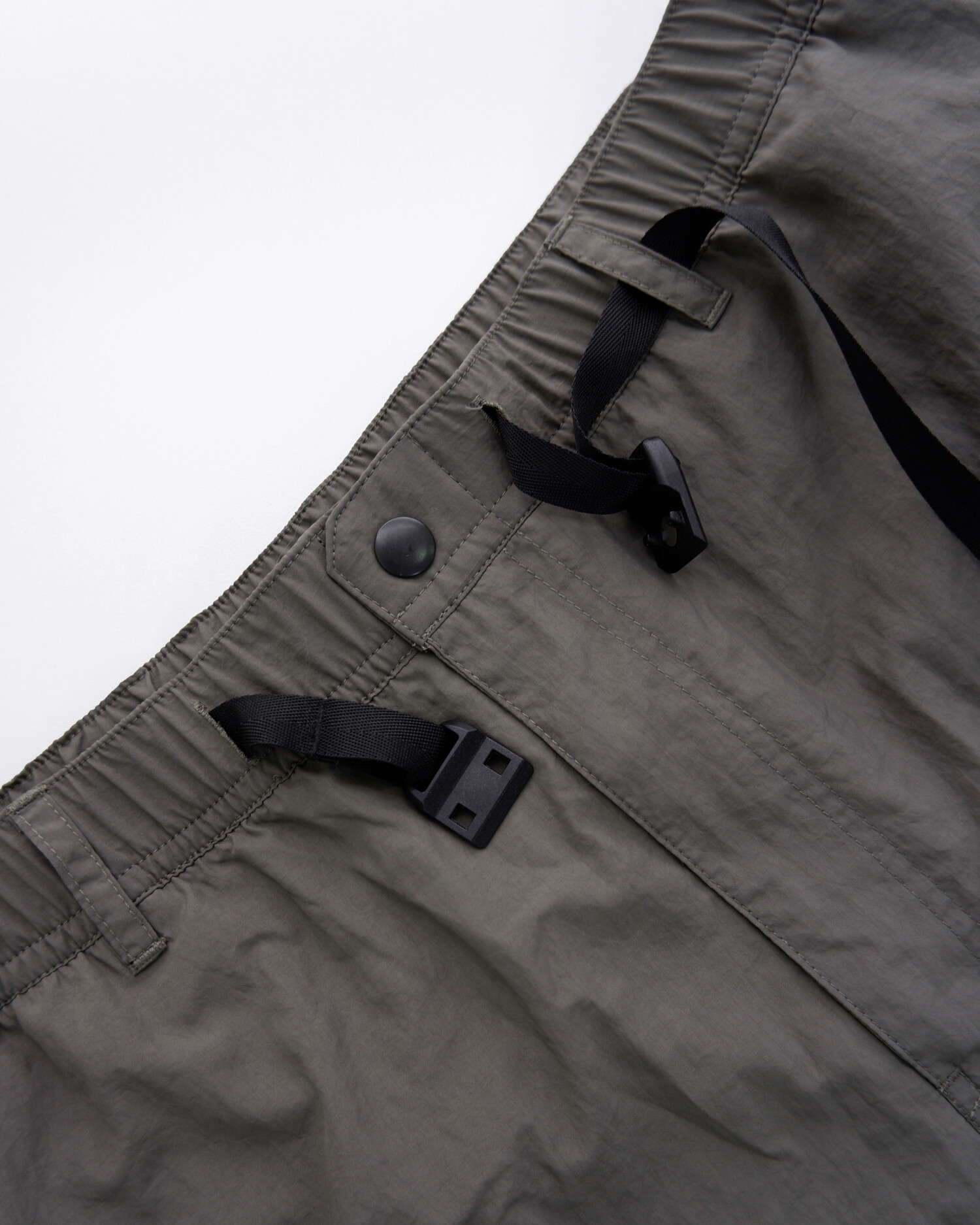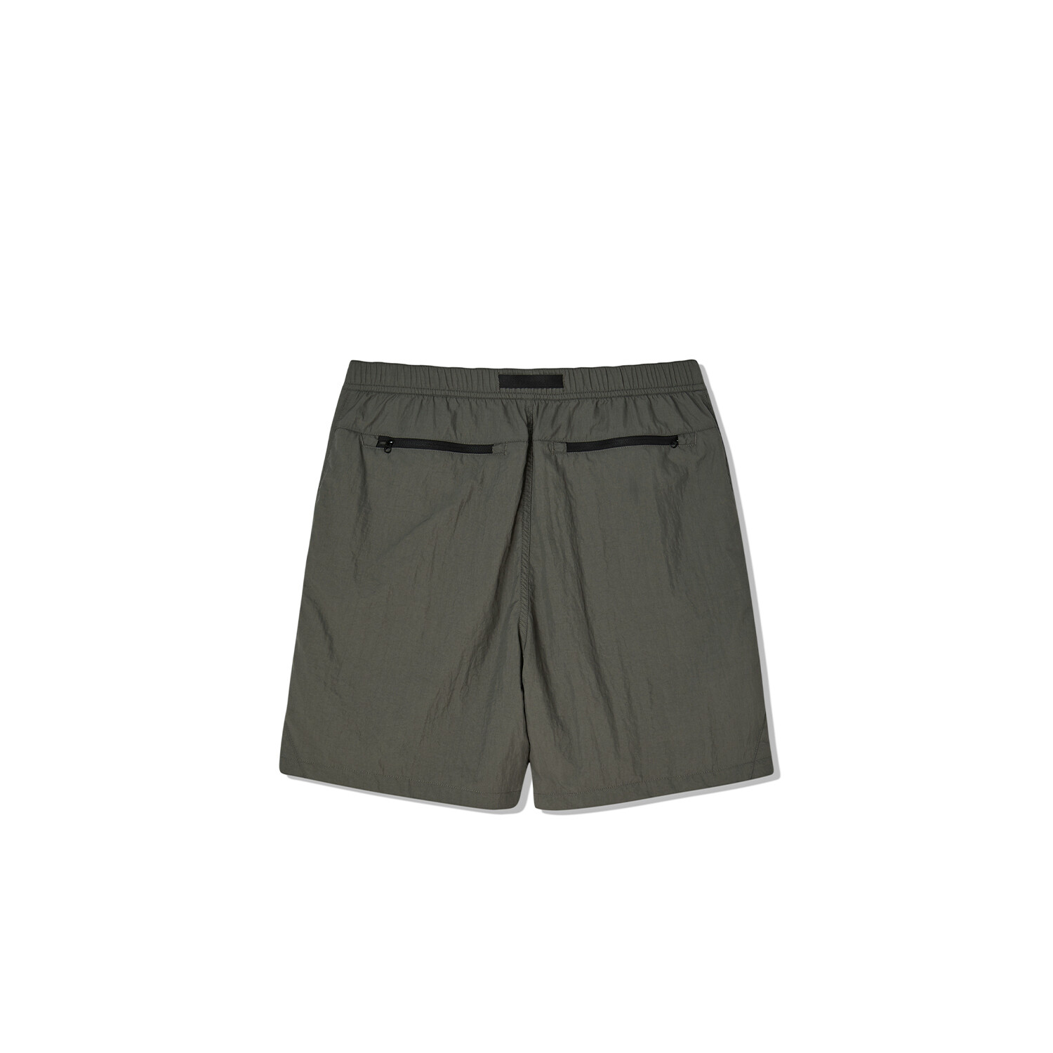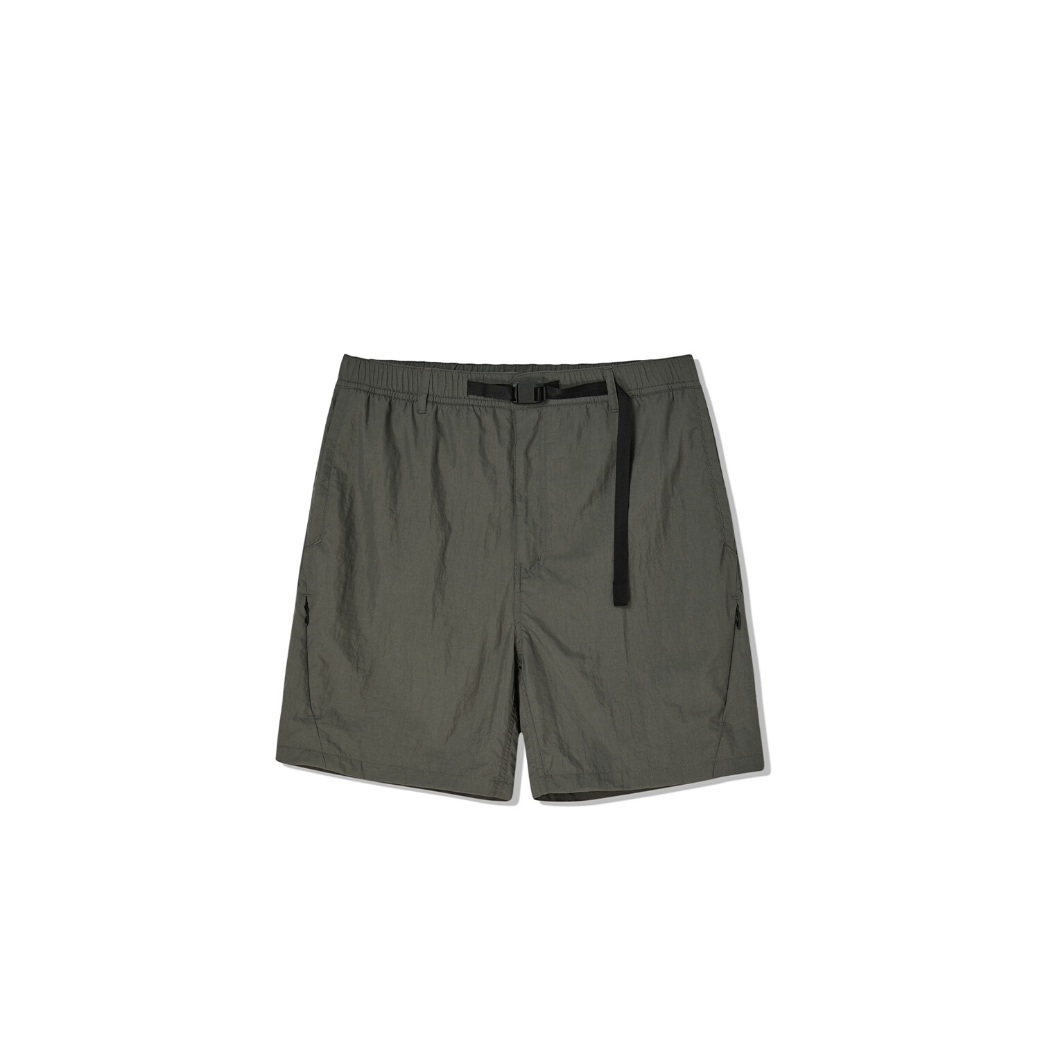 : 경쾌한 기장감에 시원한 감촉이 곧바로 피부에 느껴지는 짧은 반바지는 여름철 가장 필요한 아이템이 아닐까 합니다. ‘유틸리티 쇼츠’는 발수 가공된 얇고 가벼운 나일론 패브릭에 쿨 메쉬를 레이어링해서 2중 구조로 제작한 반바지입니다. 좋은 발수력과 쿨한 터치감으로 여름 뿐 아니라 늦봄부터 초가을까지 쭉 입기 좋은 제품인데요. 와샤 가공까지 진행된 원단이어서 가까이 보았을 때 불규칙적이고 미세한 주름과 바스락거리는 터치감이 매력적입니다. 유틸리티 쇼츠의 허리에는 E밴드와 V직 웨빙 그리고 마그네틱 버클을 적용하여 간편하고 빠르게 사이즈 조절이 가능하도록 하였고, 밴딩 구조 특성상 편안한 피팅감을 제공합니다. 바지의 포켓과 벤틸레이션 그리고 절개 구조들은 여러 직선들로 이루어져 있는데 정면과 옆면에서 봤을 때 그 독특한 구조와 매력이 잘 느껴집니다. 메쉬가 레이어드된 반바지의 특성상 벤틸레이션은 일부 역할은 수행할 수 있지만 정확히는 기능적 역할보다 디자인적 배치를 염두해둔 디테일이며 포켓의 입구 사선 절개와 통일성을 이루기 위함입니다. 따라서 벤틸레이션 지퍼는 기호에 맞게 자유롭게 연출해주시기를 바랍니다. 꼼꼼한 봉재와 더불어 보강이 필요한 부분들에는 바텍으로 단단히 고정하였습니다. 잘 만들어진 가볍고 시원한 나일론 쇼츠를 찾는 분들께 추천드립니다.