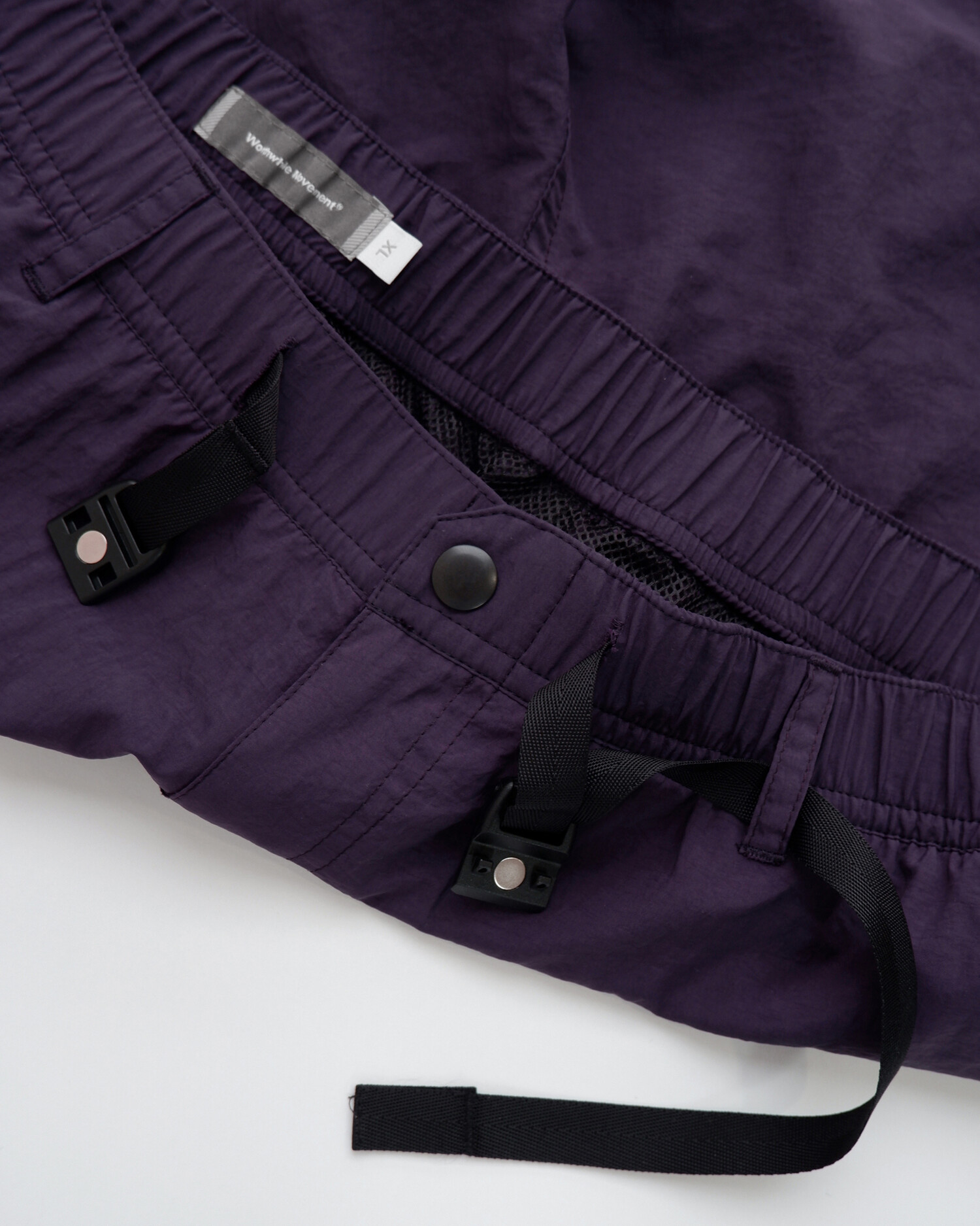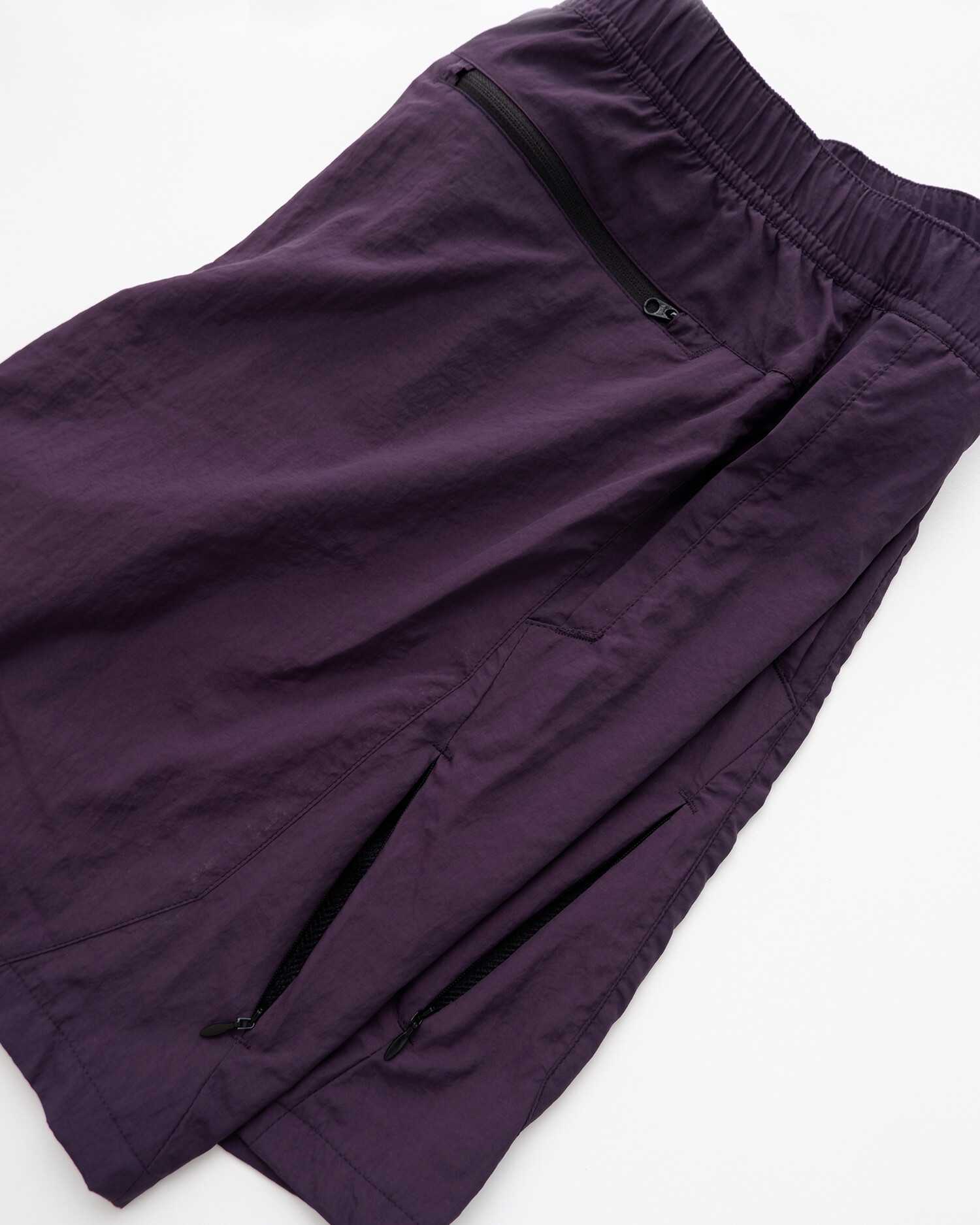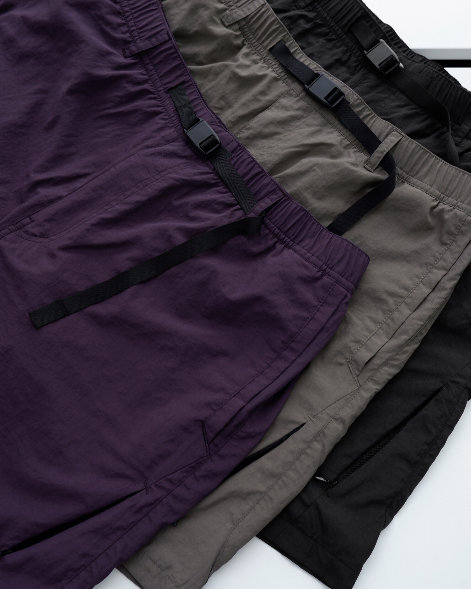 : 경쾌한 기장감에 시원한 감촉이 곧바로 피부에 느껴지는 짧은 반바지는 여름철 가장 필요한 아이템이 아닐까 합니다. ‘유틸리티 쇼츠’는 발수 가공된 얇고 가벼운 나일론 패브릭에 쿨 메쉬를 레이어링해서 2중 구조로 제작한 반바지입니다. 좋은 발수력과 쿨한 터치감으로 여름 뿐 아니라 늦봄부터 초가을까지 쭉 입기 좋은 제품인데요. 와샤 가공까지 진행된 원단이어서 가까이 보았을 때 불규칙적이고 미세한 주름과 바스락거리는 터치감이 매력적입니다. 유틸리티 쇼츠의 허리에는 E밴드와 V직 웨빙 그리고 마그네틱 버클을 적용하여 간편하고 빠르게 사이즈 조절이 가능하도록 하였고, 밴딩 구조 특성상 편안한 피팅감을 제공합니다. 바지의 포켓과 벤틸레이션 그리고 절개 구조들은 여러 직선들로 이루어져 있는데 정면과 옆면에서 봤을 때 그 독특한 구조와 매력이 잘 느껴집니다. 메쉬가 레이어드된 반바지의 특성상 벤틸레이션은 일부 역할은 수행할 수 있지만 정확히는 기능적 역할보다 디자인적 배치를 염두해둔 디테일이며 포켓의 입구 사선 절개와 통일성을 이루기 위함입니다. 따라서 벤틸레이션 지퍼는 기호에 맞게 자유롭게 연출해주시기를 바랍니다. 꼼꼼한 봉재와 더불어 보강이 필요한 부분들에는 바텍으로 단단히 고정하였습니다. 잘 만들어진 가볍고 시원한 나일론 쇼츠를 찾는 분들께 추천드립니다.
