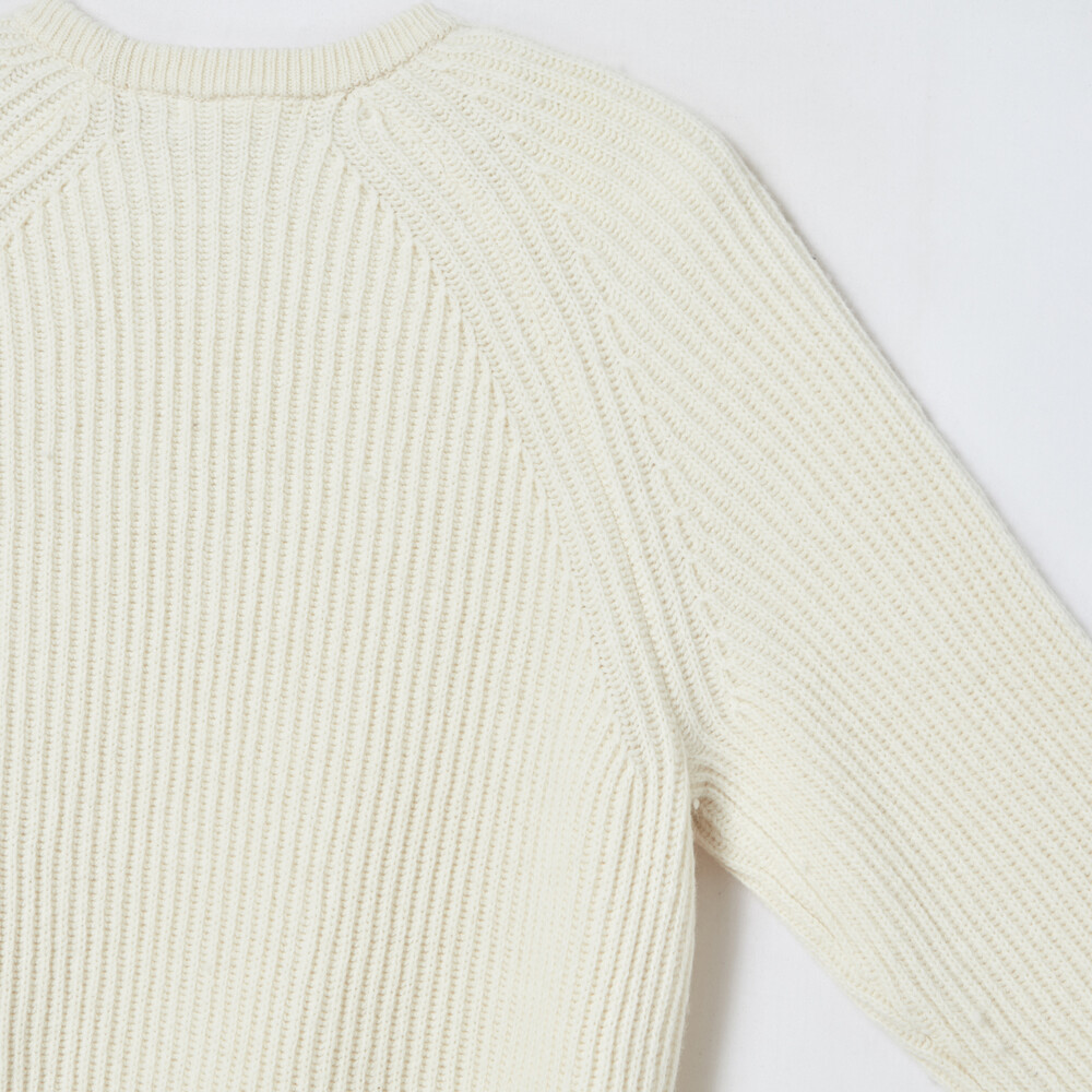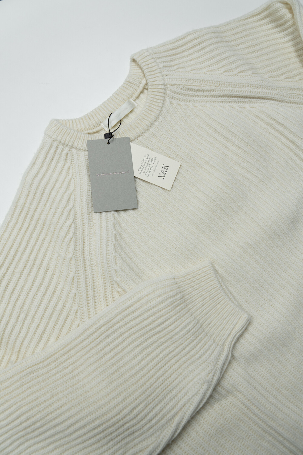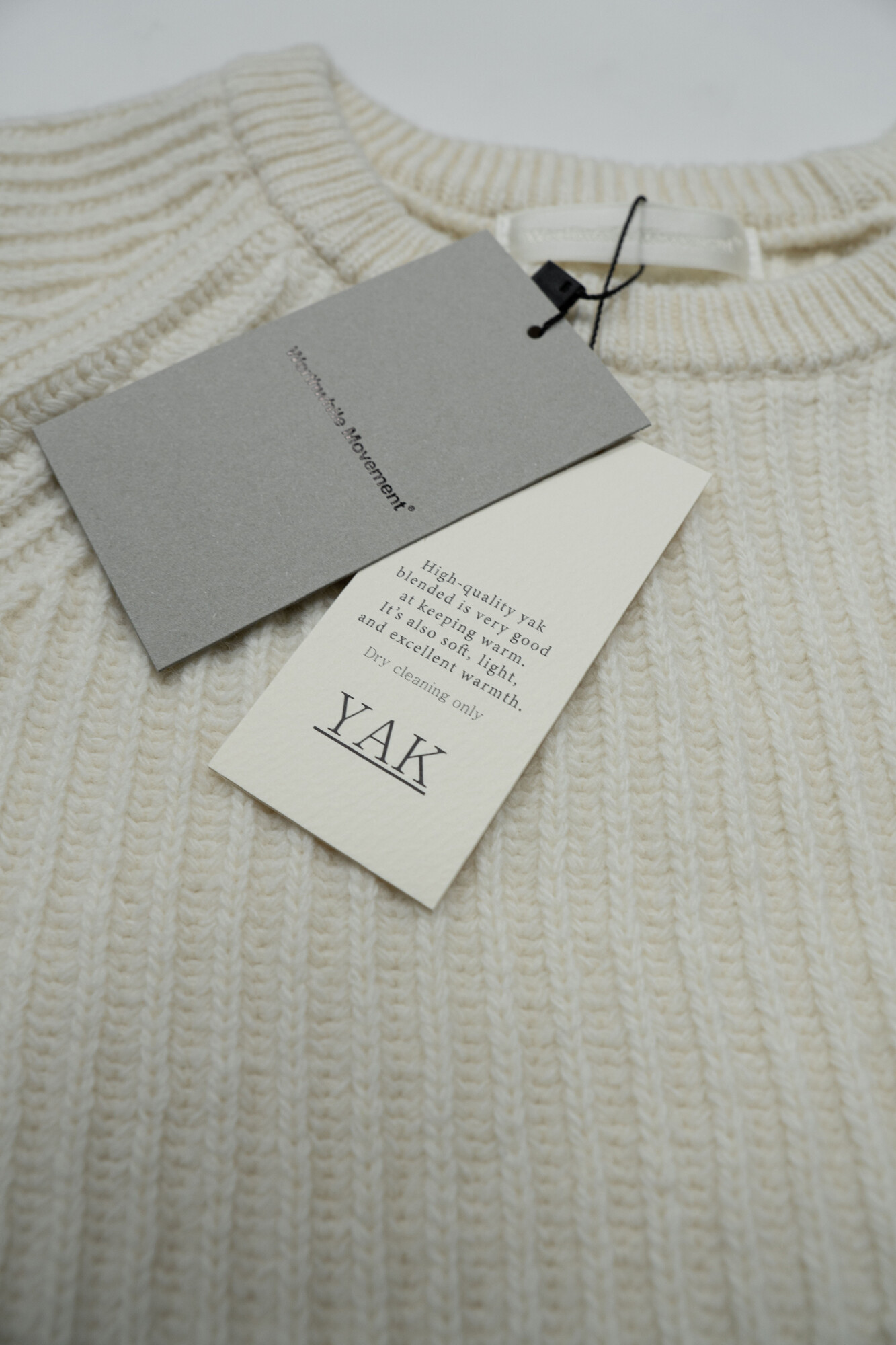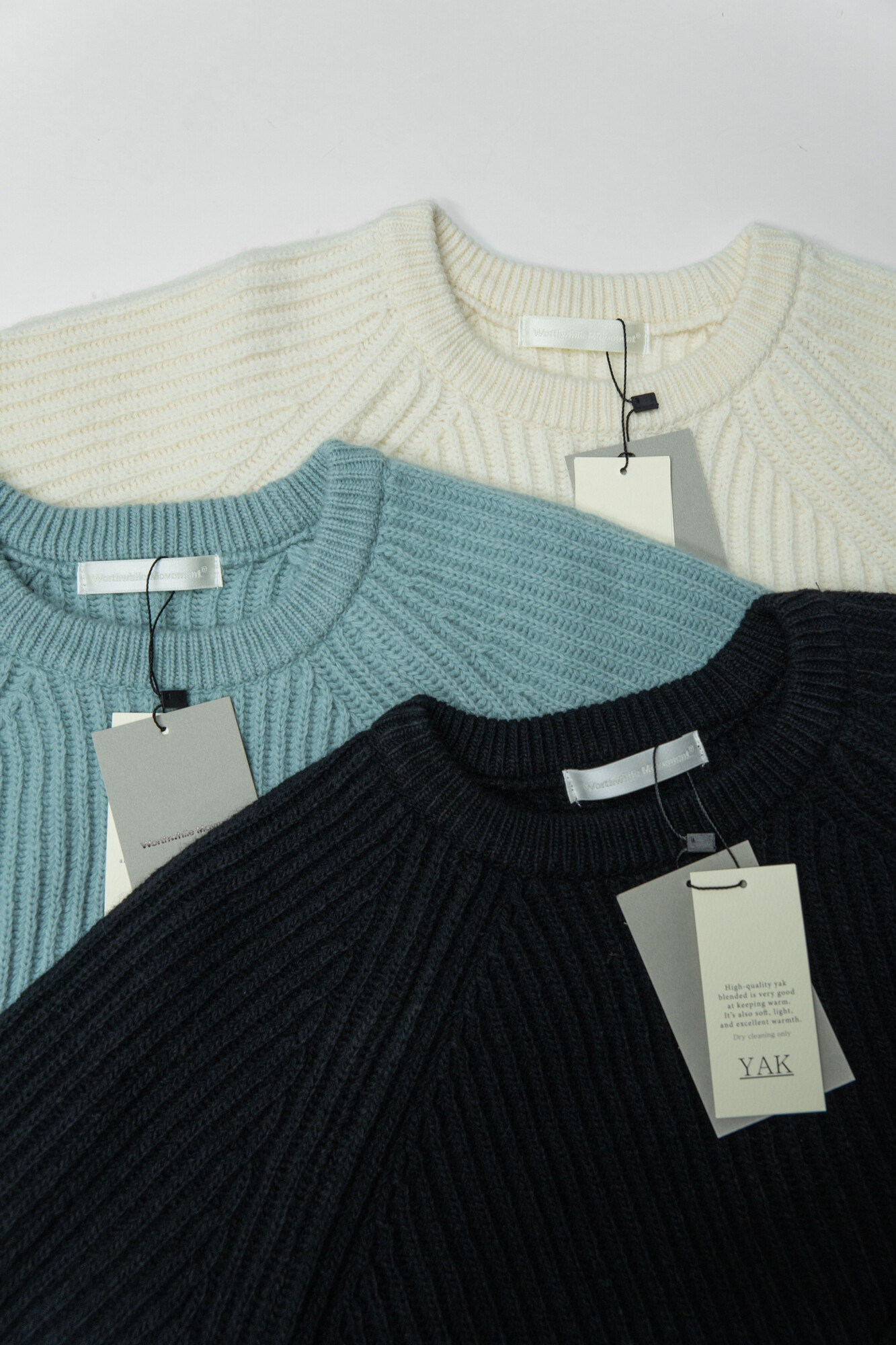 : 티베트 고원, 몽골, 네팔 등 고산지대 야크의 속털에서 채취한 야크 울과 메리노 울이 70% 구성된 리브드 스웨터입니다. 매년 디벨롭해서 출시하는 시그니처 제품이며, 올해는 조금 더 크롭한 기장감으로 연출하여 경쾌한 실루엣이 연출되니다. 볼륨감이 있는 스웨터이지만 가볍고 보온성이 우수한 것이 장점입니다. 특히 혹독한 기후에서 자라 압도적인 보온성과 자연스러운 탄성을 가진 야크 울은 일반적인 울보다 촉감이 부드럽고 캐시미어와 유사한 질감을 갖고 있어 피부가 민감하신 분들도 충분히 착용하실 수 있습니다. 7게이지 2합으로 적당히 두툼한 두께의 스웨터이기 때문에 한겨울까지 충분히 활용하실 수 있습니다.