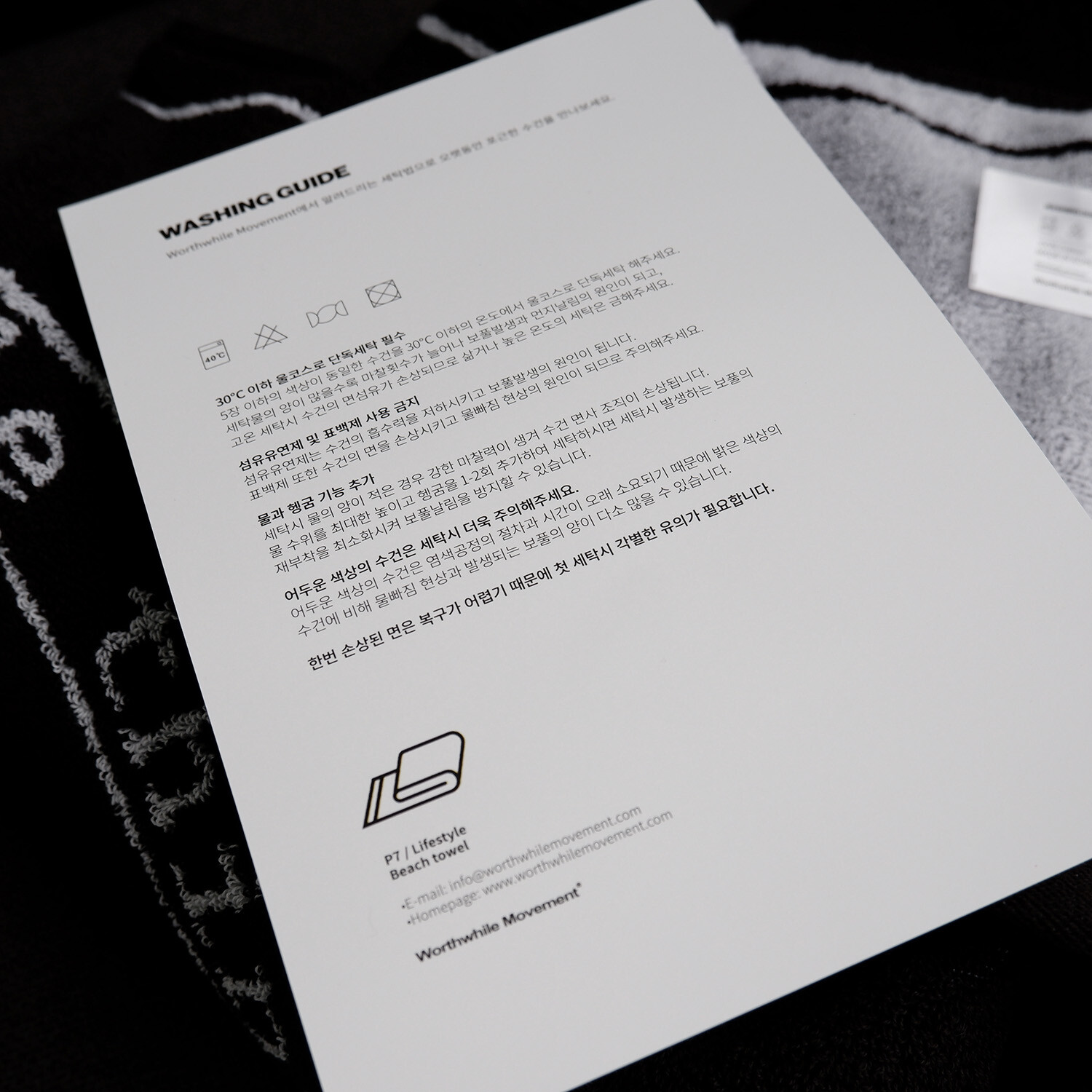 로고가 들어간 2개의 버전으로 제작했으며 부드러운 감촉의 코튼 100% 퀄리티입니다. 넓고 큰 사이즈의 제품이지만 600g으로 무게는 가볍습니다. 오랫동안 사용하실 수 있도록 Washing guide를 동봉해드립니다.