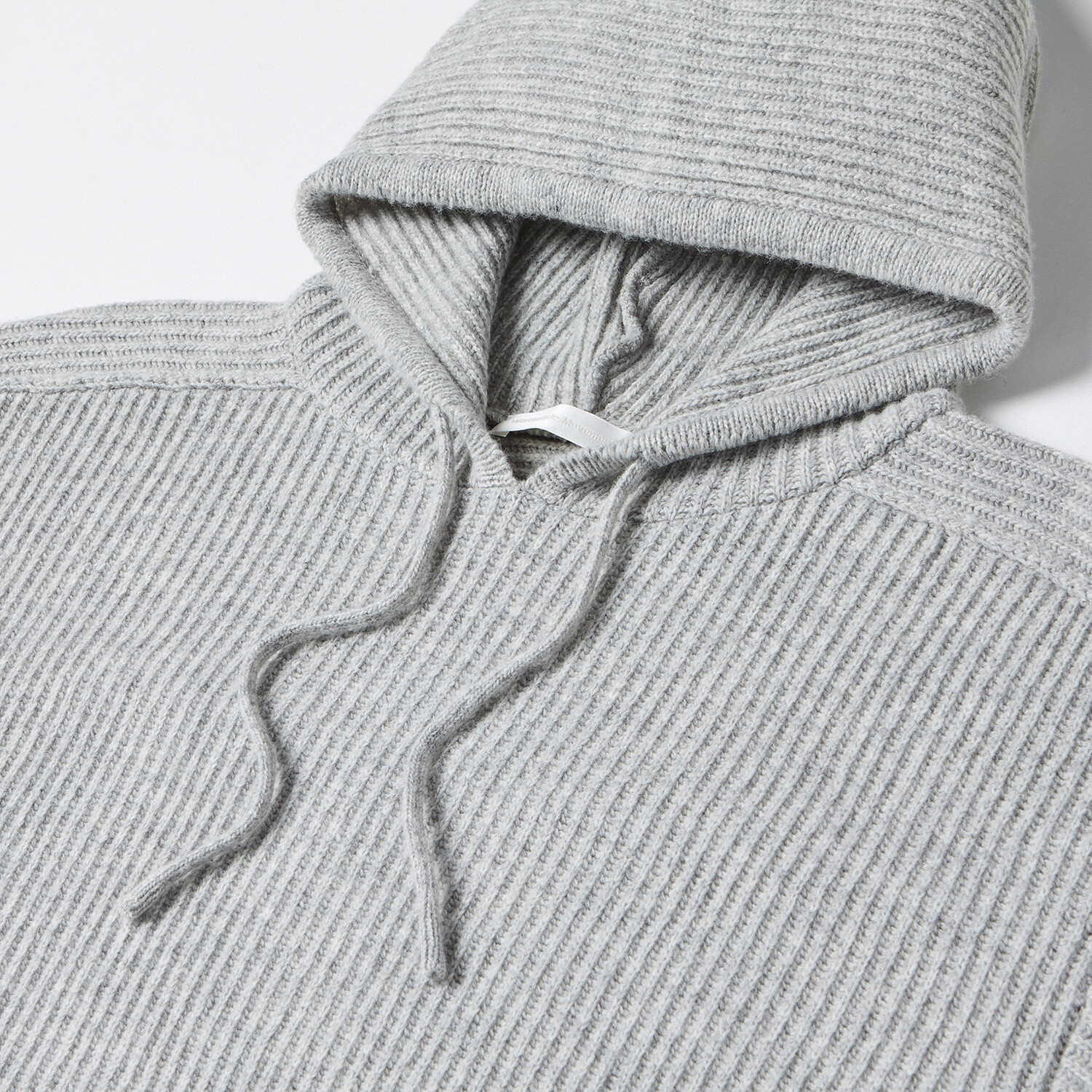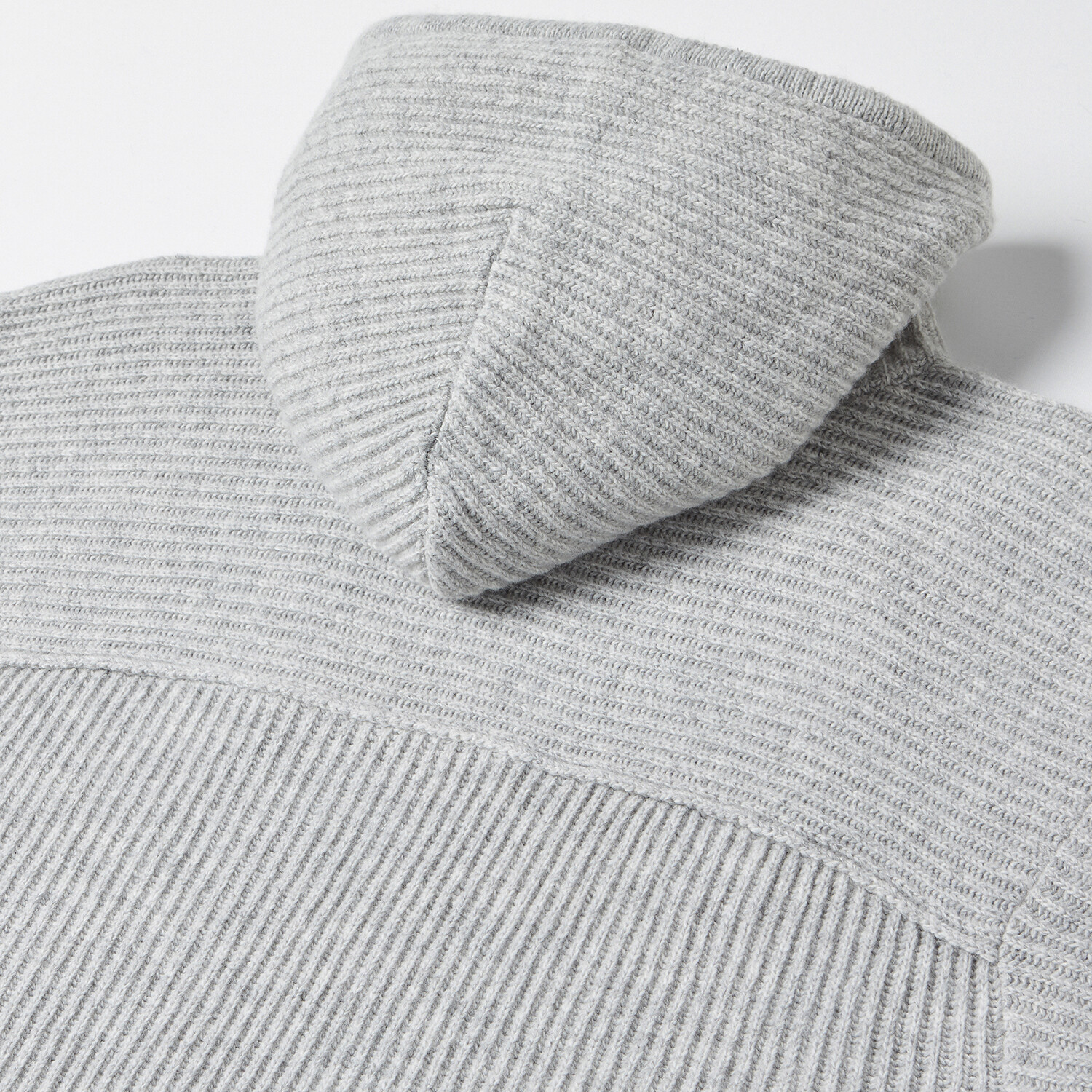 리브드 요크 니트 후디는 적절한 두께감을 갖고 있어서 얇은 코트 안에 입거나 단품으로 활용하시기에도 좋은 제품입니다. 봄까지 착용해주신 뒤 잘 케어 후 보관하셨다가 다가올 가을, 겨울까지도 즐겨주시길 바랍니다. Full Cardigan Stitch 방식으로 편직된 제품으로 립 조직이 돋보이며 캐시미어 혼용 원사로 맨살에 닿아도 부담스럽지 않은 굉장히 부드러운 터치감을 갖고 있습니다. 인체 특성을 고려하여 입체적으로 성형 편직 하였으며 사시봉제로 마감했습니다.