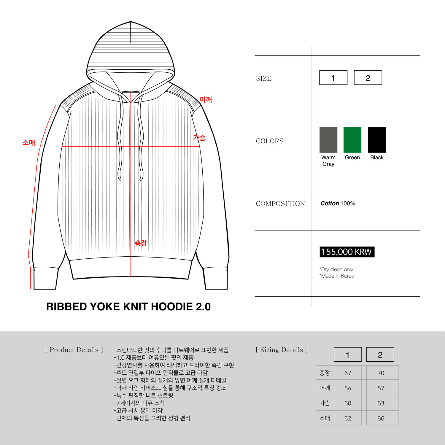 ▶ '리브드 요크 니트 후디 2.0' 은 지난 달 발매된 1.0과 다르게 코튼 100% 강연사를 사용하여 터치감은 부드럽지만 더 드라이하고 쾌적한 착용감을 느끼실 수 있는 제품입니다. 후드와 몸판이 연결되는 시접 부분을 별도로 편직한 파이프로 감싸고 사시봉제로 마감하여 네크 라인을 자연스럽고 깔끔한 형태로 제작했습니다. 이 제품 역시 주목할 부분은 셔츠에서 많이 쓰이는 요크를 후디에 적용한 것인데요. 요크의 기능적인 역할 보다는 디자인적인 요소로써 자리를 잡고 있습니다. 이 요크 라인은 어깨선보다 더 앞쪽으로 넘어와 있으며, 뒤 절개선은 시접을 밖으로 드러내(리버스드 심 디테일) 구조적인 특징을 더욱 명확히 하고 있습니다. 전체적인 사이즈는 더 크게 변경되었고, 후드끈의 형태도 납작한 형태로 변경했습니다. Full Cardigan Stitch 방식으로 편직된 제품으로 립 조직이 돋보이며 인체 특성을 고려하여 입체적으로 성형 편직 하였으며 사시봉제로 마감했습니다.