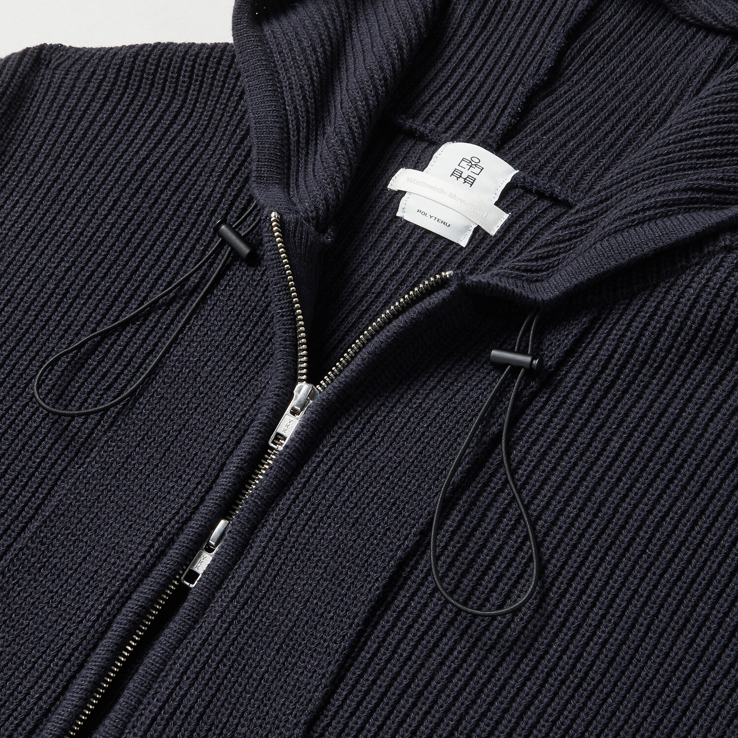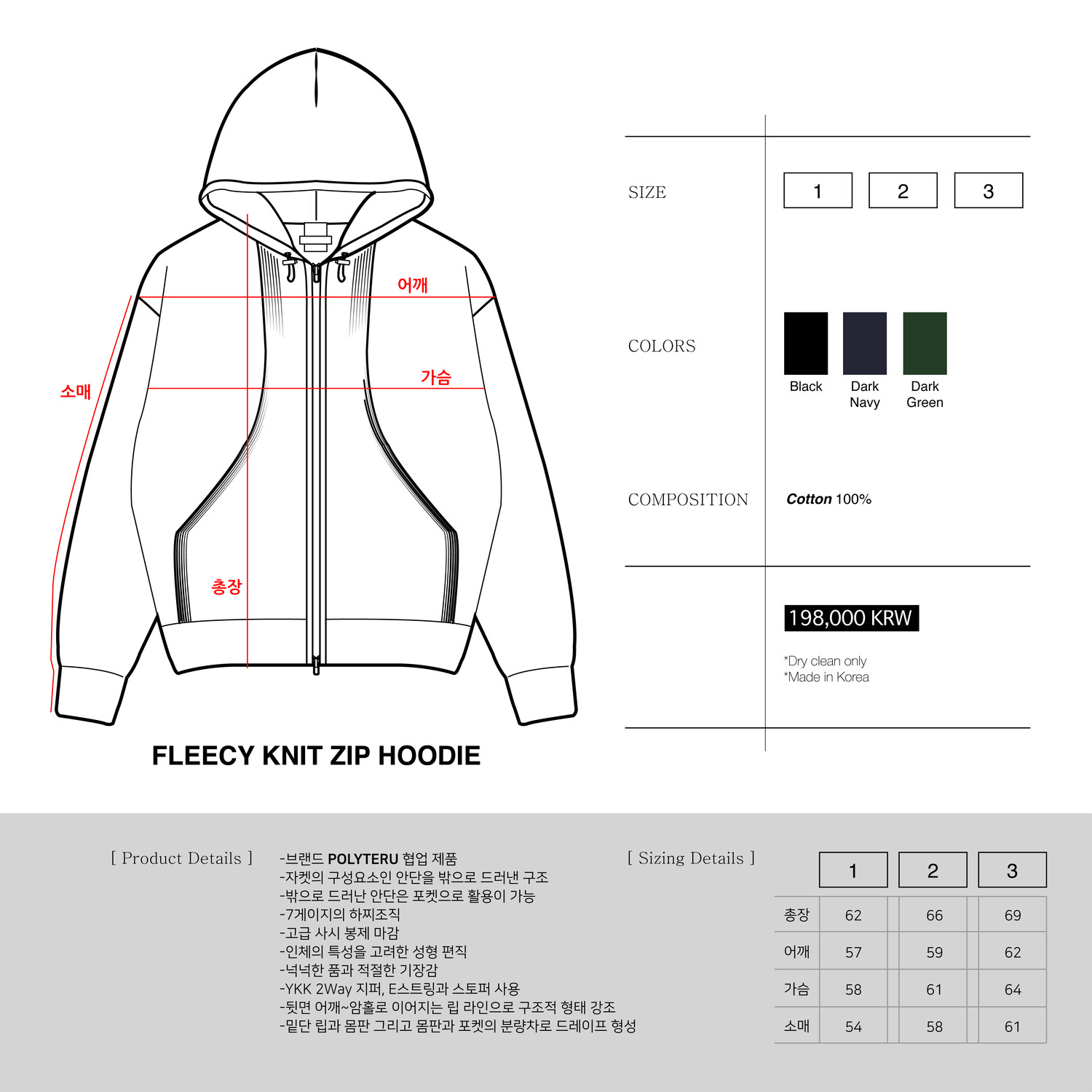 ▶ '플리시 니트 집 후디'는 브랜드 폴리테루(Polyteru)와의 협업 제품입니다. 폴리테루는 동북아시아 문화의 다양한 소스로부터 영감을 받아 정교한 패턴과 좋은 소재 및 봉제를 기반으로 한 현대적 일상복을 만드는 브랜드입니다. 폴리테루의 '플리시 집 후디' 원형을 베이스로 월스와일 무브먼트의 해석을 더해 니트로 변형하여 표현했습니다. 울과 면, 나일론 등의 혼방 원사를 사용하여 관리가 용이하고 터치감은 부드럽습니다. 자켓의 구성 요소인 안단을 외부로 드러낸 디테일은 해당 제품의 가장 핵심적인 디자인적 포인트로 포켓으로써 기능적 역할도 수행합니다. 또한 여유있는 사이즈의 후드는 E-스트링과 스토퍼를 통해 간편하게 핏 조절이 가능하고 널널한 품과 적당한 기장감의 제품이기 때문에 이너와 레어드하여 연출하기 좋습니다. 간절기에는 아침, 저녁으로 간편한 이너와 함께 착용하시기를 권장드리는데요. 물론 동절기에는 이너와 아우터로 모두 활용 가능합니다. 특히 Half Cardigan Stitch 방식으로 편직된 제품으로 신축성이 좋고 편안한 피팅감이 장점이며 몸판과 포켓의 분량차, 널널한 소매 폭으로 인해 유려한 드레이프가 형성됩니다. YKK 2웨이 지퍼를 사용하였고 인체 특성을 고려하여 입체적으로 성형 편직 및 사시봉제로 마감했습니다.