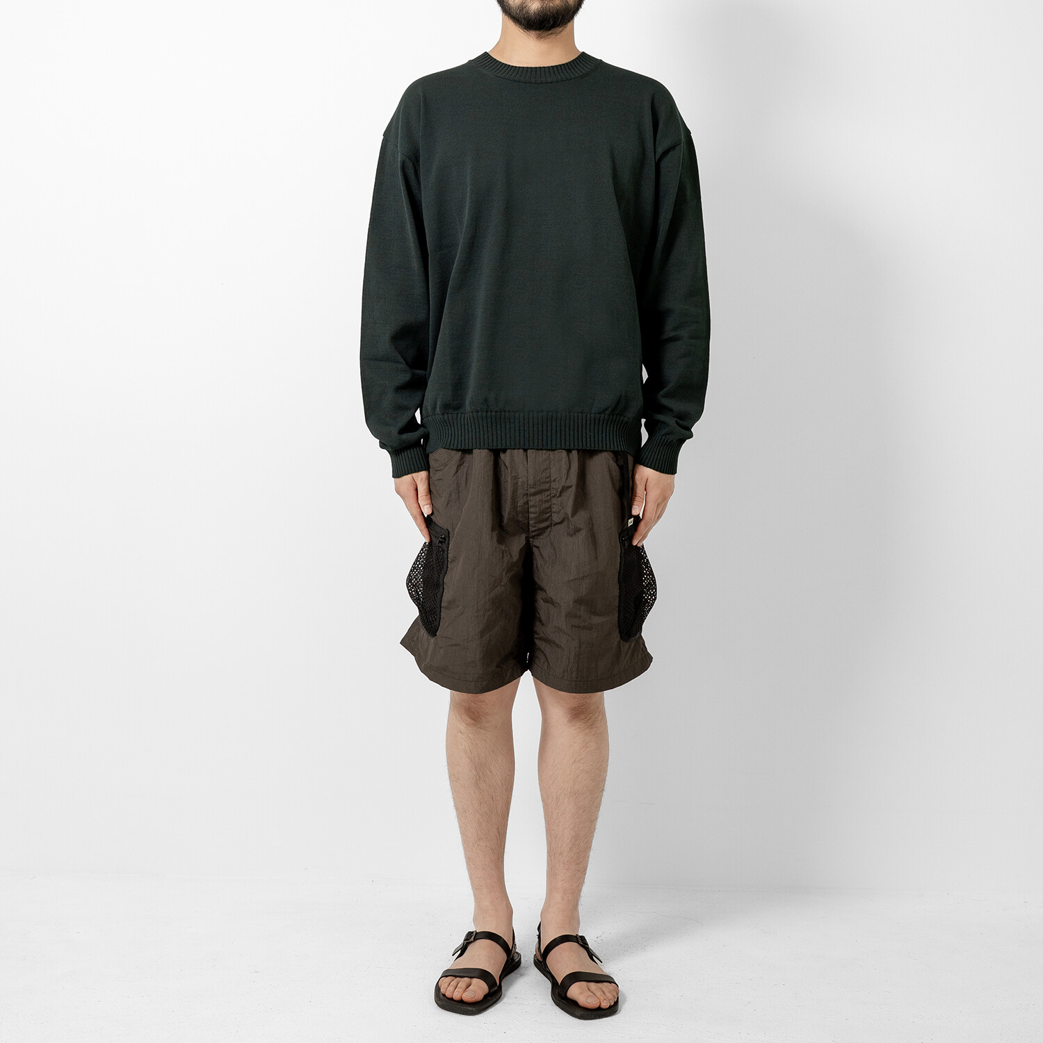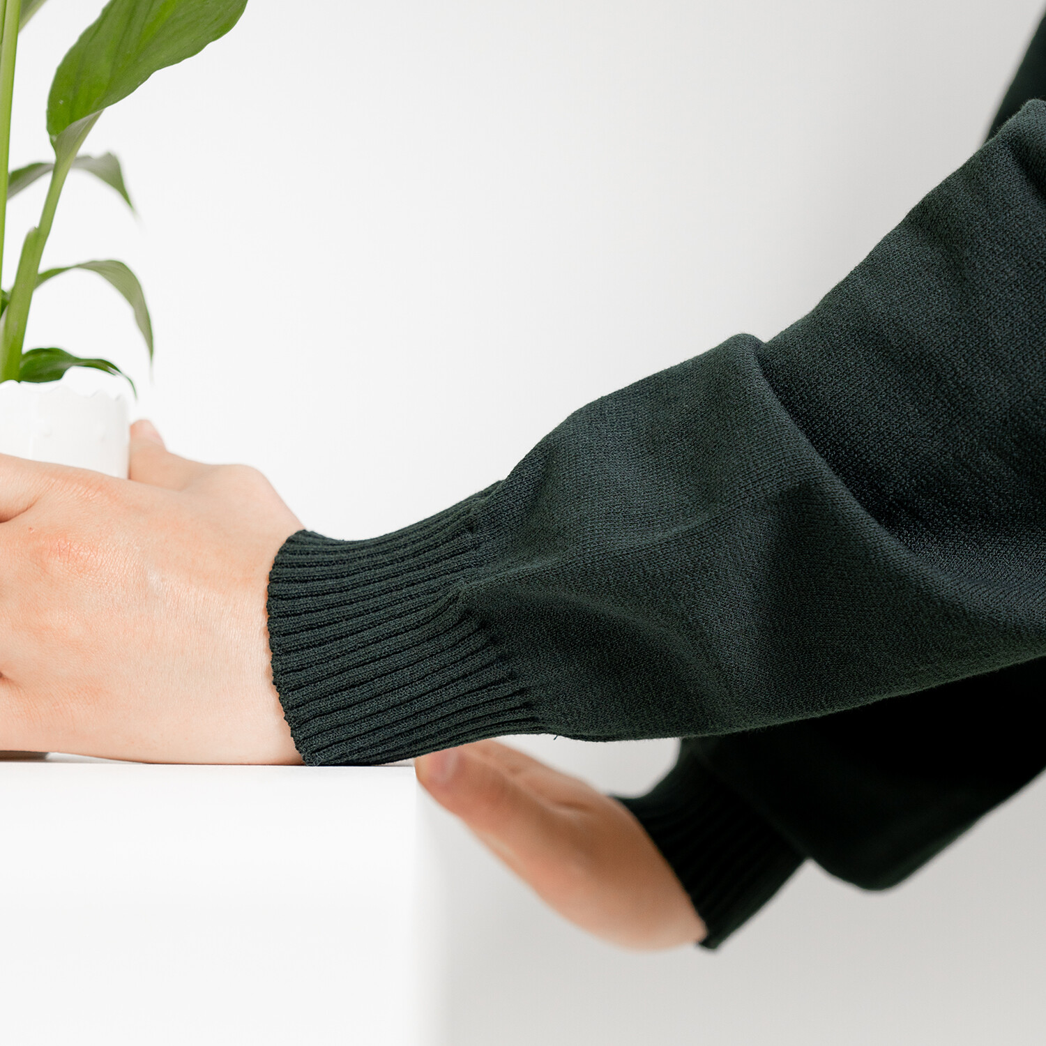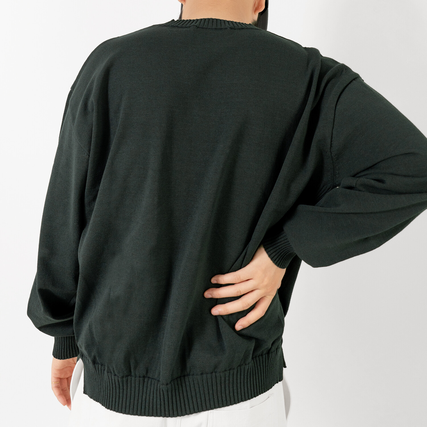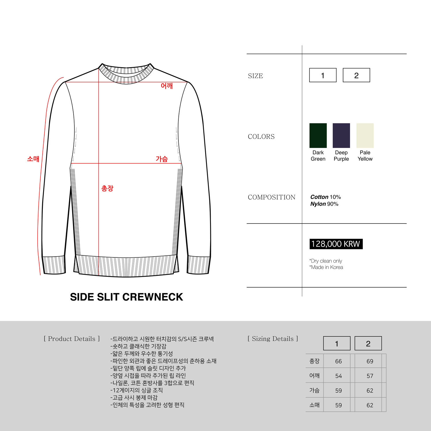 ▶ '사이드 슬릿 크루넥'은 봄,여름 시즌을 위해 제작한 얇고 경쾌한 실루엣의 롱 슬리브 니트입니다. 파인한 외관과 드레이프성이 좋은 고급 춘하용 소재를 사용하여 습해지는 7월 중순 이후의 한여름을 제외한다면 모든 시즌에 활용하기 좋습니다. 정갈한 핏으로 기본을 지키고 가볍게 입을 수 있는 성숙한 디자인의 니트를 생각하고 만들었습니다. 나일론, 코튼 혼방사를 사용하여 12게이지 3합으로 편직하였는데 드라이하고 시원한 터치감이 우수합니다. 맨살에 착용했을 때 비침은 없지만 통기성이 좋아서 쾌적하고 시원하게 입을 수 있습니다. 넥라인과 소매, 밑단 립 그리고 옆 시접 라인은 3x3 rib으로 편직하여 디자인적 포인트가 되며 양측 옆 라인 하단에는 슬릿이 들어가 있습니다. 립 조직 특성과 슬릿의 배치로 인해 신축성이 적기 때문에 기장을 의도적으로 숏하게 만들었으며 이 때문에 밑단 립을 접어 입기 보다는 있는 그대로 내려 입었을 때 알맞게 떨어지는 기장감을 느낄 수 있습니다. 인체 특성을 고려한 입체적인 성형 편직 및 니트 전문 공장에서 고급 사시봉제로 마감했습니다.
