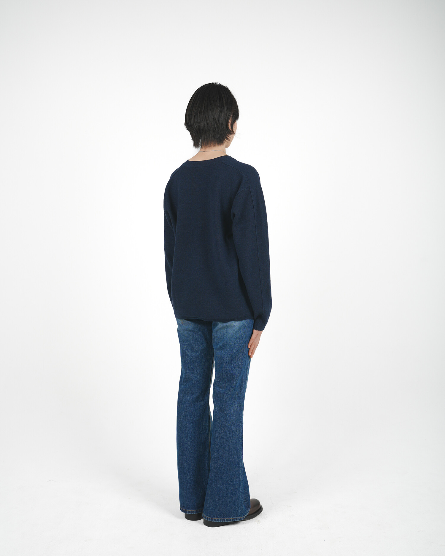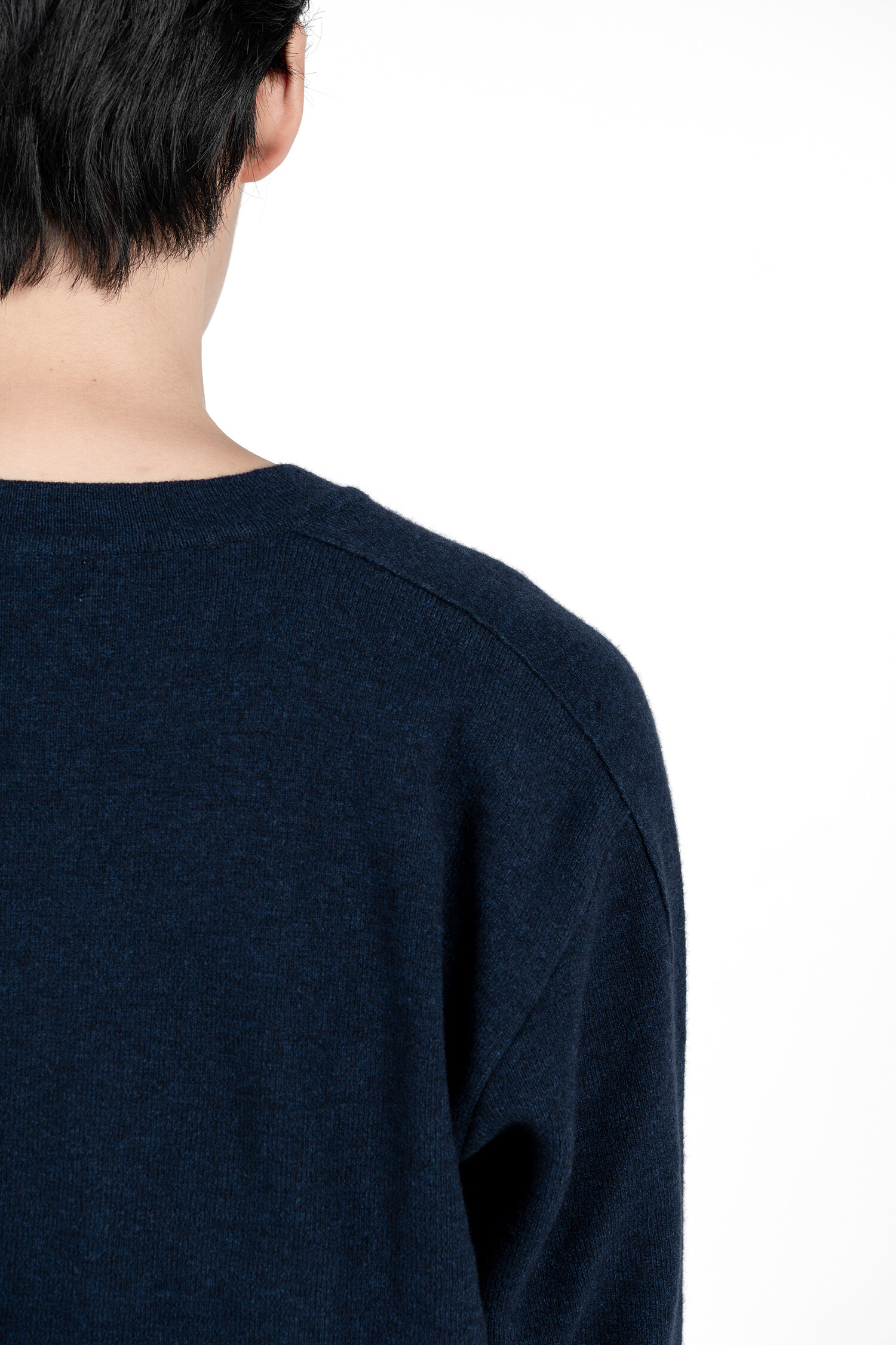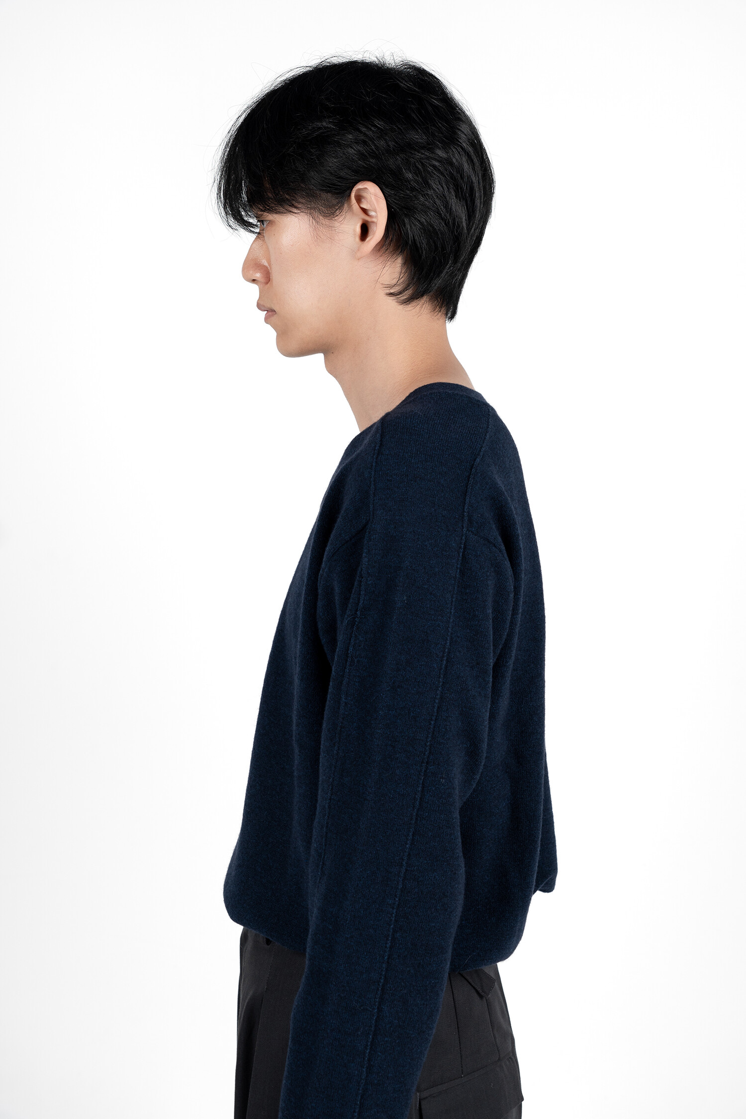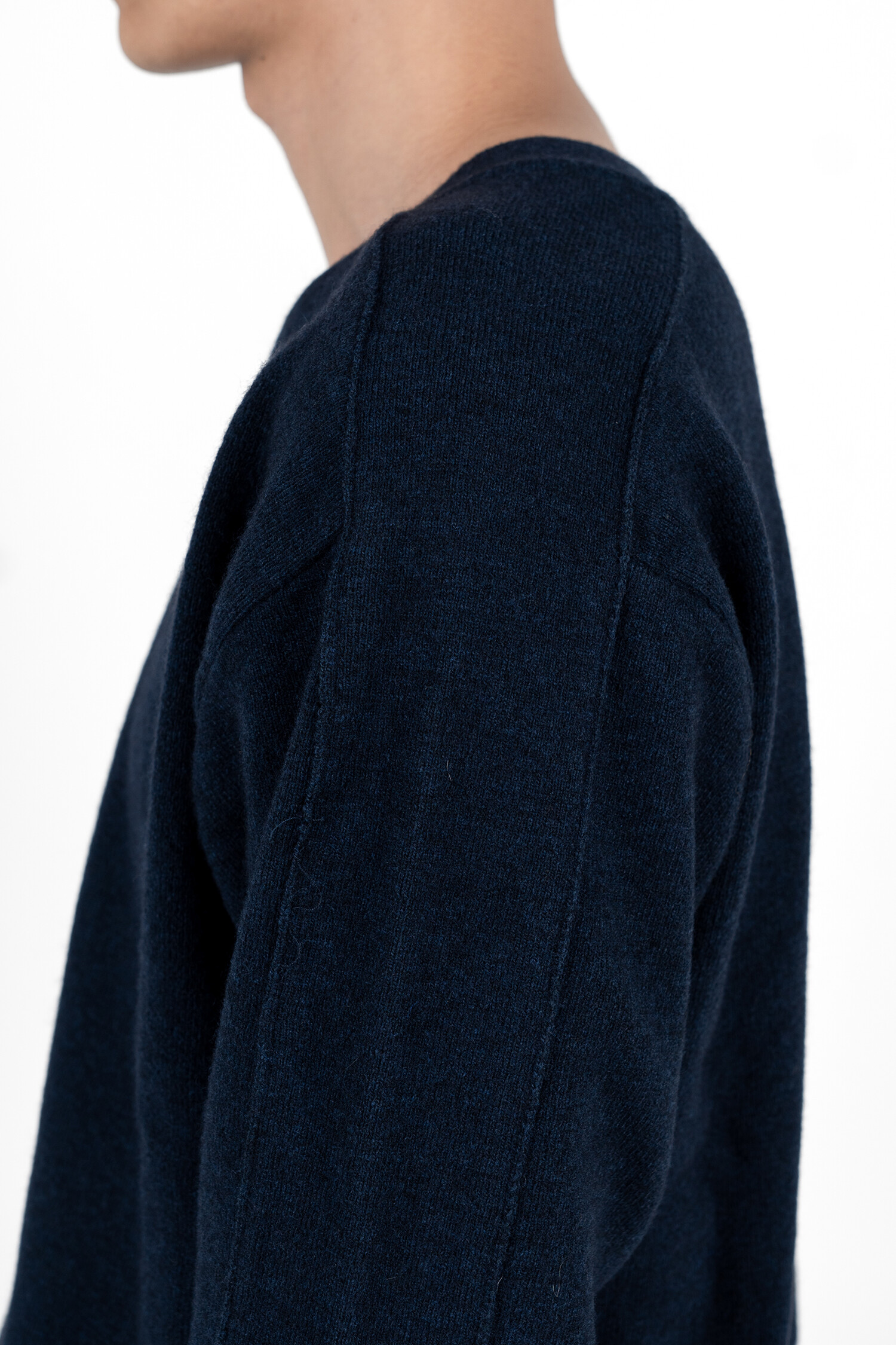 ▶ 캐시미어와 슈퍼 파인 메리노울 그리고 나일론의 혼용이 적절한 밸런스를 이루고 있는 원사를 사용했습니다. 맨살에 입어도 부드럽지만 관리도 용이한 편입니다. 무엇보다 밀라노 조직으로 짜여진 이 니트는 두께감이 있고 밀도가 높아서 착용하면 부드러운 스웻을 입은 느낌을 줍니다. 소매와 밑단에 들어가는 스판사를 사용하는 일반적인 립은 의도적으로 제거 했고 이 때문에 팬츠안에 넣어 입어도 세련되게 연출할 수 있습니다. 무엇보다 어깨라인과 소매를 타고 이어지는 패널은 이 니트의 가장 핵심적인 디테일입니다. 어깨와 소매를 잇는 라인에 절개를 넣어 시접을 밖으로 드러냈고, 구조적으로 세트인 슬리브와 래글런 슬리브가 결합된 재밌는 형태를 보여줍니다.