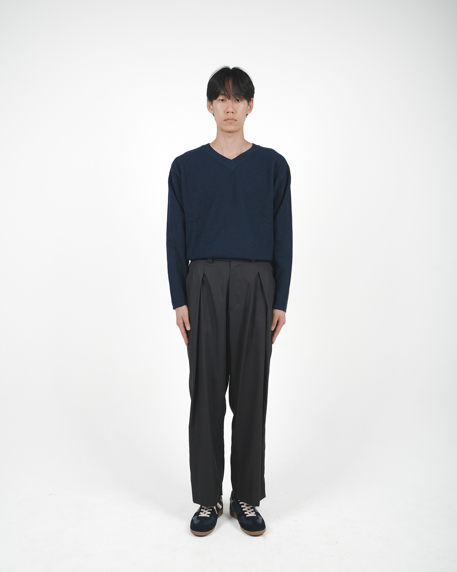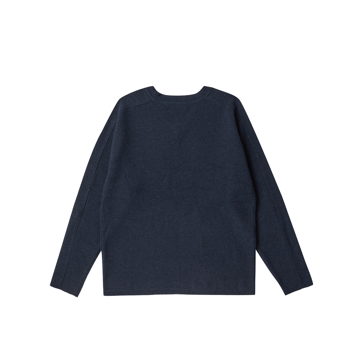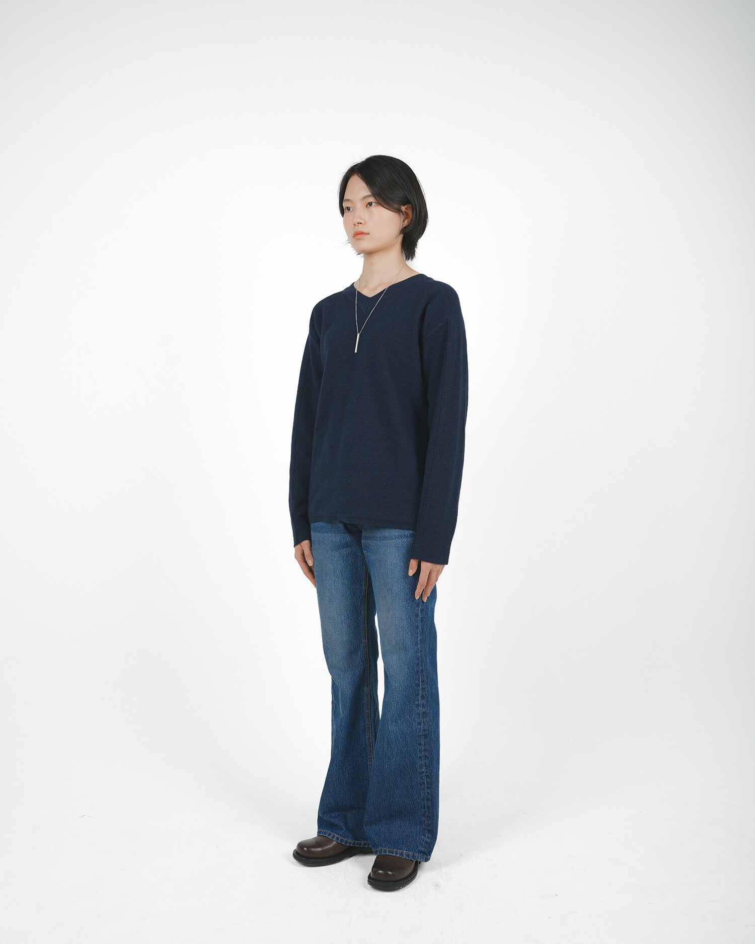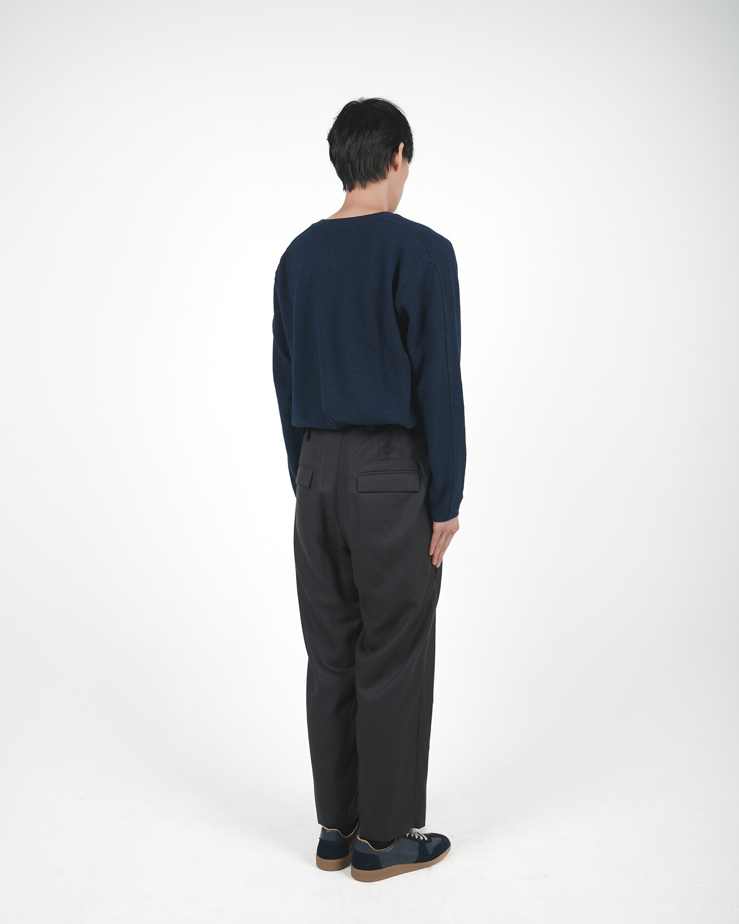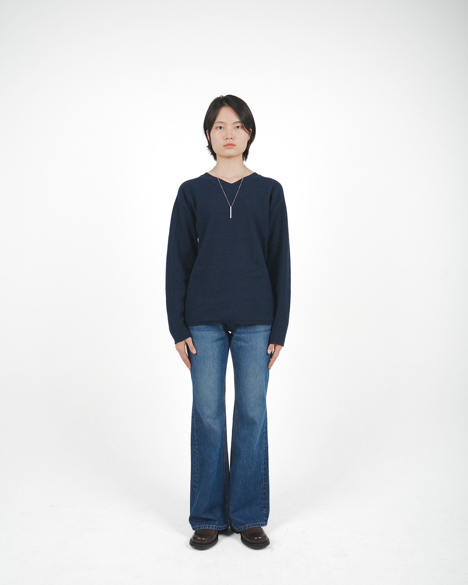 ▶ 캐시미어와 슈퍼 파인 메리노울 그리고 나일론의 혼용이 적절한 밸런스를 이루고 있는 원사를 사용했습니다. 맨살에 입어도 부드럽지만 관리도 용이한 편입니다. 무엇보다 밀라노 조직으로 짜여진 이 니트는 두께감이 있고 밀도가 높아서 착용하면 부드러운 스웻을 입은 느낌을 줍니다. 소매와 밑단에 들어가는 스판사를 사용하는 일반적인 립은 의도적으로 제거 했고 이 때문에 팬츠안에 넣어 입어도 세련되게 연출할 수 있습니다. 무엇보다 어깨라인과 소매를 타고 이어지는 패널은 이 니트의 가장 핵심적인 디테일입니다. 어깨와 소매를 잇는 라인에 절개를 넣어 시접을 밖으로 드러냈고, 구조적으로 세트인 슬리브와 래글런 슬리브가 결합된 재밌는 형태를 보여줍니다.