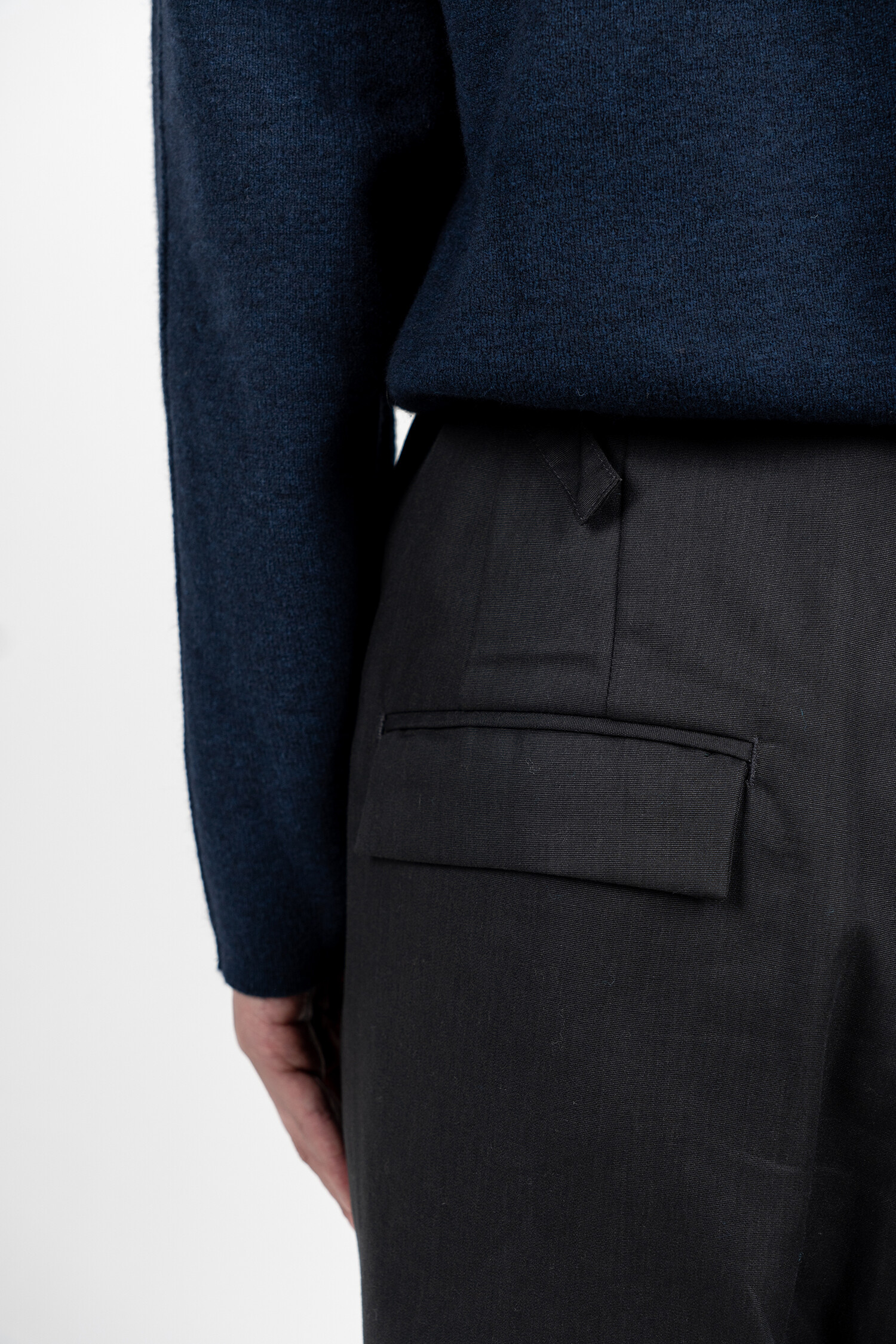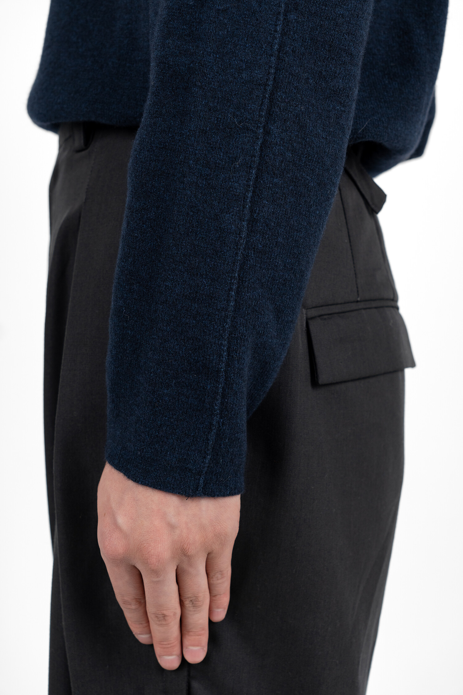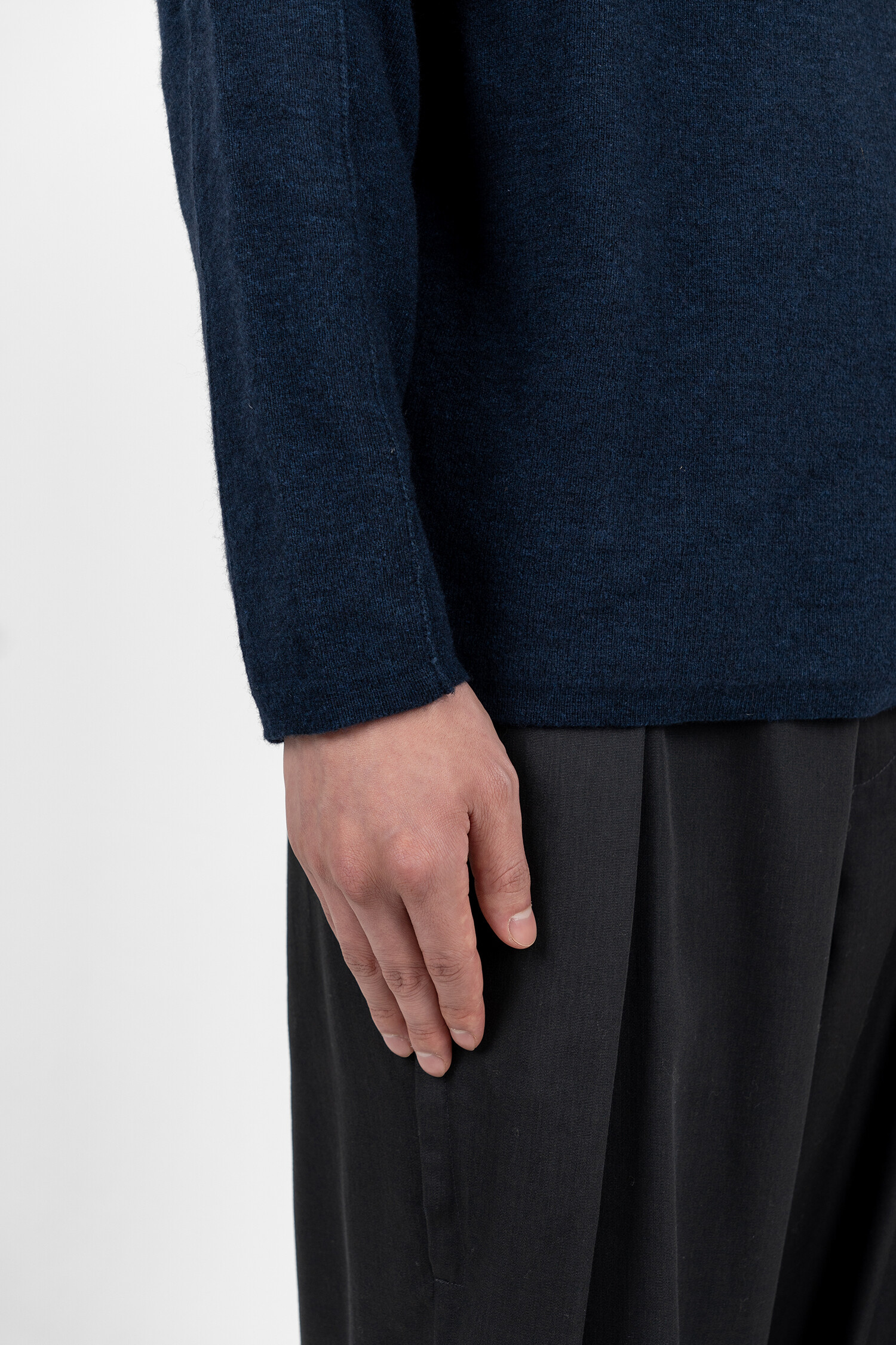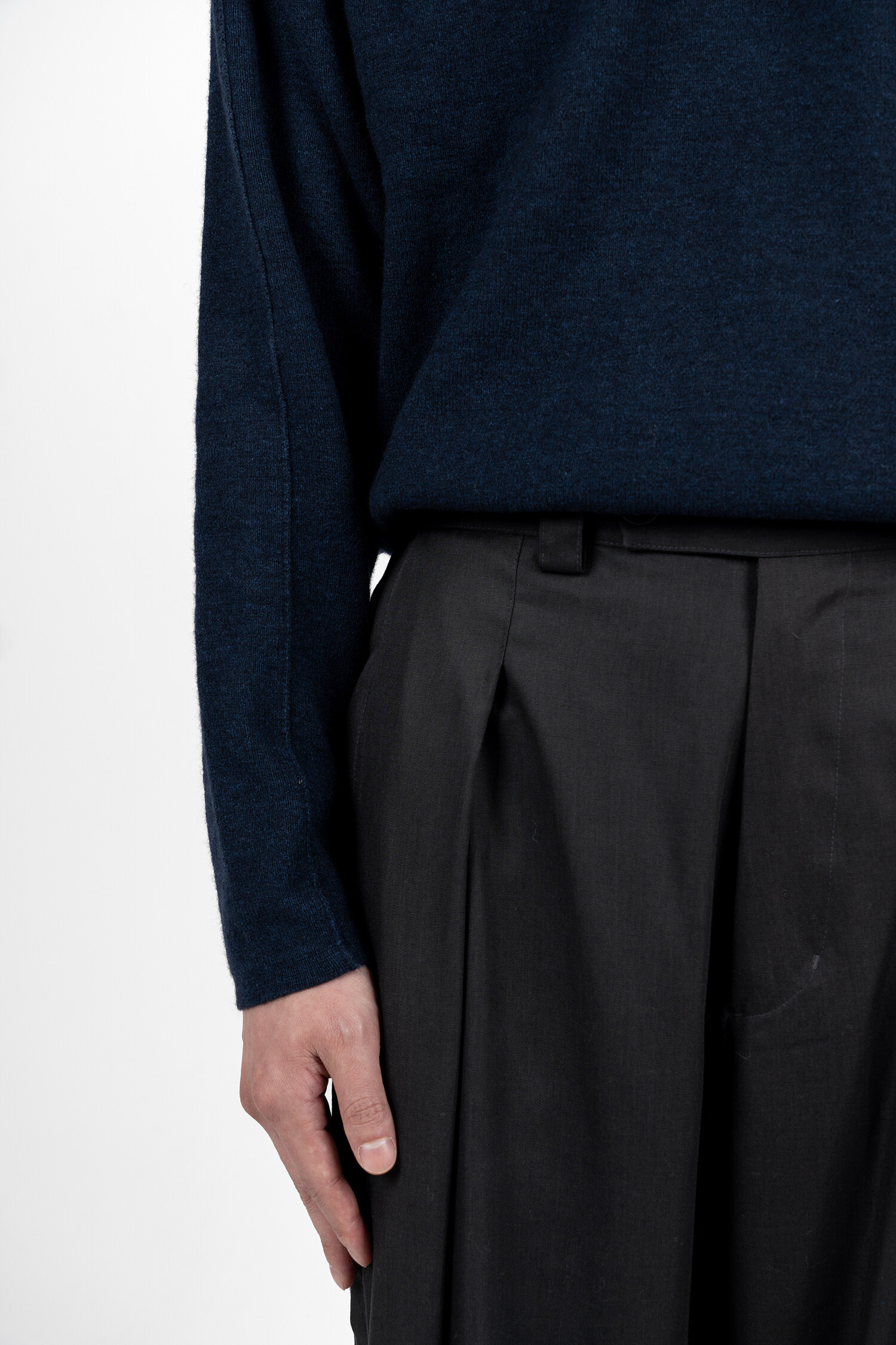 ▶ 캐시미어와 슈퍼 파인 메리노울 그리고 나일론의 혼용이 적절한 밸런스를 이루고 있는 원사를 사용했습니다. 맨살에 입어도 부드럽지만 관리도 용이한 편입니다. 무엇보다 밀라노 조직으로 짜여진 이 니트는 두께감이 있고 밀도가 높아서 착용하면 부드러운 스웻을 입은 느낌을 줍니다. 소매와 밑단에 들어가는 스판사를 사용하는 일반적인 립은 의도적으로 제거 했고 이 때문에 팬츠안에 넣어 입어도 세련되게 연출할 수 있습니다. 무엇보다 어깨라인과 소매를 타고 이어지는 패널은 이 니트의 가장 핵심적인 디테일입니다. 어깨와 소매를 잇는 라인에 절개를 넣어 시접을 밖으로 드러냈고, 구조적으로 세트인 슬리브와 래글런 슬리브가 결합된 재밌는 형태를 보여줍니다.