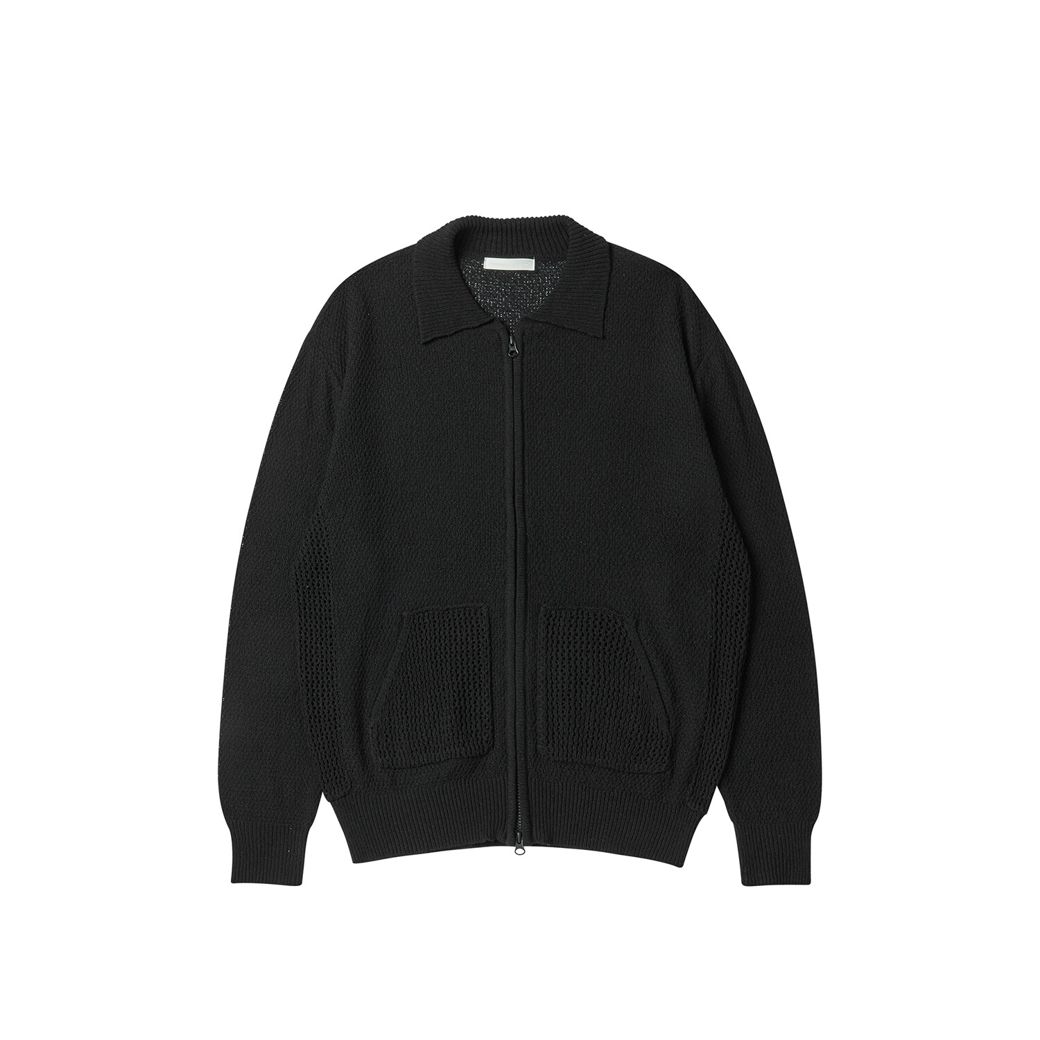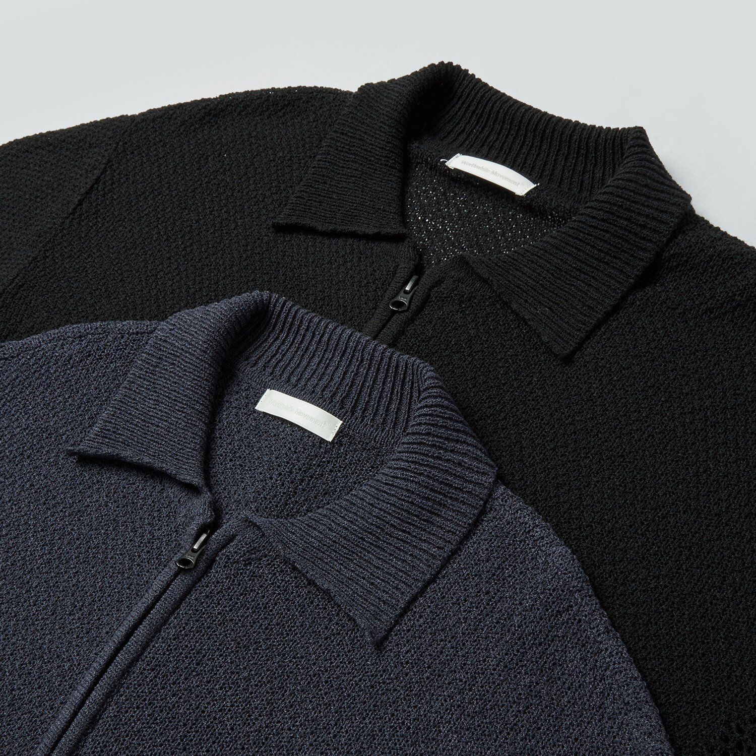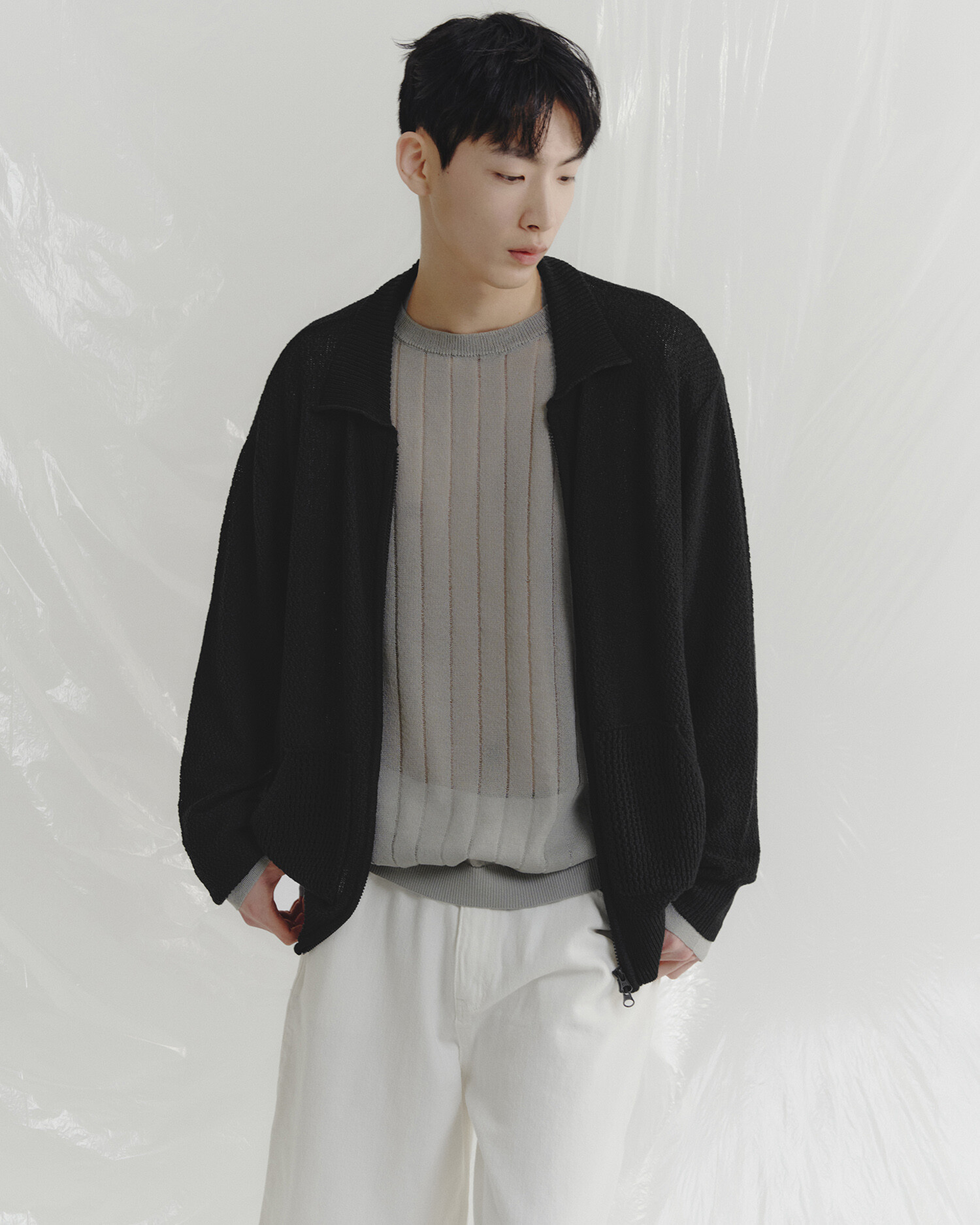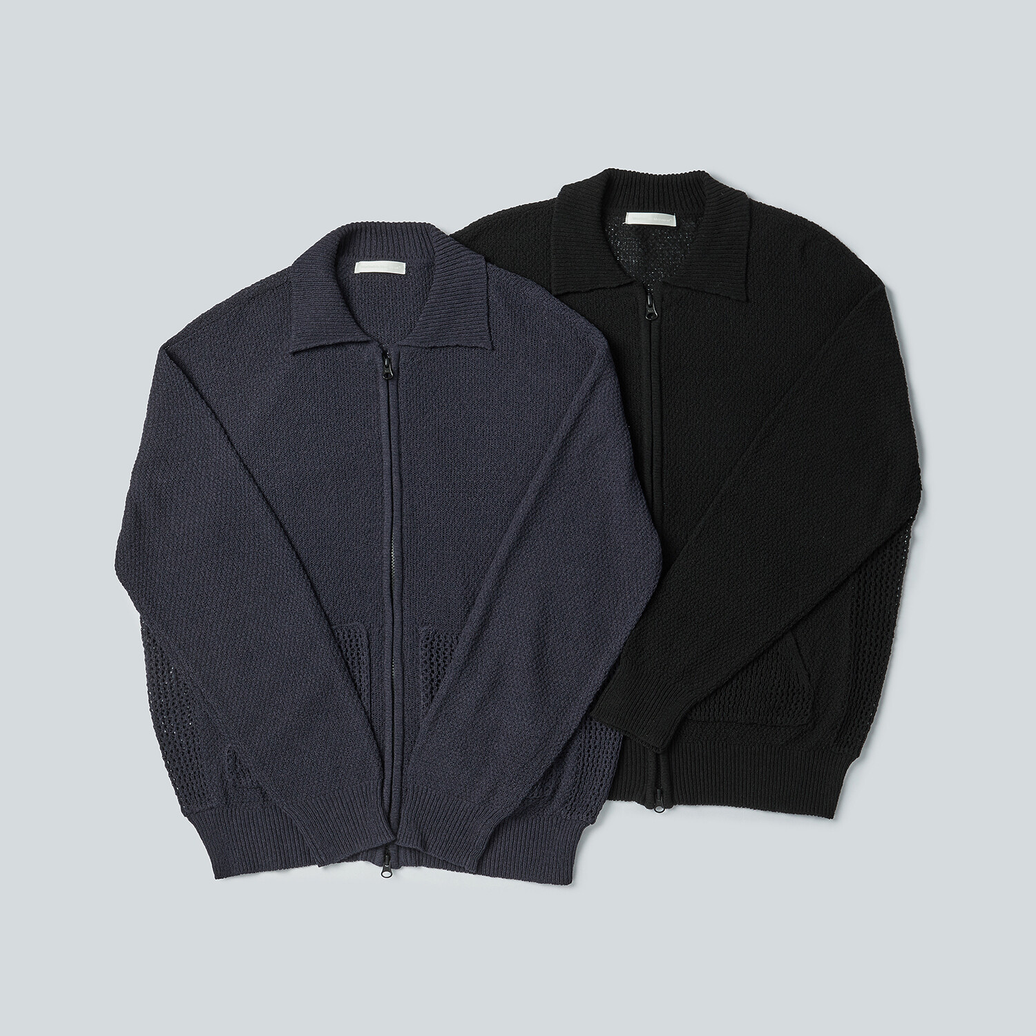 ▶ 포켓과 사이드 패턴에 시스루 형태의 네트 조직이 적용된 니트 칼라 집업입니다. YKK 비슬론 투웨이 지퍼를 사용했으며, 통기성이 좋고 시원한 소재와 조직으로 제작하여 한여름 전까지 착용하실 수 있습니다. 깔끔한 화이트 티셔츠 뿐 아니라 그래픽이 있는 이너와 함께 입어도 좋습니다.