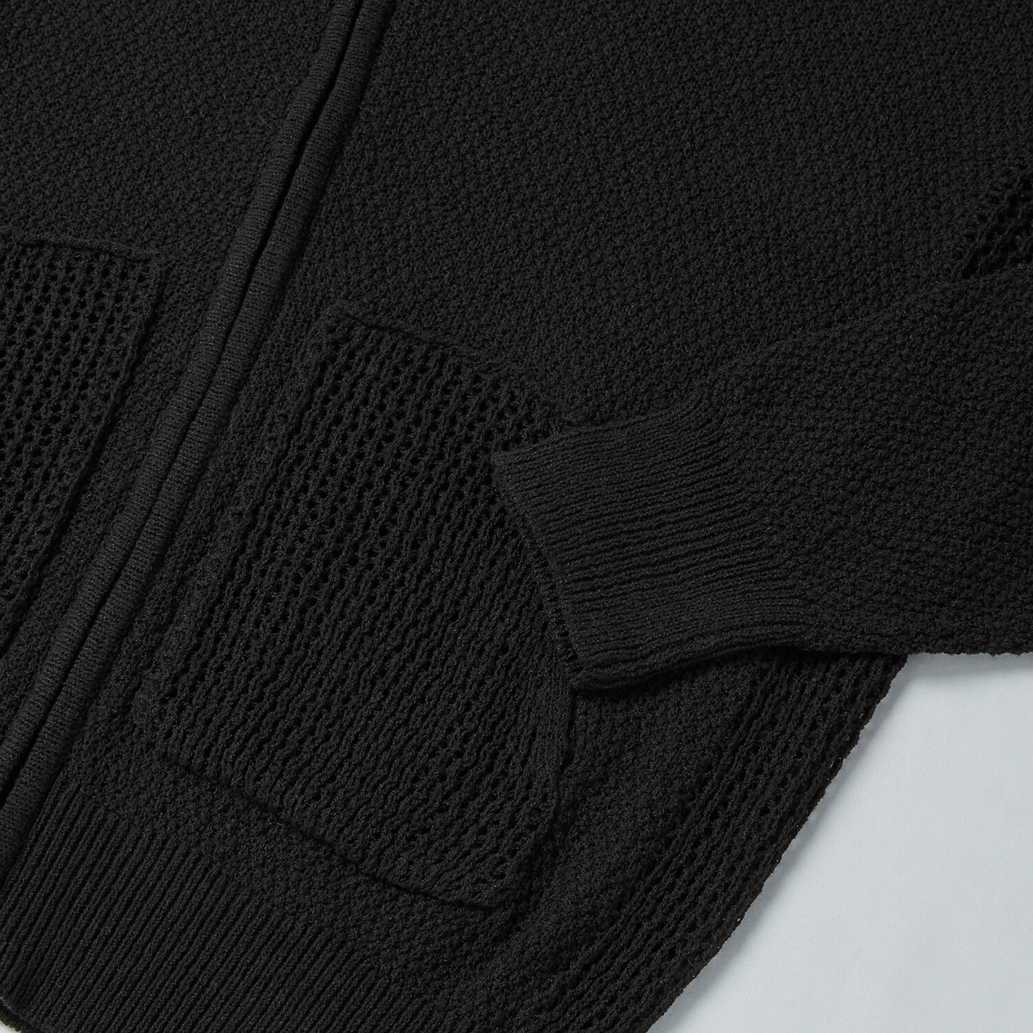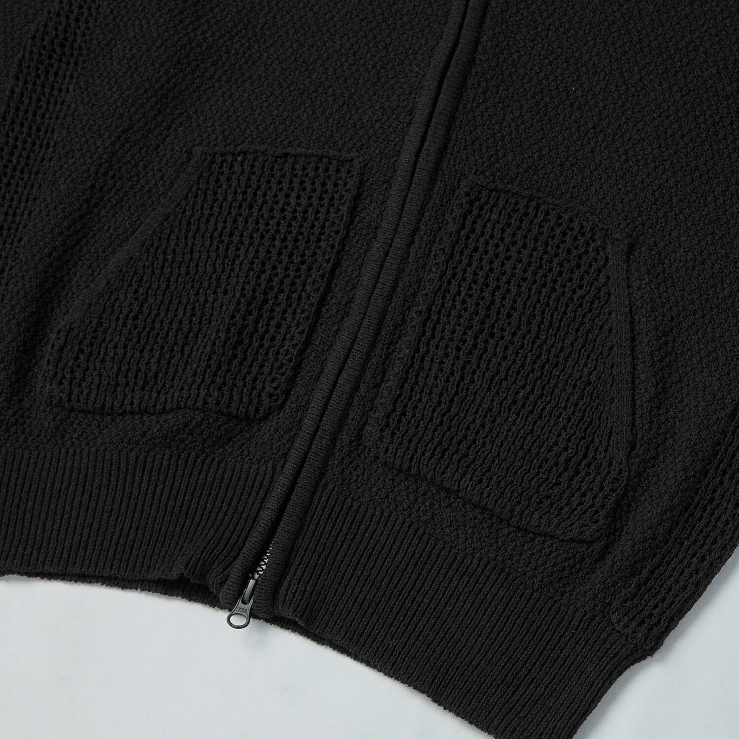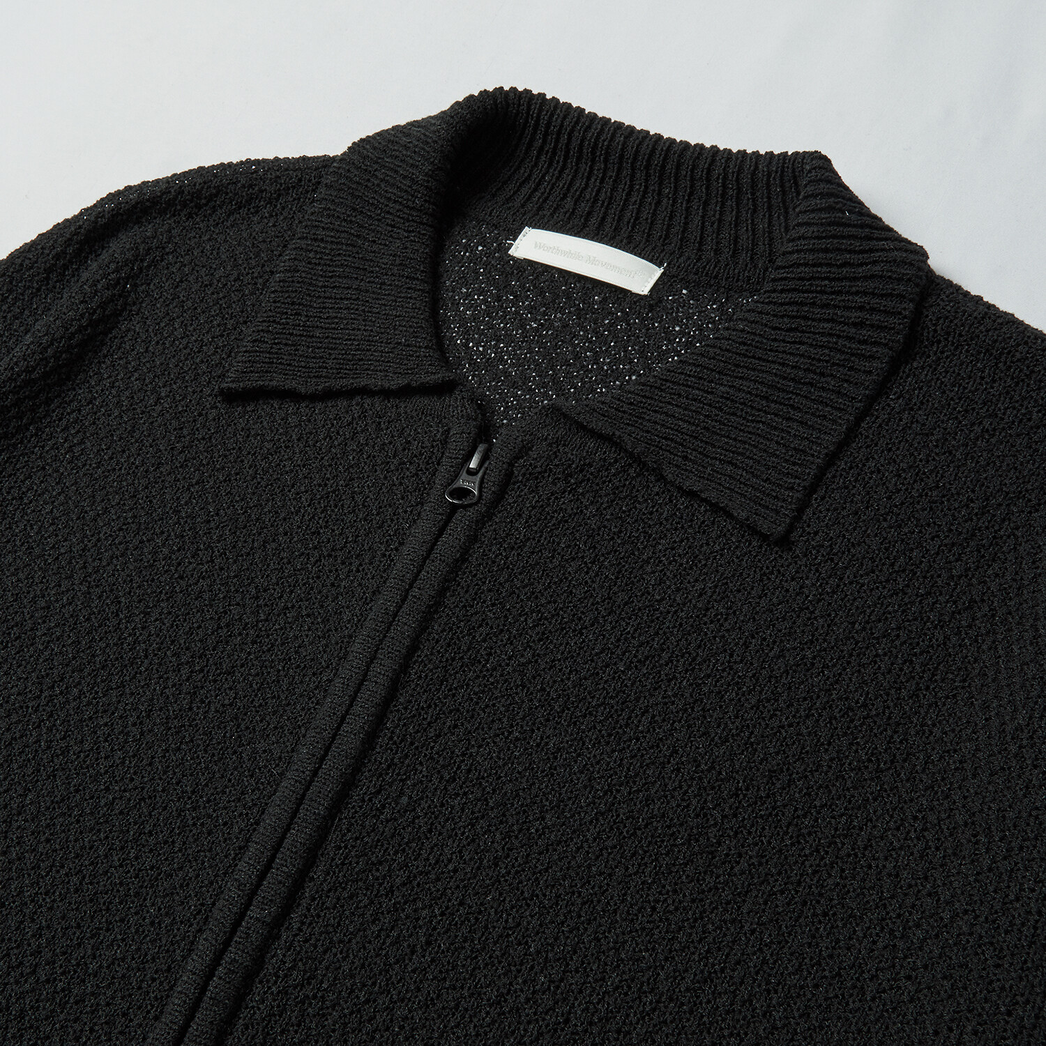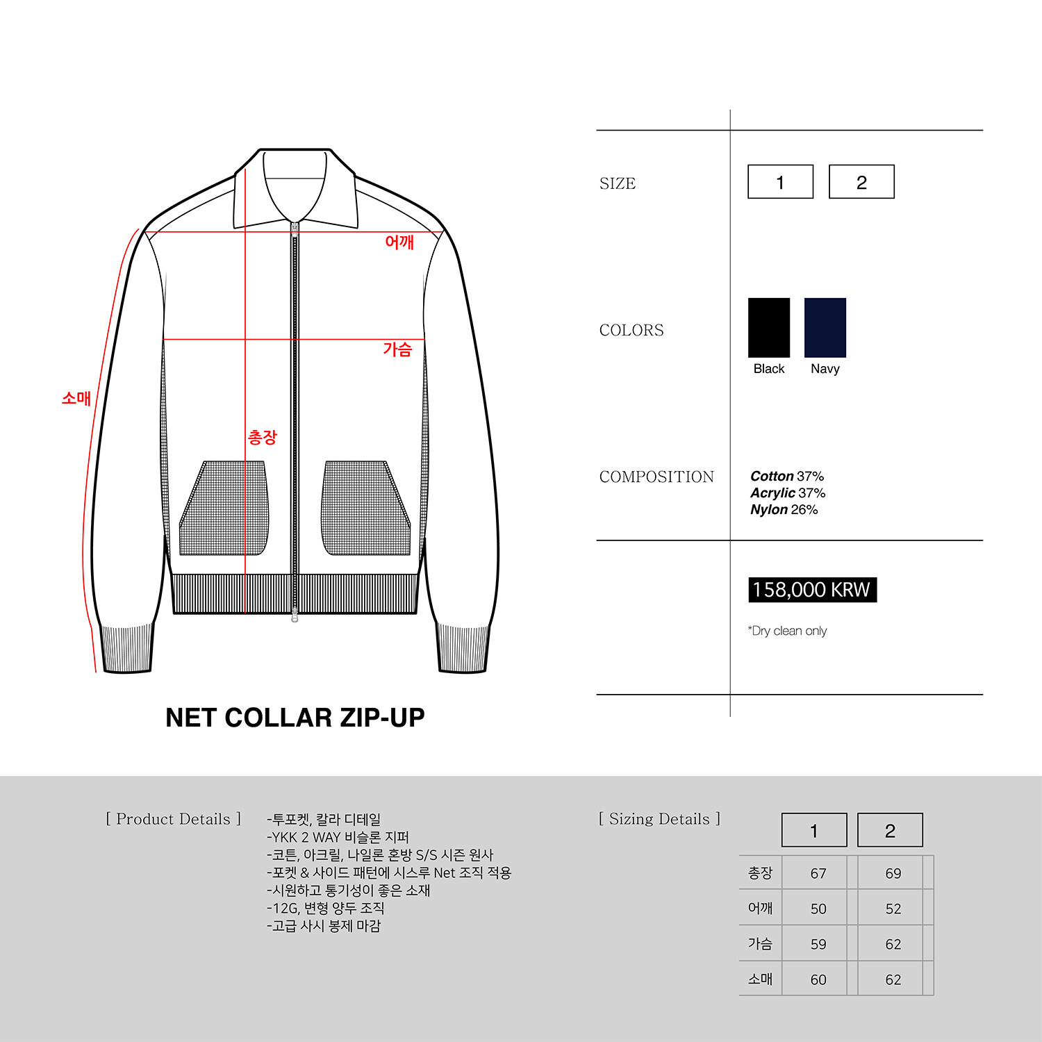 ▶ 포켓과 사이드 패턴에 시스루 형태의 네트 조직이 적용된 니트 칼라 집업입니다. YKK 비슬론 투웨이 지퍼를 사용했으며, 통기성이 좋고 시원한 소재와 조직으로 제작하여 한여름 전까지 착용하실 수 있습니다. 깔끔한 화이트 티셔츠 뿐 아니라 그래픽이 있는 이너와 함께 입어도 좋습니다.