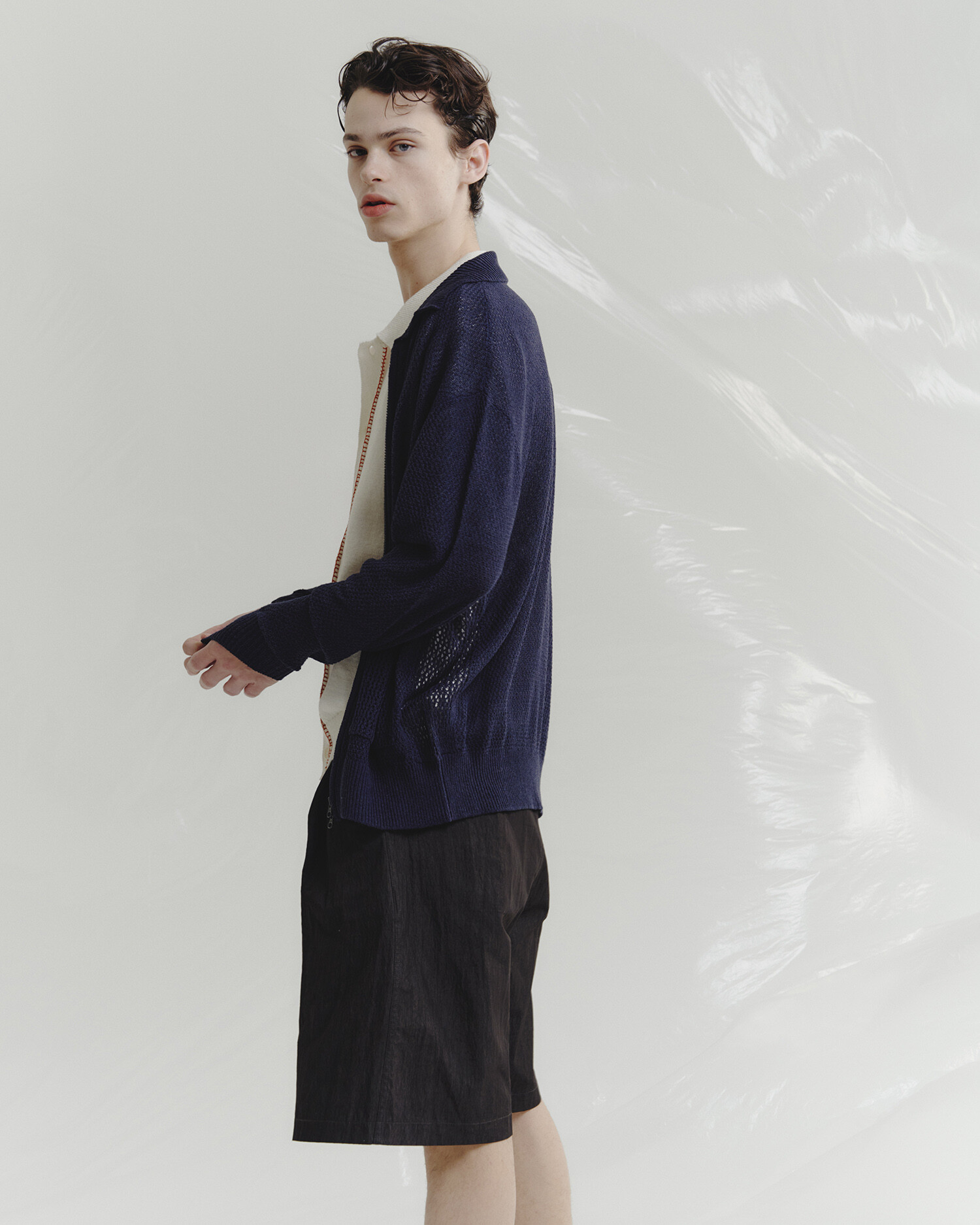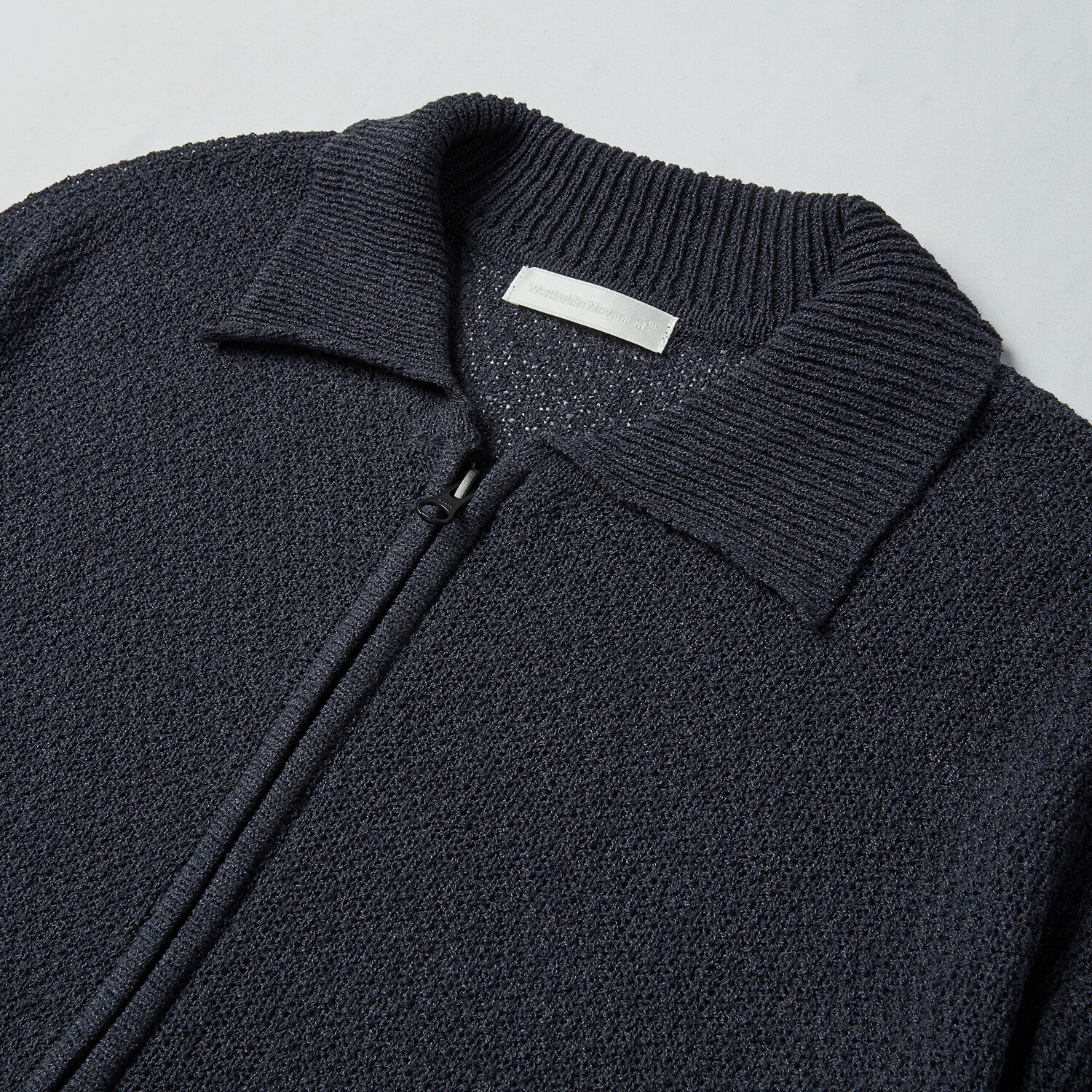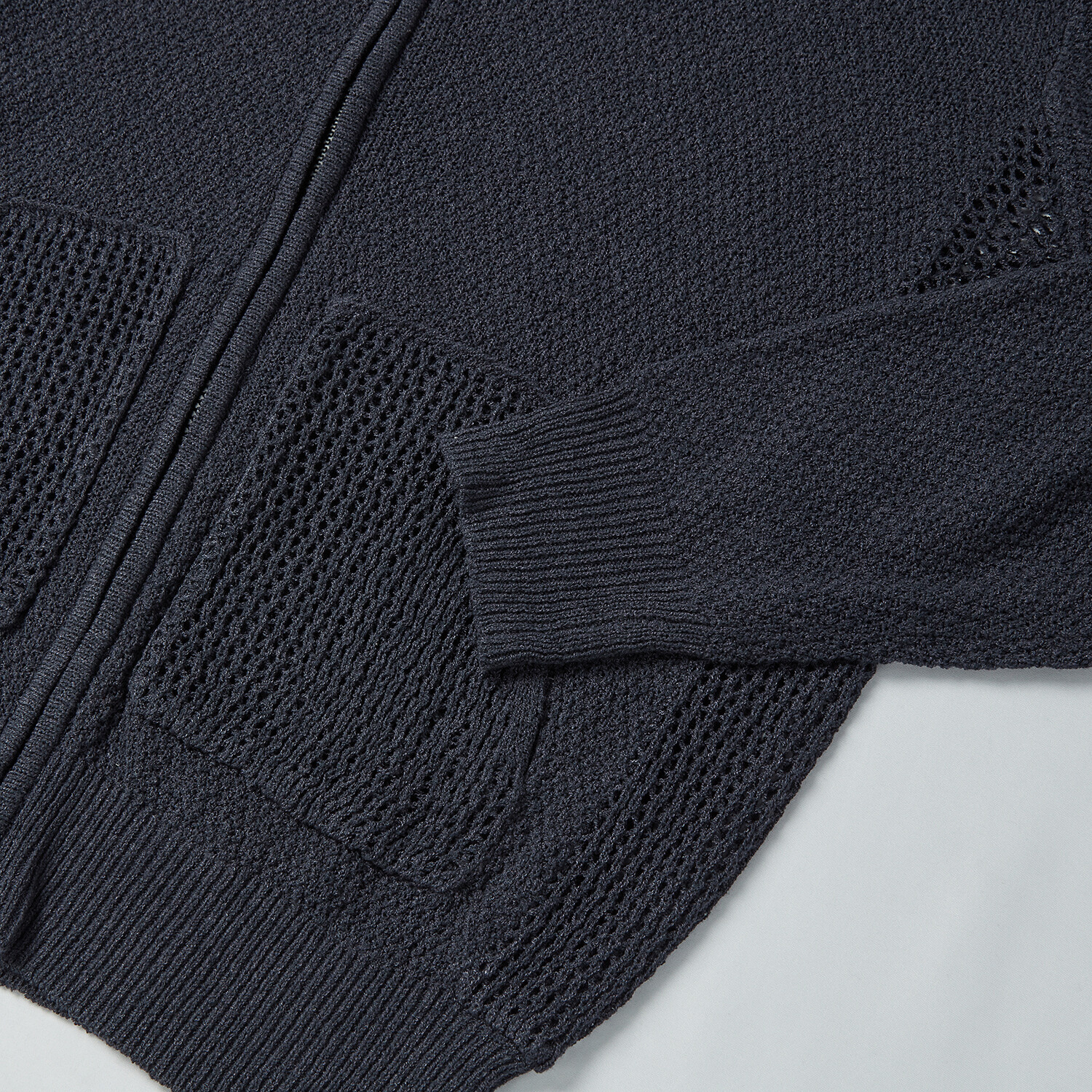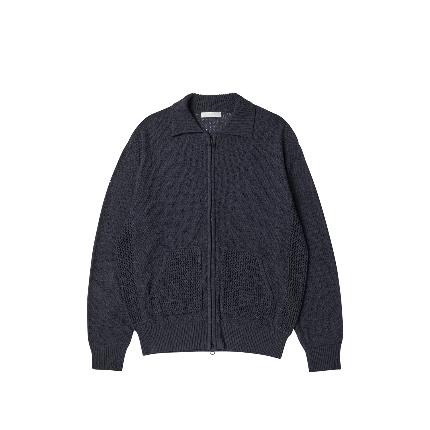 ▶ 포켓과 사이드 패턴에 시스루 형태의 네트 조직이 적용된 니트 칼라 집업입니다. YKK 비슬론 투웨이 지퍼를 사용했으며, 통기성이 좋고 시원한 소재와 조직으로 제작하여 한여름 전까지 착용하실 수 있습니다. 깔끔한 화이트 티셔츠 뿐 아니라 그래픽이 있는 이너와 함께 입어도 좋습니다.