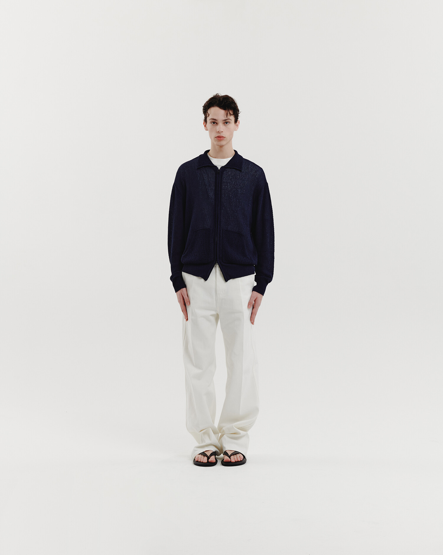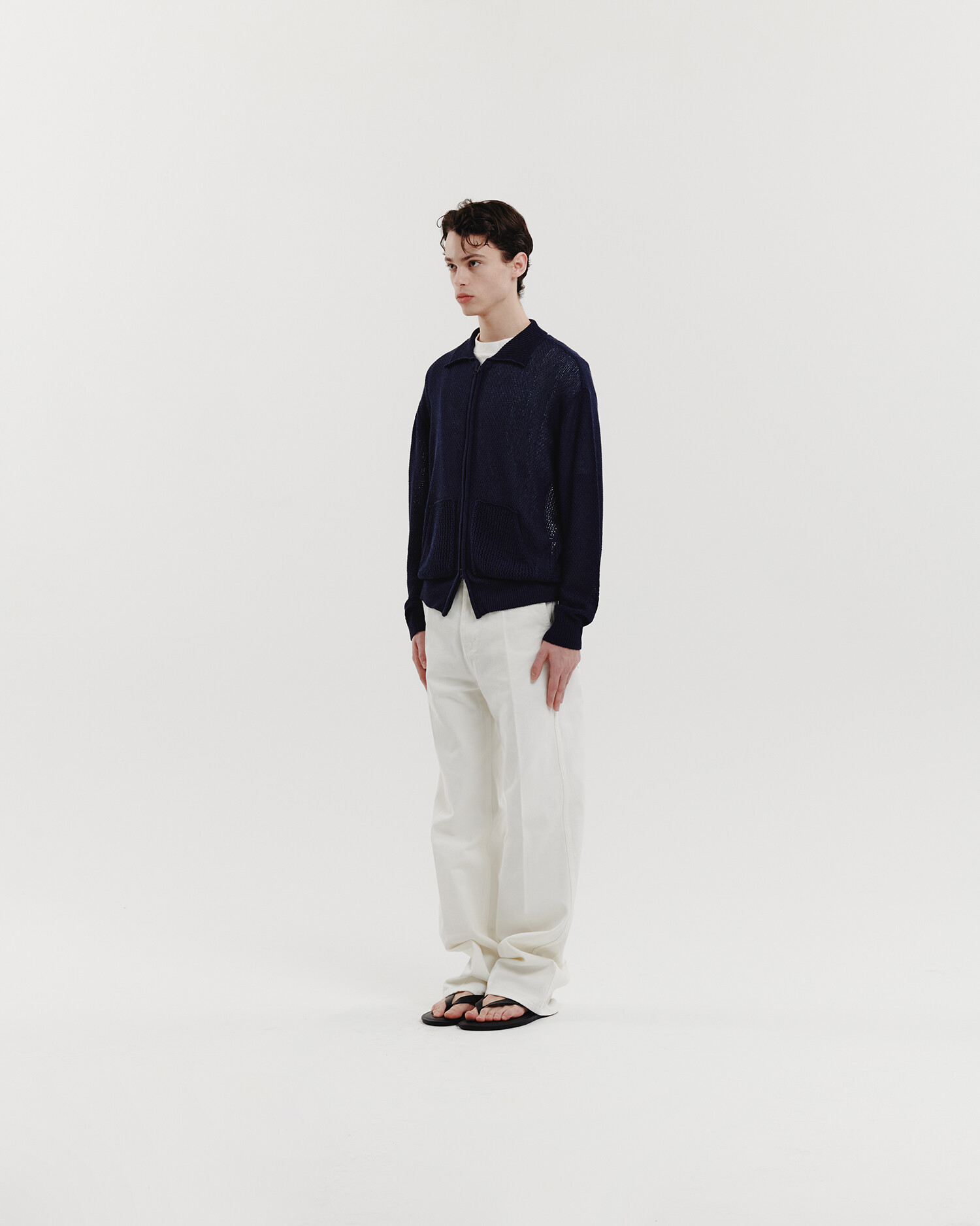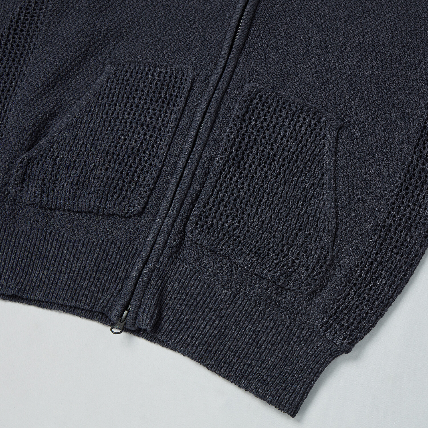 ▶ 포켓과 사이드 패턴에 시스루 형태의 네트 조직이 적용된 니트 칼라 집업입니다. YKK 비슬론 투웨이 지퍼를 사용했으며, 통기성이 좋고 시원한 소재와 조직으로 제작하여 한여름 전까지 착용하실 수 있습니다. 깔끔한 화이트 티셔츠 뿐 아니라 그래픽이 있는 이너와 함께 입어도 좋습니다.