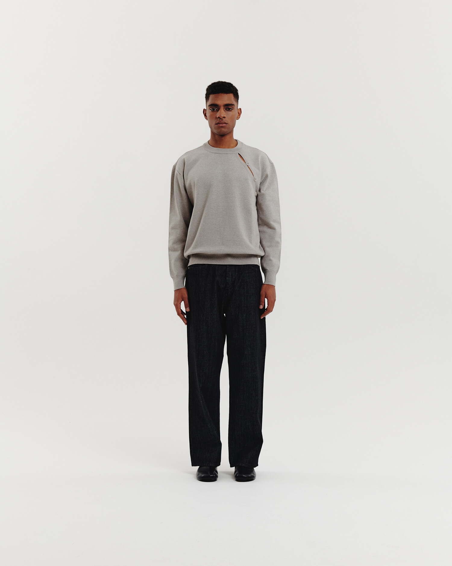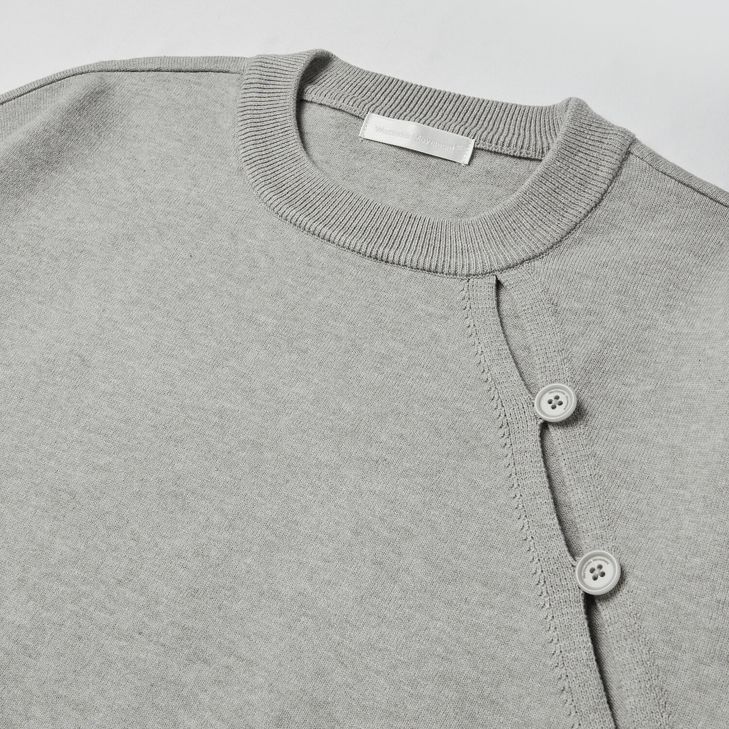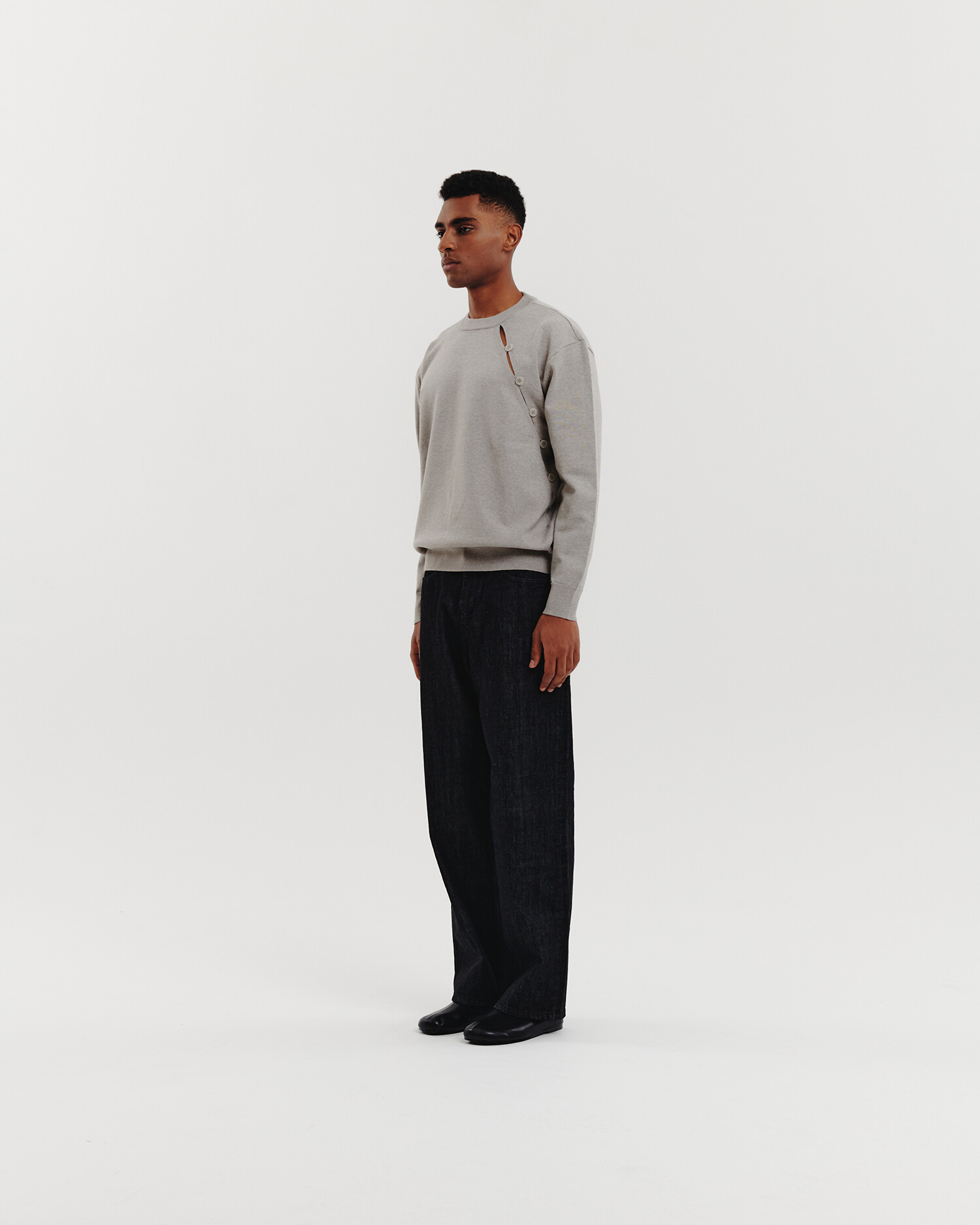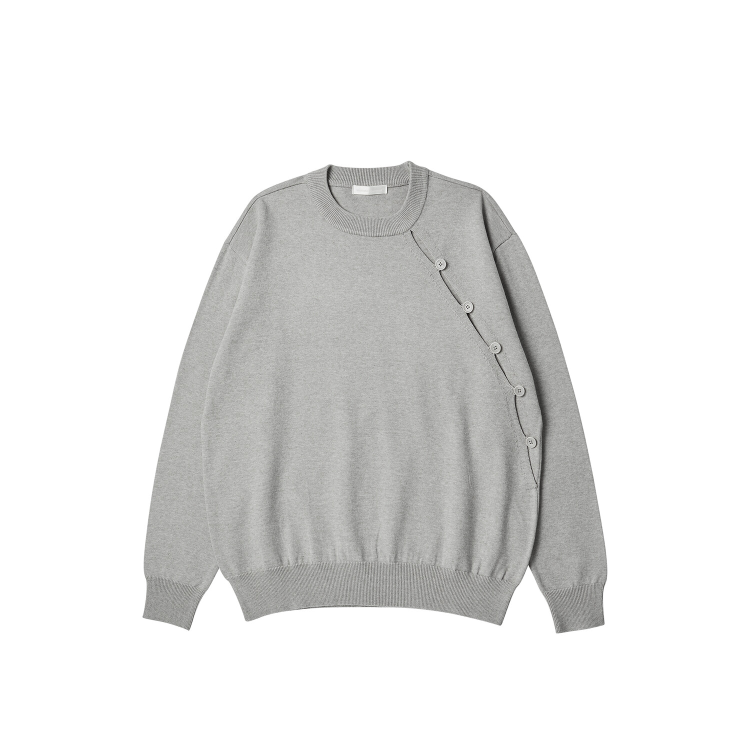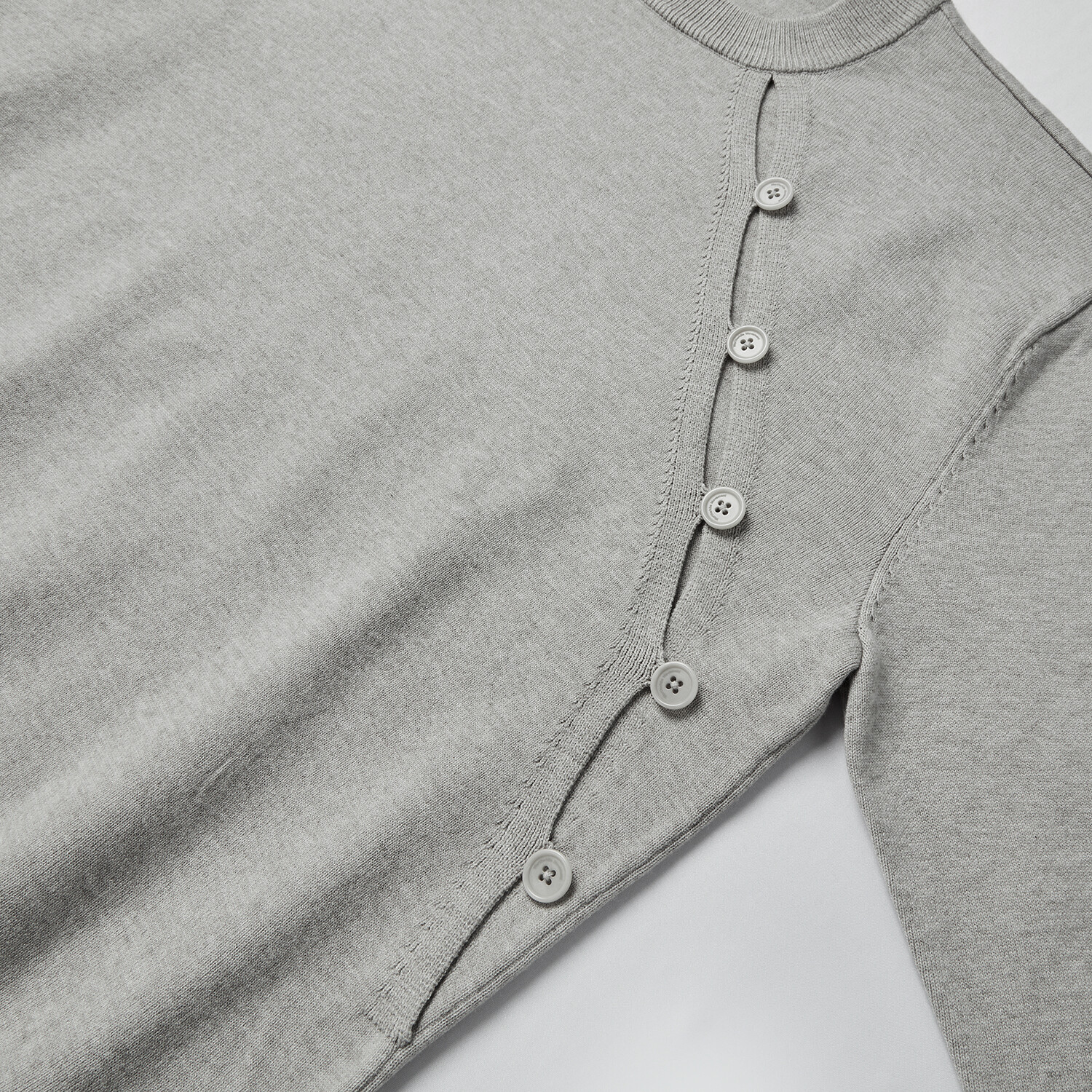 ▶ 네크라인부터 옆 시접선까지 이어진 큰 사선 절개가 특징적인 크루넥 니트입니다. 로고가 새겨진 천연 너트 단추를 이용해 절개 부분을 열고 닫을 수 있으며, 이너 레이어드 유무에 따라 다양한 스타일링 변주가 가능합니다. 절개 부분의 하단으로 내려갈 수록 겹쳐지는 분량을 크게하여 착용시 불편함이 없도록 고려했습니다. 12게이지 2합의 적당한 두께감과 원사 특성상 파인한 외관이 세련되고 깔끔한 느낌을 줍니다. 코튼, 아크릴, Pbt 혼용으로 터치감은 부드럽고 적당한 텐션감이 있습니다. 성형 편직 및 고급 사시봉제로 마감했습니다.