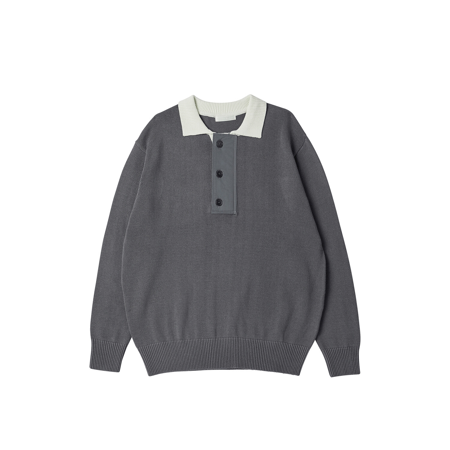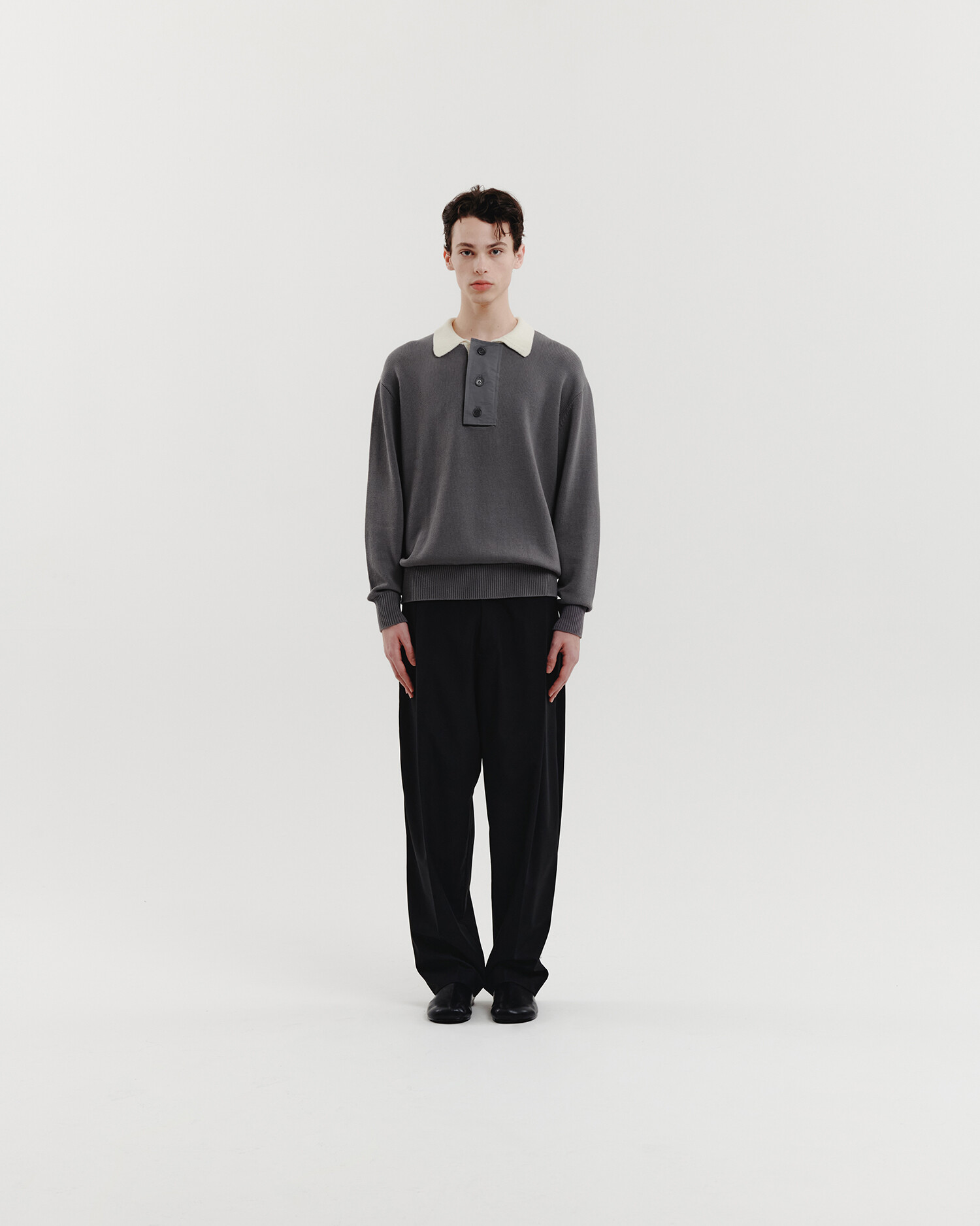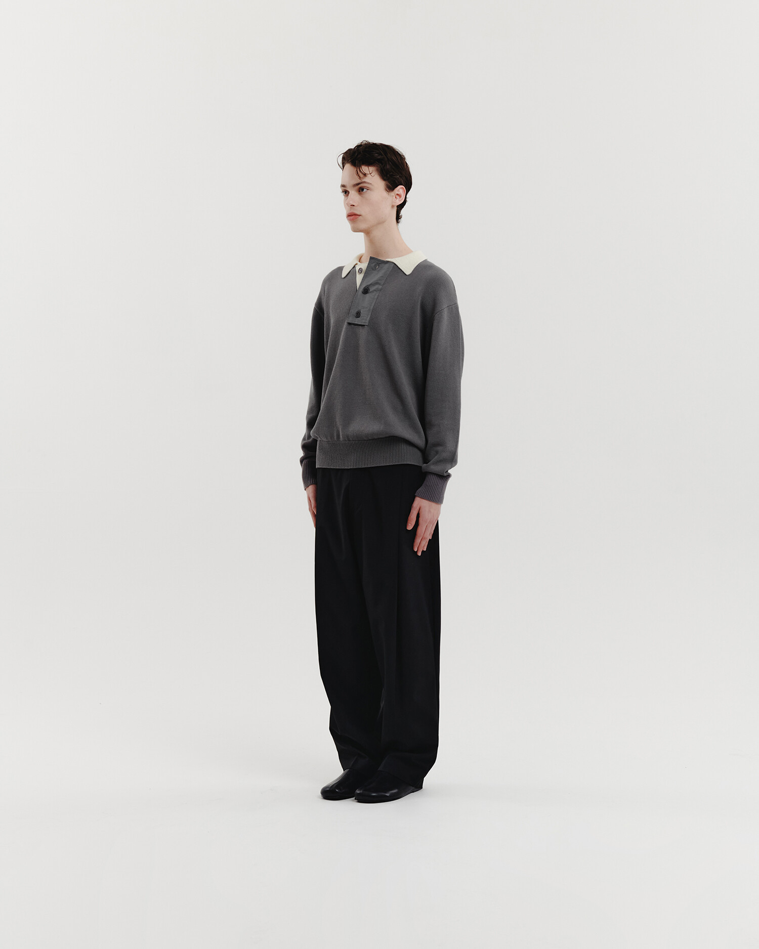 ▶ 와이드한 칼라가 적용된 니트 폴로 셔츠입니다. 전체적으로 여유있는 실루엣으로 편하게 착용하실 수 있으며 면과 아크릴 혼용사를 사용하여 터치가 부드럽고 관리가 용이합니다. 와이드한 칼라에는 몸판의 컬러보다 밝은 톤의 컬러가 배색으로 들어가 있으며 단추를 잠구는 플라켓은 크기를 키우고 우븐 원단을 덧대어 하이브리드 형태로 제작했습니다. 단추를 열어서 니트와 우븐 원단을 같이 보여주는 디테일이 특징인 제품입니다. 로고가 각인된 천연 너트단추를 사용했으며 헤라시 편직 및 고급 사시봉제를 통해 완성도있게 마감했습니다.