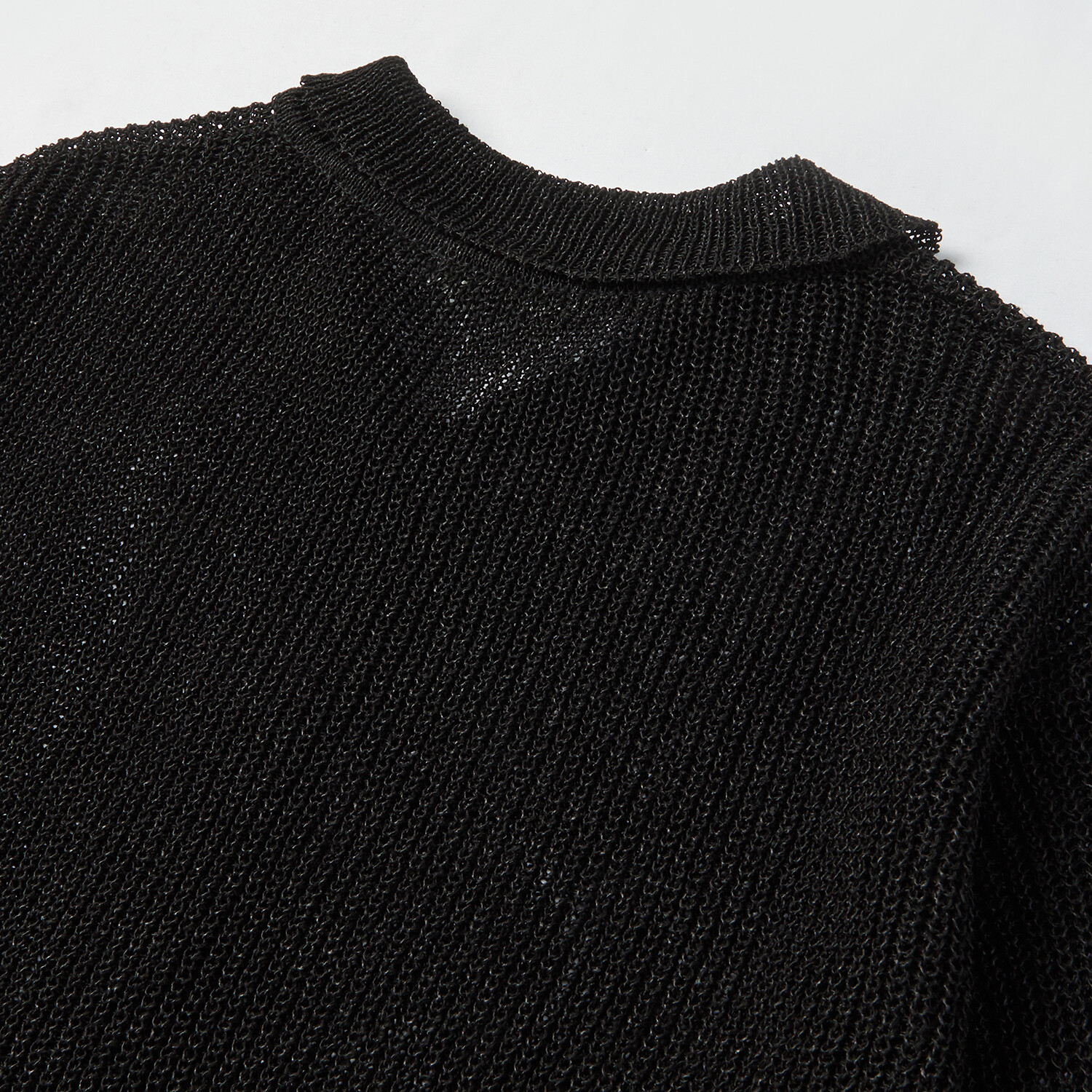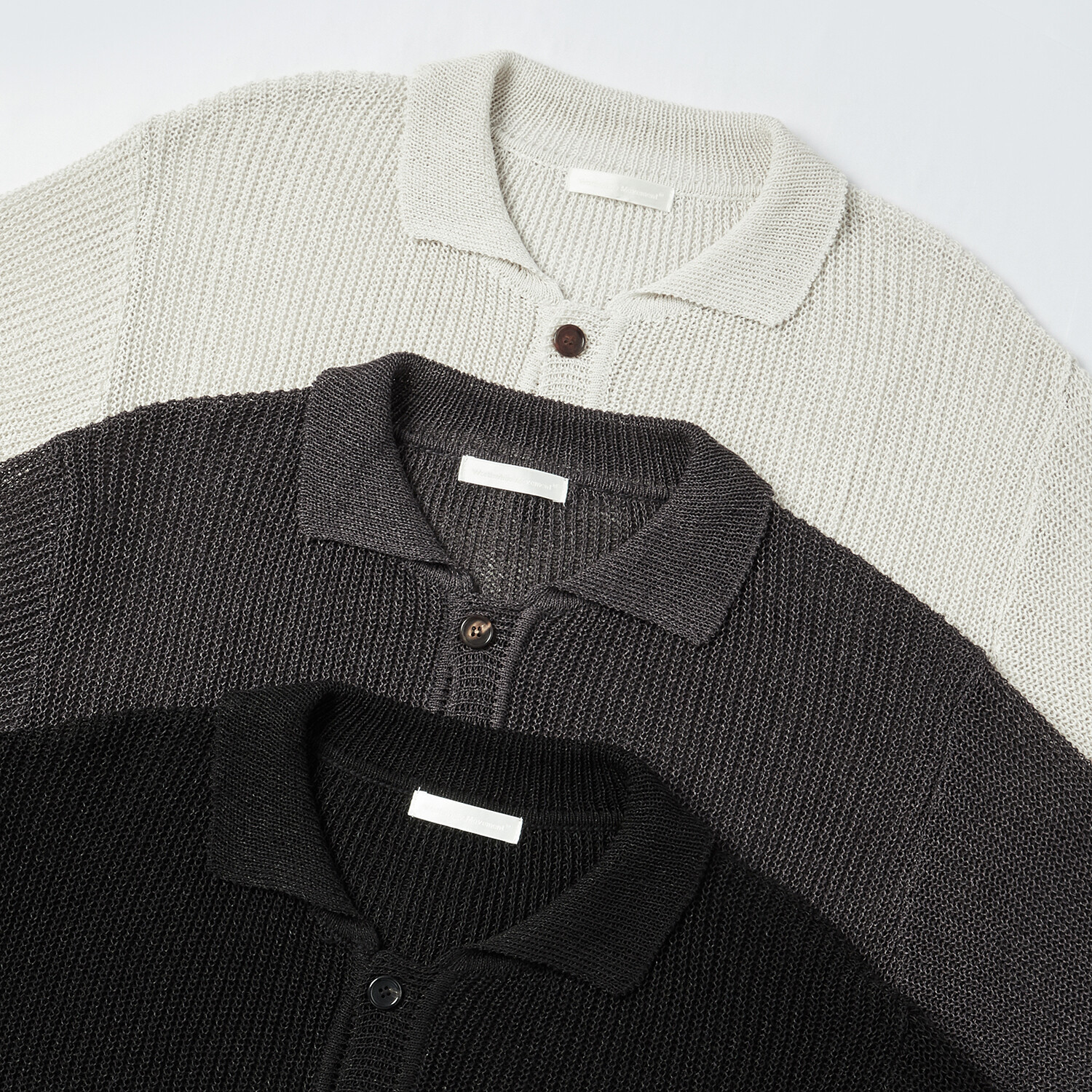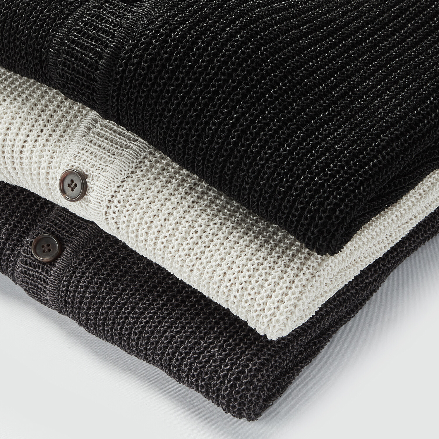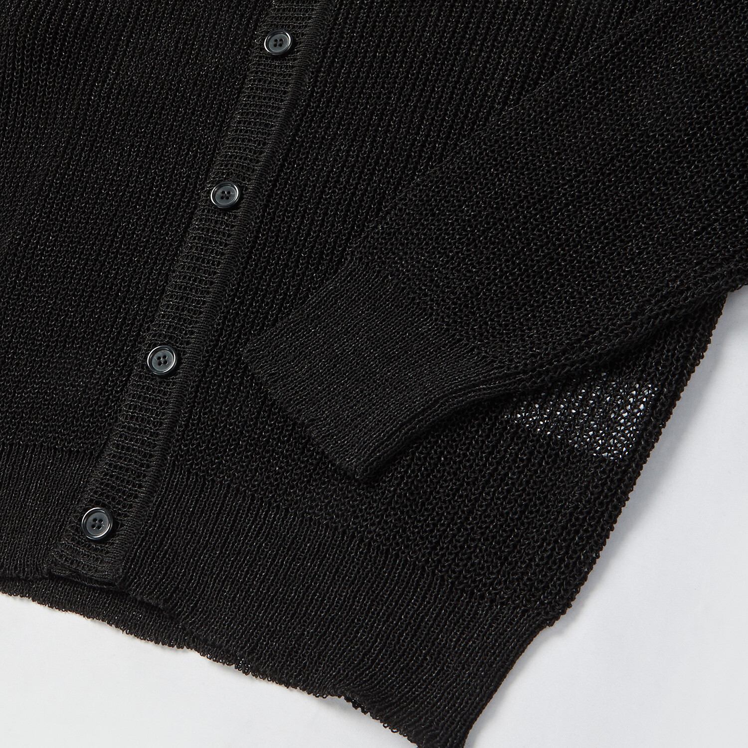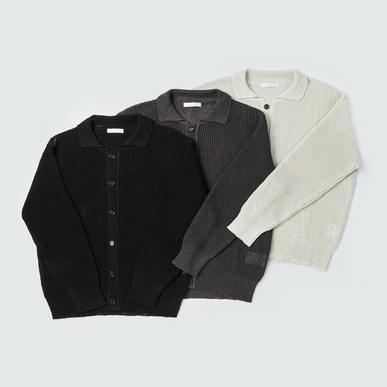 ▶ 와이드한 칼라가 적용된 가디건으로 한지와 린넨 소재 등이 혼용된 특징적인 원사를 사용했습니다. 굉장히 가볍고 드라이한 터치로 봄, 여름철 착용하기 좋으며 바스락거리는 질감이 매력적인 제품입니다. 적당히 여유로운 실루엣으로 편하게 피팅하실 수 있으며, 이너가 비치는 얇은 두께로 통기성도 좋습니다. 천연 너트 단추를 사용하였으며, 고급 사시 봉제로 마감했습니다.