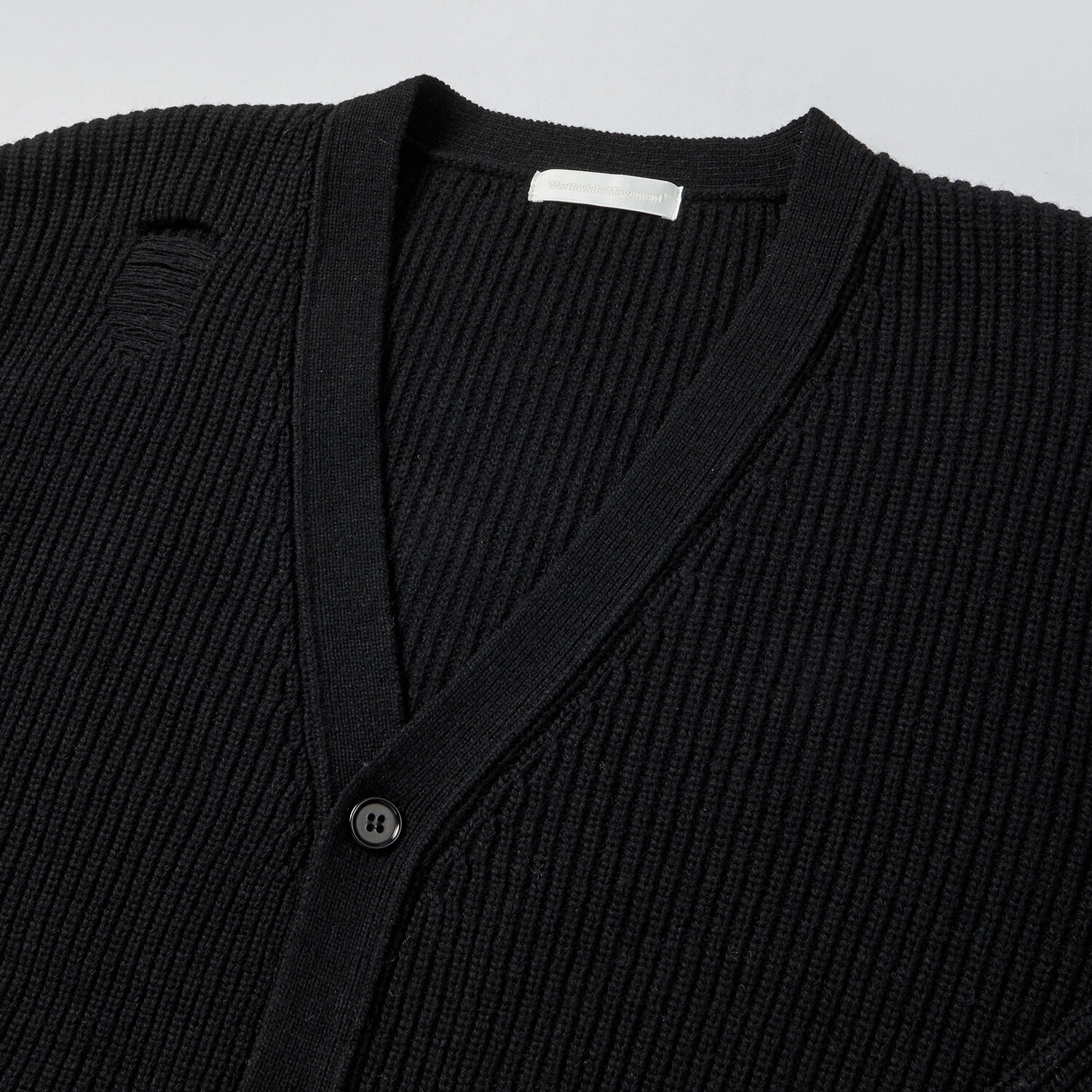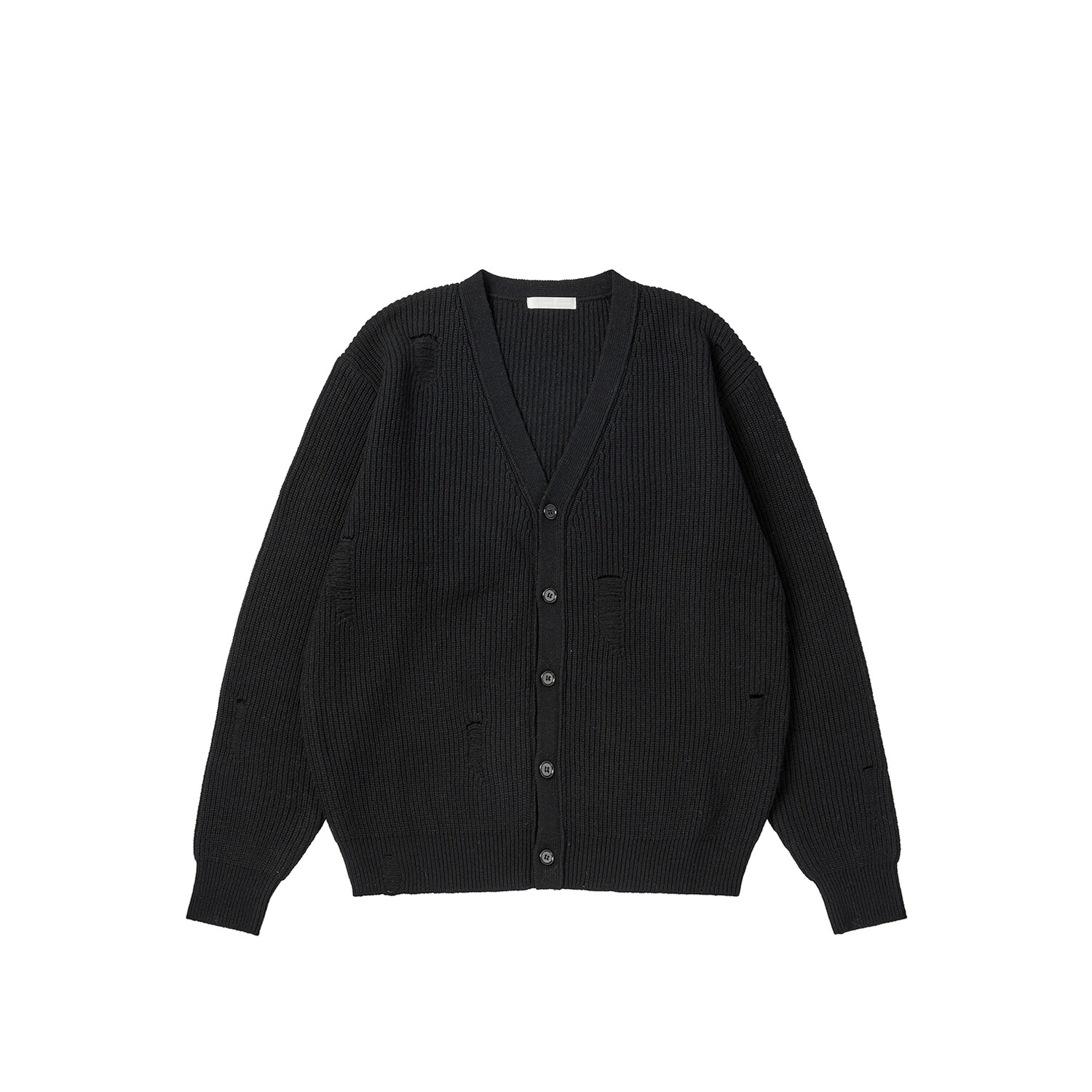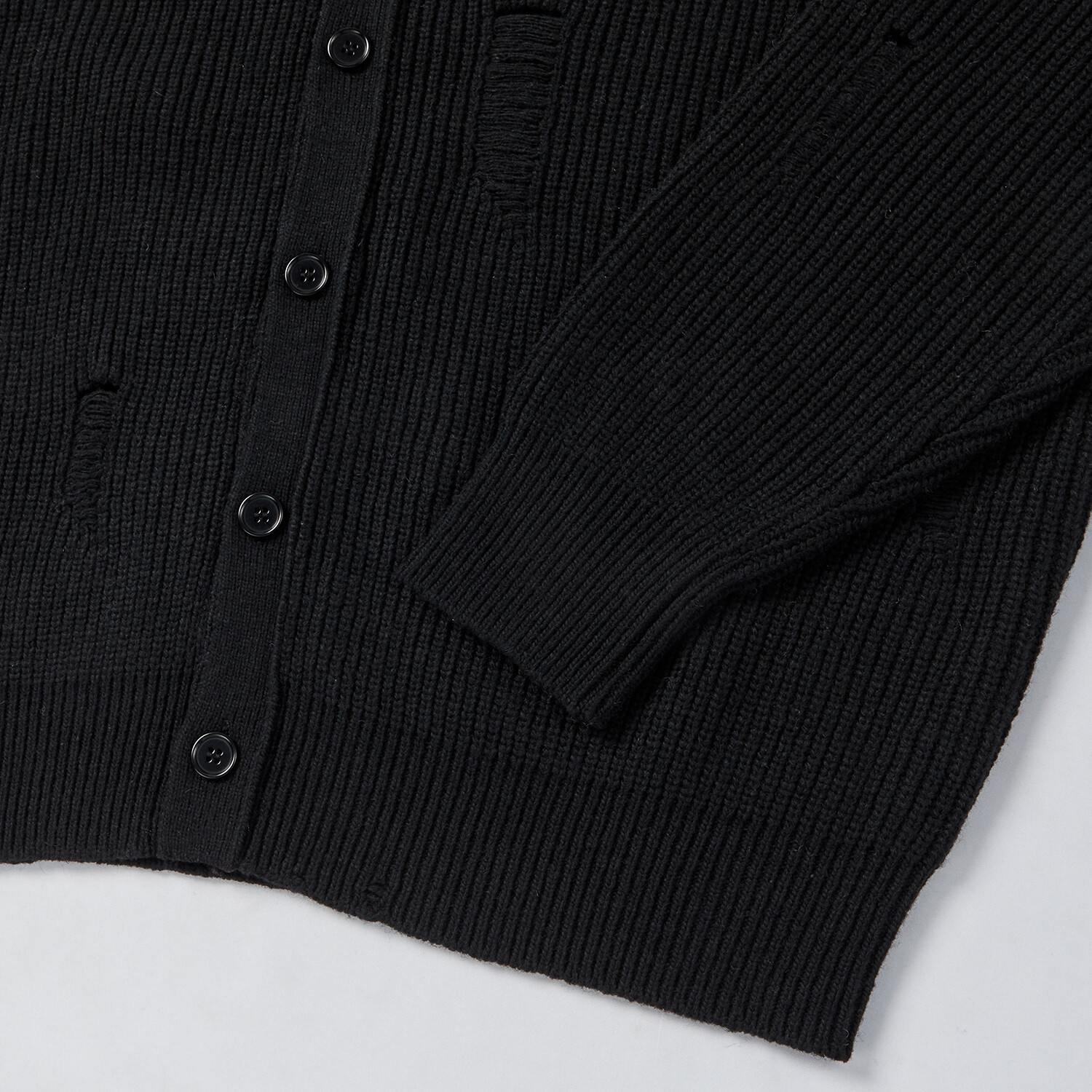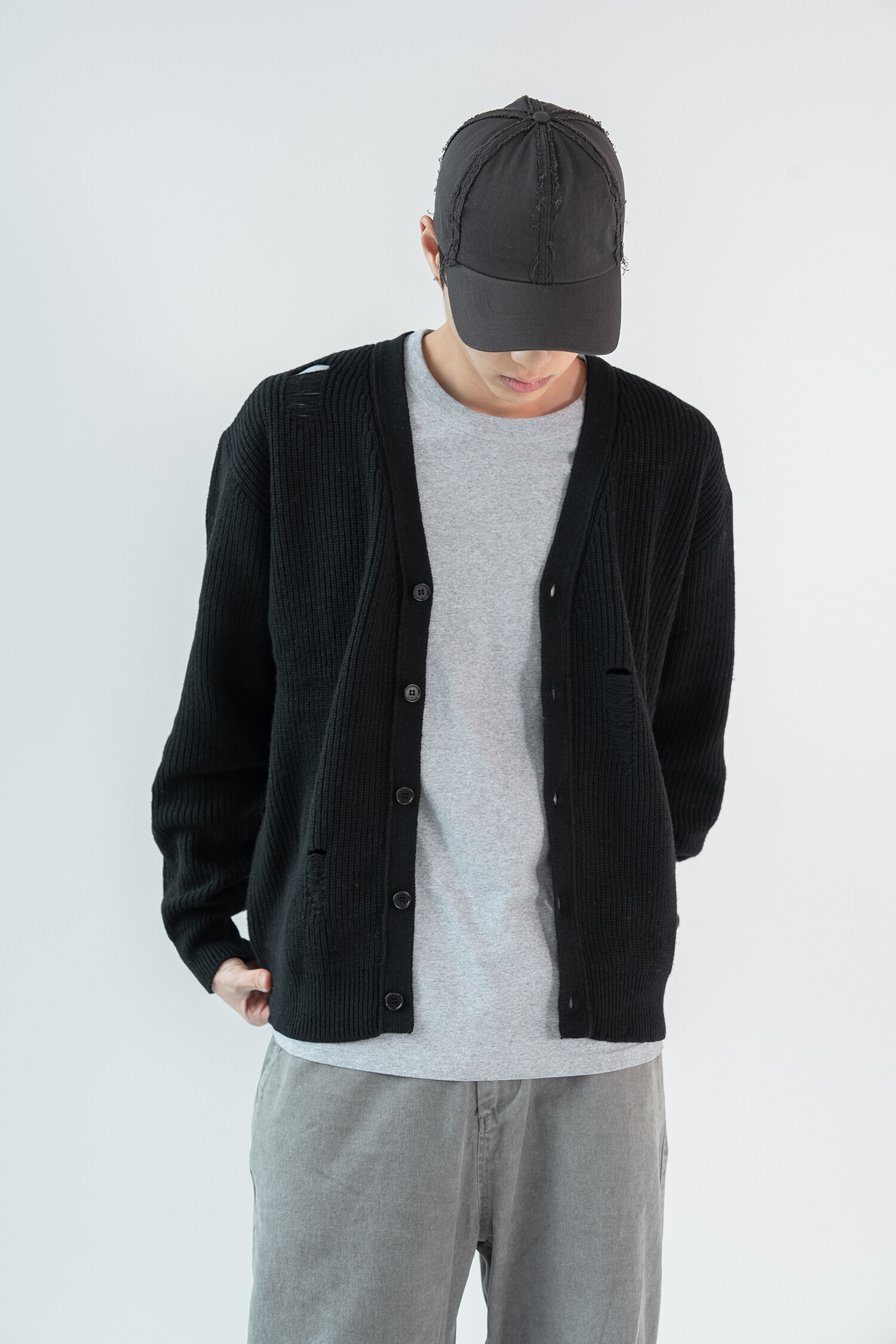 ▶ 적당한 두께의 탄탄한 카디건입니다. 5버튼의 V네크라인을 형성하는 기본적인 제품이지만 위트있는 데미지 디테일을 가미하여 함께 매치하는 이너에 따라 다양한 분위기를 느끼실 수 있습니다. 보온성이 우수한 메리노울과 터치감이 좋은 캐시가공된 나일론 혼방 원사를 사용하여 적절한 밸런스를 유지합니다. 다소 여유로운 실루엣에 길지 않은 기장감으로 누구나 편하게 입기 좋습니다. 7게이지 2합 하찌 조직으로 편직했고 고급 성형 편직 및 사시 봉제로 마감했습니다.