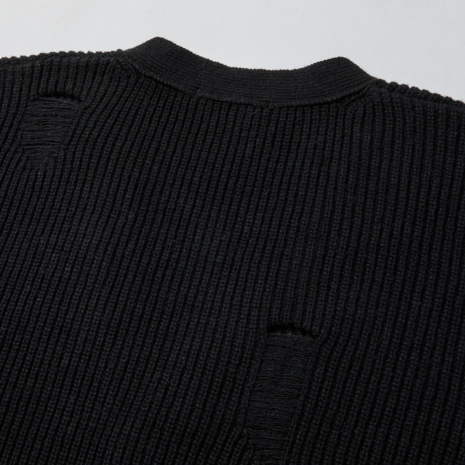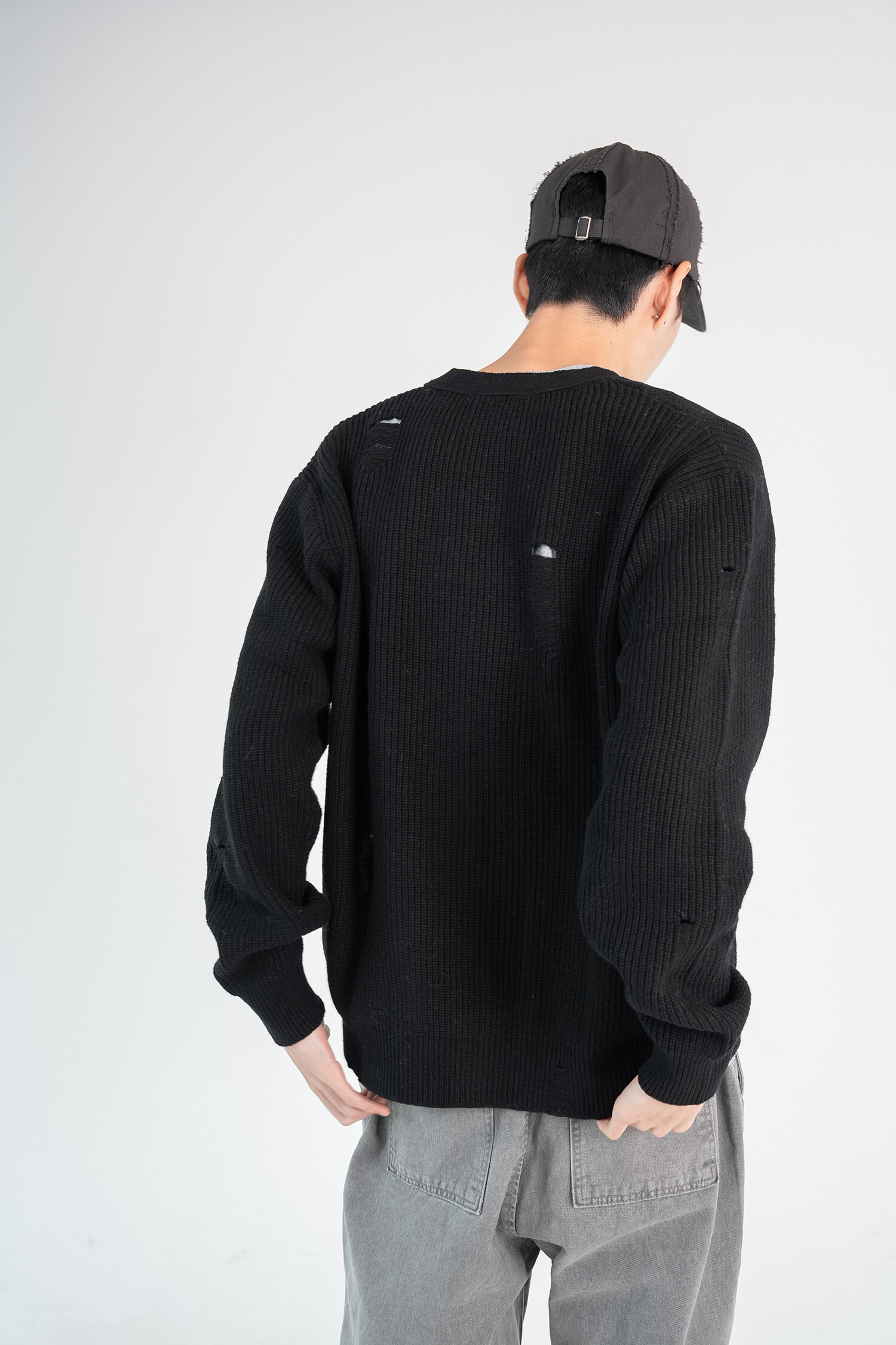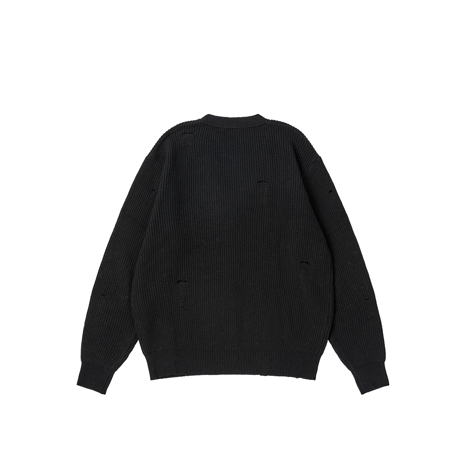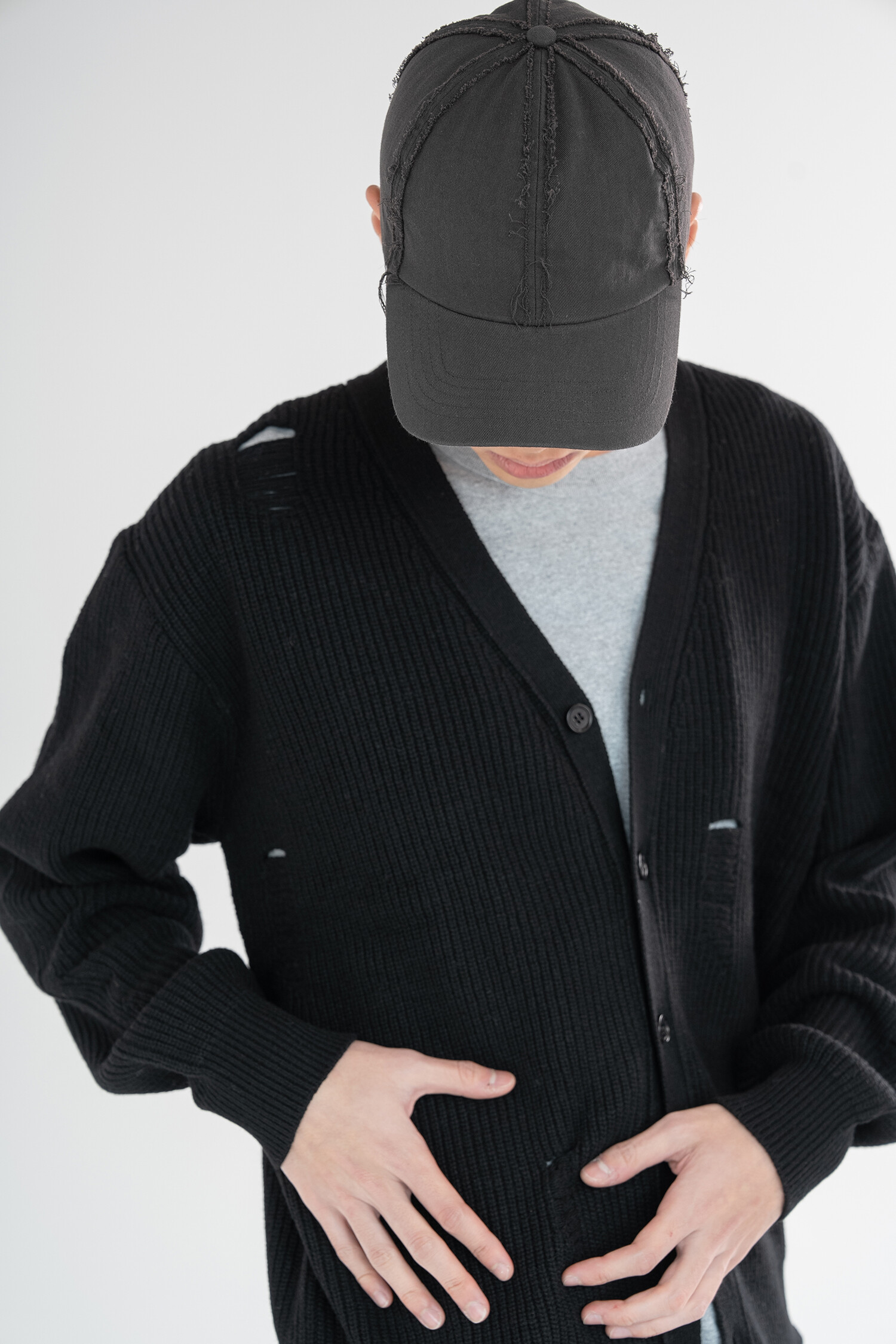 ▶ 적당한 두께의 탄탄한 카디건입니다. 5버튼의 V네크라인을 형성하는 기본적인 제품이지만 위트있는 데미지 디테일을 가미하여 함께 매치하는 이너에 따라 다양한 분위기를 느끼실 수 있습니다. 보온성이 우수한 메리노울과 터치감이 좋은 캐시가공된 나일론 혼방 원사를 사용하여 적절한 밸런스를 유지합니다. 다소 여유로운 실루엣에 길지 않은 기장감으로 누구나 편하게 입기 좋습니다. 7게이지 2합 하찌 조직으로 편직했고 고급 성형 편직 및 사시 봉제로 마감했습니다.