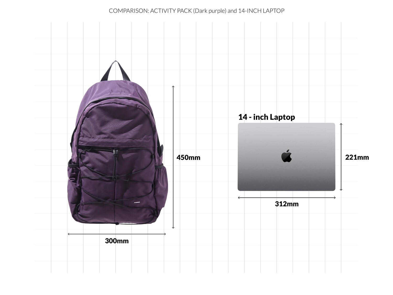 '액티비티 팩'은 산책과 같은 일상생활 뿐 아니라 가벼운 등산이나 트래킹과 같은 활동적인 상황에서도 사용하기 좋은 백팩입니다. 등판과 포켓 부분을 제외하고 안감 및 보강재 없이 홑겹의 원단으로 제작하여 가볍고 유연한 것이 특징입니다. 외부에는 E-스트링과 스토퍼 그리고 플리츠가 잡힌 수납공간이 있으며 양 측면에는 물병 등을 보관할 수 있는 포켓이 배치되어 있습니다. 뿐만 아니라 내부에도 총 3개의 이너 포켓을 배치하여 크고 작은 다양한 소지품들을 효율적으로 수납할 수 있습니다. 스트랩의 안쪽에는 에어메쉬를 배치하여 어깨에서 쉽게 미끄러지지 않고 보다 더 안정적인 쿠셔닝을 느끼실 수 있습니다. 체스트 웨빙과 버클은 E-밴드를 통해 스트랩에서 탈부착이 가능합니다. 메인 스트랩의 길이는 캠버클을 통해 쉽게 조정 가능하고 단단하게 고정해줍니다. YKK사의 지퍼와 슬라이더 그리고 우진 플라스틱의 파츠를 사용했습니다.