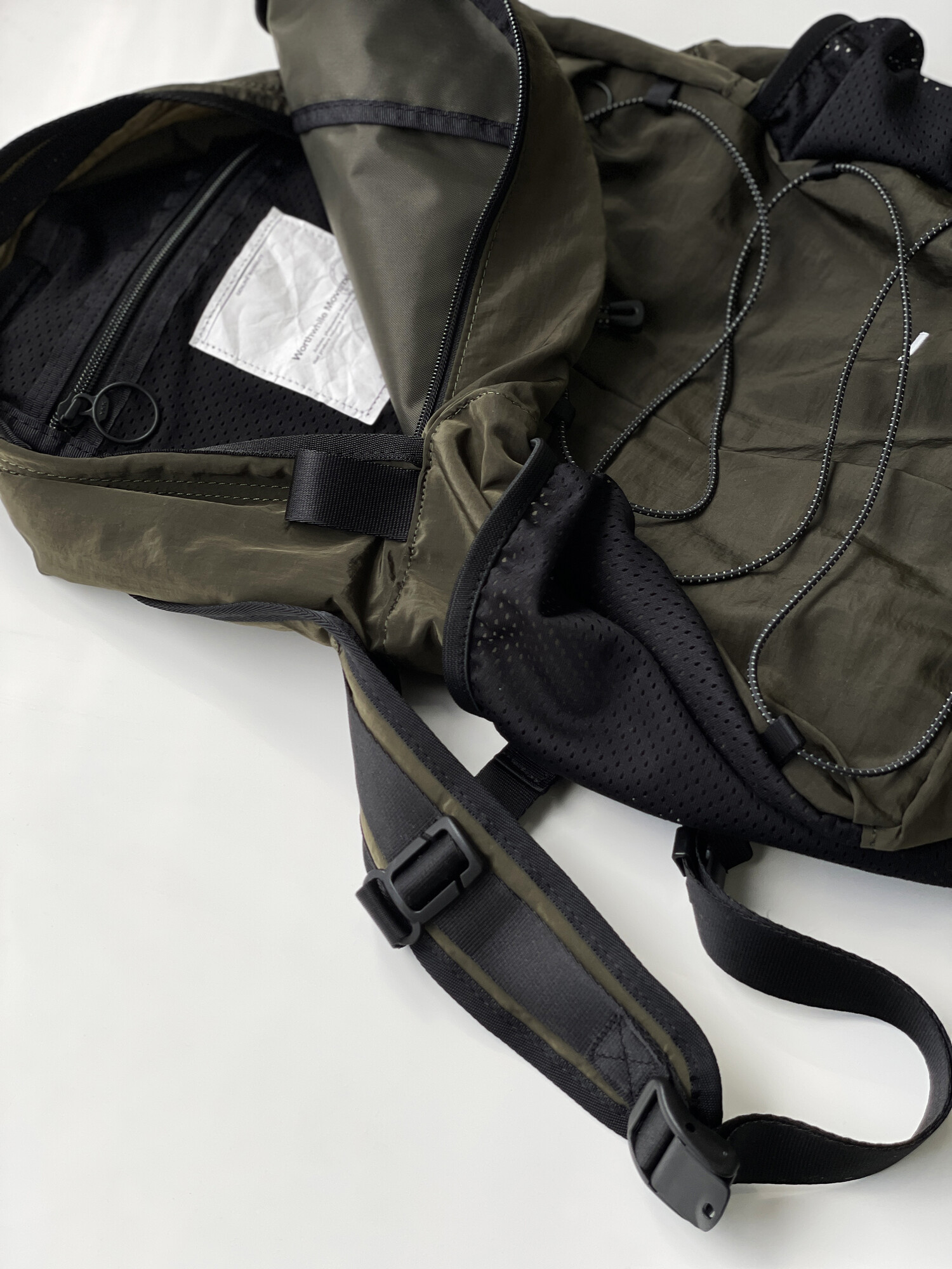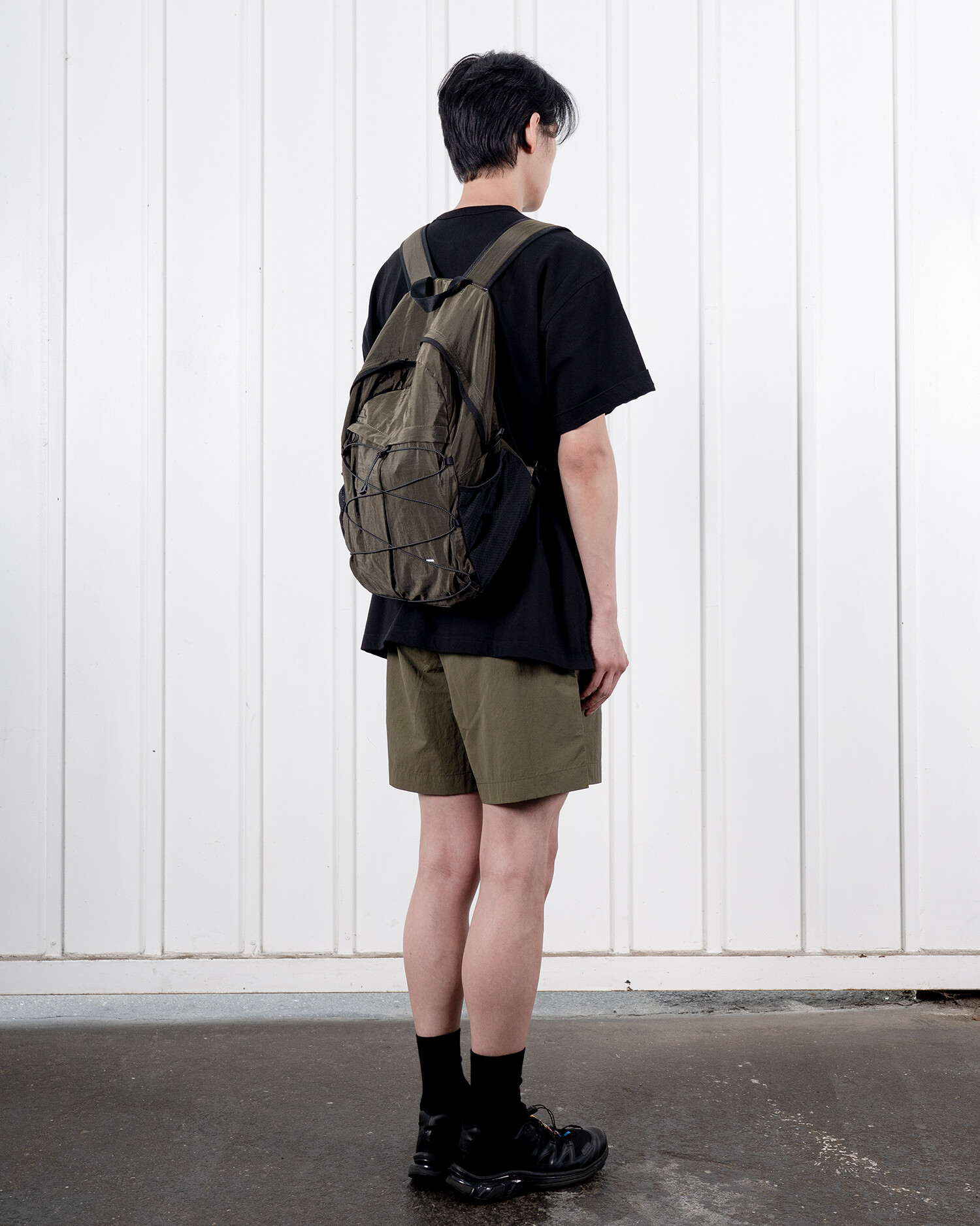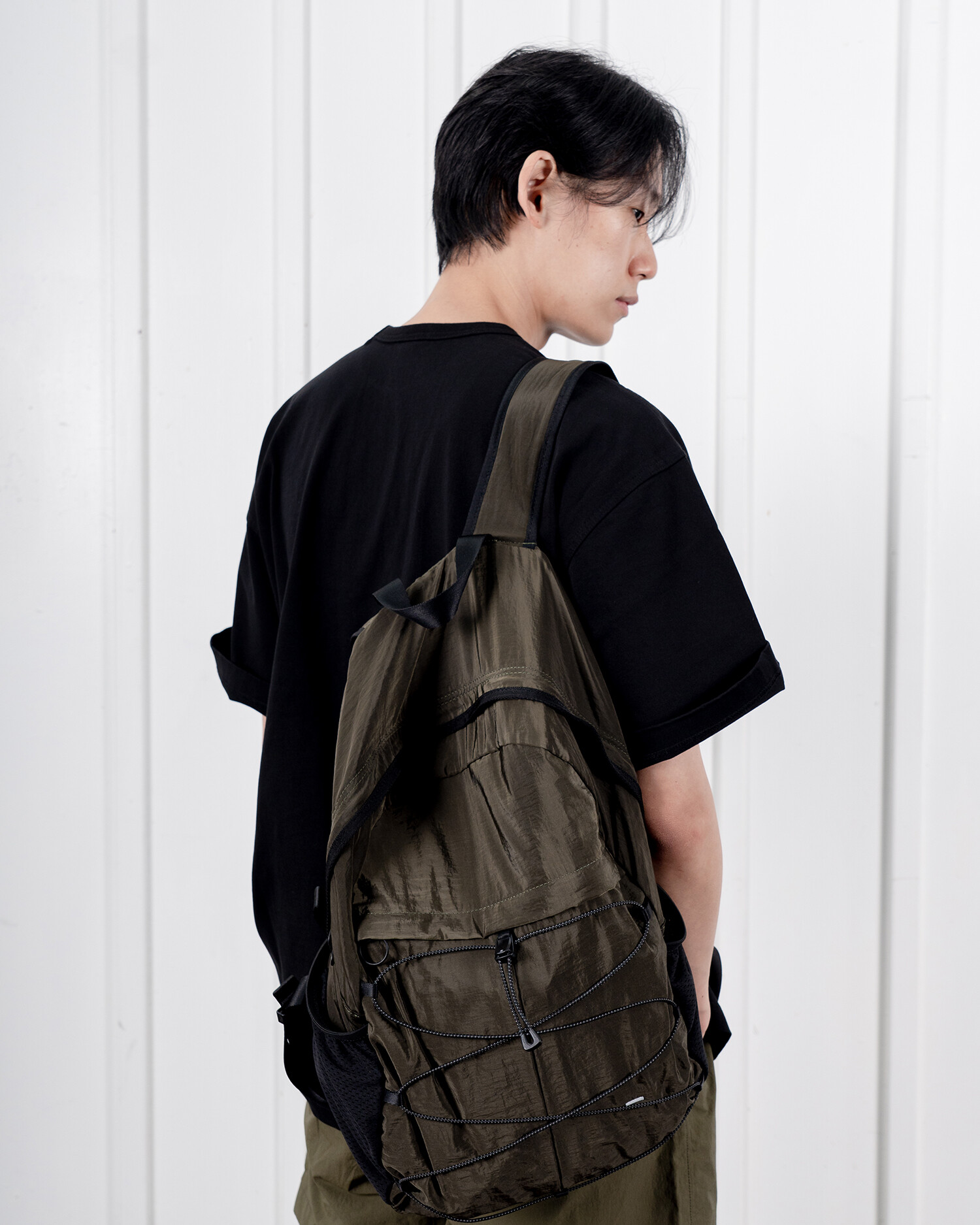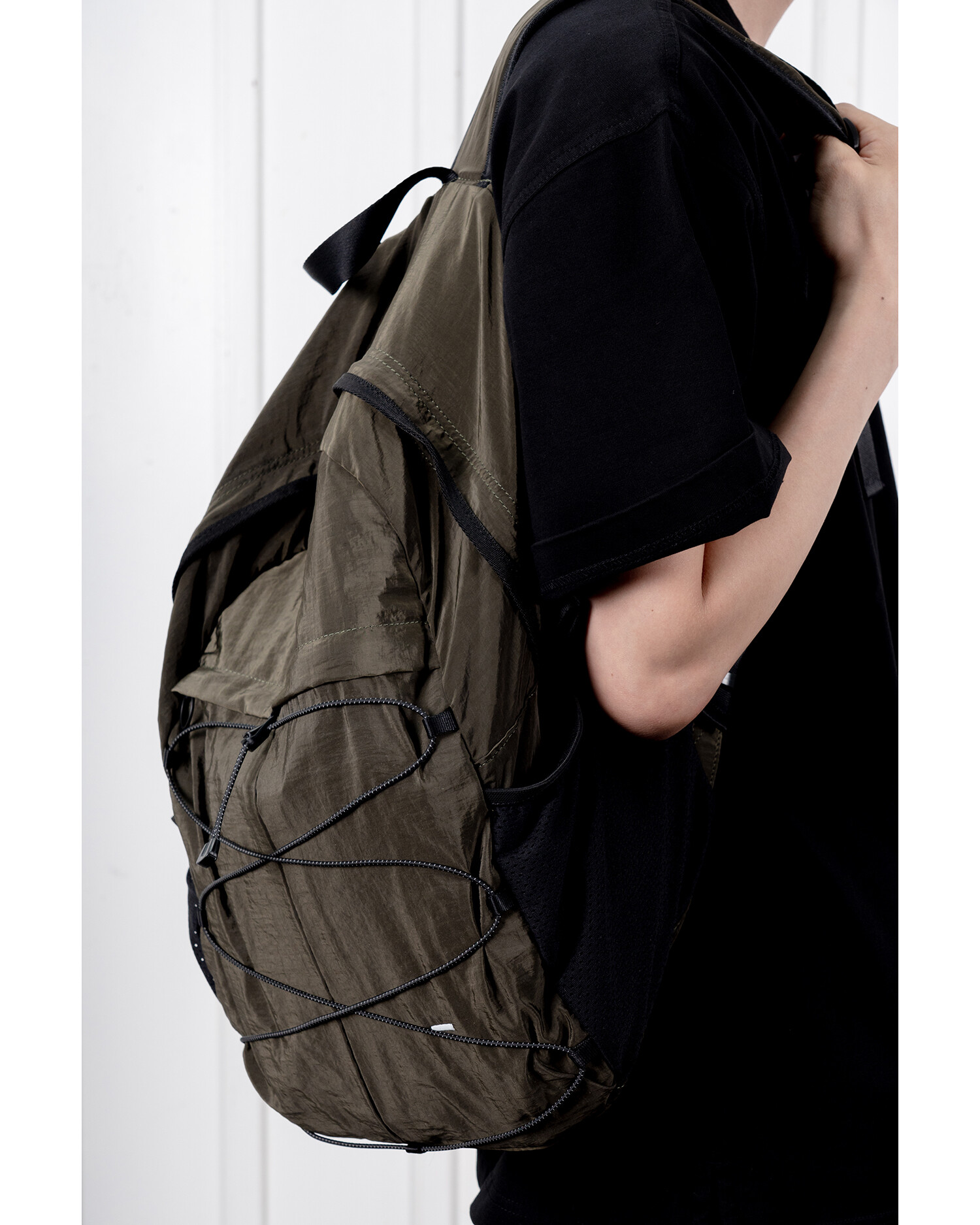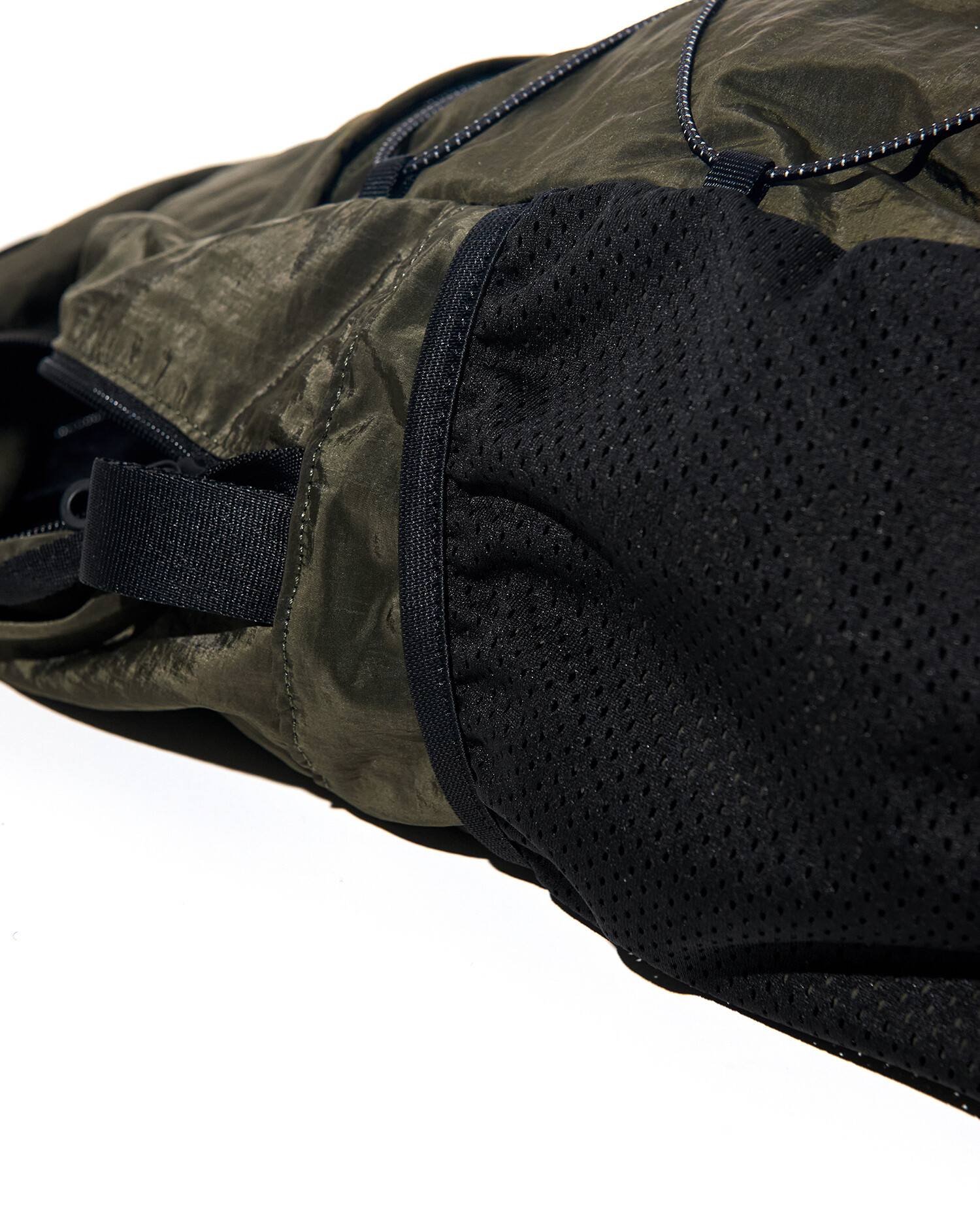 '액티비티 팩'의 메쉬 버전으로 출시된 가방입니다. 기존 제품과 다르게 양 측면 포켓과 내부 메인 포켓이 메쉬 원단으로 변경되었습니다. 각이 잡혀 있지 않고 의도적으로 흘러내리는 듯한 실루엣을 연출한 가방입니다. 등판과 포켓 부분을 제외하고 안감 및 보강재 없이 홑겹의 원단으로 제작하여 가볍고 유연한 것이 특징입니다. 가볍고 유연한 가방의 몸판 소재에 맞게 메쉬 원단 역시 부드러우며 밀도가 있는 원단을 사용했습니다. 특히 올리브 컬러는 친환경 광택 코팅 가공을 통해 은은하고 고급스러운 광택감이 느껴지며 생활 발수가 가능합니다. 이번 메쉬 버전에서는 전면부에 위치한 플리츠 분량도 조절하여 포켓을 보다 더 여유롭게 사용할 수 있도록 하였고, 잠시 벗어둔 아우터나 카라비너와 같은 악세서리 등을 걸어둘 수 있는 스트링 소재도 변경됐습니다. 일반적인 E-스트링이 아닌 재귀반사 소재의 3M 스카치 스트링을 사용하여 기능적, 디자인적으로도 퀄리티가 우수한 제품입니다.