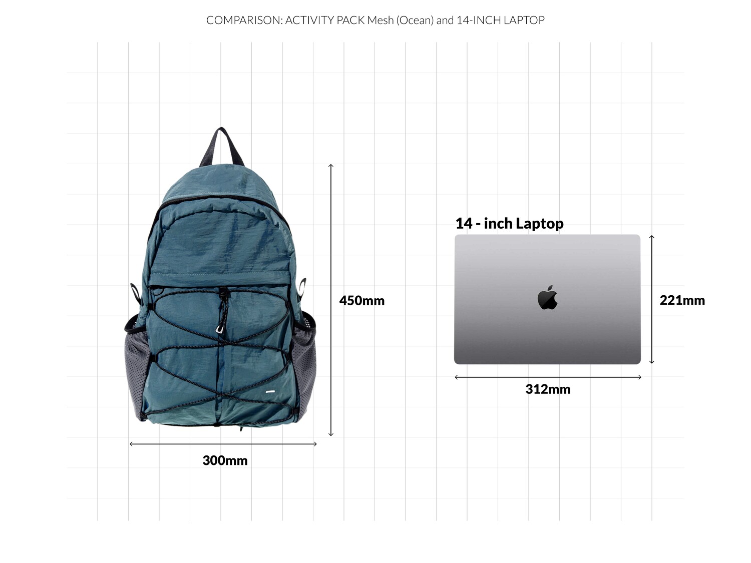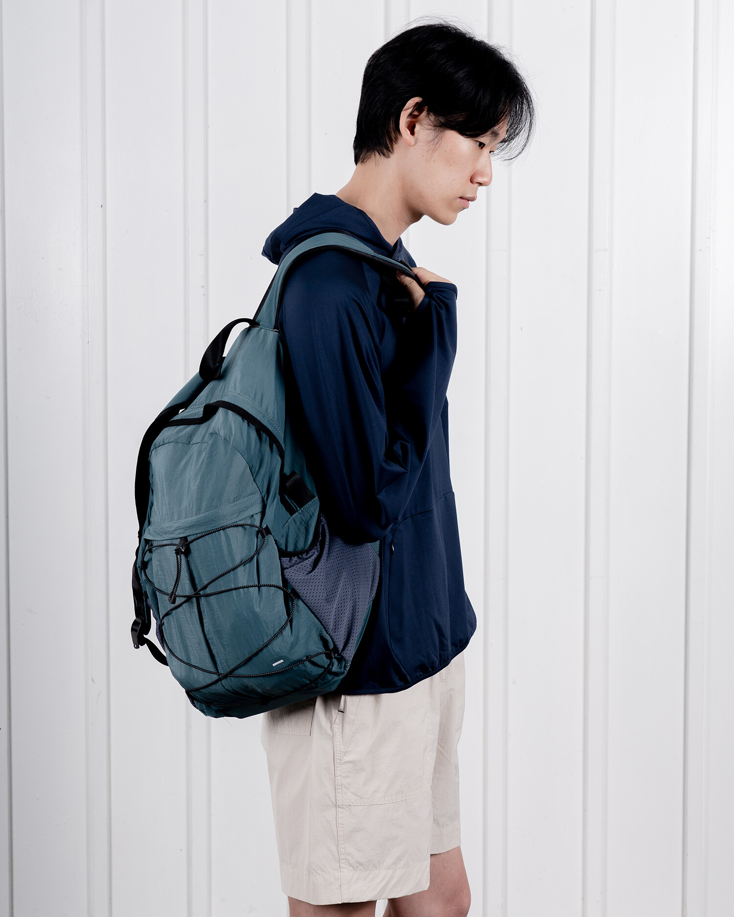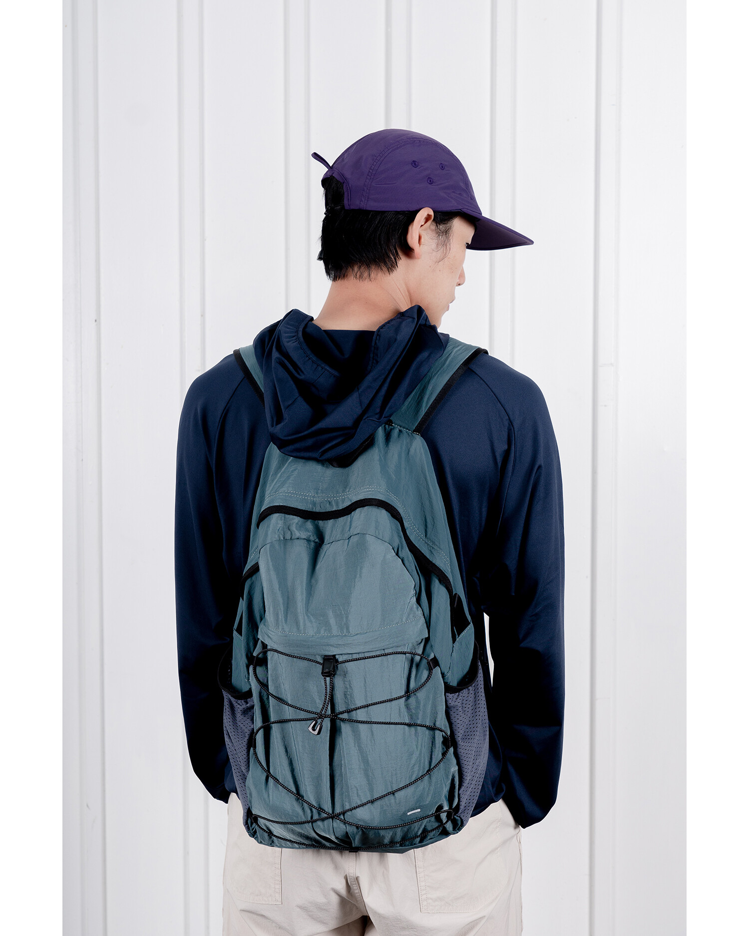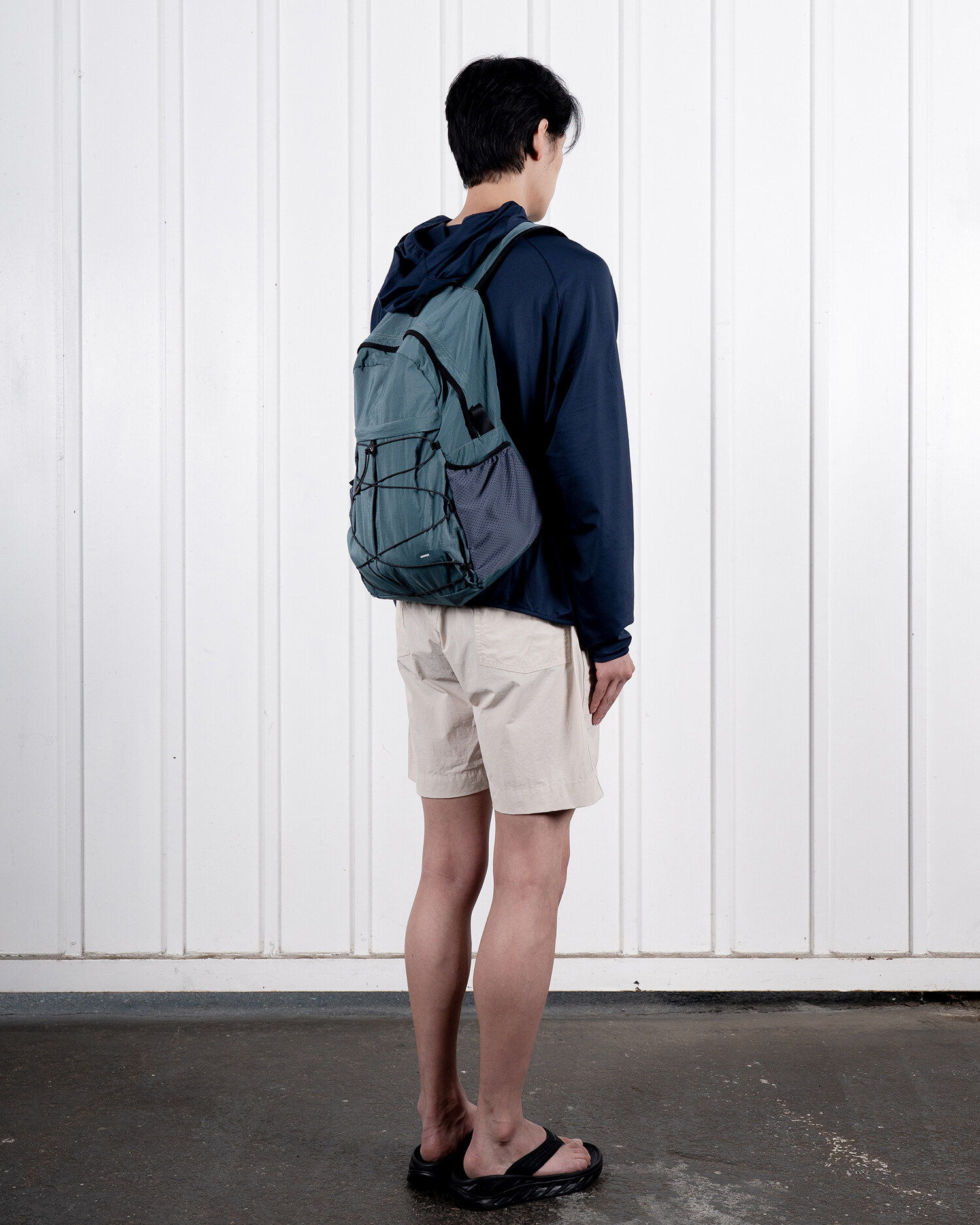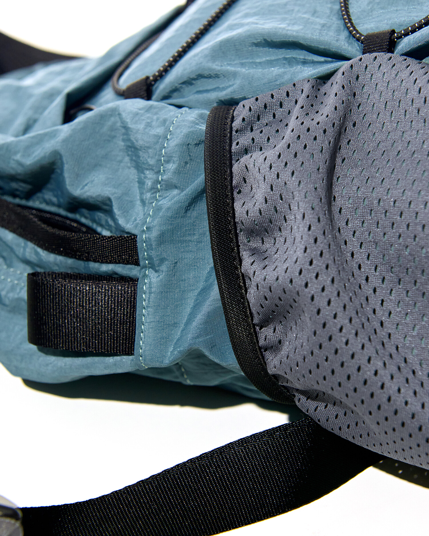 '액티비티 팩'의 메쉬 버전으로 출시된 가방입니다. 기존 제품과 다르게 양 측면 포켓과 내부 메인 포켓이 메쉬 원단으로 변경되었습니다. 각이 잡혀 있지 않고 의도적으로 흘러내리는 듯한 실루엣을 연출한 가방입니다. 등판과 포켓 부분을 제외하고 안감 및 보강재 없이 홑겹의 원단으로 제작하여 가볍고 유연한 것이 특징입니다. 가볍고 유연한 가방의 몸판 소재에 맞게 메쉬 원단 역시 부드러우며 밀도가 있는 원단을 사용했습니다. 오션 컬러는 에어 와샤 코팅을 통해 바스락 거리는 질감과 주름감이 특징입니다. 이번 메쉬 버전에서는 전면부에 위치한 플리츠 분량도 조절하여 포켓을 보다 더 여유롭게 사용할 수 있도록 하였고, 잠시 벗어둔 아우터나 카라비너와 같은 악세서리 등을 걸어둘 수 있는 스트링 소재도 변경됐습니다. 일반적인 E-스트링이 아닌 재귀반사 소재의 3M 스카치 스트링을 사용하여 기능적, 디자인적으로도 퀄리티가 우수한 제품입니다.