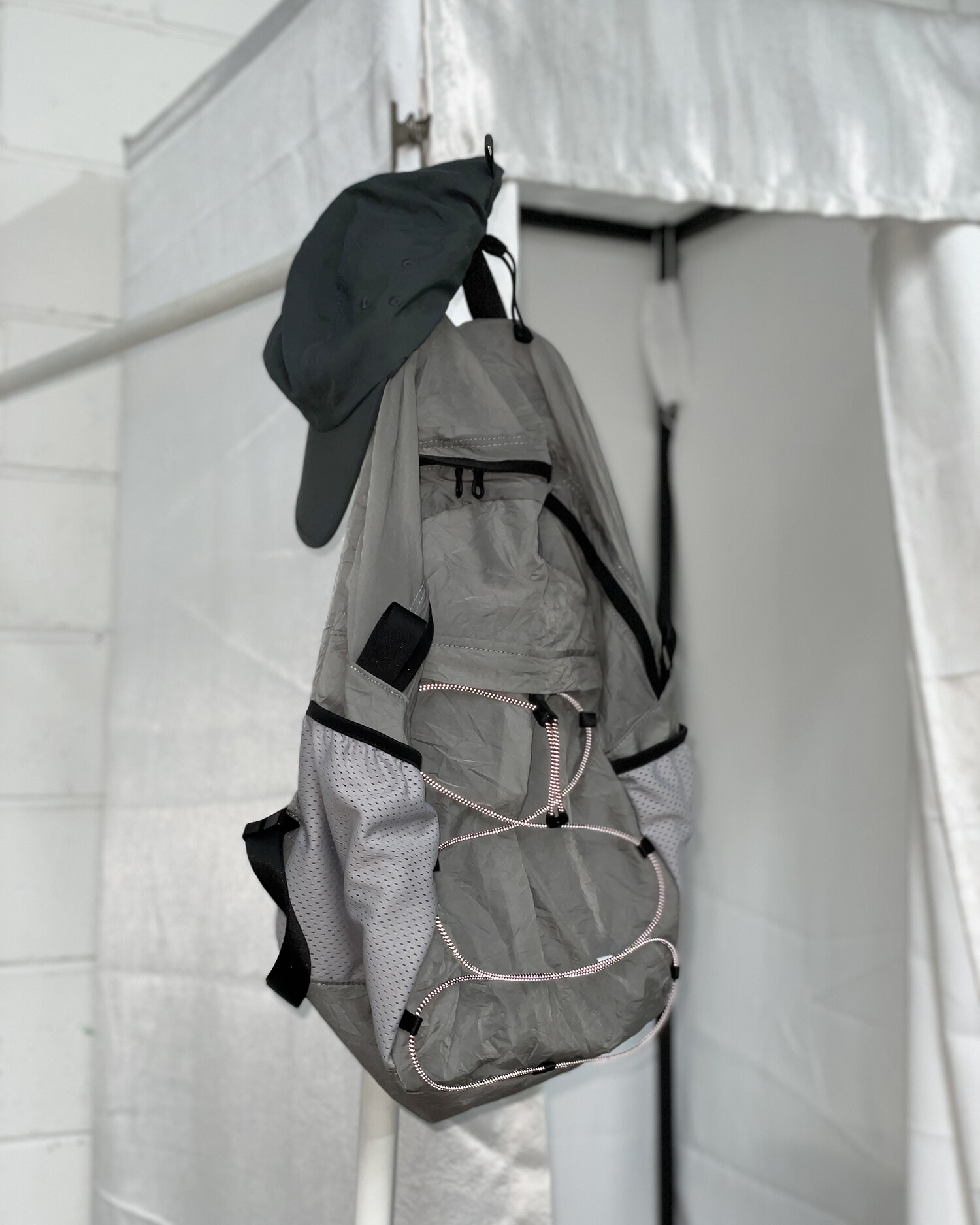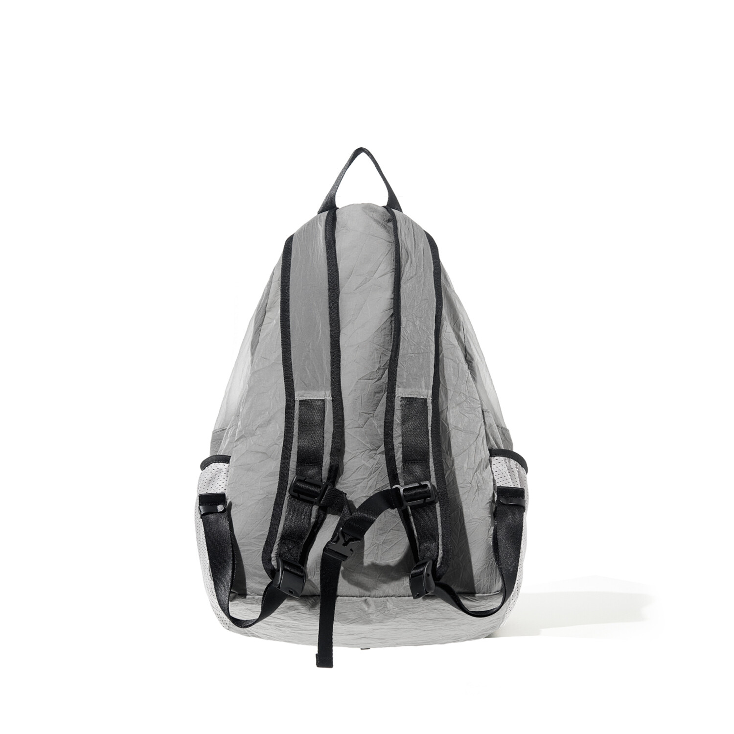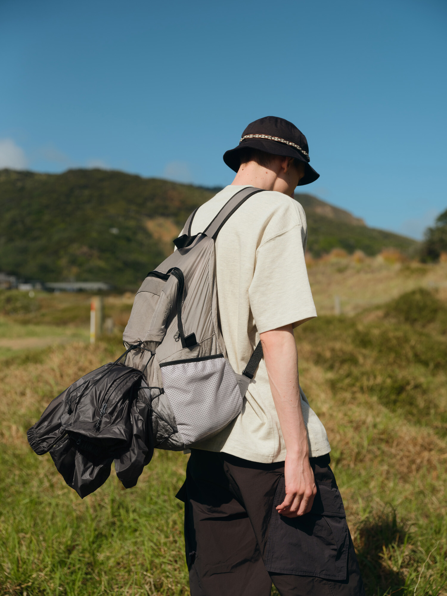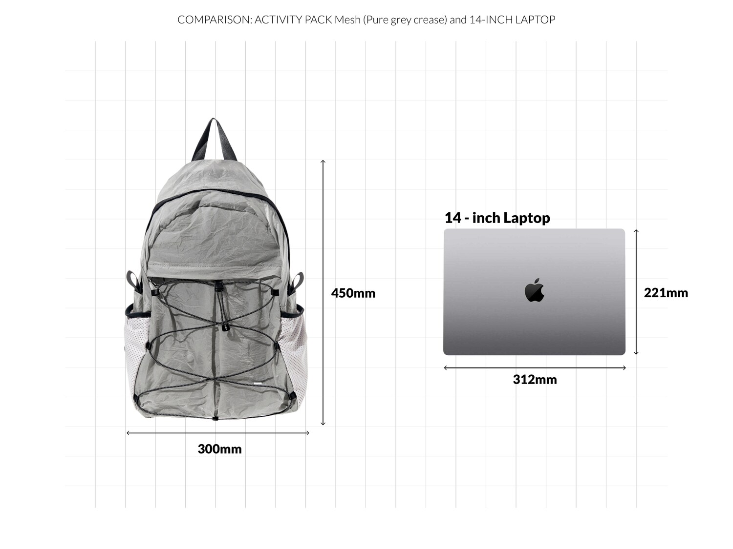 '액티비티 팩'의 메쉬 버전으로 출시된 가방입니다. 기존 제품과 다르게 양 측면 포켓과 내부 메인 포켓이 메쉬 원단으로 변경되었습니다. 각이 잡혀 있지 않고 의도적으로 흘러내리는 듯한 실루엣을 연출한 가방입니다. 등판과 포켓 부분을 제외하고 안감 및 보강재 없이 홑겹의 원단으로 제작하여 가볍고 유연한 것이 특징입니다. 가볍고 유연한 가방의 몸판 소재에 맞게 메쉬 원단 역시 부드러우며 밀도가 있는 원단을 사용했습니다. 퓨어 그레이 크리즈 컬러는 초경량 고밀도 나일론에 크리즈 가공을 통해 눈에 띄고 큼지막한 주름이 큰 특징입니다. 얇은 소재이기 때문에 굉장히 가볍고 특히 안감이 없는 부분은 내부가 비치고 소지품이 보이는 재미가 있습니다. 반면에 고밀도의 제품이기 때문에 내구성 또한 좋은편입니다. 다만 발수가 되는 제품이 아니기 때문에 비가 오거나 물에 젖을 수 있는 환경에서는 사용에 유의하시기 바랍니다.