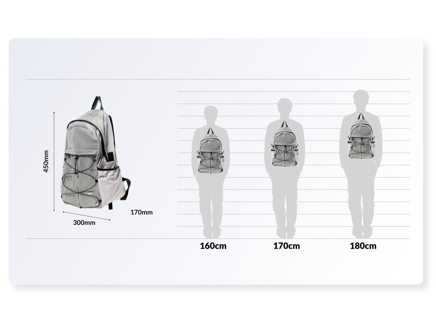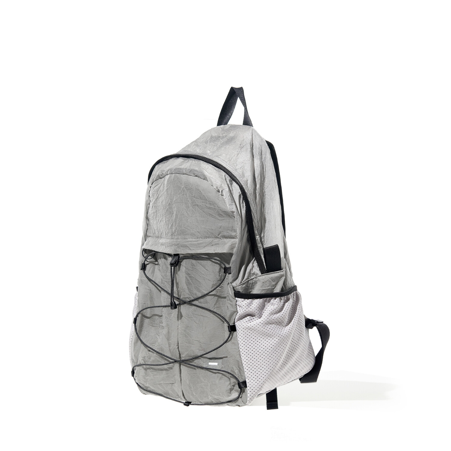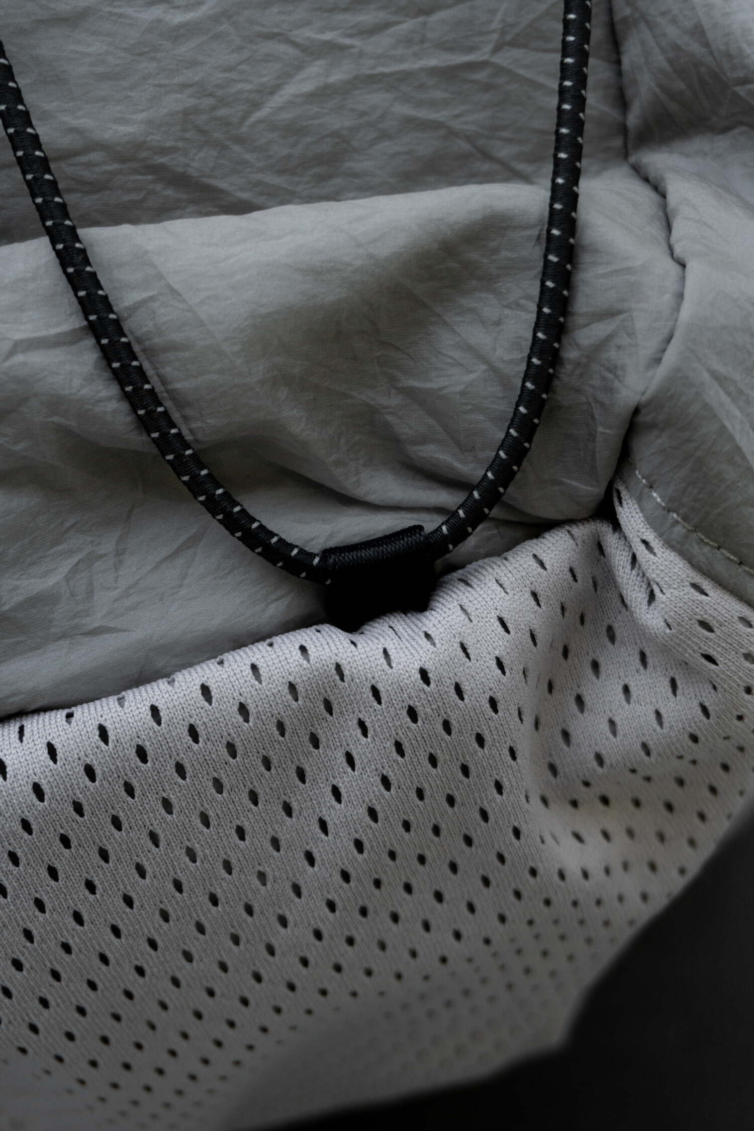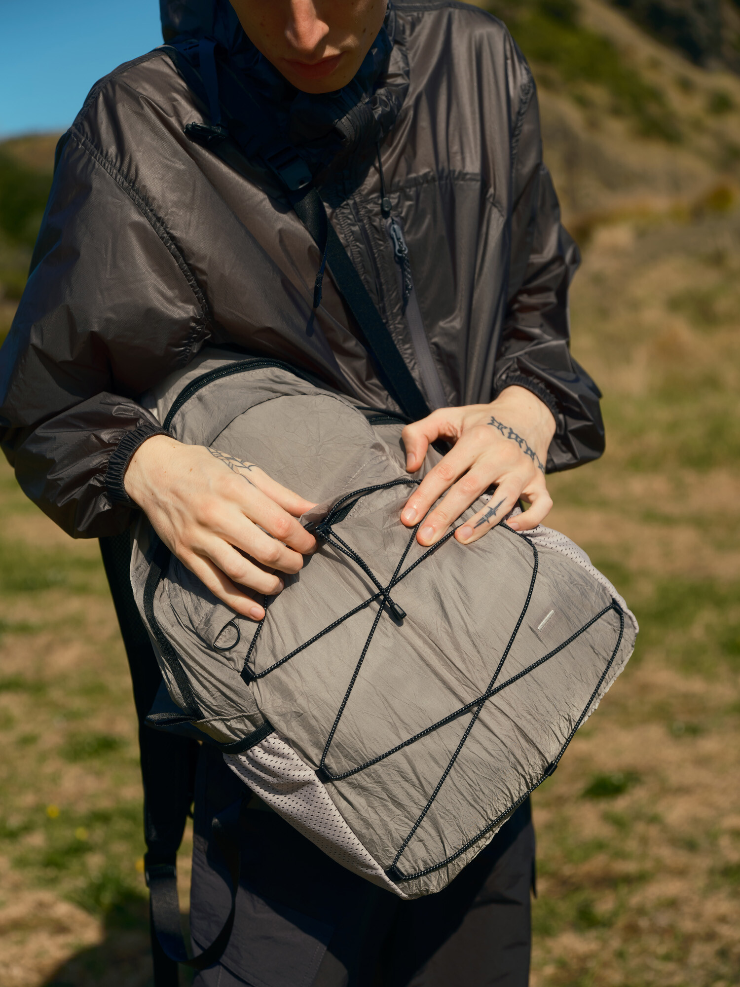 '액티비티 팩'의 메쉬 버전으로 출시된 가방입니다. 기존 제품과 다르게 양 측면 포켓과 내부 메인 포켓이 메쉬 원단으로 변경되었습니다. 각이 잡혀 있지 않고 의도적으로 흘러내리는 듯한 실루엣을 연출한 가방입니다. 등판과 포켓 부분을 제외하고 안감 및 보강재 없이 홑겹의 원단으로 제작하여 가볍고 유연한 것이 특징입니다. 가볍고 유연한 가방의 몸판 소재에 맞게 메쉬 원단 역시 부드러우며 밀도가 있는 원단을 사용했습니다. 퓨어 그레이 크리즈 컬러는 초경량 고밀도 나일론에 크리즈 가공을 통해 눈에 띄고 큼지막한 주름이 큰 특징입니다. 얇은 소재이기 때문에 굉장히 가볍고 특히 안감이 없는 부분은 내부가 비치고 소지품이 보이는 재미가 있습니다. 반면에 고밀도의 제품이기 때문에 내구성 또한 좋은편입니다. 다만 발수가 되는 제품이 아니기 때문에 비가 오거나 물에 젖을 수 있는 환경에서는 사용에 유의하시기 바랍니다.