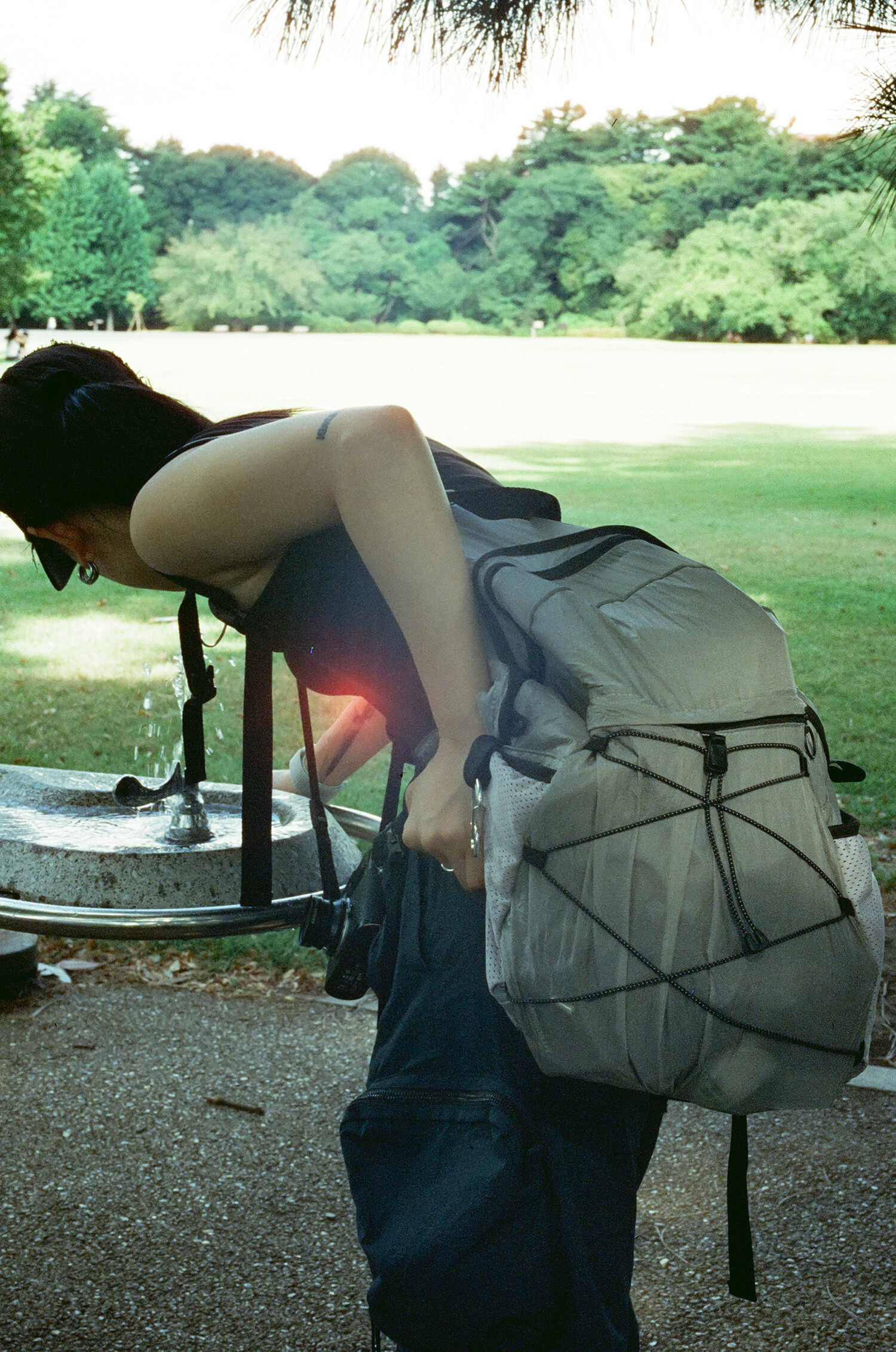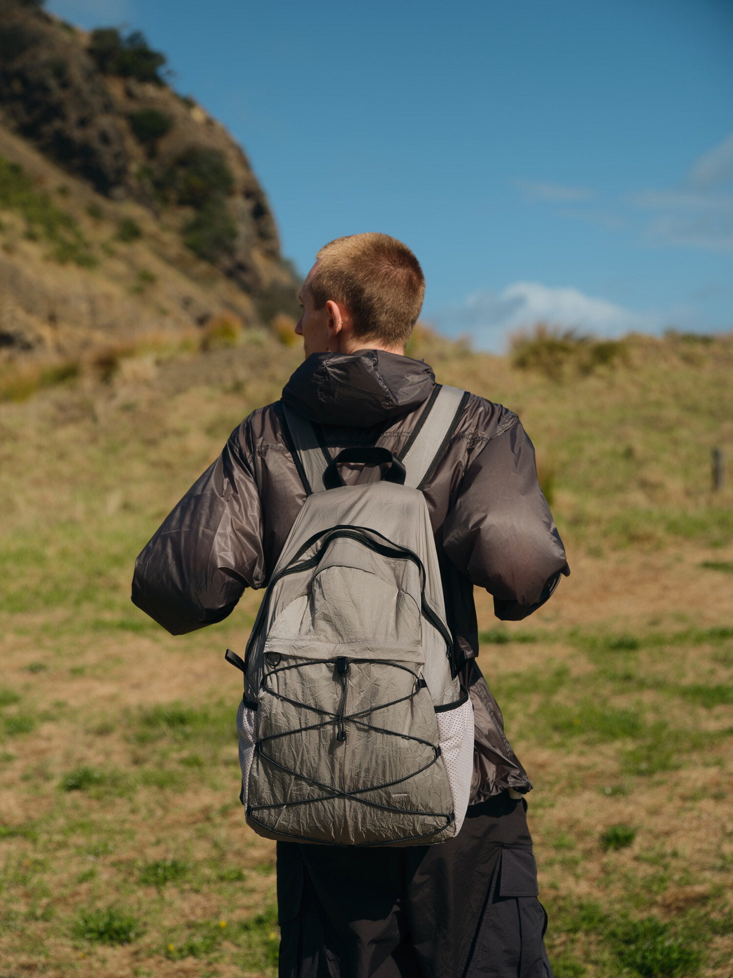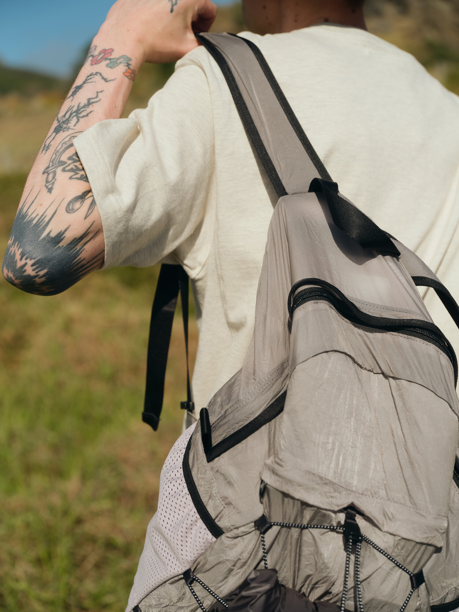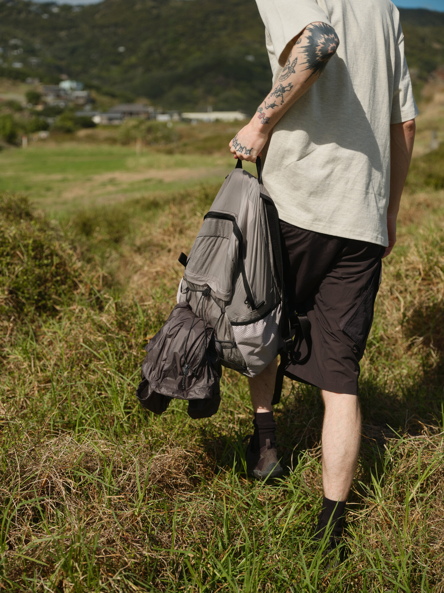 '액티비티 팩'의 메쉬 버전으로 출시된 가방입니다. 기존 제품과 다르게 양 측면 포켓과 내부 메인 포켓이 메쉬 원단으로 변경되었습니다. 각이 잡혀 있지 않고 의도적으로 흘러내리는 듯한 실루엣을 연출한 가방입니다. 등판과 포켓 부분을 제외하고 안감 및 보강재 없이 홑겹의 원단으로 제작하여 가볍고 유연한 것이 특징입니다. 가볍고 유연한 가방의 몸판 소재에 맞게 메쉬 원단 역시 부드러우며 밀도가 있는 원단을 사용했습니다. 퓨어 그레이 크리즈 컬러는 초경량 고밀도 나일론에 크리즈 가공을 통해 눈에 띄고 큼지막한 주름이 큰 특징입니다. 얇은 소재이기 때문에 굉장히 가볍고 특히 안감이 없는 부분은 내부가 비치고 소지품이 보이는 재미가 있습니다. 반면에 고밀도의 제품이기 때문에 내구성 또한 좋은편입니다. 다만 발수가 되는 제품이 아니기 때문에 비가 오거나 물에 젖을 수 있는 환경에서는 사용에 유의하시기 바랍니다.