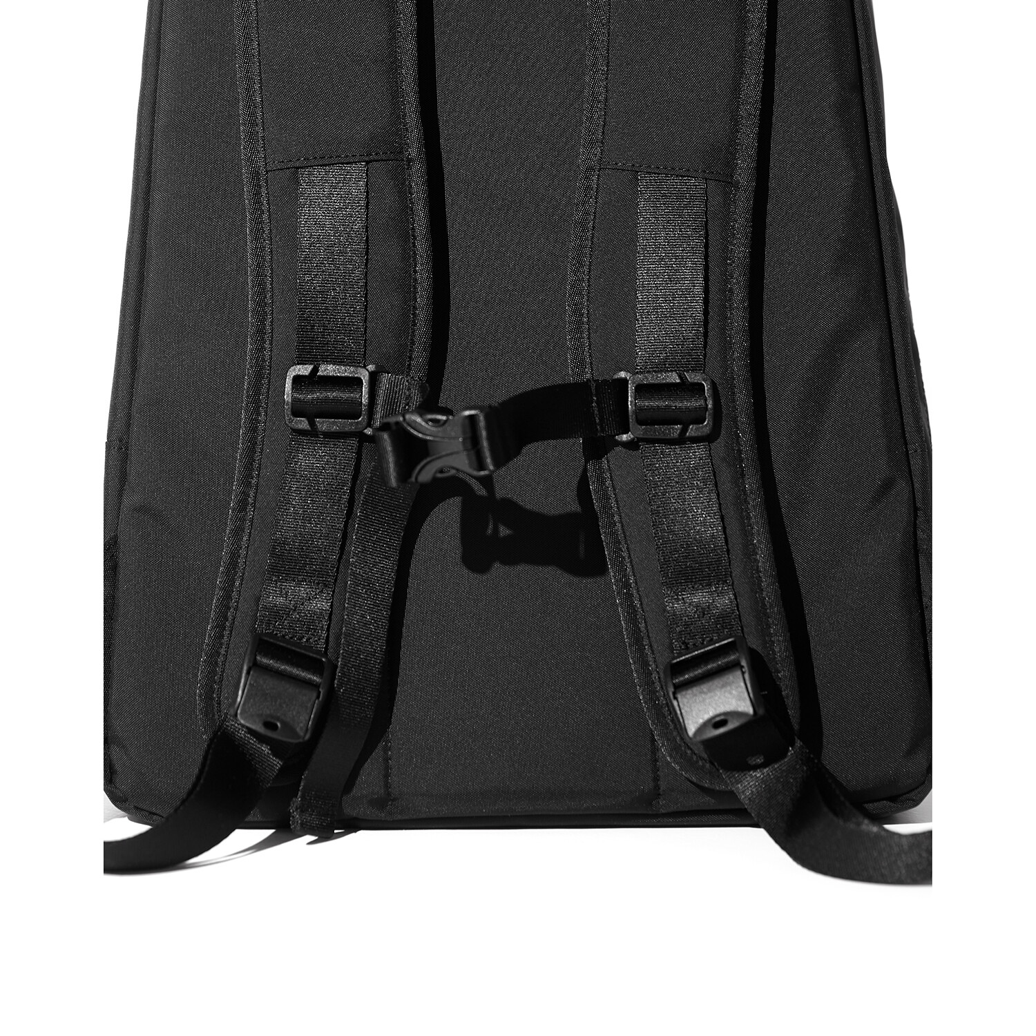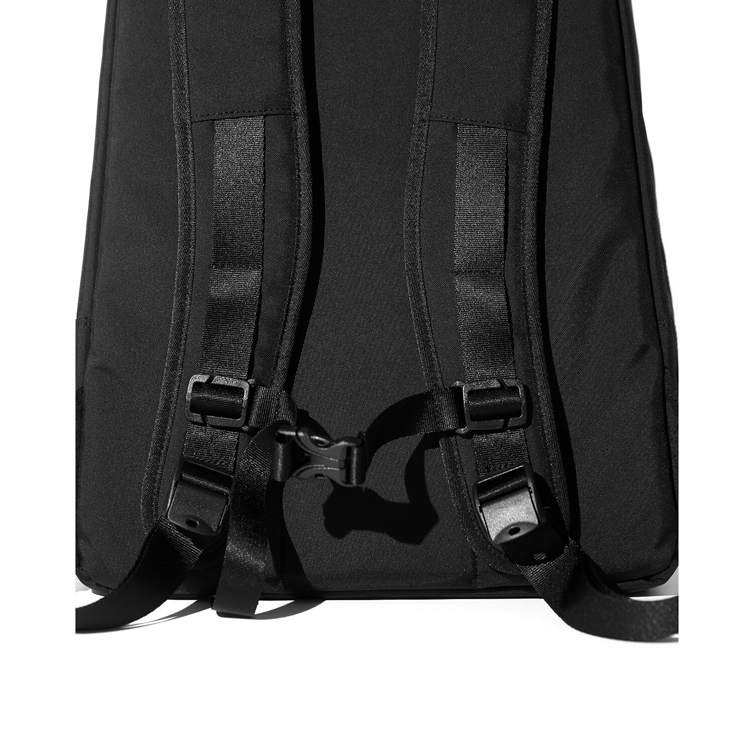 인체 공학적으로 만들어진 숄더 스트랩은 앞쪽으로 라운드된 평균적인 어깨 모양에 맞춰서 편안하게 몸을 감싸고 체스트 버클을 체결하여 좀 더 단단하게 고정할 수 있습니다. 체스트 버클은 양쪽 숄더 스트랩에 스터넘 시스템(STERNUM SYSTEM)의 오픈 TQ 파츠를 사용하여 간편하게 탈부착이 가능하기 때문에 필요할 경우 제거하고 사용하실 수도 있습니다. 바닥면은 평평하지 않고 의도적으로 아래쪽을 향해 기울어진 형태로 제작했는데 이는 백팩을 착용했을 때 내부의 짐이 등(사용자의 몸) 쪽으로 쏠리게 하는 역할을 합니다. 짐이 바깥쪽으로 쳐지지 않고 하중을 몸쪽으로 집중시켜 전체적인 피로도나 부담감을 줄여주는 역할을 합니다.