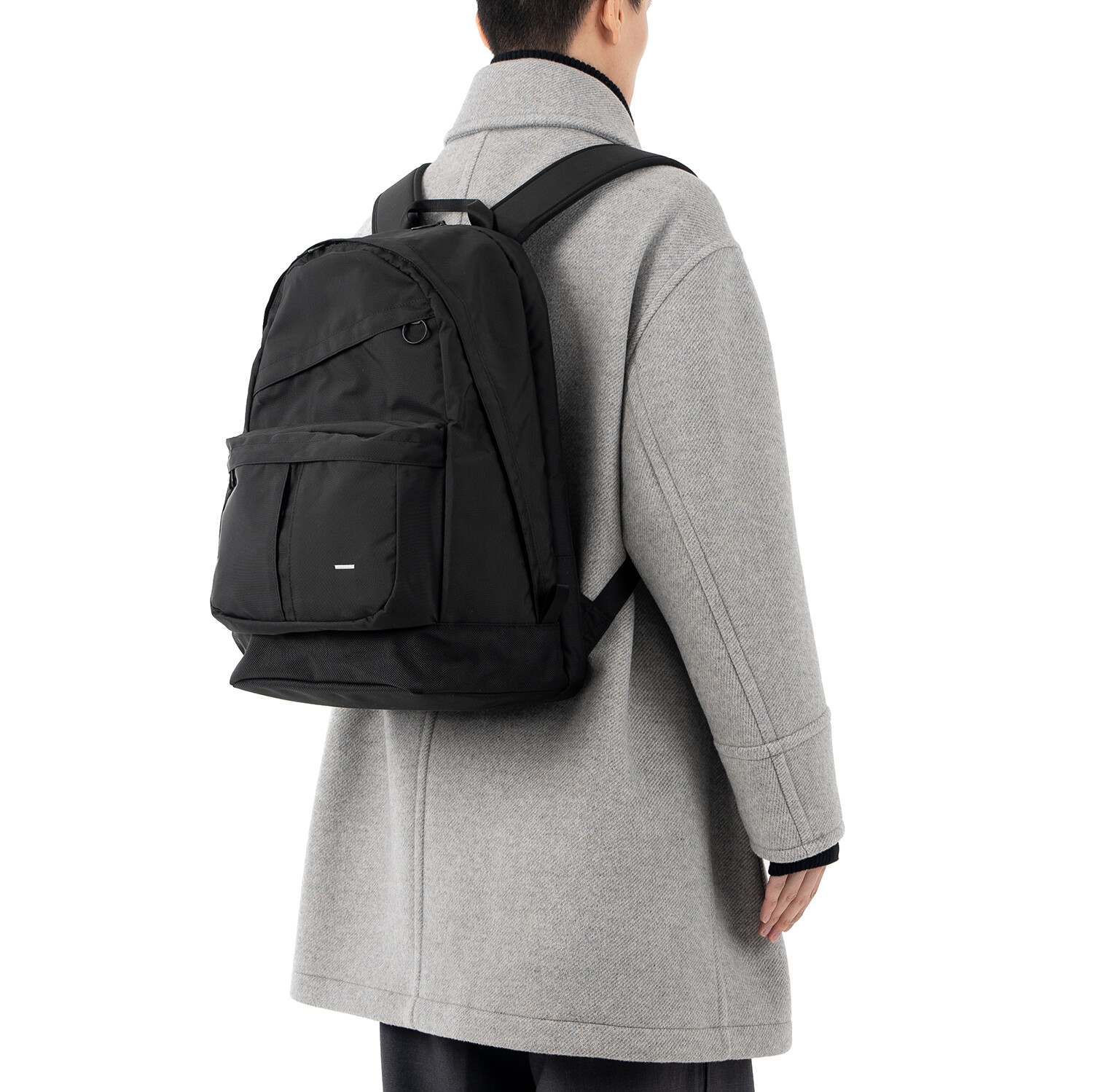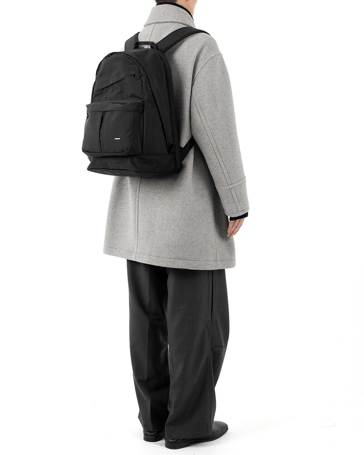 가장 큰 디자인적 특징은 전면에 위치한 입체적인 포켓입니다. 많은 백팩에서 볼 수 있는 다트를 잡은 원 포켓도, 2개의 아웃 포켓도 아닌 독특한 형태를 갖고 있습니다. 겉으로 보기에 하나의 포켓같지만 카드지갑이나 립밤, 키링 등을 보관할 수 있는 히든 포켓이 양쪽에 위치해있습니다. 숨겨져 있는 지금의 구조를 만들기 위해 여러번의 패턴 수정을 거쳐 가장 정갈하면서도 기능적인 형태를 구현했습니다.