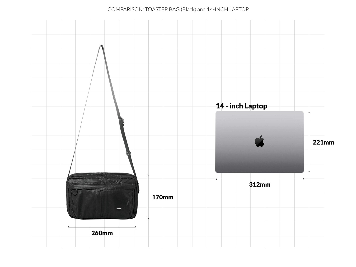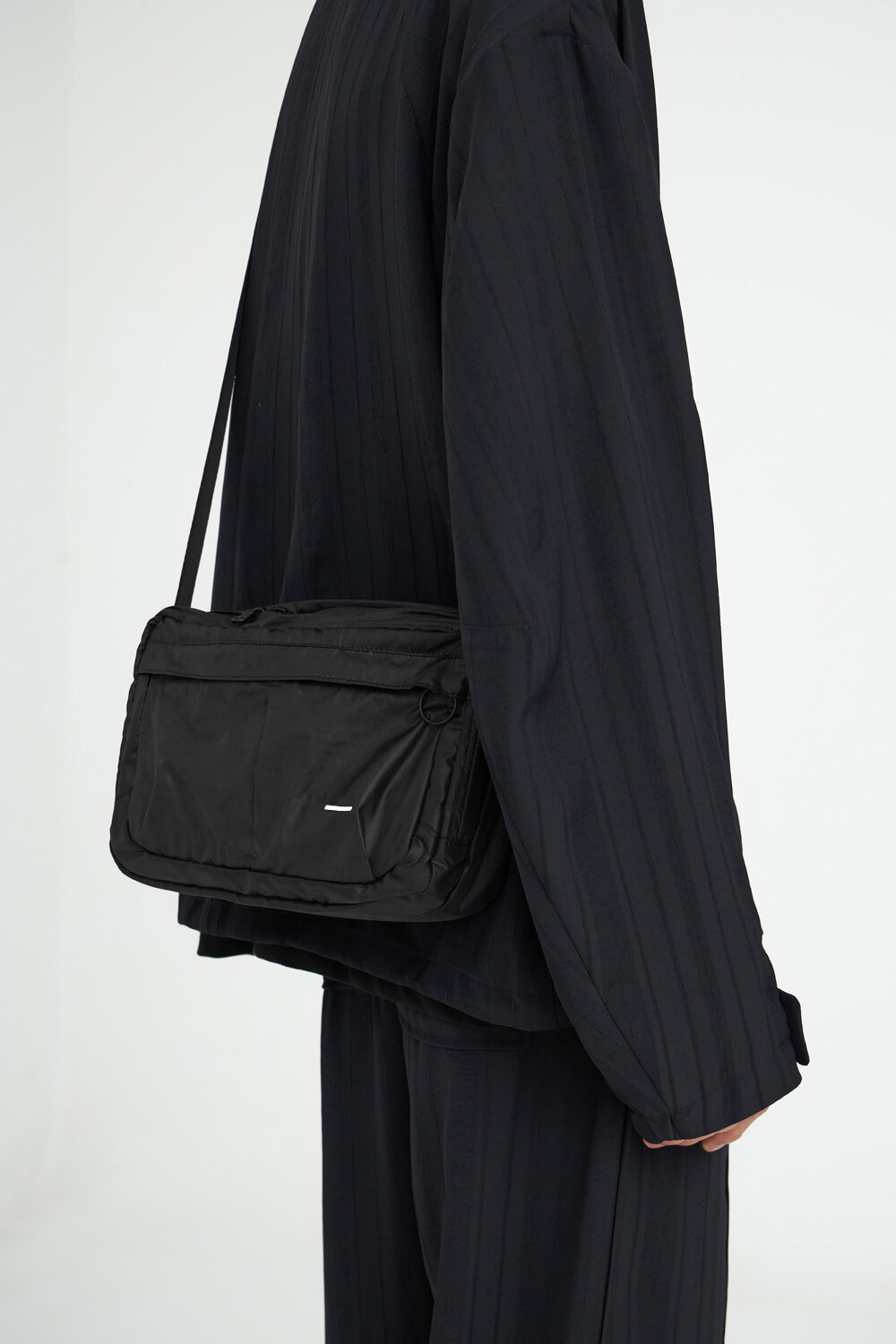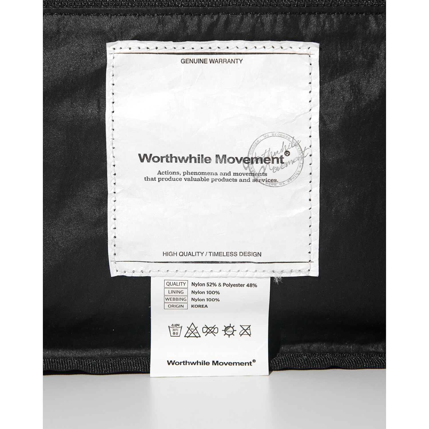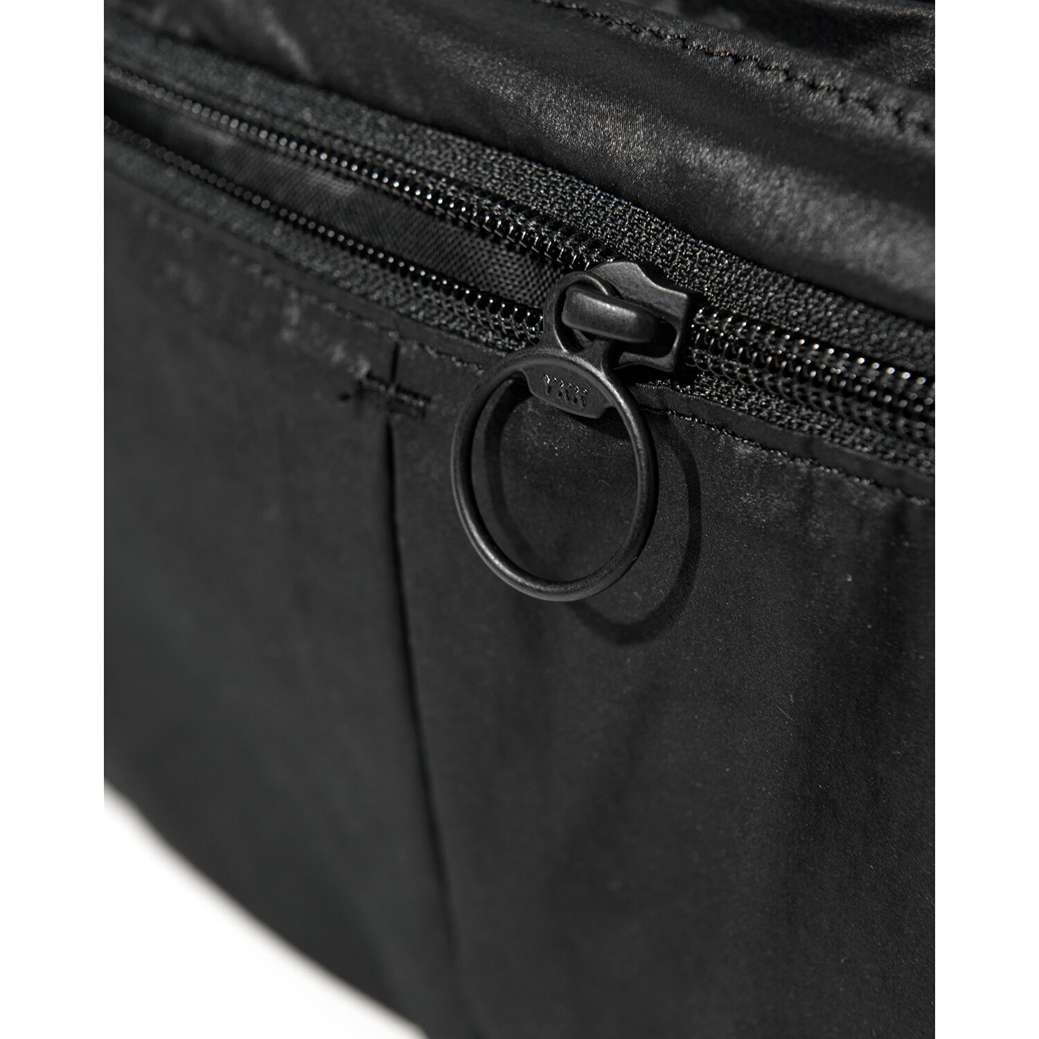 ‘토스터 백’은 용량 약 3.5L의 적당한 사이즈를 갖고 있습니다. 가로로 긴 직사각형 모양이지만 하단부에는 완만한 곡선을 만들어 편하고 부담 없이 착용하시기 좋은 형태 및 사이즈로 만들었습니다. 토스터 백의 구조는 중앙의 칸막이를 기준으로 크게 2개로 나누어져 있는데 앞 공간의 개폐 범위를 의도적으로 굉장히 넓게 만들어서 메인 지퍼를 모두 오픈하면 마치 토스터의 입구를 연듯한 형상을 확인하실 수 있습니다. 이때, 내부 소지품의 이탈을 방지하기 위해 양측면에는 폴딩 되는 파티션을 배치하여 안정감 있는 형태를 유지합니다. 가장 큰 외형적 특징은 두 가지로, 깔끔한 인상을 위해 입술 원단으로 지퍼를 가려준 것과 전면부에서 확인할 수 있는 입체적인 포켓입니다. 특히 포켓 중앙과 좌, 우 하단에 잡혀있는 플리츠 그리고 절개가 들어간 포켓의 옆면이 입체적인 구조를 만들어주며 실용적인 수납력을 보여줍니다. 앞, 뒤 공간 내부에는 모두 작은 소지품들은 수납할 수 있도록 다양한 포켓이 배치되어 있으며 가방의 후면부에도 PU 코팅 처리된 지퍼를 활용한 포켓이 있습니다.