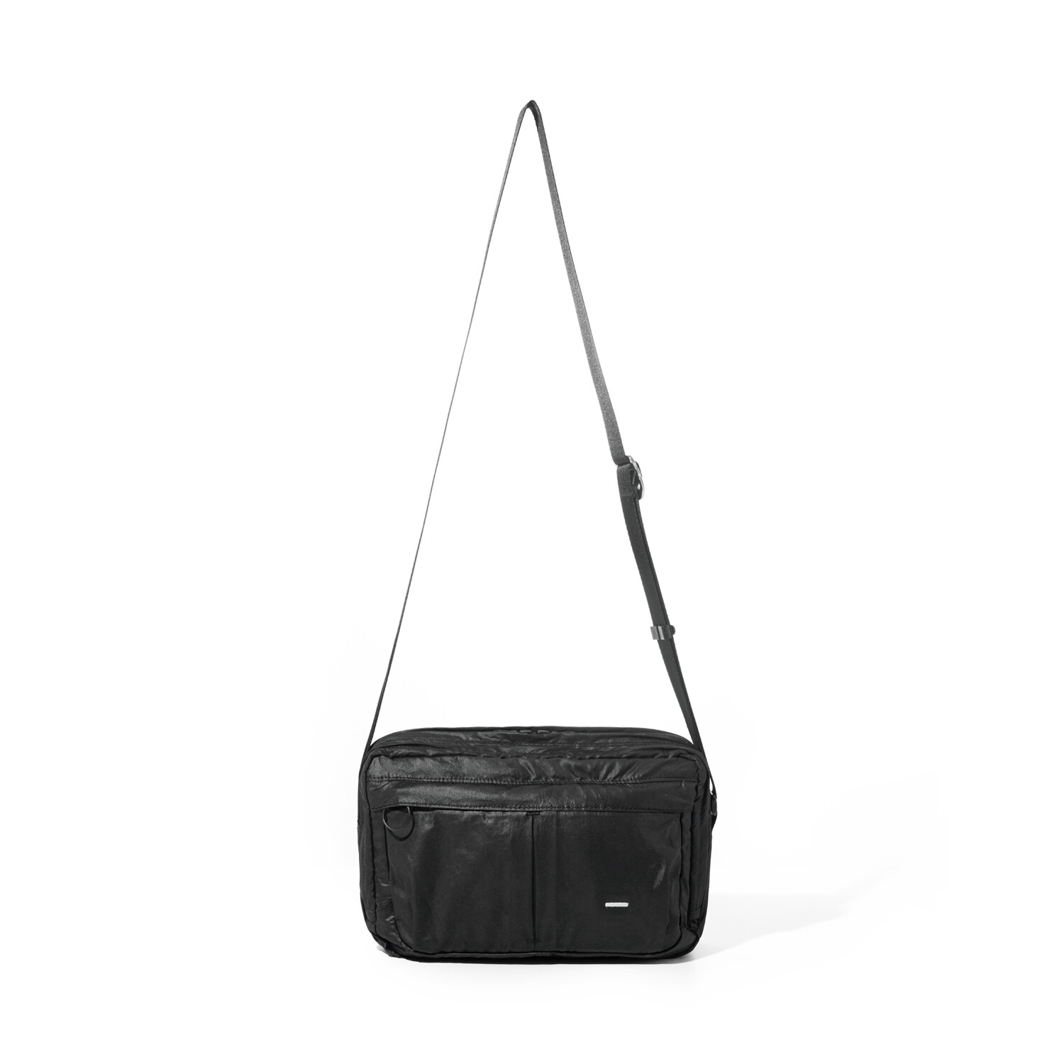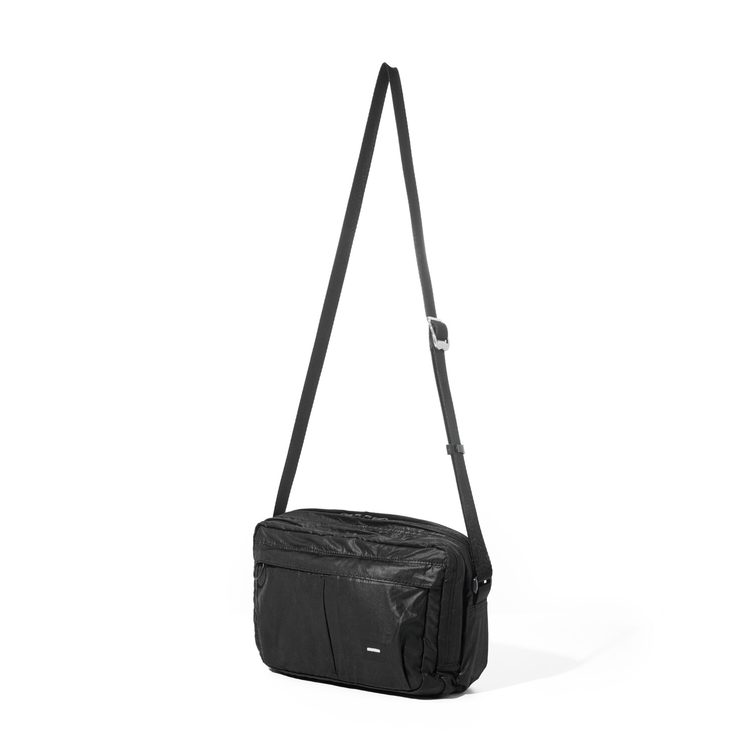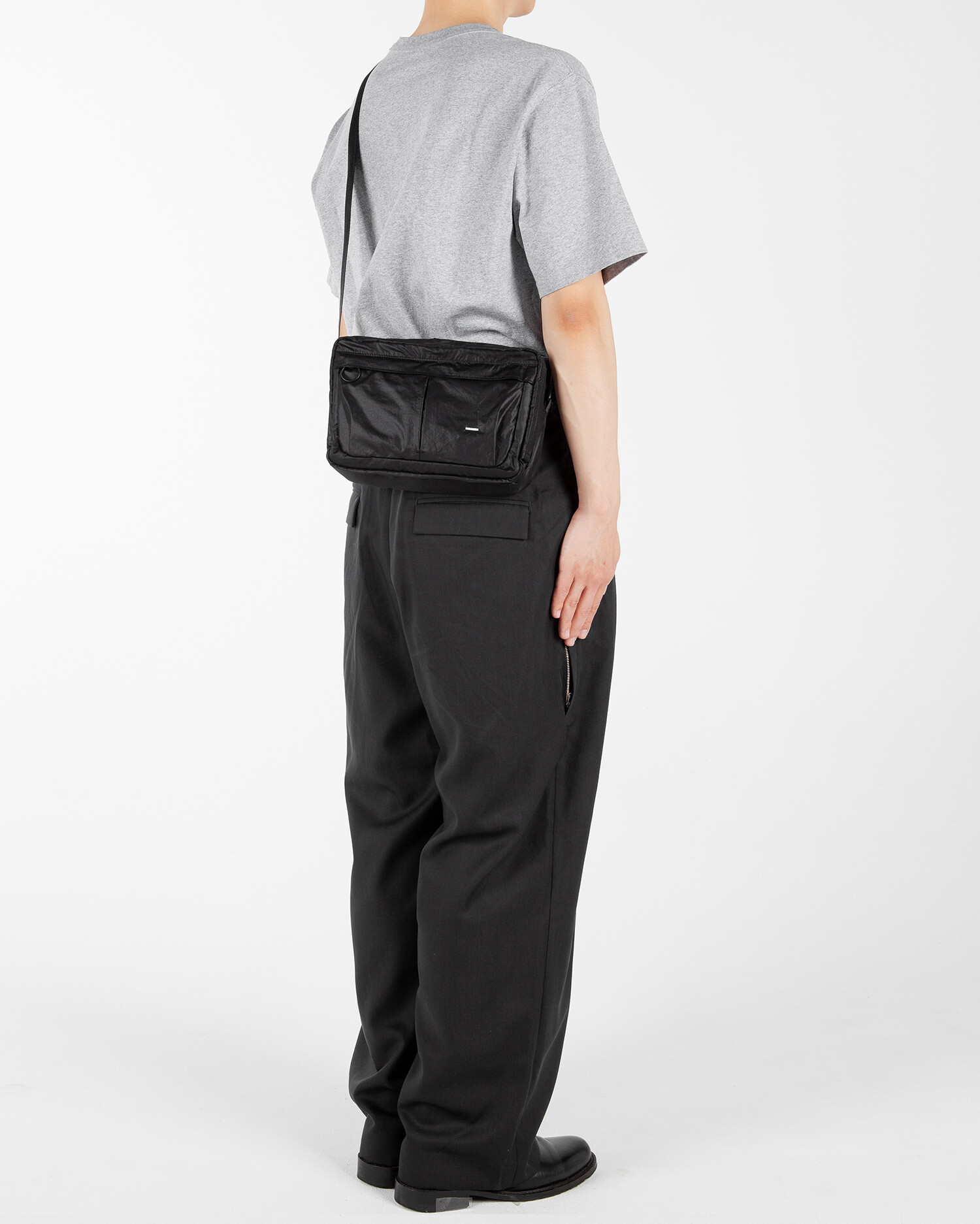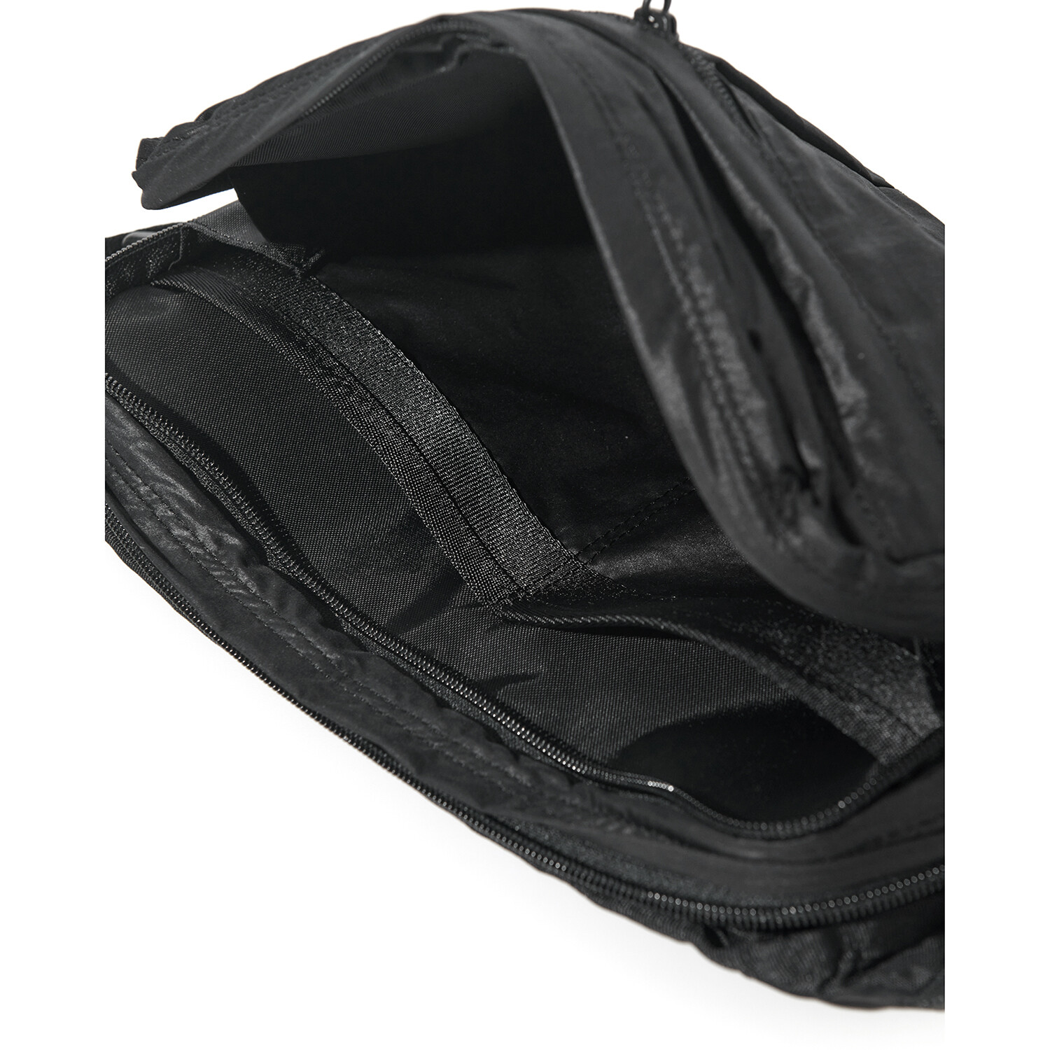 ‘토스터 백’은 용량 약 3.5L의 적당한 사이즈를 갖고 있습니다. 가로로 긴 직사각형 모양이지만 하단부에는 완만한 곡선을 만들어 편하고 부담 없이 착용하시기 좋은 형태 및 사이즈로 만들었습니다. 토스터 백의 구조는 중앙의 칸막이를 기준으로 크게 2개로 나누어져 있는데 앞 공간의 개폐 범위를 의도적으로 굉장히 넓게 만들어서 메인 지퍼를 모두 오픈하면 마치 토스터의 입구를 연듯한 형상을 확인하실 수 있습니다. 이때, 내부 소지품의 이탈을 방지하기 위해 양측면에는 폴딩 되는 파티션을 배치하여 안정감 있는 형태를 유지합니다. 가장 큰 외형적 특징은 두 가지로, 깔끔한 인상을 위해 입술 원단으로 지퍼를 가려준 것과 전면부에서 확인할 수 있는 입체적인 포켓입니다. 특히 포켓 중앙과 좌, 우 하단에 잡혀있는 플리츠 그리고 절개가 들어간 포켓의 옆면이 입체적인 구조를 만들어주며 실용적인 수납력을 보여줍니다. 앞, 뒤 공간 내부에는 모두 작은 소지품들은 수납할 수 있도록 다양한 포켓이 배치되어 있으며 가방의 후면부에도 PU 코팅 처리된 지퍼를 활용한 포켓이 있습니다.