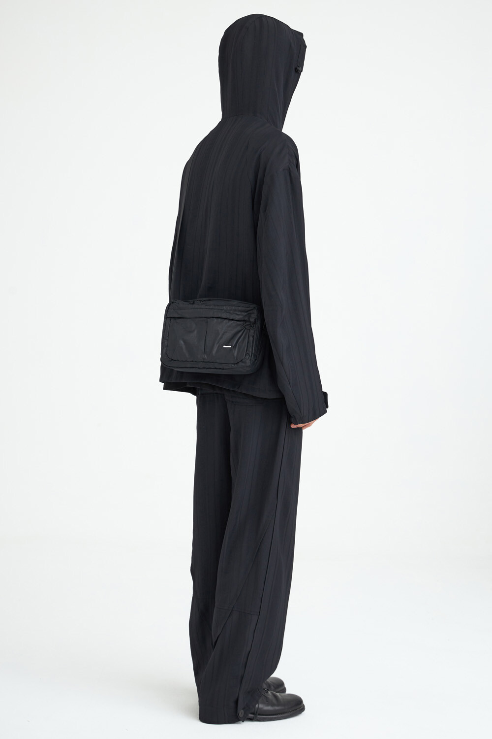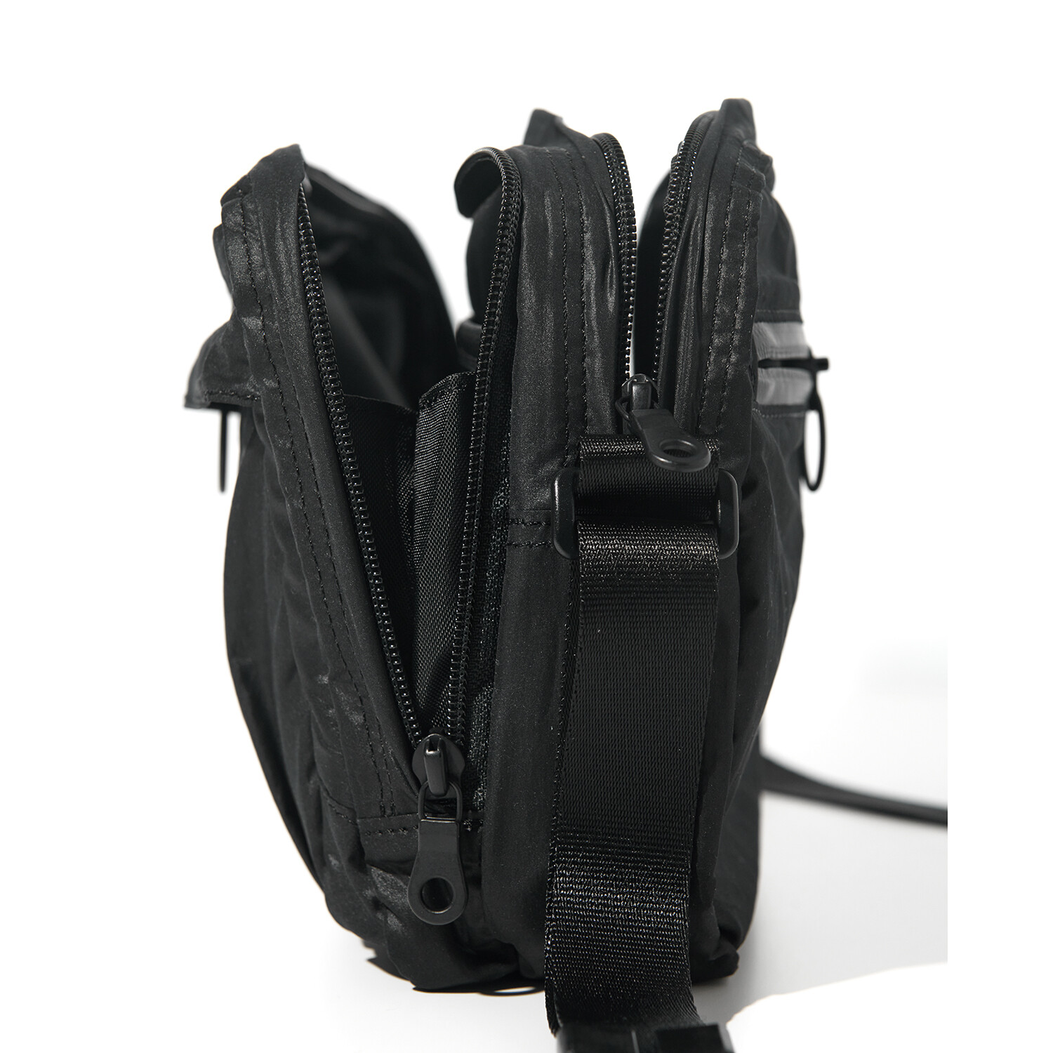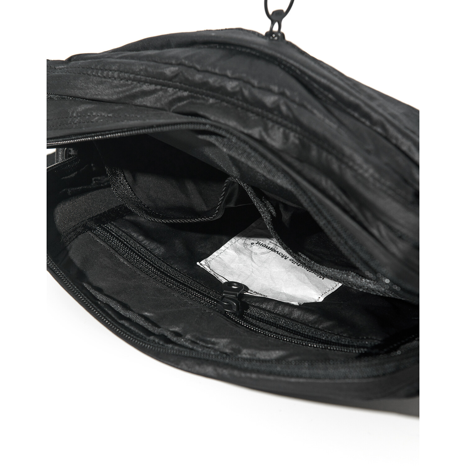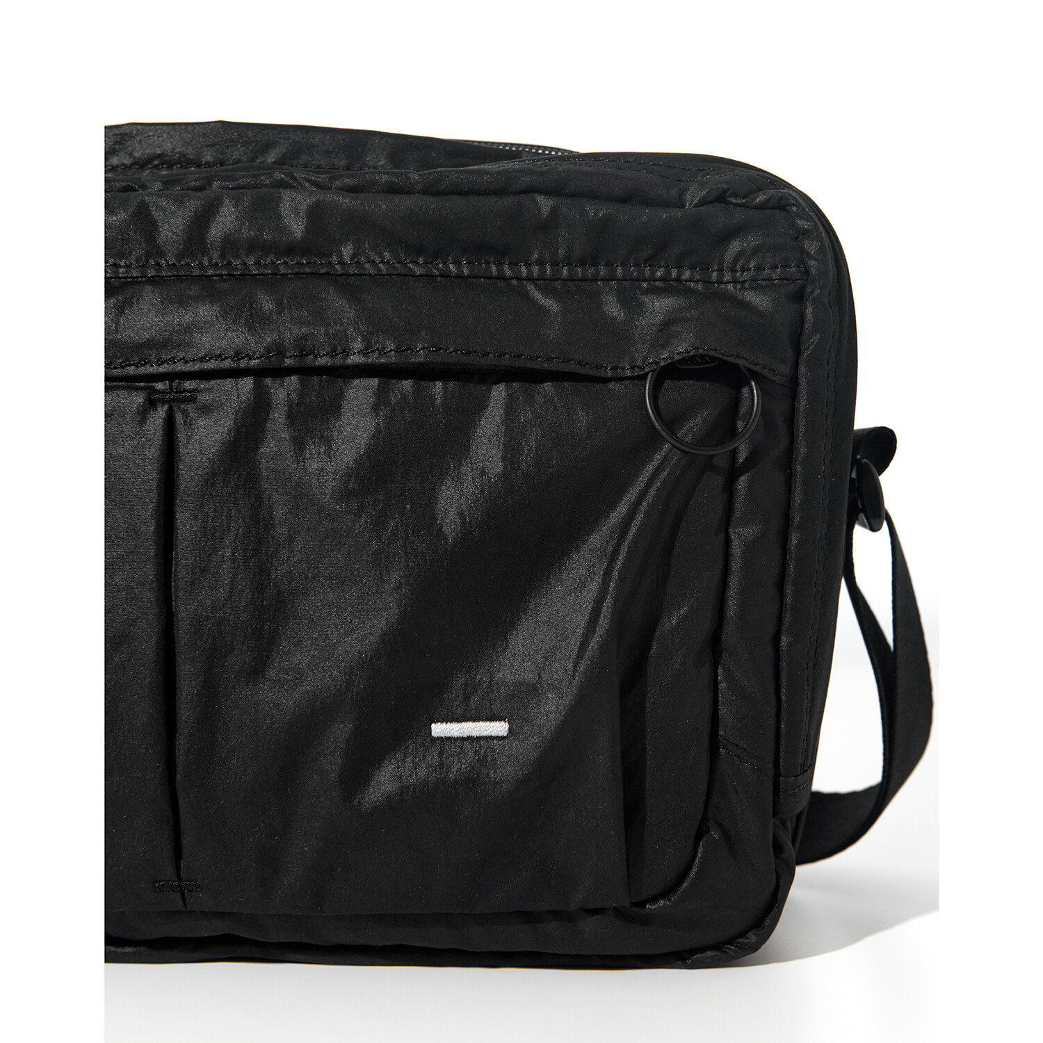 ‘토스터 백’은 용량 약 3.5L의 적당한 사이즈를 갖고 있습니다. 가로로 긴 직사각형 모양이지만 하단부에는 완만한 곡선을 만들어 편하고 부담 없이 착용하시기 좋은 형태 및 사이즈로 만들었습니다. 토스터 백의 구조는 중앙의 칸막이를 기준으로 크게 2개로 나누어져 있는데 앞 공간의 개폐 범위를 의도적으로 굉장히 넓게 만들어서 메인 지퍼를 모두 오픈하면 마치 토스터의 입구를 연듯한 형상을 확인하실 수 있습니다. 이때, 내부 소지품의 이탈을 방지하기 위해 양측면에는 폴딩 되는 파티션을 배치하여 안정감 있는 형태를 유지합니다. 가장 큰 외형적 특징은 두 가지로, 깔끔한 인상을 위해 입술 원단으로 지퍼를 가려준 것과 전면부에서 확인할 수 있는 입체적인 포켓입니다. 특히 포켓 중앙과 좌, 우 하단에 잡혀있는 플리츠 그리고 절개가 들어간 포켓의 옆면이 입체적인 구조를 만들어주며 실용적인 수납력을 보여줍니다. 앞, 뒤 공간 내부에는 모두 작은 소지품들은 수납할 수 있도록 다양한 포켓이 배치되어 있으며 가방의 후면부에도 PU 코팅 처리된 지퍼를 활용한 포켓이 있습니다.