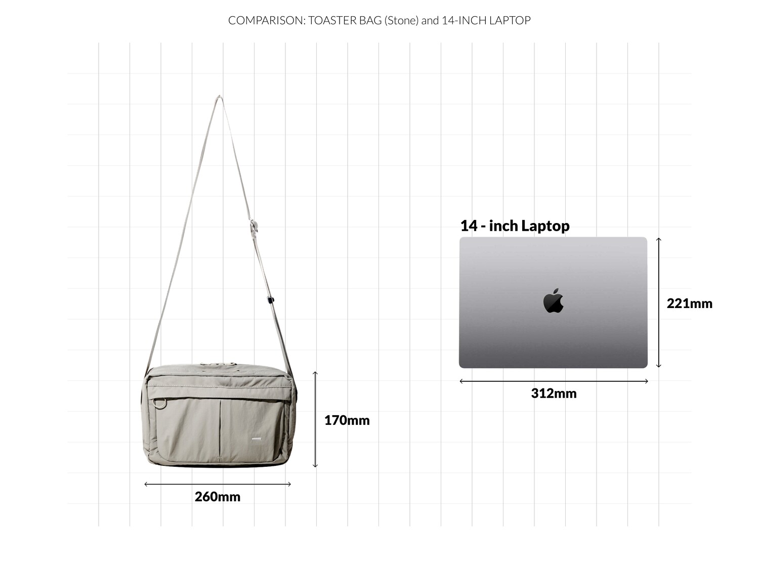 ‘토스터 백’은 용량 약 3.5L의 적당한 사이즈를 갖고 있습니다. 가로로 긴 직사각형 모양이지만 하단부에는 완만한 곡선을 만들어 편하고 부담 없이 착용하시기 좋은 형태 및 사이즈로 만들었습니다. 토스터 백의 구조는 중앙의 칸막이를 기준으로 크게 2개로 나누어져 있는데 앞 공간의 개폐 범위를 의도적으로 굉장히 넓게 만들어서 메인 지퍼를 모두 오픈하면 마치 토스터의 입구를 연듯한 형상을 확인하실 수 있습니다. 이때, 내부 소지품의 이탈을 방지하기 위해 양측면에는 폴딩 되는 파티션을 배치하여 안정감 있는 형태를 유지합니다. 가장 큰 외형적 특징은 두 가지로, 깔끔한 인상을 위해 입술 원단으로 지퍼를 가려준 것과 전면부에서 확인할 수 있는 입체적인 포켓입니다. 특히 포켓 중앙과 좌, 우 하단에 잡혀있는 플리츠 그리고 절개가 들어간 포켓의 옆면이 입체적인 구조를 만들어주며 실용적인 수납력을 보여줍니다. 앞, 뒤 공간 내부에는 모두 작은 소지품들은 수납할 수 있도록 다양한 포켓이 배치되어 있으며 가방의 후면부에도 PU 코팅 처리된 지퍼를 활용한 포켓이 있습니다.