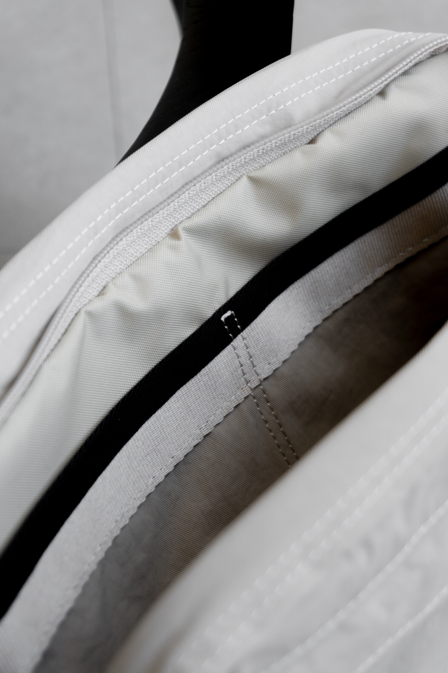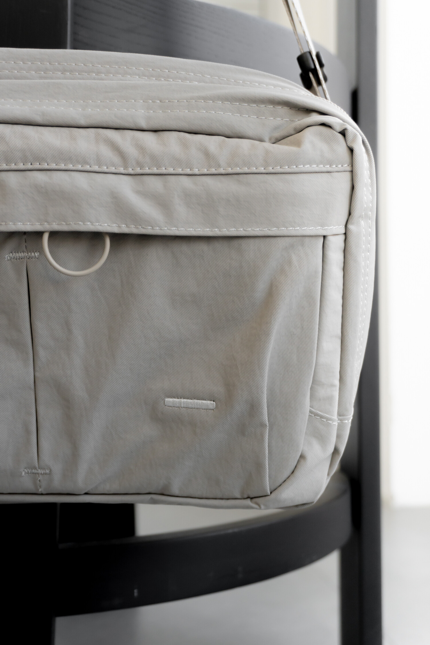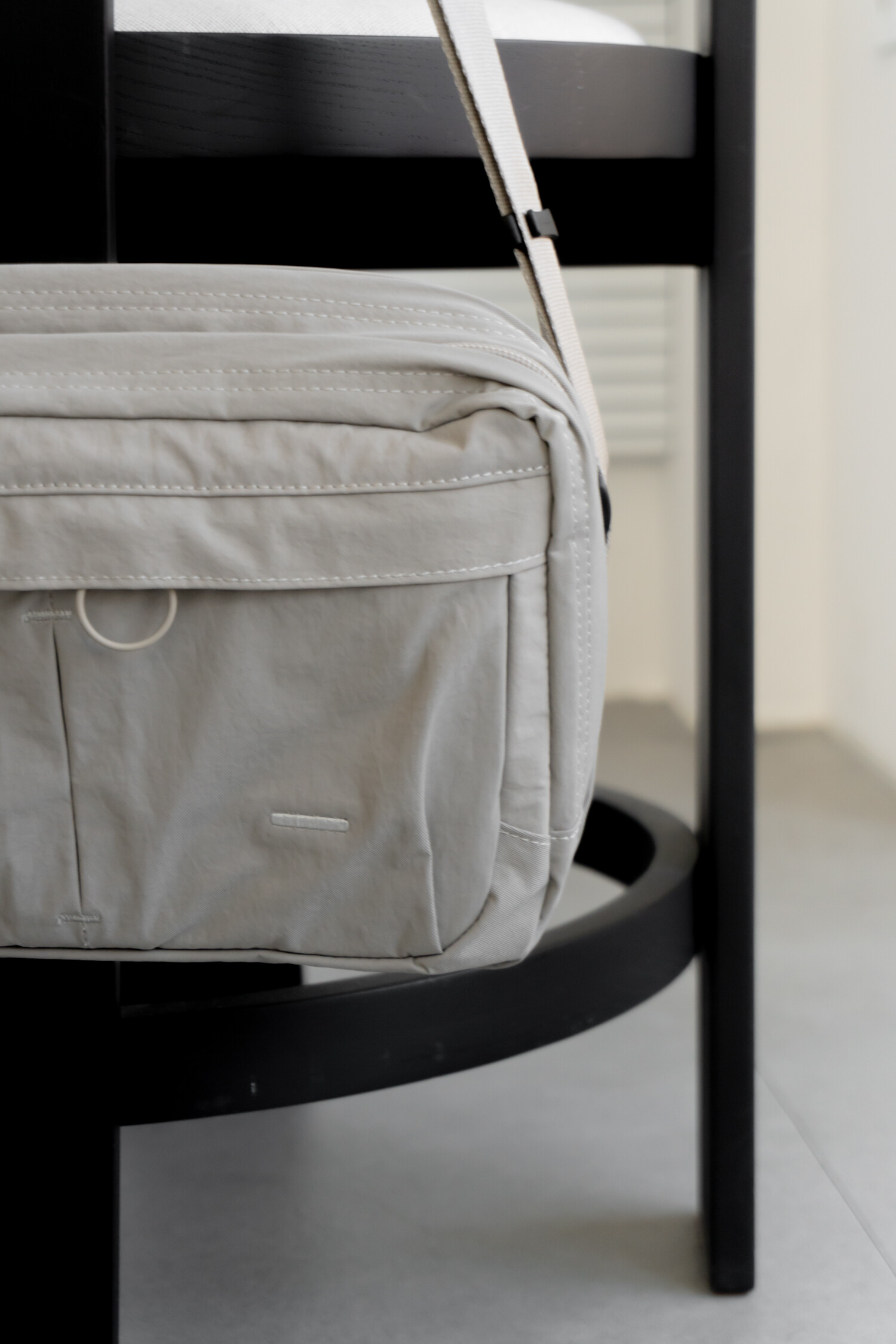 스톤 컬러에는 적절한 두께감의 나일론 원단을 사용했습니다. 바스락거리는 질감과 미세한 주름, 트윌결이 느껴지는 탄탄한고 매끈한 터치가 특징이며 발수 가공을 통해 생활 발수가 가능합니다. 크로스 끈에는 표면감이 매끈한 나일론 능직 웨빙을 사용했고 고강도의 알루미늄 아노다이징 어드저스터와 홀더를 통해서 끈 길이도 손쉽게 조절할 수 있습니다. 모든 지퍼는 YKK의 지퍼들을 사용했습니다.