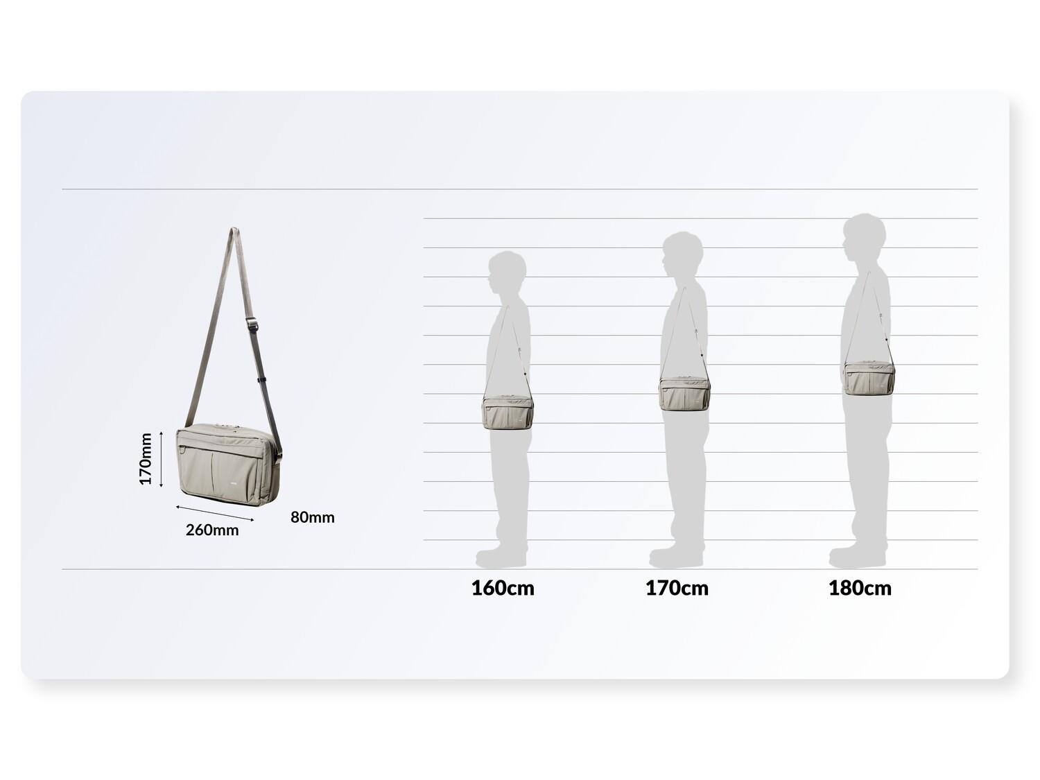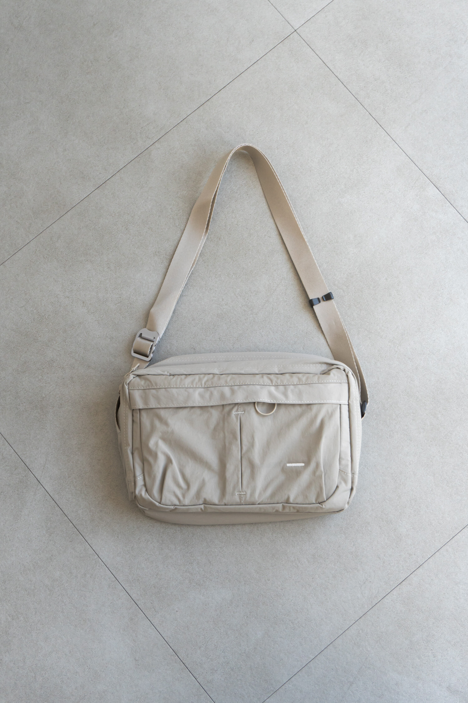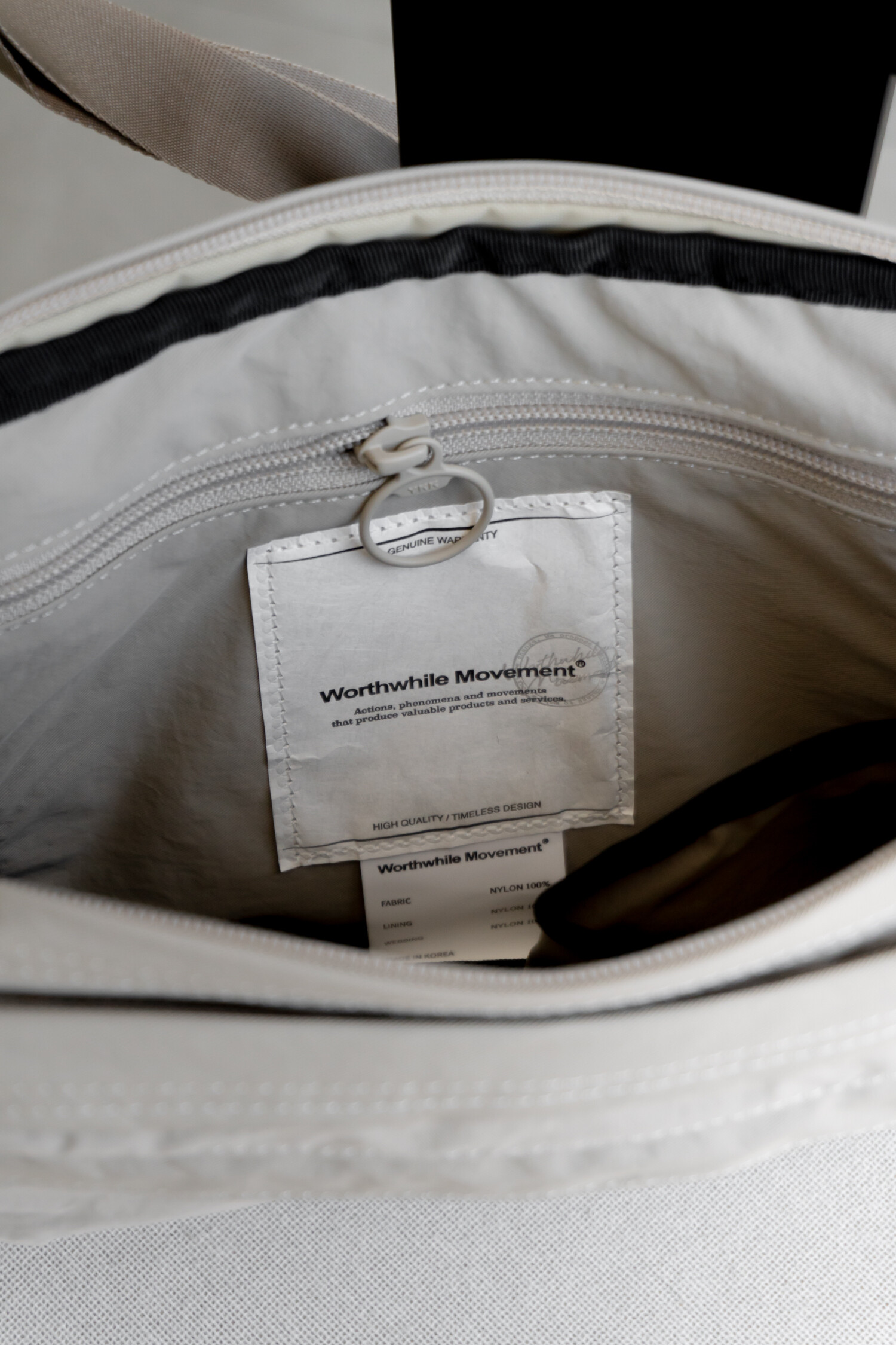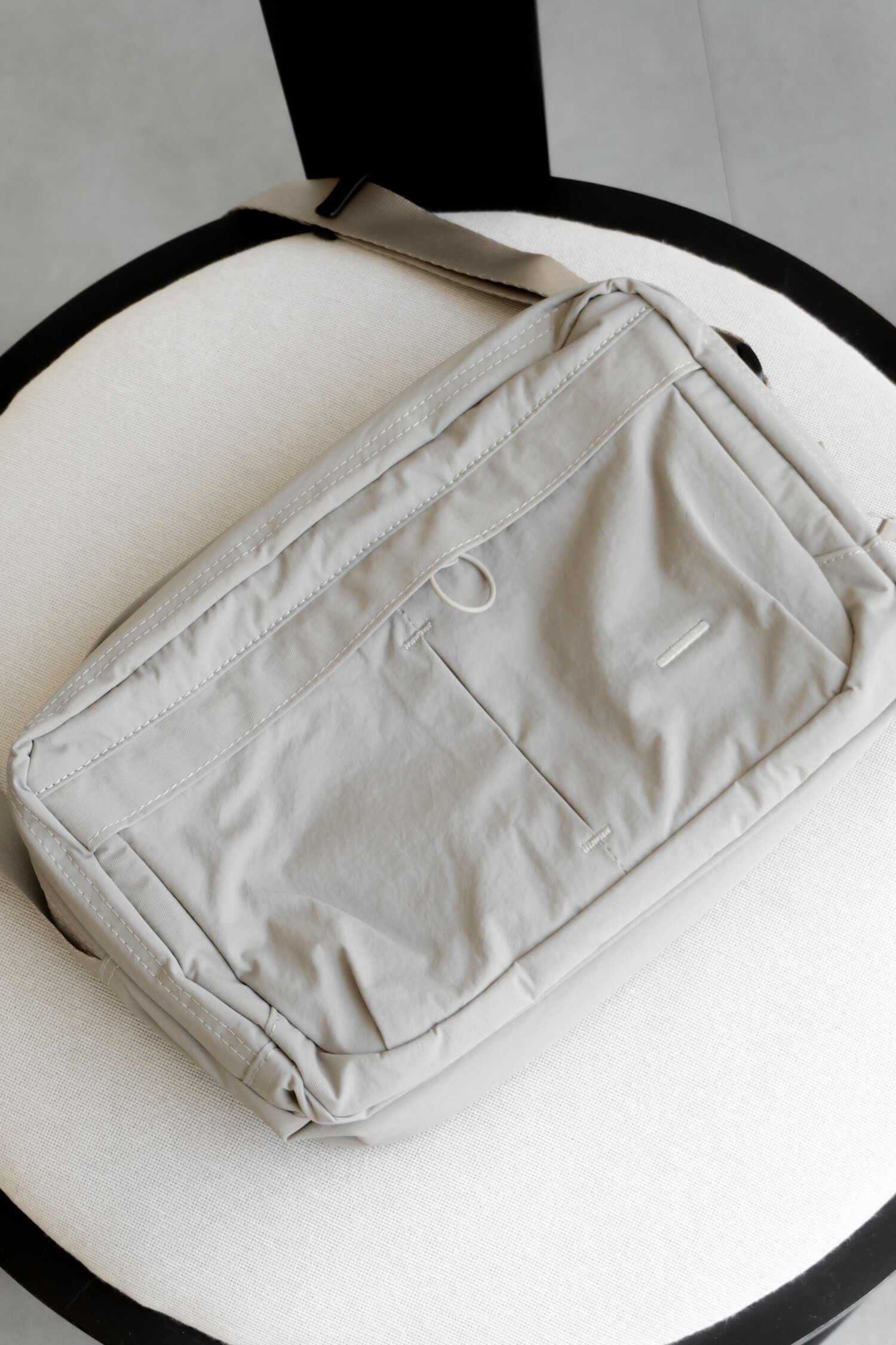 스톤 컬러에는 적절한 두께감의 나일론 원단을 사용했습니다. 바스락거리는 질감과 미세한 주름, 트윌결이 느껴지는 탄탄한고 매끈한 터치가 특징이며 발수 가공을 통해 생활 발수가 가능합니다. 크로스 끈에는 표면감이 매끈한 나일론 능직 웨빙을 사용했고 고강도의 알루미늄 아노다이징 어드저스터와 홀더를 통해서 끈 길이도 손쉽게 조절할 수 있습니다. 모든 지퍼는 YKK의 지퍼들을 사용했습니다.