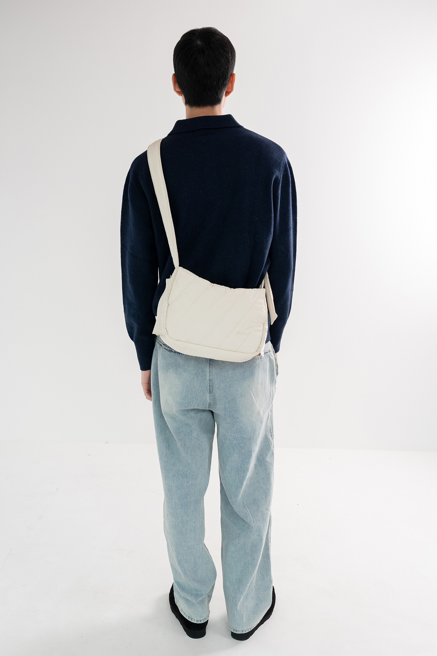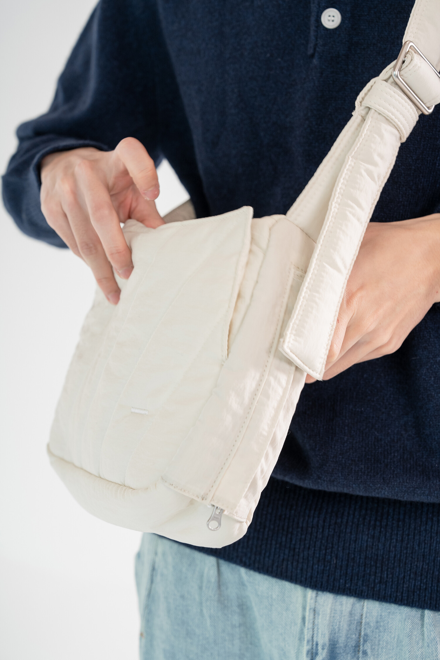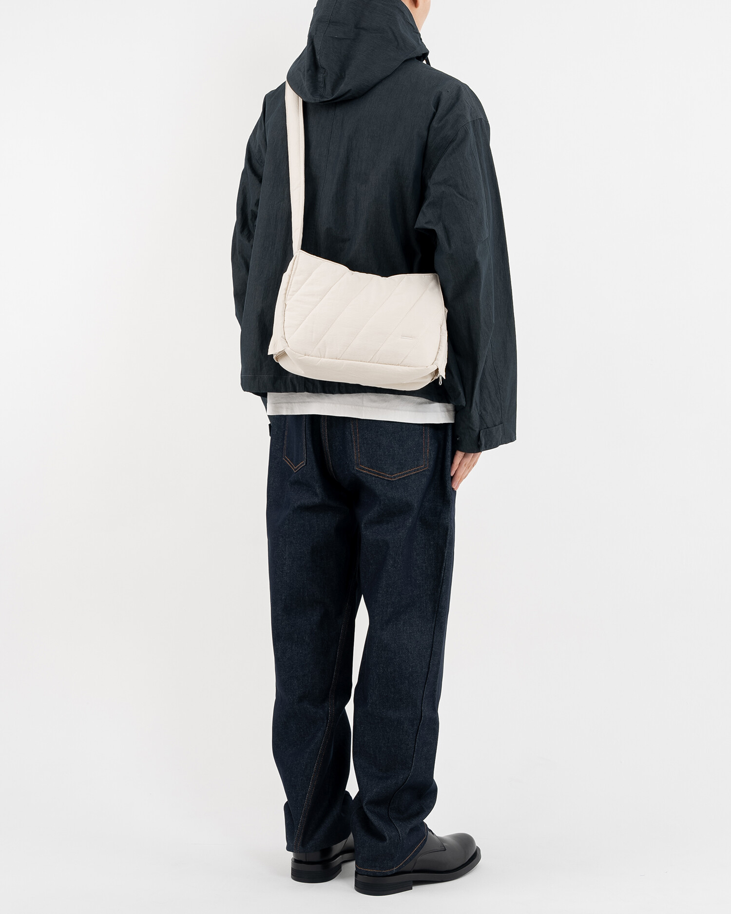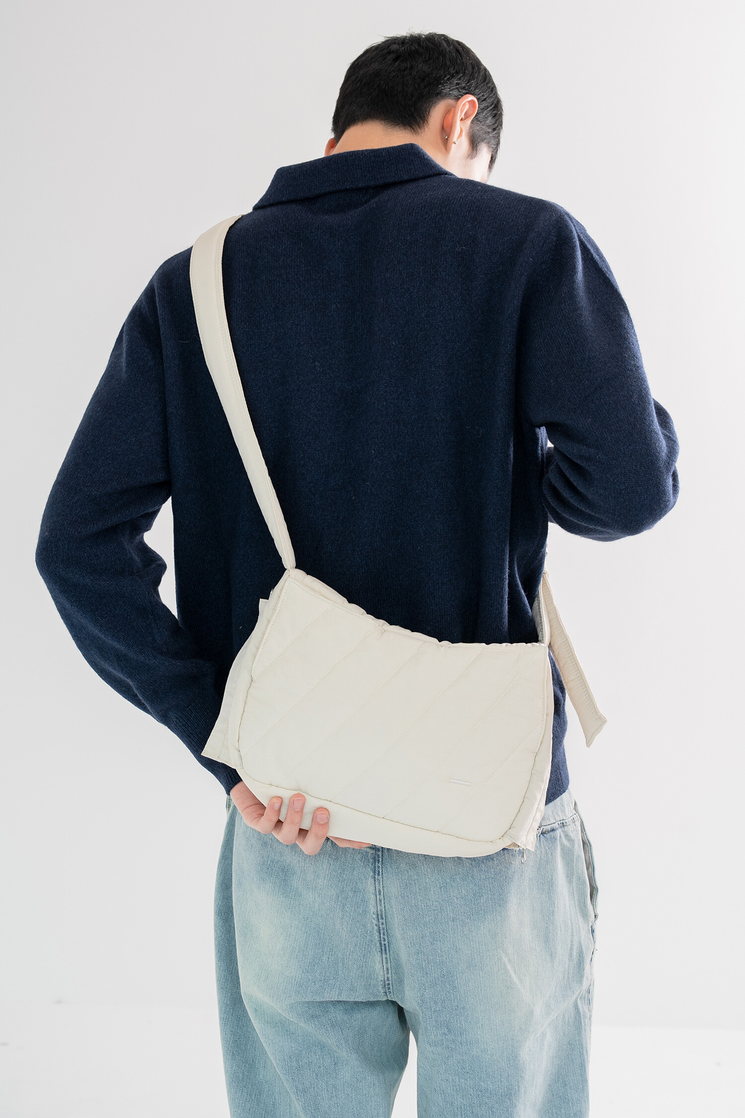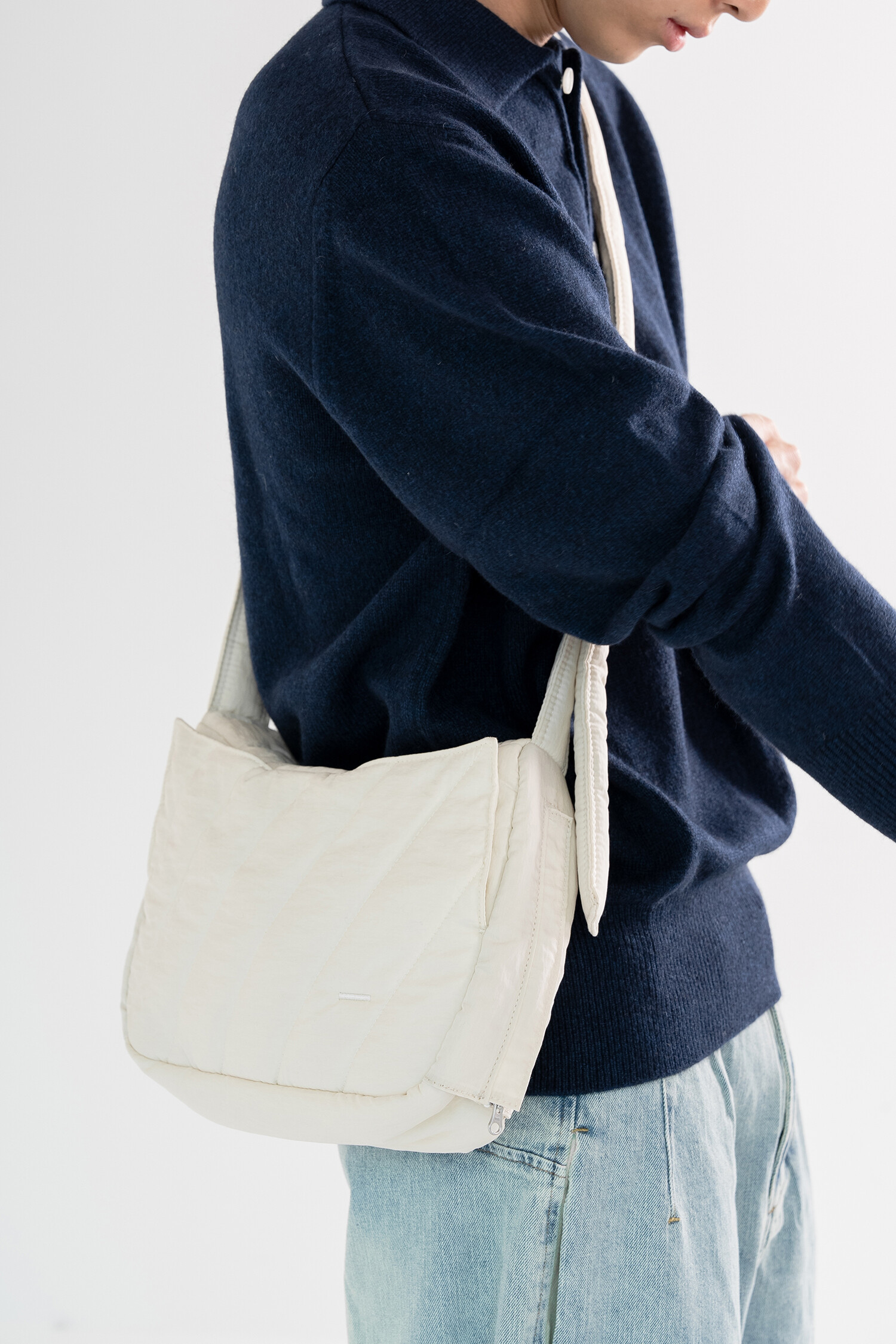 데일리로 사용하기 좋은 크로스백으로 바이오 워싱된 소프트한 질감의 N/C 교직물에 퀼팅 처리하여 독특한 전면부 인상을 표현, 전체적으로는 단정한듯 하지만 돋보이는 디테일을 곳곳에 배치했습니다. 측면이 위로 올라간 곡선 형태로 유려하고 부드러운 인상이 느껴지며, 겉 원단 내부에는 3온스 솜을 본딩하여 편안하고 포근한 질감이 느껴집니다.