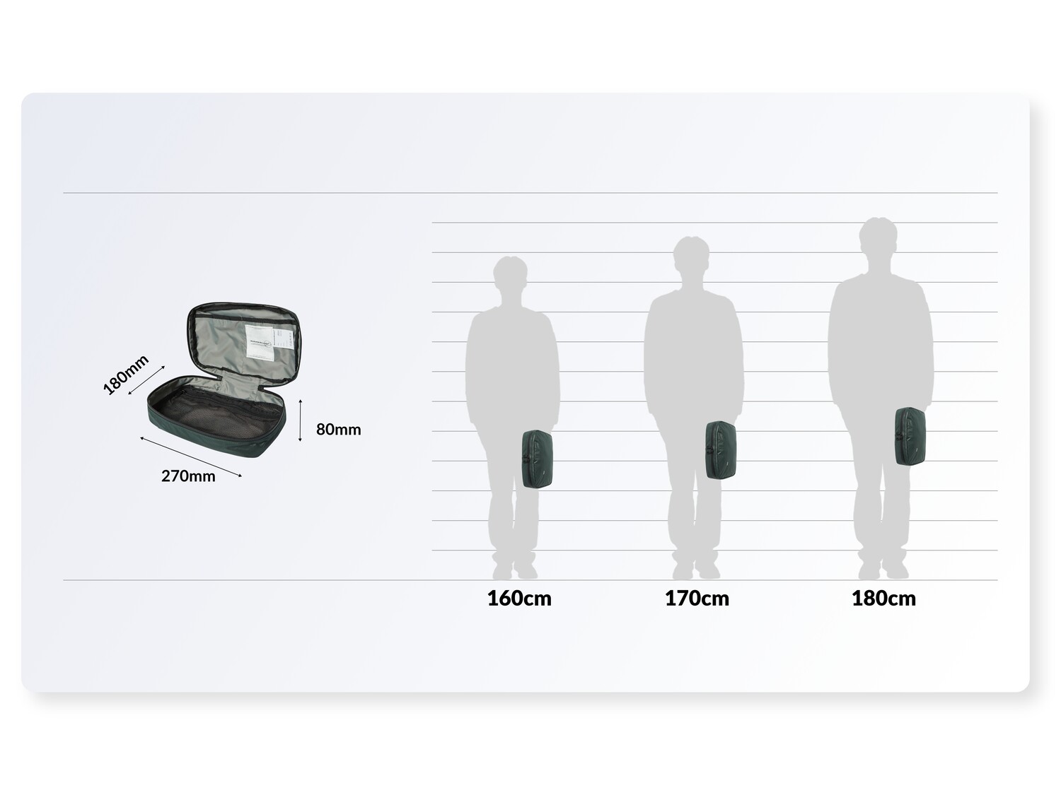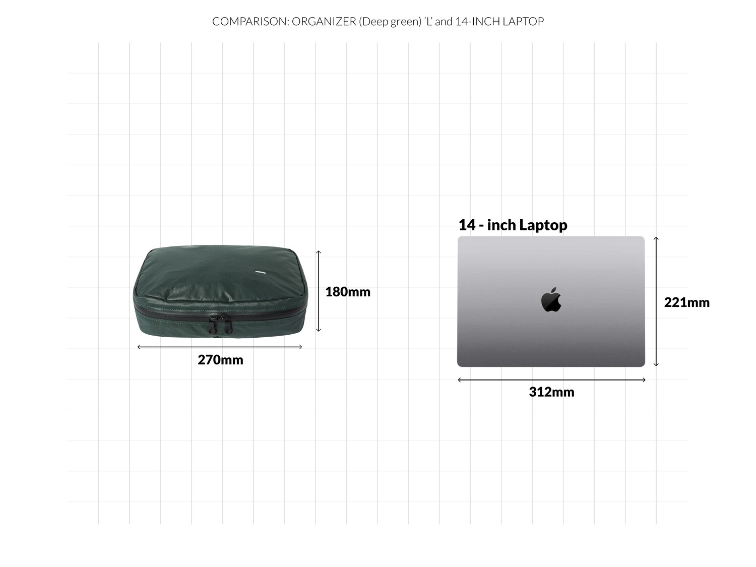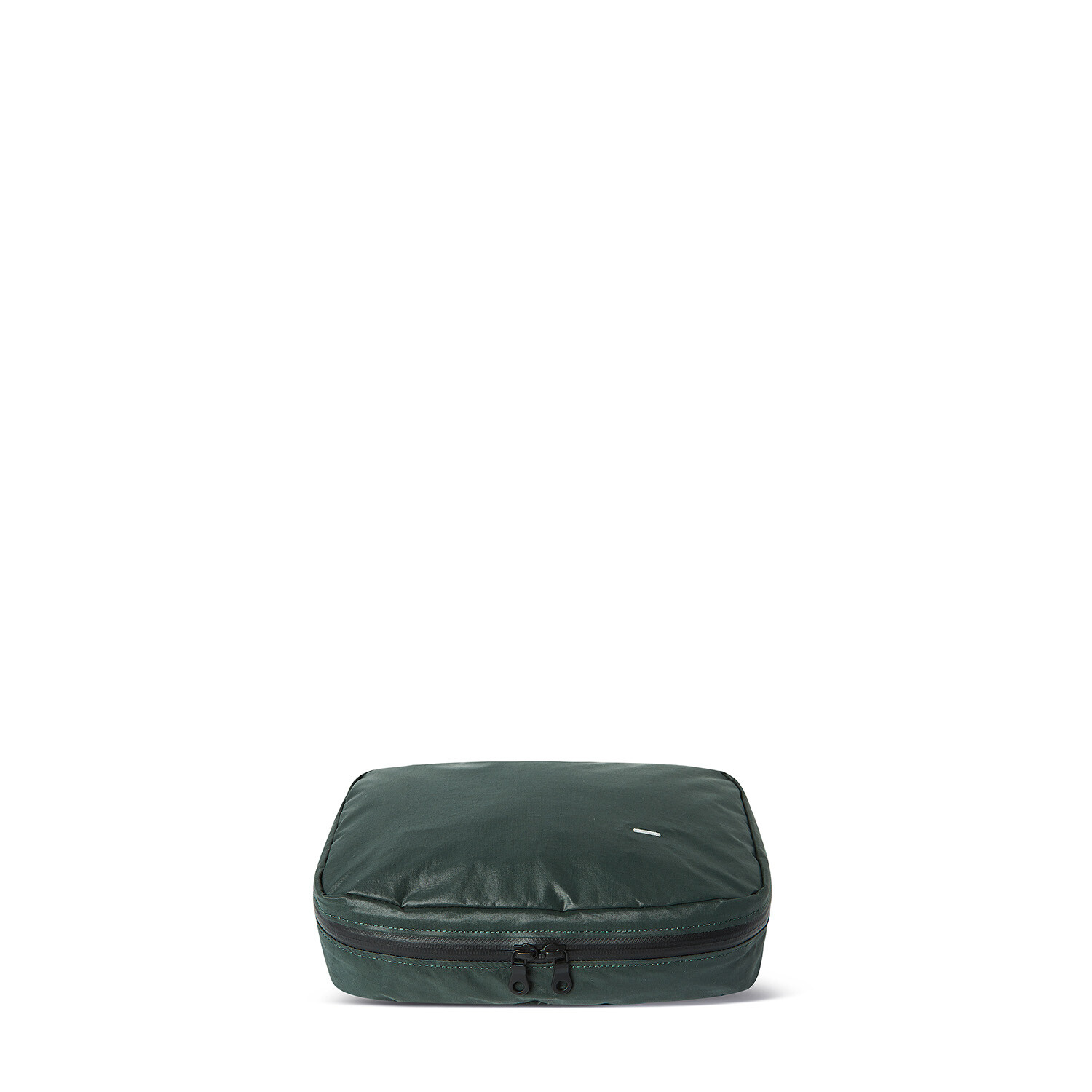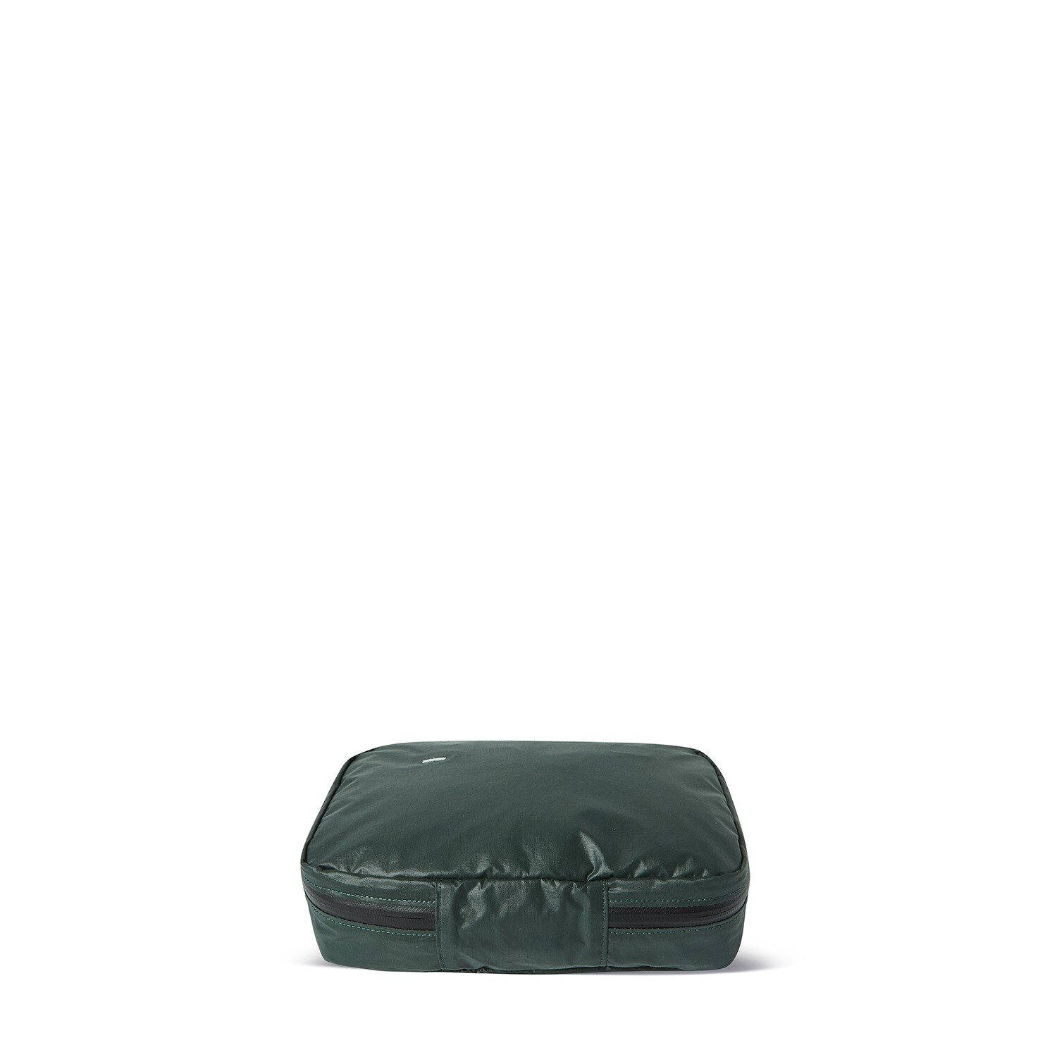 > SIZE : 270 x 180 x 80(mm) > WEIGHT : 110g > CAPACITY : 3.5L > TYPE : 1Way (오거나이저) > COLOR : Deep green > FABRIC : Nylon 63%, Cotton 37% (N/NC 30's bio washing & cire finish) WR > LINING : Nylon 100% > ZIPPER : YKK® RC Chain > ORIGIN : Korea