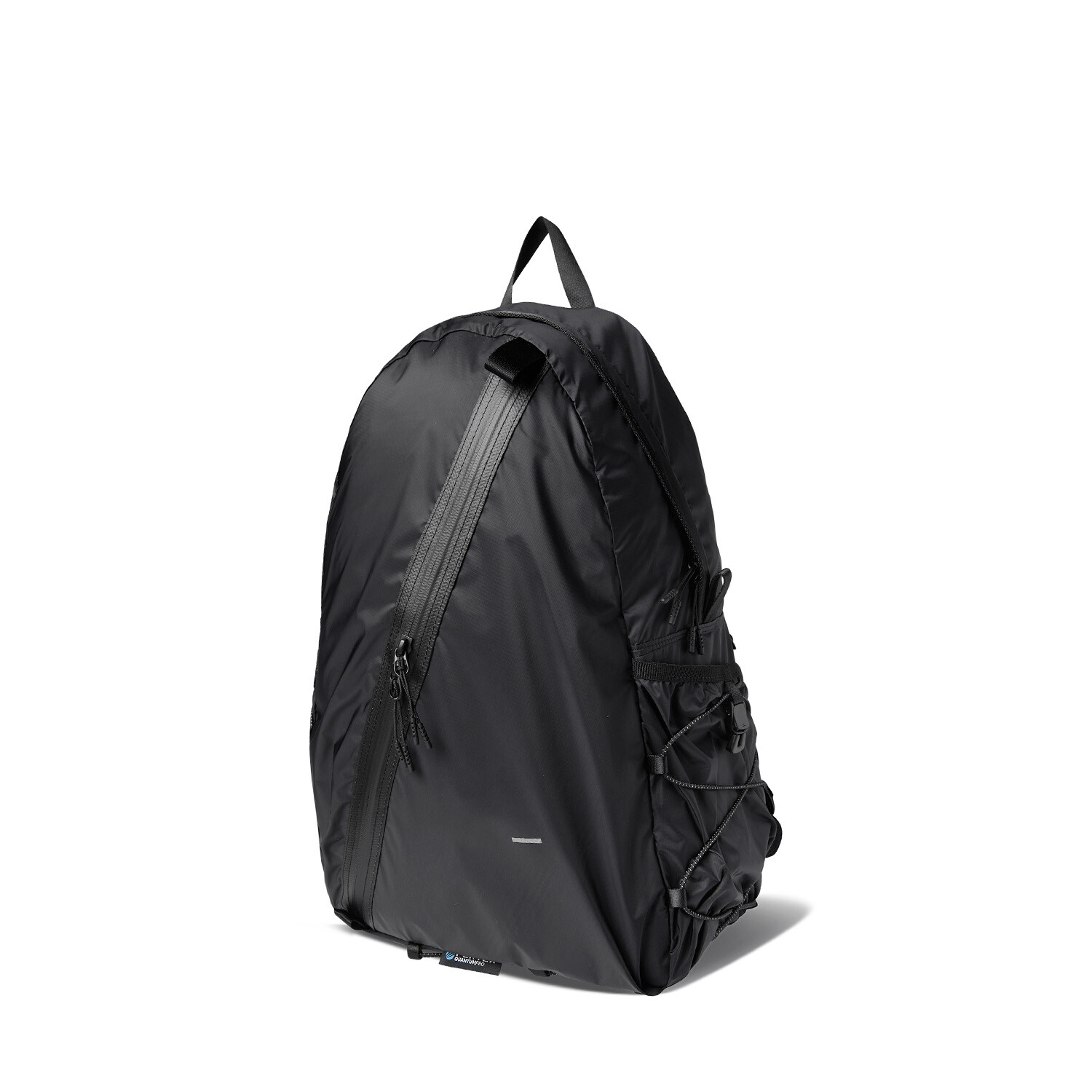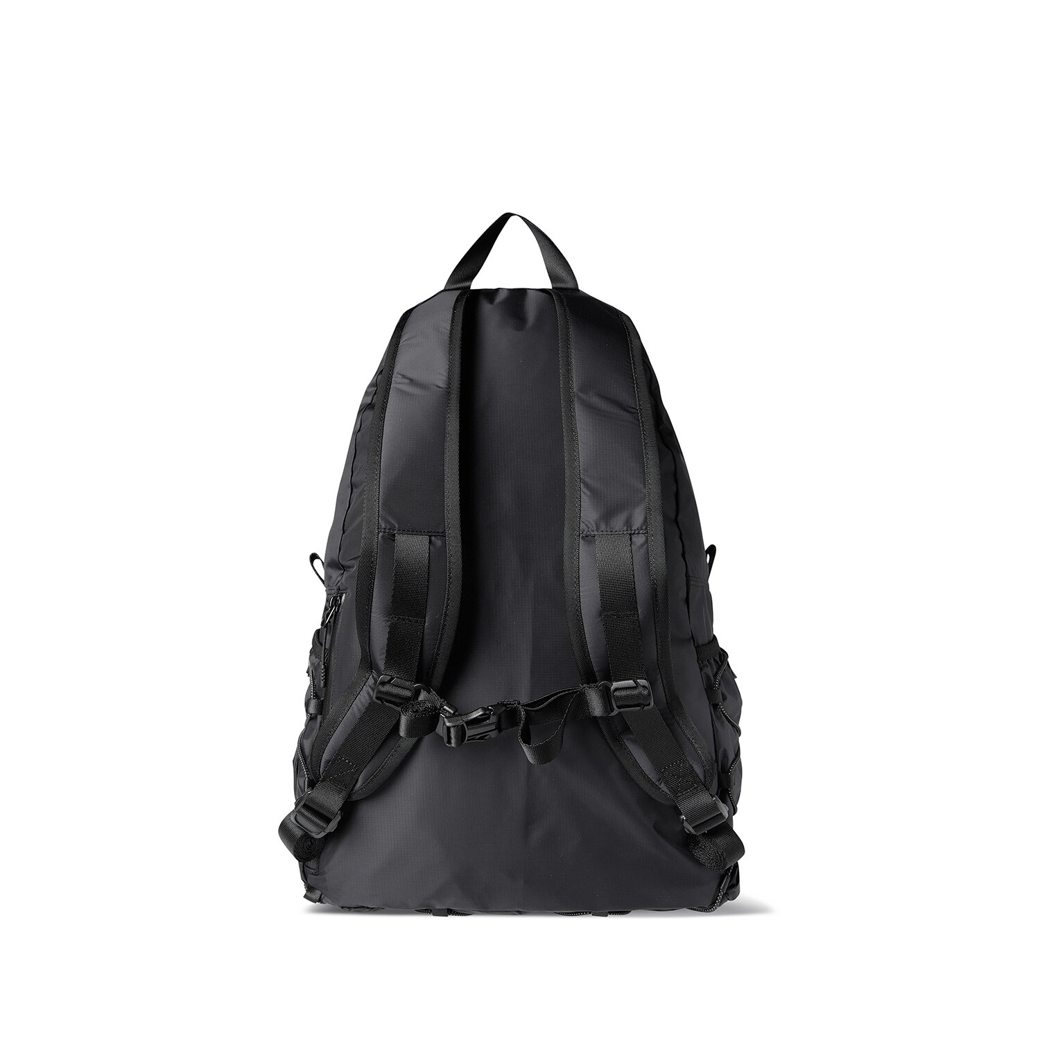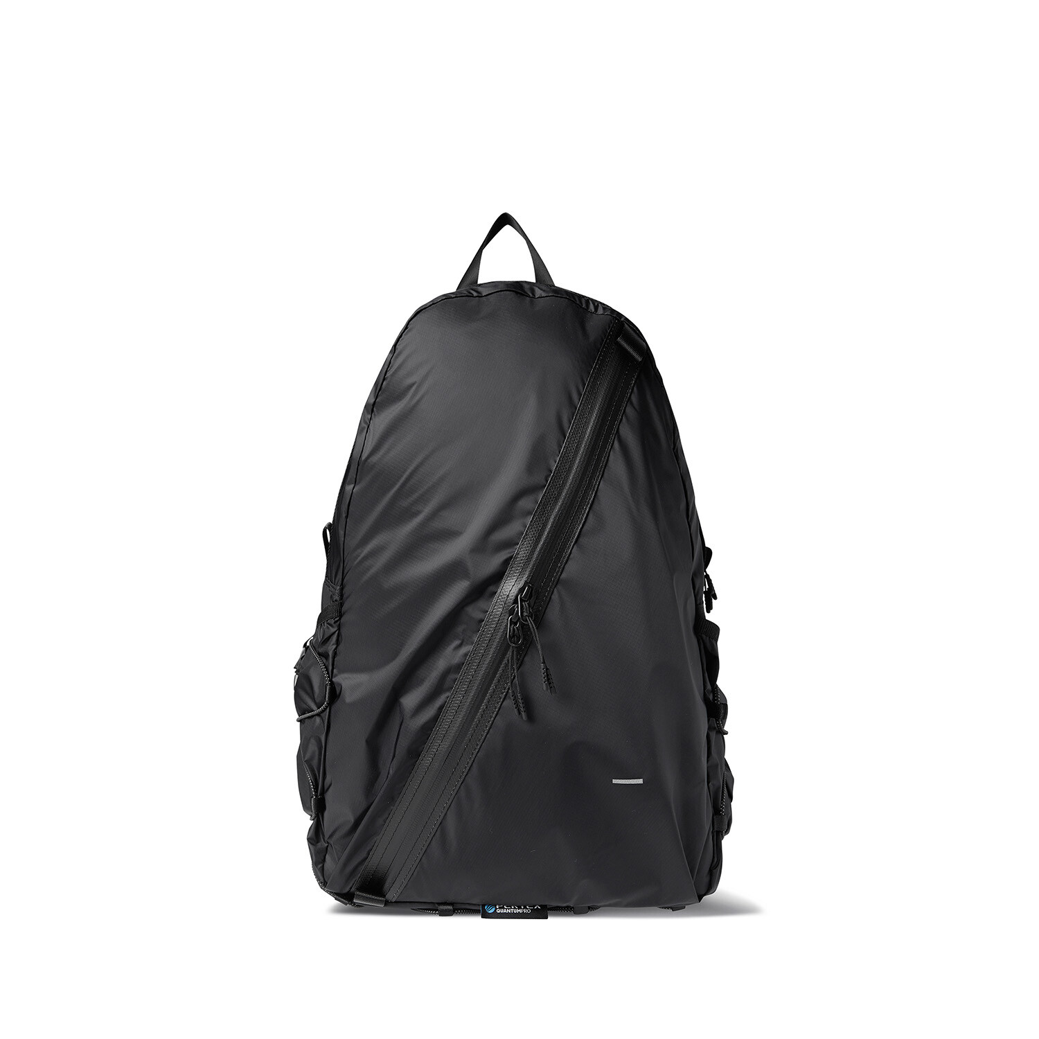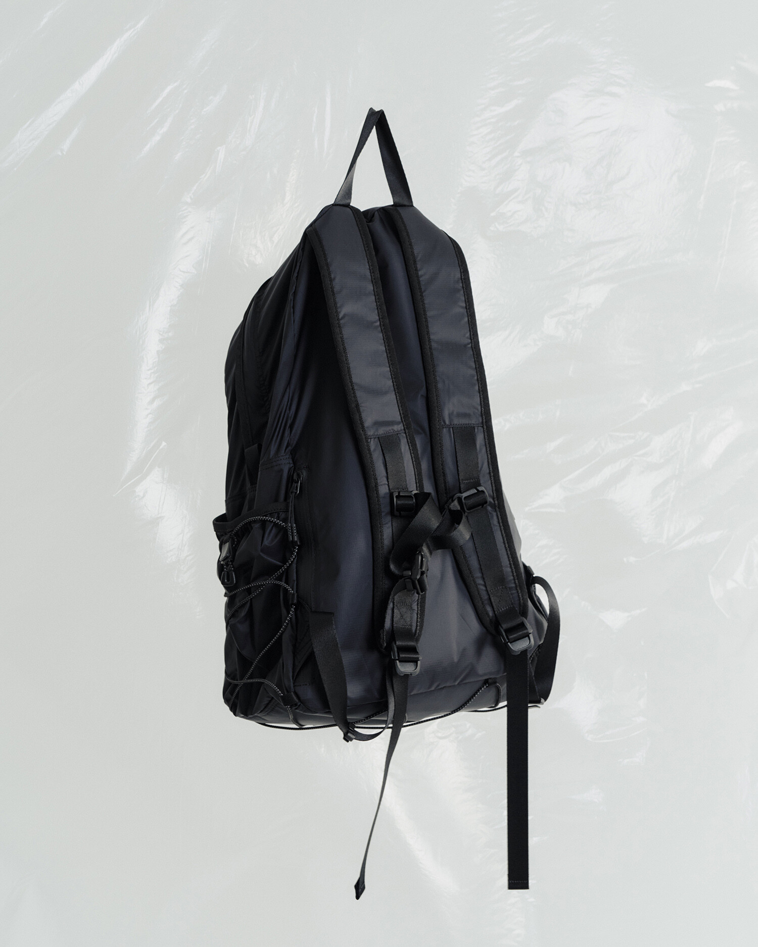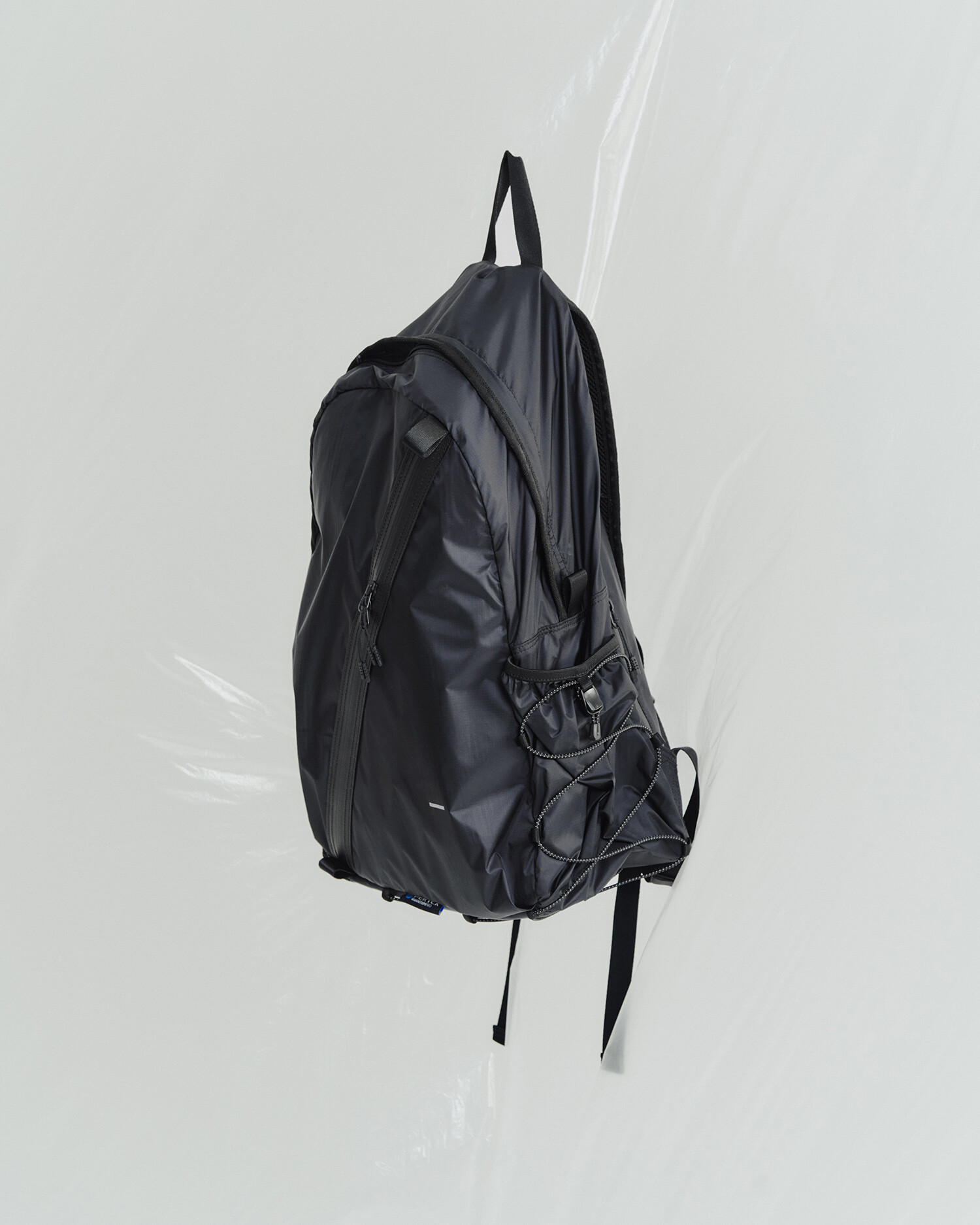 전면부에는 사선으로 큰 포켓이 들어가 있는데 코팅된 지퍼를 외부로 모두 들어내 기능적인 특징을 더욱 강조했으며 해당 지퍼를 열면 내부에 있는 메쉬 포켓을 추가로 확인할 수 있습니다. 또한 양측면에 있는 입체 플리츠를 통해 포켓의 여유 공간을 확보하면서 측면에서 봤을 때 유려한 실루엣을 더욱 도드라지게 만들어 줍니다. 사이드 포켓에서 바닥면으로 이어지는 스트링은 사이드 포켓의 물건을 고정할 뿐 아니라 전체적인 가방 실루엣의 변주를 줄 수 있으며, 산행이나 트래킹 환경에서 잠시 벗어두는 가벼운 아우터를 걸어둘 수 있습니다. 등과 맞닿는 후면에는 하단에 추가적으로 포켓을 배치하여 카드 지갑과 같은 작은 소지품을 보관할 수 있습니다. 백팩의 숄더 스트랩 안쪽에는 에어 메쉬와 부직포를 보강하였고, 체스트 스트랩에는 마그네틱 버클과 E-밴드를 결합한 웨빙을 통해 몸에 밀착시켜서 여러 상황에서도 편안한 착용감을 느낄 수 있습니다. 평판이나 철 프레임 구조, EVA 등의 비교적 단단한 하드웨어나 보강재가 들어간 제품은 아니며 경량화와 무게 대비 좋은 내구성과 발수력에 초점을 맞춘 제품입니다. 다소 가벼운 일상 소지품이나 등산 및 트래킹 용품 수납에 적합합니다.