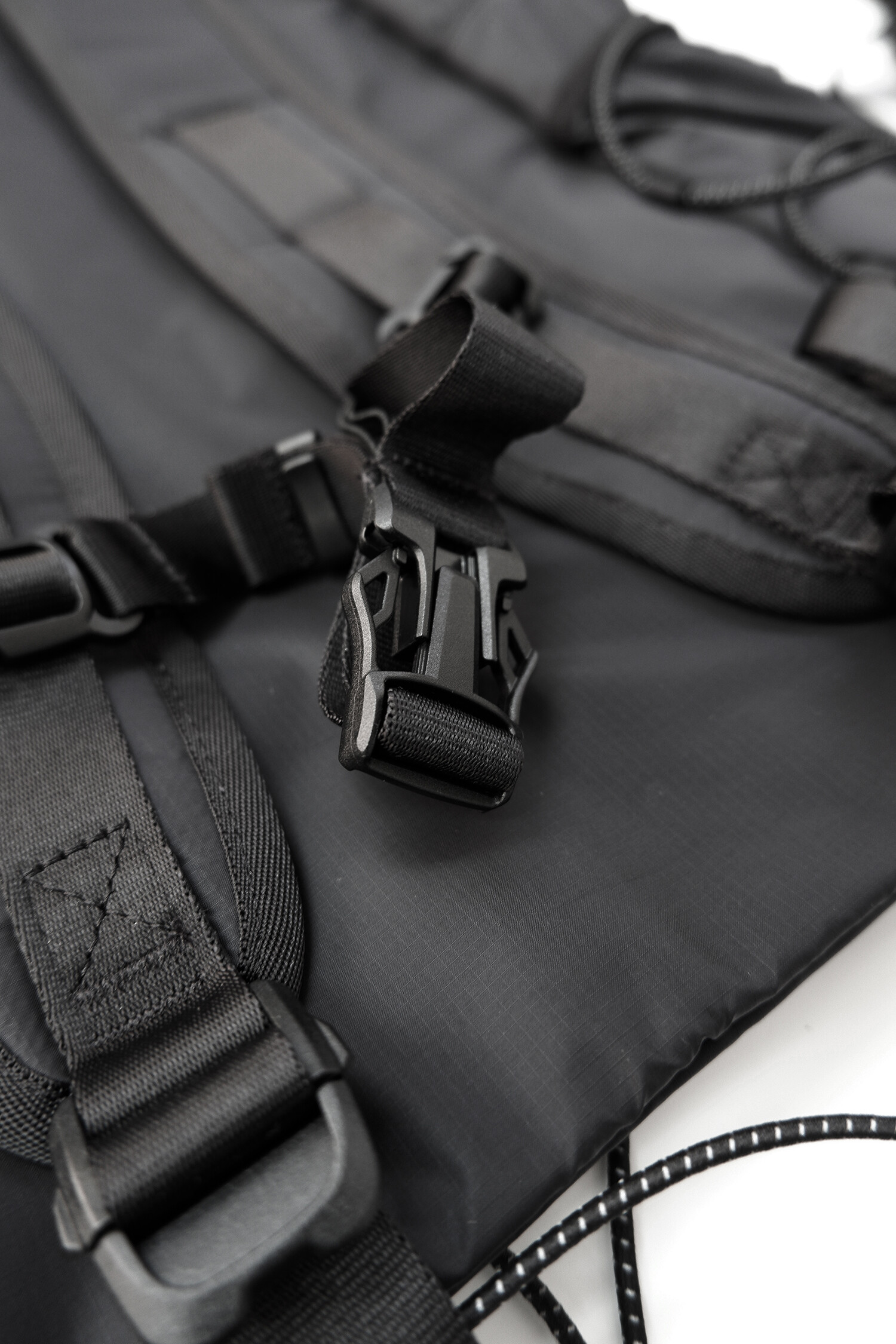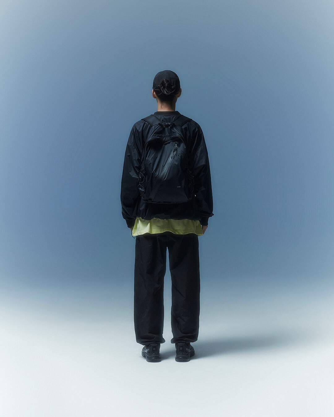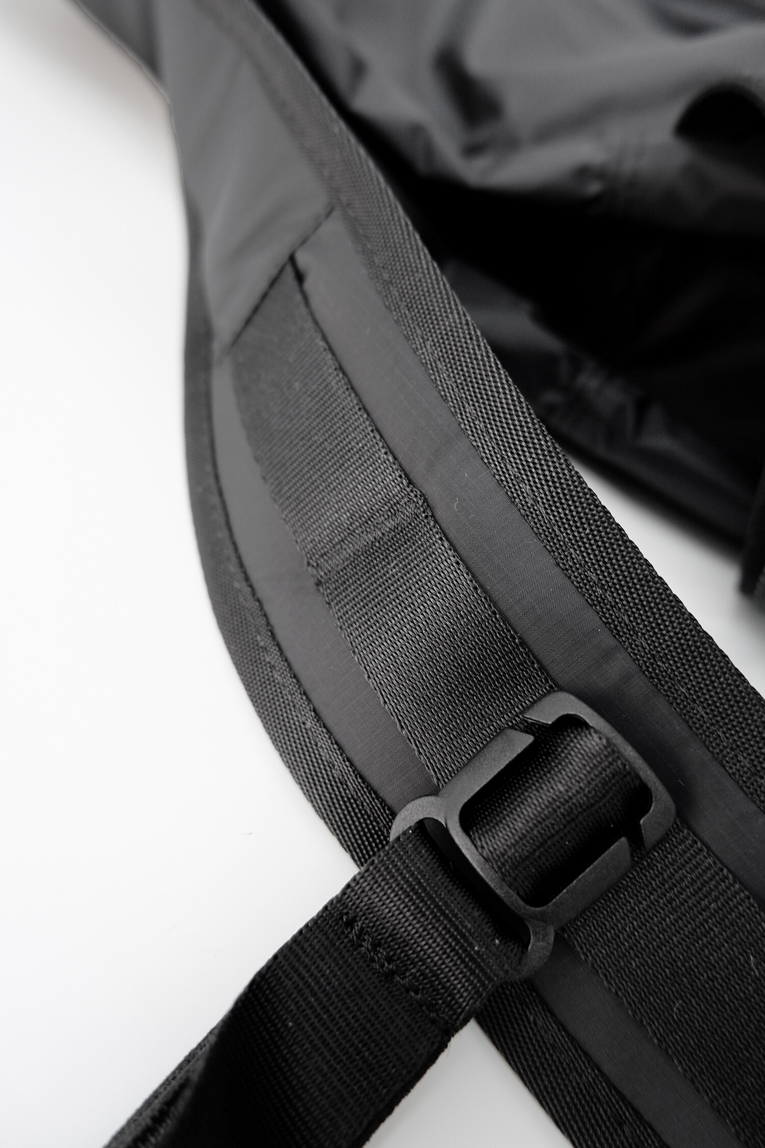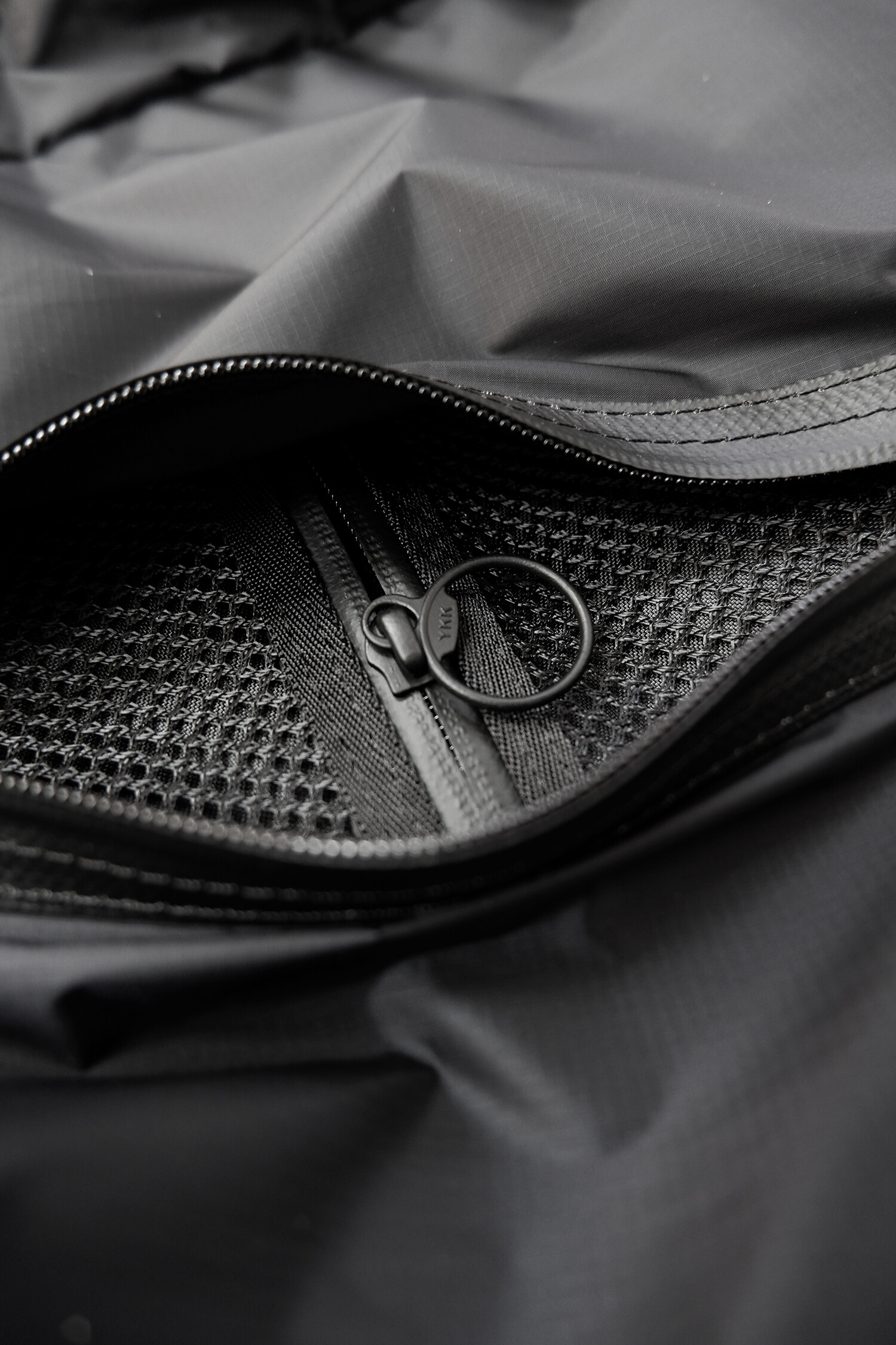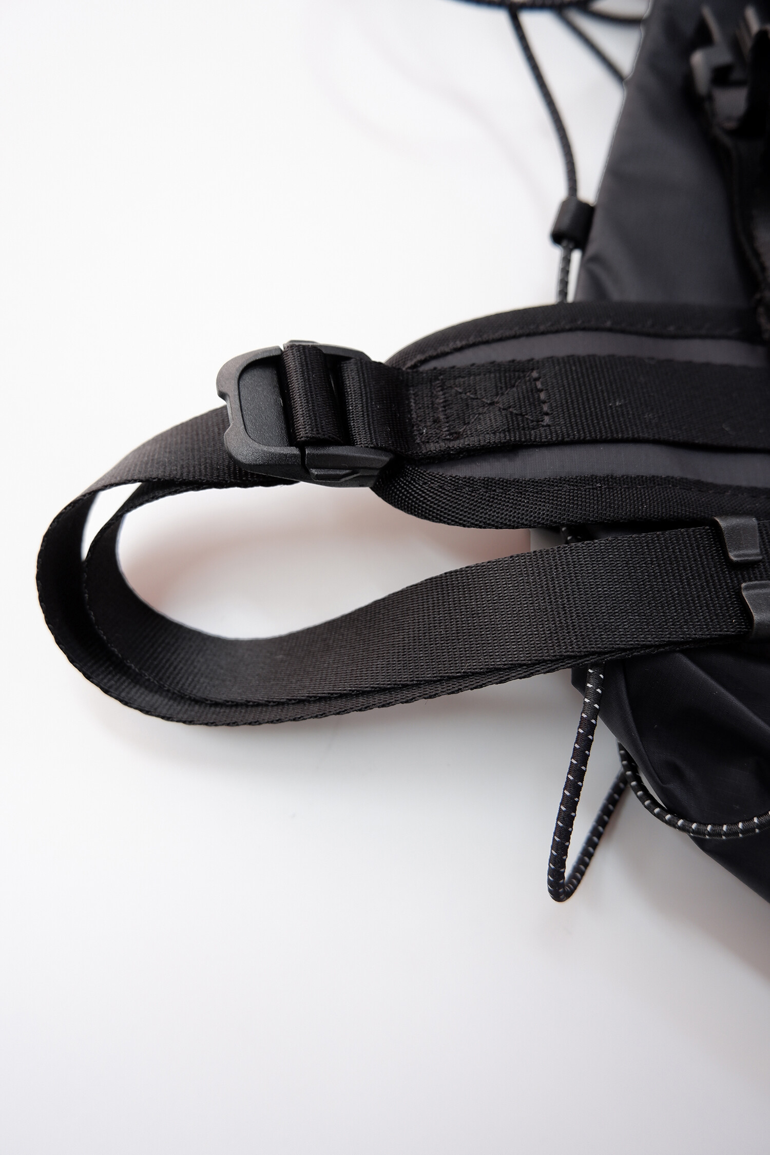 전면부에는 사선으로 큰 포켓이 들어가 있는데 코팅된 지퍼를 외부로 모두 들어내 기능적인 특징을 더욱 강조했으며 해당 지퍼를 열면 내부에 있는 메쉬 포켓을 추가로 확인할 수 있습니다. 또한 양측면에 있는 입체 플리츠를 통해 포켓의 여유 공간을 확보하면서 측면에서 봤을 때 유려한 실루엣을 더욱 도드라지게 만들어 줍니다. 사이드 포켓에서 바닥면으로 이어지는 스트링은 사이드 포켓의 물건을 고정할 뿐 아니라 전체적인 가방 실루엣의 변주를 줄 수 있으며, 산행이나 트래킹 환경에서 잠시 벗어두는 가벼운 아우터를 걸어둘 수 있습니다. 등과 맞닿는 후면에는 하단에 추가적으로 포켓을 배치하여 카드 지갑과 같은 작은 소지품을 보관할 수 있습니다. 백팩의 숄더 스트랩 안쪽에는 에어 메쉬와 부직포를 보강하였고, 체스트 스트랩에는 마그네틱 버클과 E-밴드를 결합한 웨빙을 통해 몸에 밀착시켜서 여러 상황에서도 편안한 착용감을 느낄 수 있습니다. 평판이나 철 프레임 구조, EVA 등의 비교적 단단한 하드웨어나 보강재가 들어간 제품은 아니며 경량화와 무게 대비 좋은 내구성과 발수력에 초점을 맞춘 제품입니다. 다소 가벼운 일상 소지품이나 등산 및 트래킹 용품 수납에 적합합니다.