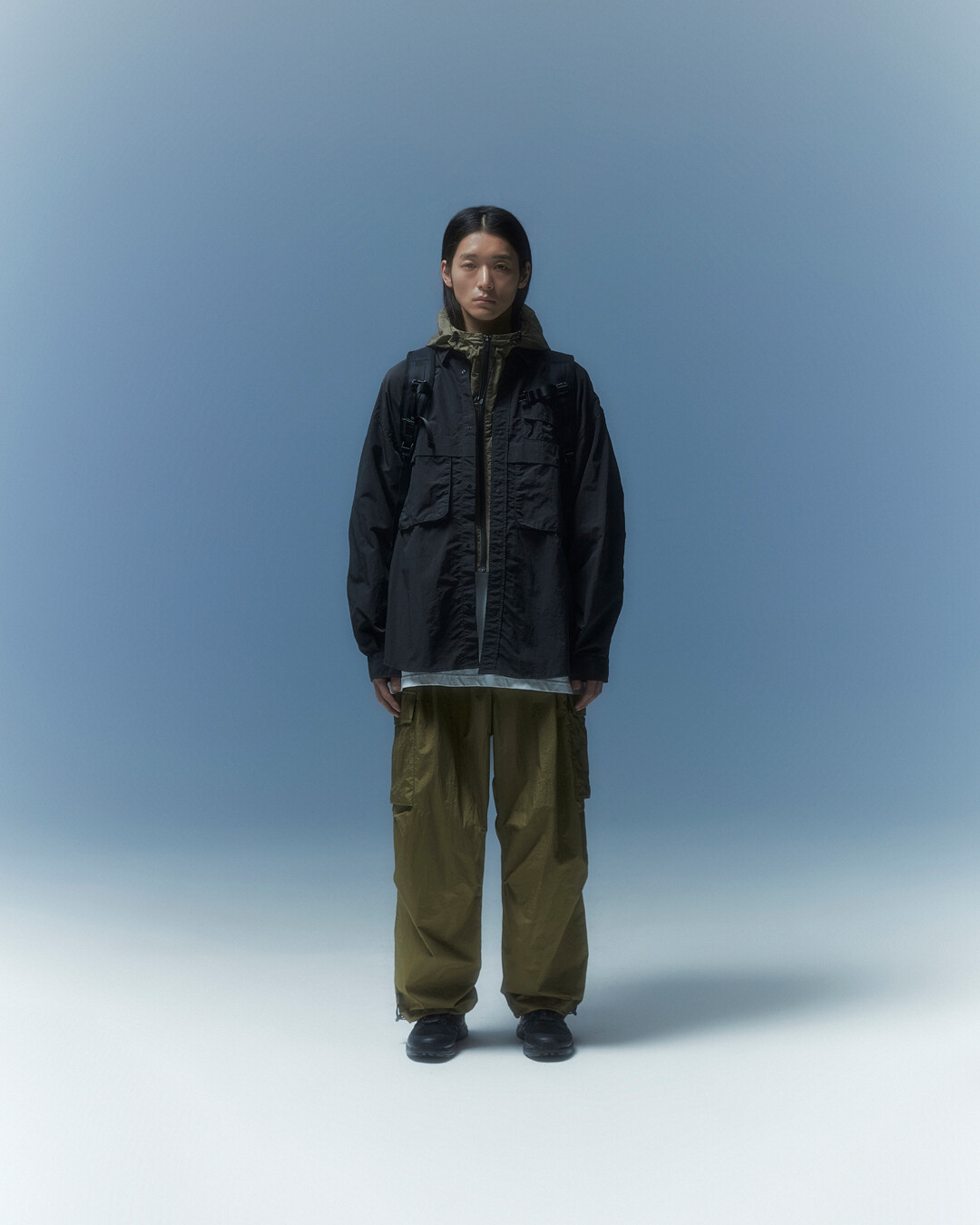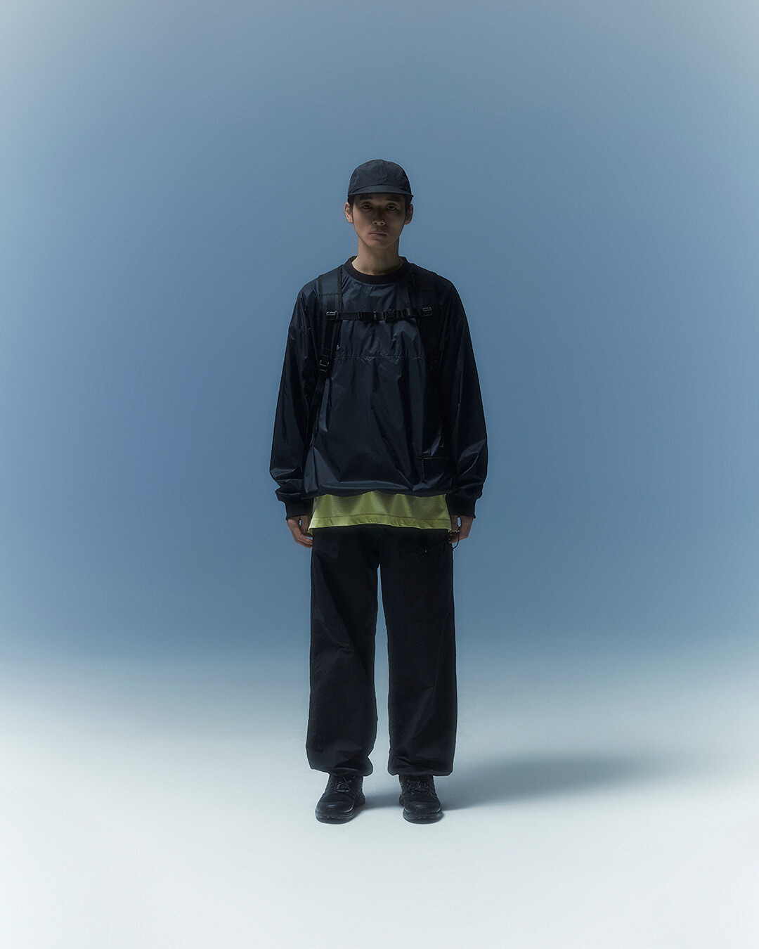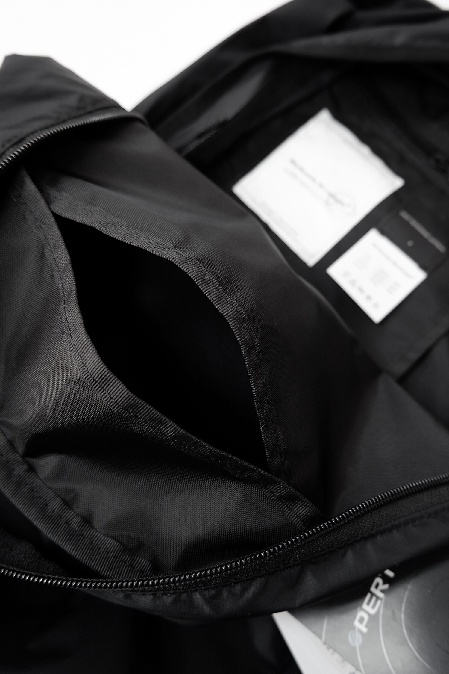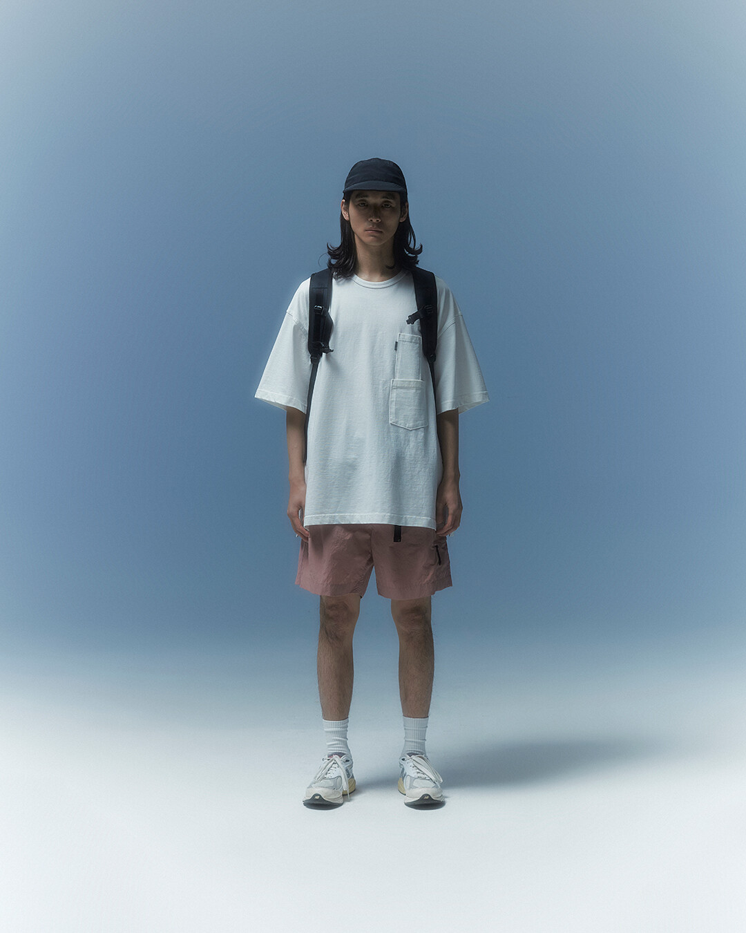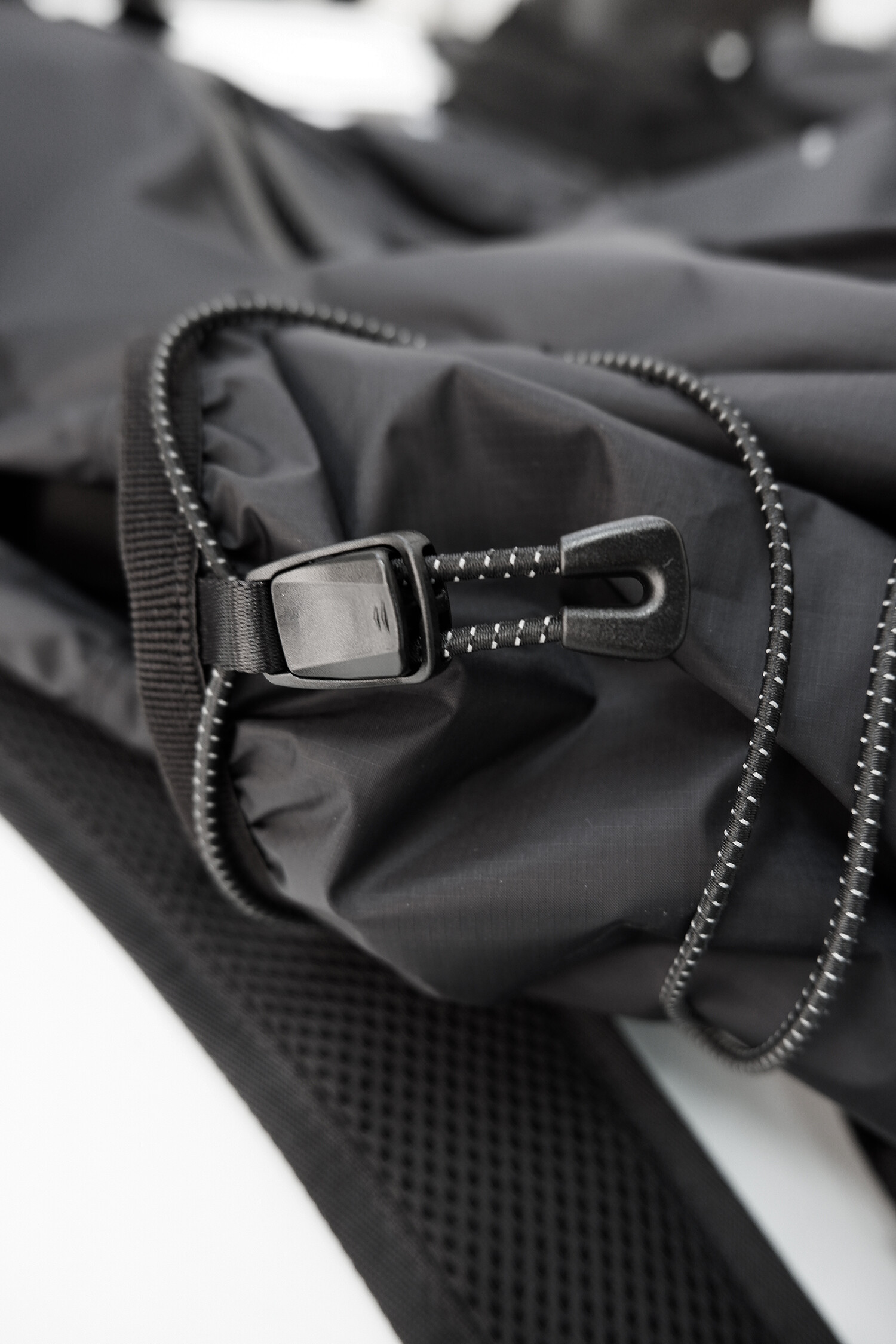 전면부에는 사선으로 큰 포켓이 들어가 있는데 코팅된 지퍼를 외부로 모두 들어내 기능적인 특징을 더욱 강조했으며 해당 지퍼를 열면 내부에 있는 메쉬 포켓을 추가로 확인할 수 있습니다. 또한 양측면에 있는 입체 플리츠를 통해 포켓의 여유 공간을 확보하면서 측면에서 봤을 때 유려한 실루엣을 더욱 도드라지게 만들어 줍니다. 사이드 포켓에서 바닥면으로 이어지는 스트링은 사이드 포켓의 물건을 고정할 뿐 아니라 전체적인 가방 실루엣의 변주를 줄 수 있으며, 산행이나 트래킹 환경에서 잠시 벗어두는 가벼운 아우터를 걸어둘 수 있습니다. 등과 맞닿는 후면에는 하단에 추가적으로 포켓을 배치하여 카드 지갑과 같은 작은 소지품을 보관할 수 있습니다. 백팩의 숄더 스트랩 안쪽에는 에어 메쉬와 부직포를 보강하였고, 체스트 스트랩에는 마그네틱 버클과 E-밴드를 결합한 웨빙을 통해 몸에 밀착시켜서 여러 상황에서도 편안한 착용감을 느낄 수 있습니다. 평판이나 철 프레임 구조, EVA 등의 비교적 단단한 하드웨어나 보강재가 들어간 제품은 아니며 경량화와 무게 대비 좋은 내구성과 발수력에 초점을 맞춘 제품입니다. 다소 가벼운 일상 소지품이나 등산 및 트래킹 용품 수납에 적합합니다.
